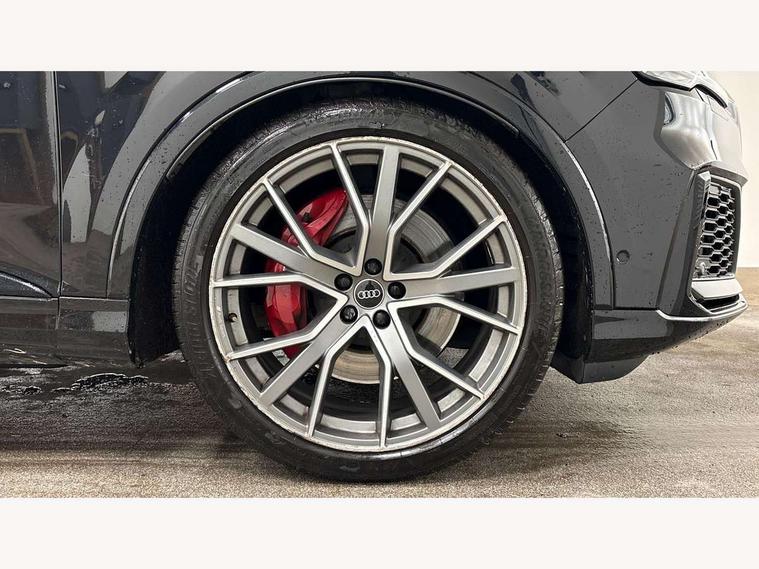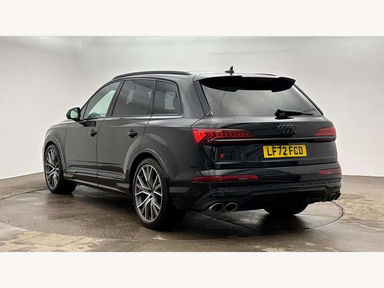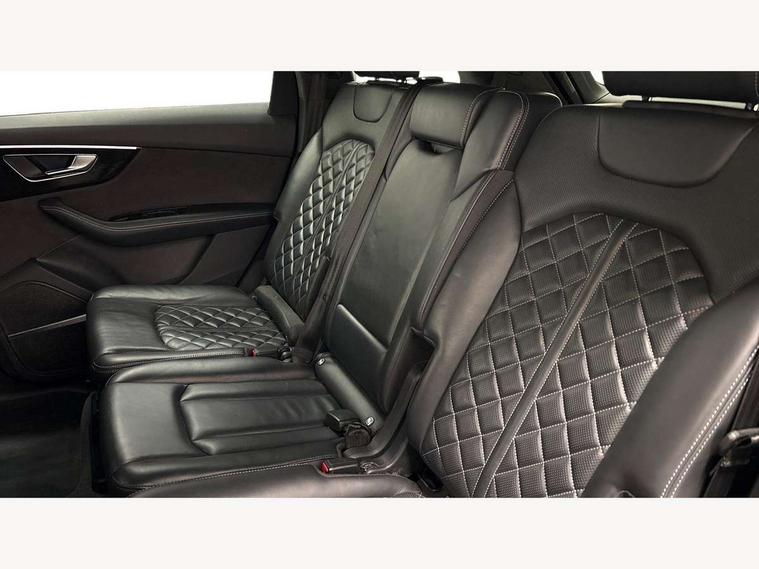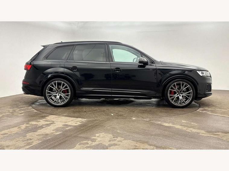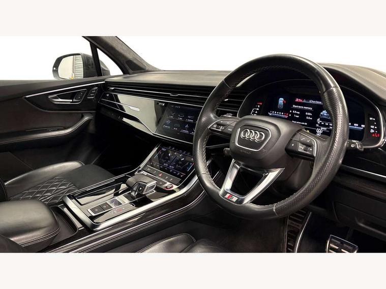 All wheel steering, Audi connect safety and service (e-call), Audi connect with Amazon Alexa Integration, Audi drive select (Auto, Comfort, Dynamic, Efficiency, Individual, Off-road and All road), Audi virtual cockpit - 12.3" high-resolution LCD display with fully customisable instrument cluster, Bluetooth interface, Camera based traffic sign recognition, Head up Display, MMI navigation plus with MMI touch screens includes 10.1" and 8.6" screens with haptic feedback, Natural voice recognition, Power door closure, Power operated tailgate, Smartphone interface includes wireless Apple carplay/Android Auto, Start/stop system, 48V Mild hybrid technology, 85 litre fuel tank, Quattro all wheel drive with self locking centre differential, S specific adaptive air sport suspension, 2 USB-C ports with charging functionality in the rear, Audi music interface - front 2 USB-C ports with charger and data functions, DAB digital radio module, 3rd brake light, Audi Beam uses LEDs to project Audi logo onto the ground as you exit your SQ7, Audi HD matrix LED headlights with Audi laser light + dynamic front and rear indicators, Auto dimming frameless rear view mirror, Black roof rails, Electric panoramic glass sunroof, Electrically adj heated/folding + automatically dimming exterior mirrors with memory + automatic kerb side function for passenger side exterior mirror, Gloss black finish for exterior Audi rings and SQ7 logos, Headlight washers, Heat insulating glass in windshield, Integrated LED indications in door mirrors, LED daytime running lights, LED rear tail lights, Privacy glass - dark tinted rear and rear side windows from B-pillar backwards, Rear side wing doors, Rear wiper, S front and rear bumpers, S specific rear bumper with 4 exhaust pipes, 2 seat bench in 3rd row, 3 seat bench in 2nd row, 3 spoke heated leather multi-function sport steering including paddle shift, 4 zone deluxe automatic climate control, 7 seat layout with ISOFIX points for the front passenger seat and rear passenger seat, Black dinamica headlining, Comfort front centre armrest, Double sun visors with illuminated vanity mirrors, Electric adjustable front seats/backrest bolsters, lumbar support, memory functionality, Folding rear seats, Front head restraints, Front/rear floor mats, Heated front and outer rear seats for second row, Illuminated door sill trims with S logo, Luggage compartment cover, Manual sunblind for the rear side windows and manual sunblind for the rear window, Rear head restraints, Seat ventilation and massage function in the front, Single front passenger seat, Stainless steel pedals, Valcona leather upholstery with front super sport seat S embossed logo, City assist pack - Q7, Comfort and sound pack with Bang + Olufsen premium sound system - Q7, Extended leather pack - SQ7, Titanium black styling pack - Q7/SQ7, Tour pack with Adaptive cruise assist - Q7, 3 point seatbelts on all rear seats, Audi pre sense front, Child locks on rear doors, Driver and front passenger, front side and curtain airbags, Electromechanical parking brake, Electronic Stabilisation Control (ESC) including ABS, ASR and EDL, Extended pedestrian protection measures, Hill hold assist, Seatbelt monitoring, Tyre pressure loss indicator, Warning triangle and first aid kit, Anti theft alarm, Anti-theft wheel bolts and wheel loosening detection, Remote central locking, Polished oak trim with grey finish inlay, Tool kit, Tyre repair kit,