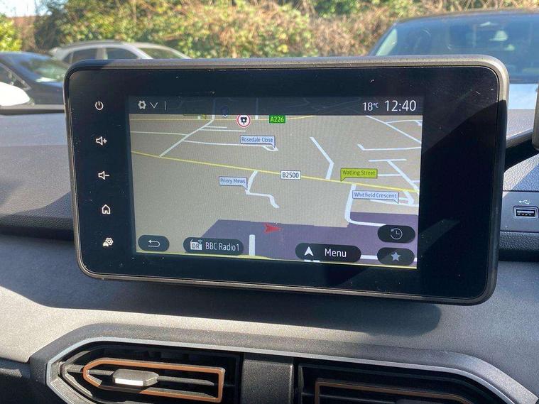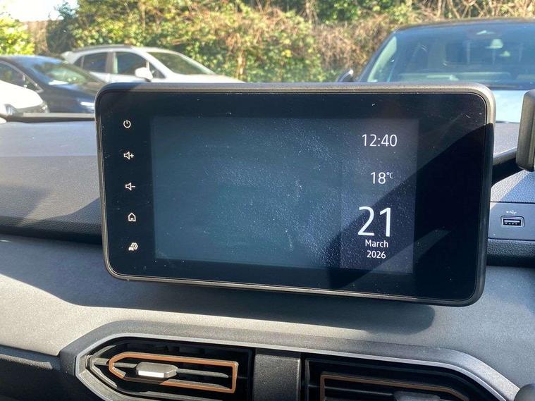 3.5" TFT instrument panel with on-board computer, Blind spot warning, Cruise control with speed limiter, Driver attention warning, eCall emergency call system, Eco mode, Electric power assisted steering, Emergency Stop Signal (ESS), Event data recoder, Extended grip switch, Front parking sensors, Lane departure warning, Lane keep assist, Rear parking sensors, Rescue code, Rev counter, Reversing camera, Stop/start system, Traffic sign recognition with speed alert/Intelligent speed assist (ISA), 8" MediaNav with DAB Radio + Smartphone replication + Bluetooth + 6 Speakers with Apple Carplay and Android Auto, USB connection for data transfer and charging, USB socket, USB-C plug, USB-C plug rear, 3 speed windscreen wipers, Auto lighting, Automatic wipers, Black radiator grille with white inserts stepway inscription, Body colour door handles, Body coloured bumpers, Copper Brown Dacia inscription on tail gate, Copper brown deco part on fog lamp area, Copper brown door mirrors, Copper brown stepway inscription on roof bars, Door sills in topographic pattern, Drivers one touch electric windows, Electrically adjustable and heated door mirrors, Front electric windows, Front fog lights, Heated rear window, High level third brake light, Lateral sticker with topographic pattern, LED automatic daytime running lights, LED Y-shape Dacia signature lighting, Megatith modular roof bars, Rear electric windows, Rear side wing doors, Rear wash/wipe, Shiny black shark antenna, Snorkel sticker with topographic pattern, Tinted windows, Topographic door protection decals and snorkel animation, 1/3 to 2/3 split folding rear seats, 12 volt front socket, 12 volt rear socket, 3 height adjustable rear headrests, 3 seat rear bench, Automatic air conditioning, Copper brown doors deco parts, Driver and passenger vanity mirror with cover, Fixed smartphone holder on dashboard, Fog grey animation on air vents, Fog grey interior door handles, Front and rear rubber mats with topographic pattern, Height adjustable drivers seat with armrest, Height adjustable front headrests, Height/depth adjustable steering wheel, High central armrest with console storage, Isofix points for child seats in both outer rear seats, Micro-cloud grey fabric on dashboard, MicroCloud fabric washable TEP upholstery, Single front passenger seat, Soft feel steering wheel, Steering wheel controls, 3x3 point rear seatbelts, ABS and Emergency brake assist, Advanced emergency braking system, Alcohol imoboliser predisposal, Automatic emergency braking system, Child locks on rear doors, Door open visual and audible warning, Driver airbag, EBD - Electronic brakeforce distribution, Electronic parking brake, ESC (Electronic Stability Control), ESP + Hill Start Assist, Front curtain airbags, Front seatbelt pretensioners, Front side airbags, Height adjustable front seatbelts, Passenger airbag, Seatbelt reminder for driver and front passenger, Side impact protection, Tyre pressure monitor, Automatic central locking, Immobiliser, Keyless entry, Remote central locking, Decopart on instrument panel and door with textile, 16" Mahalia black alloy wheels,
