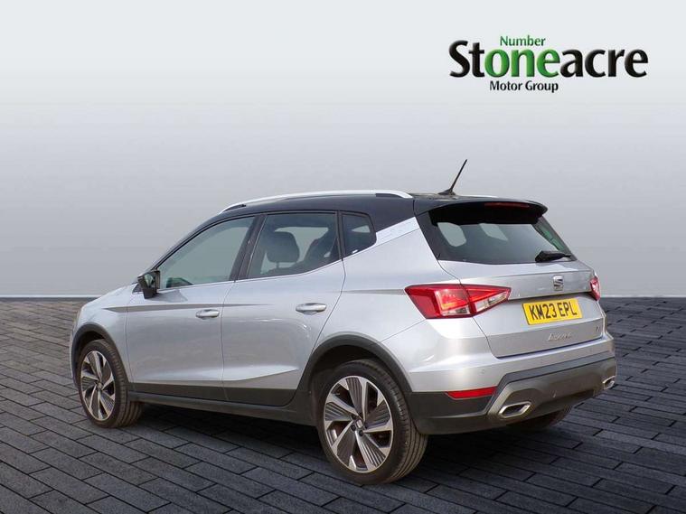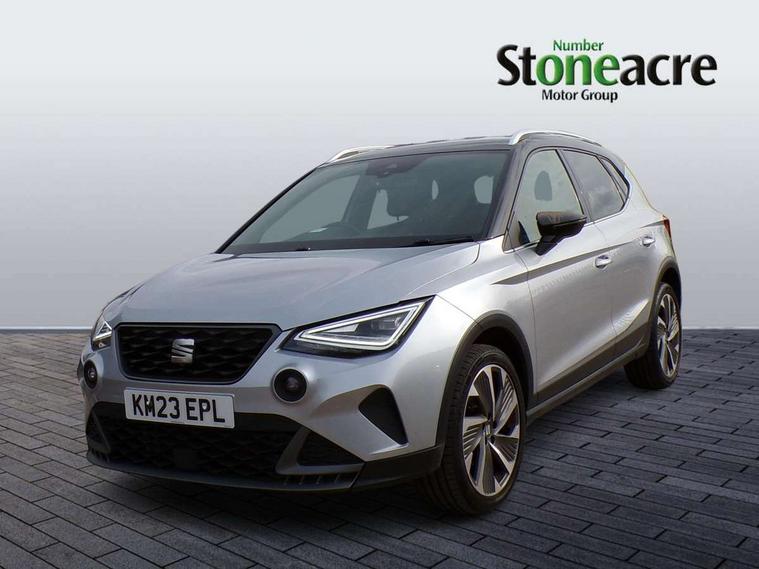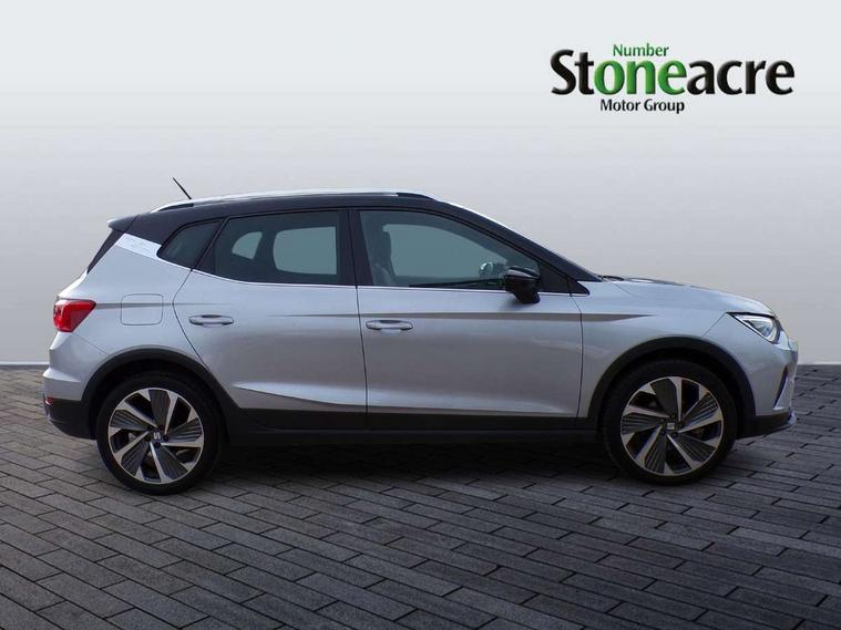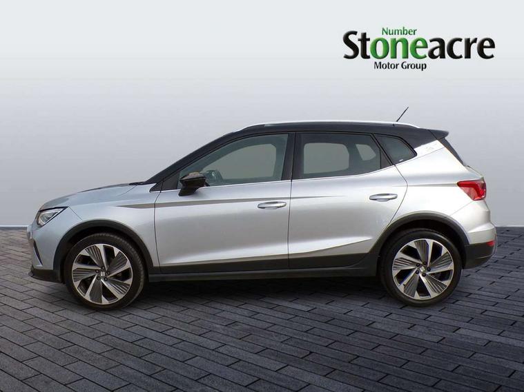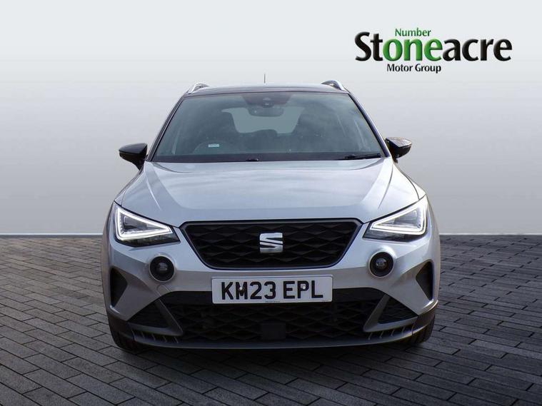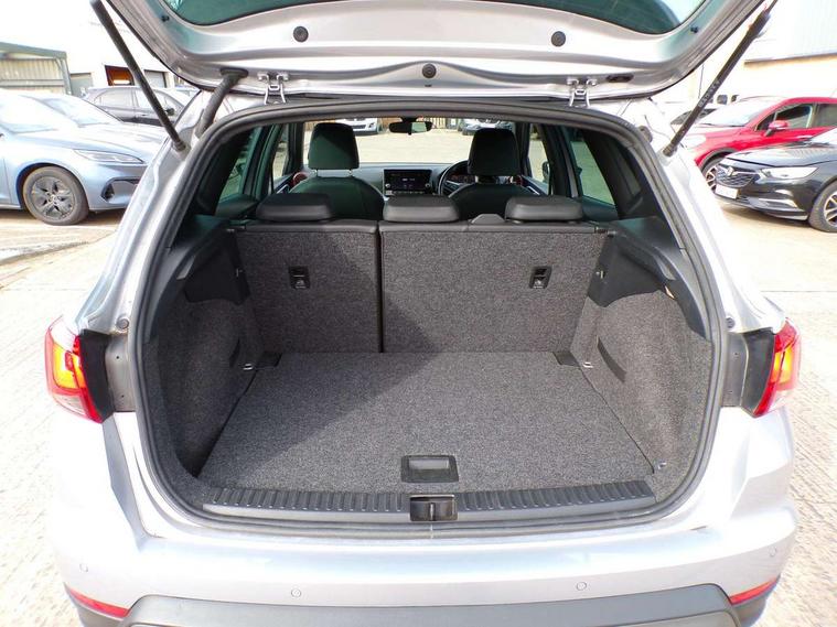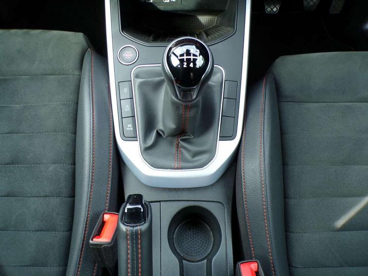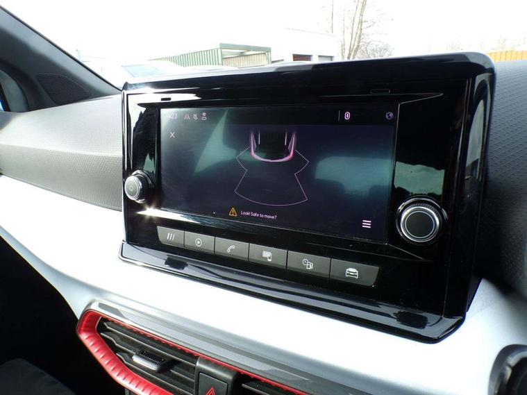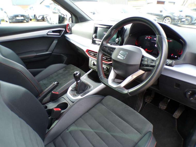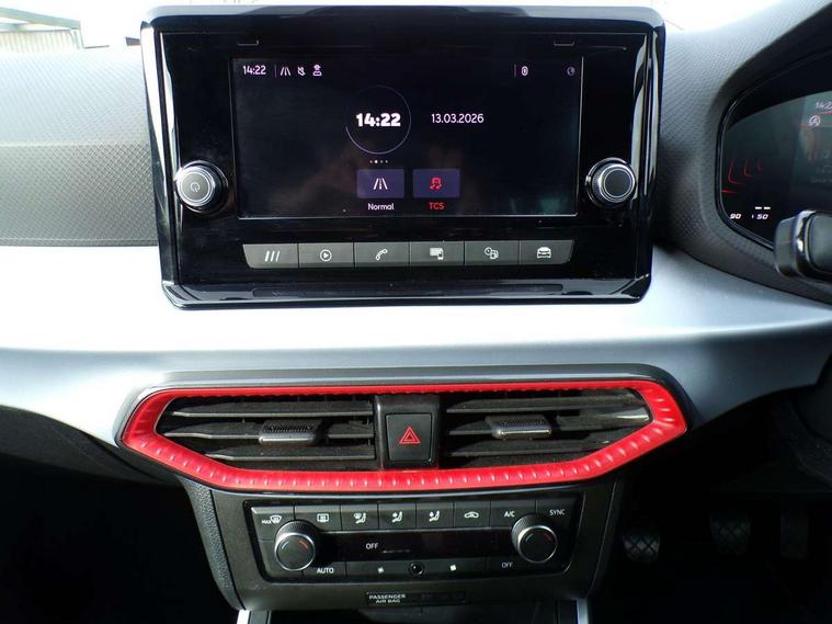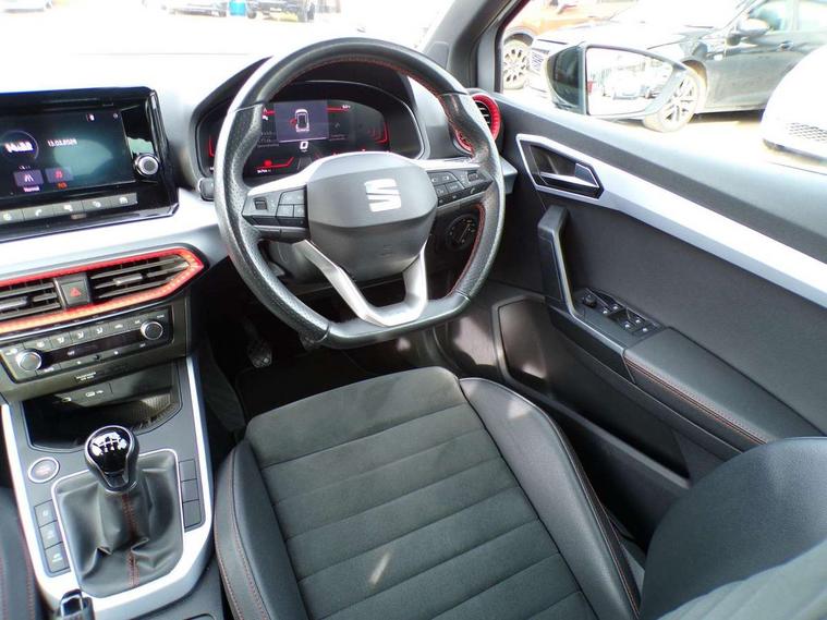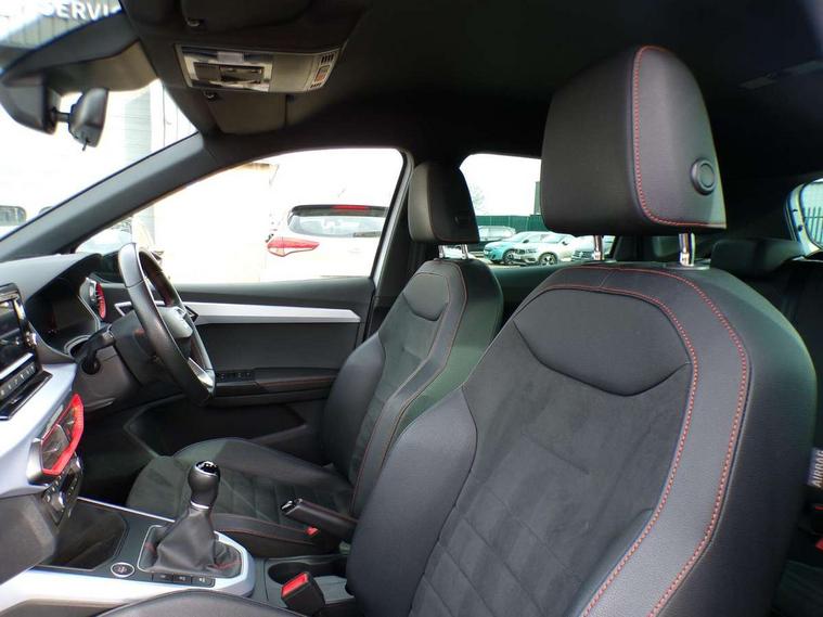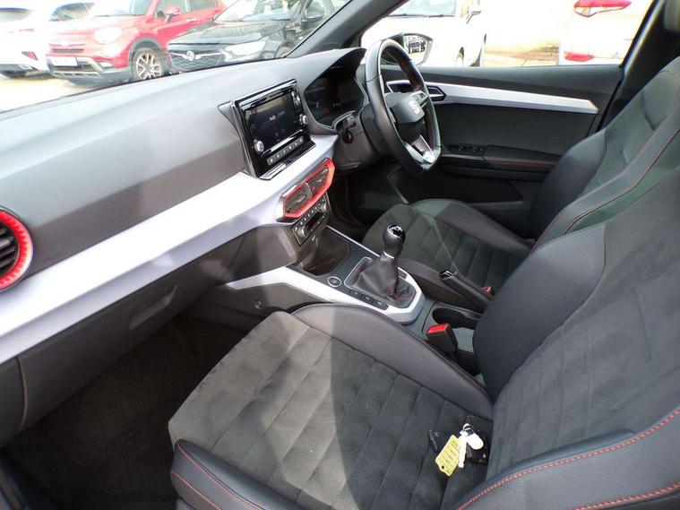 'Lights On' Reminder warning buzzer, Analogue cockpit with physical dials, Digital clock, E-call, Electric speed sensitive power steering, Full Link Smartphone Integration with Mirror Link, Apple Car Play, Google Android Auto with USB Type C cable for Apple and Android compatibility, Lane keeping system, Low fuel warning light, Outside temperature display, Rear parking sensor, RPM counter, Seat connect with safety, service and remote, SEAT Drive profile - Four different models normal-sport-eco-individual, steering response, throttle response, Trip computer, Wireless phone charger, Bluetooth interface for hands free and audio streaming, DAB digital radio and AM/FM radio, Media system with 8.25" colour touchscreen with USB port (type c), Steering wheel mounted audio controls, Anti theft roof antenna, Automatic activation of hazard warning lights, Body coloured bumpers, Body coloured door handle inserts, Chrome roof rails and window surrounds, Dark tinted rear windows, Dimming rear view mirror, Electric front/rear windows, Electrically adjustable and heated door mirrors, Front fog lights with cornering function and rear fog light, FULL LED automatic headlights with dynamic headlight range control, coming and leaving home, LED daytime running lights, LED rear tail lights and licence plate lights, Protective side mouldings, Rear side wing doors, Rear spoiler, Rear window wash/wipe, Roof colour door mirrors, Third brake light, Twin exhaust pipe styling hidden exhaust pipe, Visible VIN plate, Windshield wiper with intermittent control and potentiometer, 2 cupholders, 3 seat bench in 2nd row, 60/40 split folding rear seat, Aircare filter, Black interior roof, Double boot floor, Driver sunvisor with covered mirror + card holder, Dual zone climate control, Front comfort seats, Front courtesy light with 2x front and 2x rear reading lights, Gear shift indicator, Height adjustable front seats, Height/reach adjustable steering column, Illuminated boot, Instrument lighting with brightness control, Interior ambient lighting, Interior light in footwell, central console and door panel, ISOFIX points in outer rear seats with top tether anchorage points, Microsuede cloth upholstery, Passenger sunvisor with vanity mirror, Perforated flat bottomed leather steering wheel/gear knob/handbrake with red stitching and FR logo, Single front passenger seat, Two front and three rear height adjustable headrests, Interior chrome pack - Arona, 3 point seatbelts on all rear seats, ABS, Active front headrests, Child locks on rear doors, Driver and front passenger airbags with front passenger airbag de activation, front side and curtain airbags, Electronic stability control, Emergency Brake Assist (EBA) and front assist, Front and rear seatbelt reminder, Hill hold control, Multi-Collision braking, Tiredness recognition system, Traction control, Tyre pressure monitoring system, Alarm with back-up horn, Electronic engine immobiliser, KESSY Keyless entry and go, Locking wheel bolts, Remote central locking + deadlocks, Tow away protection, Titan black dashboard,