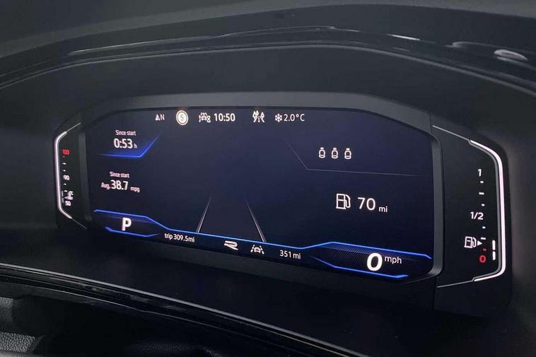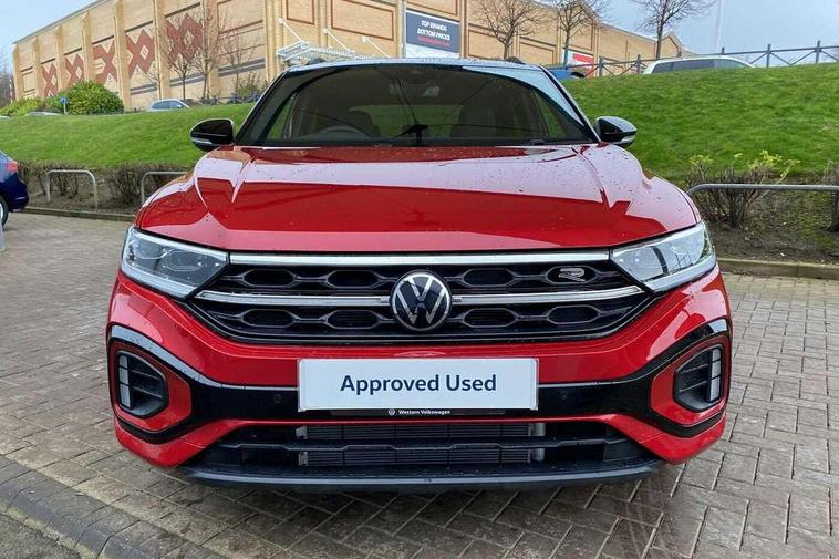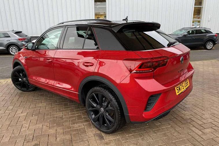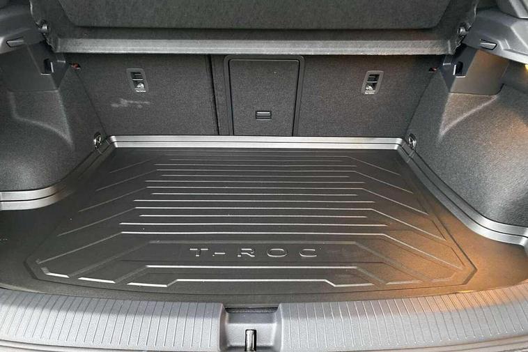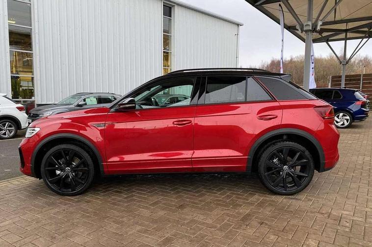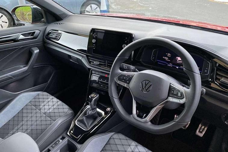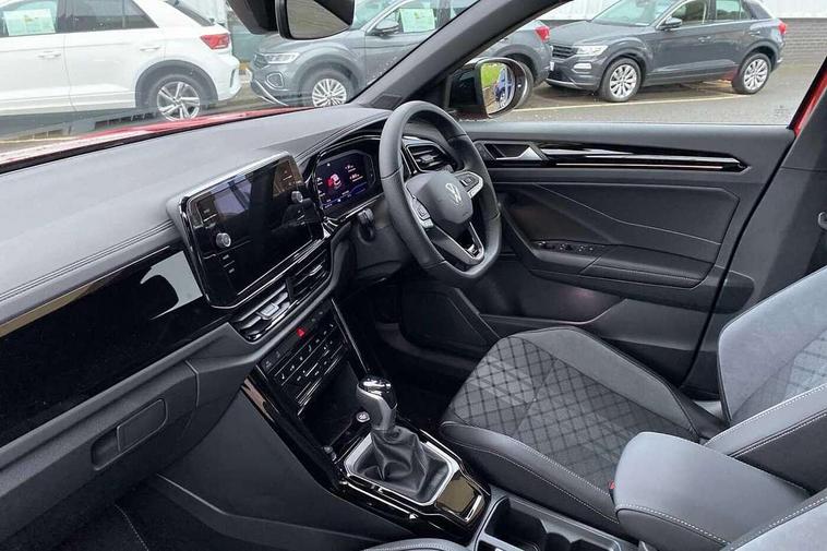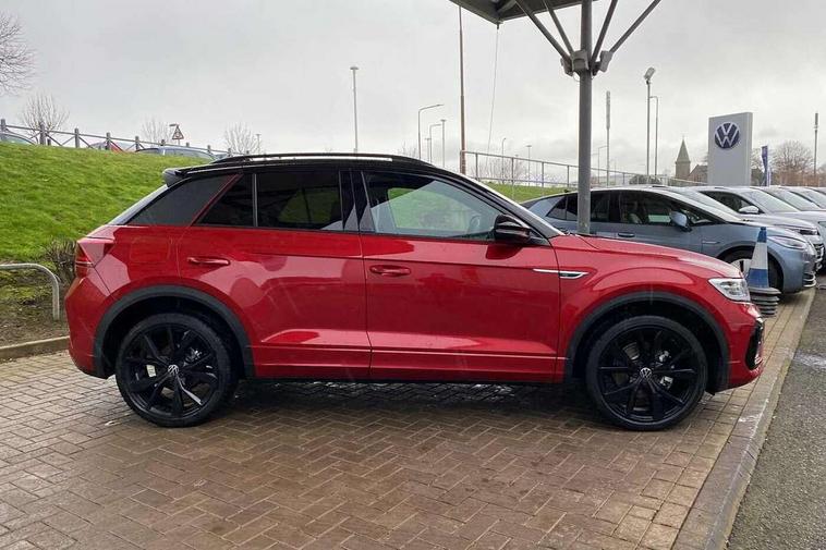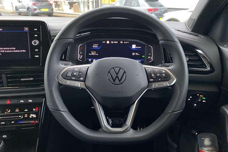 10.25" Digital cockpit pro, Advanced driver attention and drowsiness monitor, Emergency call service, Lane keeping system Lane Assist, Mobile phone interface, Modified key software - reduce switch off time for key status change to Long no motion, Online services, Park assist including front and rear parking sensors, Power assisted speed sensitive steering, Rear view camera, Service interval indicator, Tailgate/trunk lid release from outside, Think blue trainer driver tips and journey analysis, Warning sound and light for front seatbelts unfastened, Wireless app connect, Battery regeneration during braking, Rear shock absorption chassis with increased ride height, Start/stop function with battery regeneration, DAB Digital radio, Diversity antenna for FM reception, Music playback - MP3, WMA and AAC files, SD card slot, Simultaneous pairing of 2 compatible mobile devices, Title and cover art display, We Connect and We Connect Plus functionality, Advanced dynamic light assist for LED matrix headlights, Auto dimming interior rear view mirror, Automatic hazard lights activation under emergency braking, Black roof rails, Dynamic cornering light, Dynamic headlight range control with self adjusting whilst driving, Electrically adjustable and heated door mirrors, Extended roof spoiler, Exterior ambient lighting, Exterior mirrors aspherical on driver side, convex on front passenger side, External USB type C socket and charging sockets, Front windscreen wiper with intermittent wipe and 4 position delay, Heated rear window, Illuminated front grille, IQ LED matrix headlights, LED 3rd brake light, LED rear number plate lights, LED rear tail lights with dynamic turn signal, LED separate daytime running light, Light mode for poor weather, rain, fog or snow, Power windows with comfort operation and circuit breaker, Privacy glass for rear side windows and rear window, R-Line design body coloured bumpers, Rain sensor, Rear exhaust tailpipe, Rear fog light on one side and reversing lights on both sides, Rear side wing doors, Rear wash/wipe with intermittent wipe setting, Remote electrically foldable door mirrors, puddle lights and reverse activated passenger's door mirror, Tilting and sliding panoramic sunroof with rear panoramic sunroof, 12V power socket in centre console, 3 rear head restraints, 3 seat bench in 2nd row, 4 load lashing points in luggage compartment, Air care climatronic air conditoning system with active combination filter and 2-zone temperature control, Chrome plated radiator grille inserts, air vent surrounds and light switch surrounds, Door and side trim panel with leatherette insert, Drawer under drivers seat, Front + rear carpet mats, Front centre armrest, Front comfort sports seats, Front cupholders x 2, Front footwell illumination, Front reading light, Front scuff plates with R Line logo, Front seat back storage pockets, Glove compartment door with light, Instrument lighting, white adjustable panel illumination, Interior ambient lighting and surround lighting, Interior light delay, Isofix child seat preparation, Leather gearshift handle, Load-through provision with cup holder when folded down ('Unsplit rear seat bench, split folding backrest, with centre armrest), Luggage compartment lighting, Non-folding front passenger seat backrest, Single front passenger seat, Stainless steel pedals, Storage compartment in left and right luggage area, Storage compartment in rear doors, Storage compartments in driver and front passenger doors, Sunvisors with illuminated vanity mirrors, Variable boot floor, height adjustable and removable, Black design pack - T-Roc black edition plus, Easy open package with safelock - T-Roc, Sport pack with sports suspension - T-Roc, 3 point height adj front seatbelts + pretensioners, 3 point seatbelts in outer rear with ECE label, ABS, Child locks on rear doors, City emergency braking and pedestrian monitoring, Driver and front passenger airbag with front passenger airbag deactivation, Driver and front passenger safety-optimised head restraints, Drivers seatbelt reminder, Electronic parking brake, Electronic Stability Control (ESC) inc EDL (Electronic Differential Lock) and ASR (Traction Control), Front and rear passengers curtain airbag system including front side airbags, Front disc brakes, Hill start assist, Predictive pedestrian protection, Rear disc brakes, Two tone horn, Tyre pressure loss indicator, Volkswagen roadside assistance, Keyless locking and starting system keyless access with safelock, Gloss deep iron dash trim, 19" Misano black diamond turned alloy wheels with low rolling resistance and anti theft wheel bolts, Tool kit, Trims for alloy wheels, Tyre mobility kit including compressor and sealing foam,