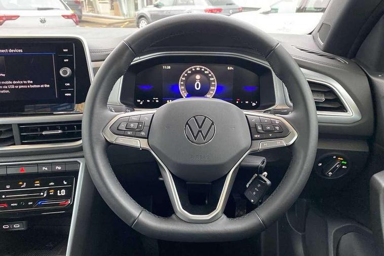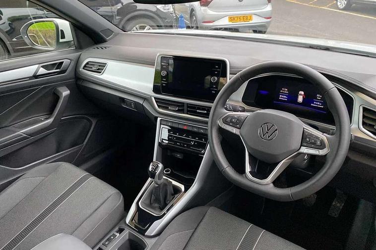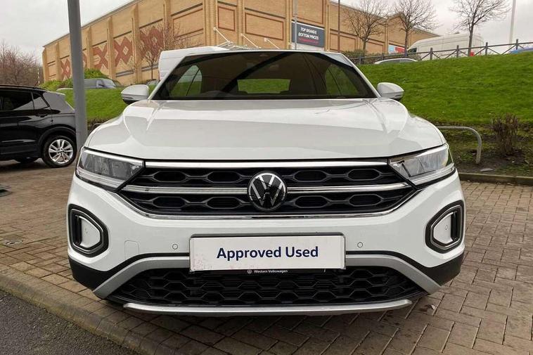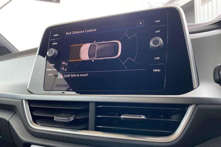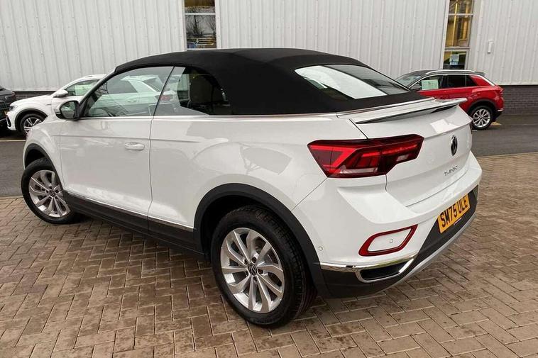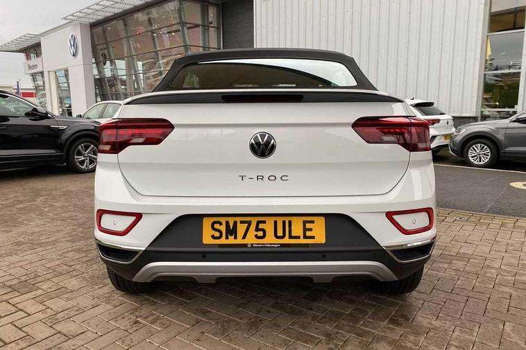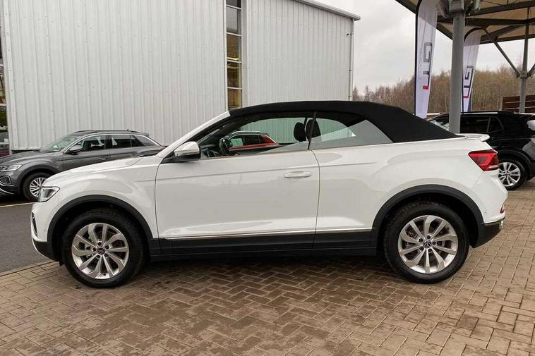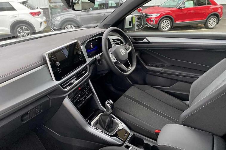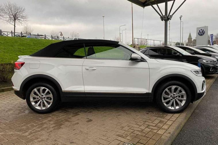 Adaptive cruise control and speed limiter, Advanced driver attention and drowsiness monitor, Brake pad wear indicator, Car information display, Driver tips and journey analysis, Dynamic road sign display, Emergency call service, Modified key software - reduce switch off time for key status change to Long no motion, Multifunction computer with visual gear change recommendation for fuel consumption, Multifunction front facing camera, Online services, Park assist including front and rear parking sensors, Speedo and rev counter, electronic odometer, trip, service interval display and exterior temperature gauge, Start/stop system with brake energy recovery, Tailgate/trunk lid release from outside, Warning sound and light for front seatbelts unfastened, Wireless App-Connect for apple Carplay and android Auto, Digital radio reception (DAB), Diversity antenna for FM reception, Mobile phone interface with inductive charging feature, Music playback - MP3, WMA and AAC files, SMS functionality - read, compose and send SMS messages using touch-screen display, Title and cover art display, USB-C Interface and USB charging socket, We Connect and We Connect Plus functionality, Ambient lighting with logo projection, Auto dimming interior rear view mirror, Automatic hazard lights activation under emergency braking, Automatic headlight control with LED separate daytime running lights with coming/leaving home function, Black roof, Body colour door handles, Body colour rear boot spoiler, Body coloured bumpers and radiator grille with chrome trim and front fog lamps with chrome bezel, Chrome effect left and right trapezoid exhaust tailpipe fascia surround, Dark red rear combination lamps in LED technology, Dusk sensor, Exterior mirrors aspherical on driver side, convex on front passenger side, Headlight range control, Heat insulating glass windscreen, LED 3rd brake light, LED rear number plate lights, Power operated canvas convertible top, Power windows with comfort operation and circuit breaker, Rain sensor, Rear boot, Rear exhaust tailpipe, Rear fog light on one side and reversing lights on both sides, Remote electrically foldable door mirrors, puddle lights and reverse activated passenger door mirror, Volkswagen roundel, Windscreen wiper with intermittent wipe light, Without exterior ambient lighting, 12V socket in centre console storage area, 2 LED front reading lights, 2 seat bench in 2nd row, 50:50 Split folding rear seat backrests with fixed rear seat bench, Air care climatronic air conditoning system with active combination filter and 2-zone temperature control, Black door lower parts with chrome trim, Chrome plated surround to light, mirror and window switch, Door and side trim panel with leatherette insert, Easy entry backrest release, Front and rear carpet mats with black stitching, Front centre armrest, Front cupholders x 2, Front door pockets, Front seat back storage pockets, Heated multi function steering wheel, Height/reach adjust steering wheel, Instrument lighting, white adjustable panel illumination, Interior light delay, Interior light in footwell, Interior lighting with switch off delay and contact switches on all doors, Interior white ambient lighting and surround lighting, Isofix child seat preparation, Lockable glove compartment with light, Luggage compartment lighting, Rear head restraints, Single front passenger seat, Sun visors with illuminated vanity mirrors, Driver assistance pack without proactive passenger protection - T-Roc cabriolet, 2 x 3-point seatbelts/outer rear seats with ECE label, Driver and front passenger airbag with front passenger airbag deactivation, Driver and front passenger safety-optimised head restraints, Drivers seatbelt reminder, Electronic parking brake, Electronic Stability Control (ESC) including ABS, ASR and EDL, Front and rear disc brakes, Front assist with autonomous emergency braking, Pedestrian monitoring, Predictive pedestrian protection, Rigid safety cell with front and rear crumple zones, Side airbag/thorax airbag system, for front passengers, Three point height adjust front seatbelts + pretensioners, Two tone horn, Tyre pressure loss indicator, Volkswagen roadside assistance, Anti-theft alarm system with interior protection and central locking system with SAFELOCK, radio remote control and 2 remote control folding keys, Electronic engine immobiliser, Trims for alloy wheels,