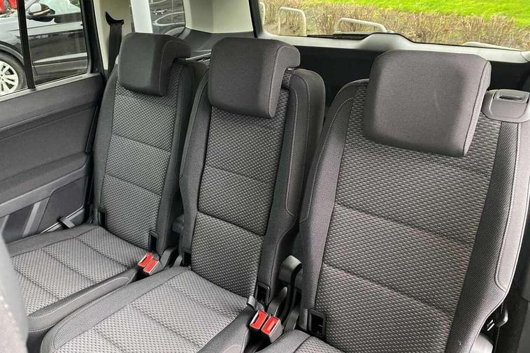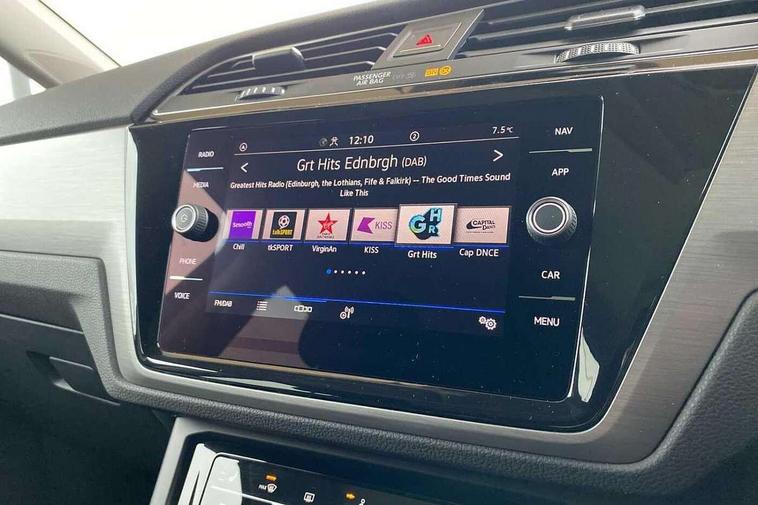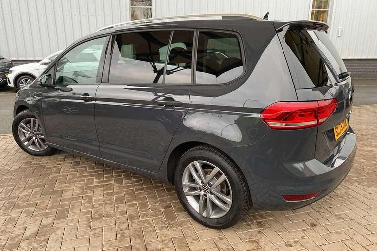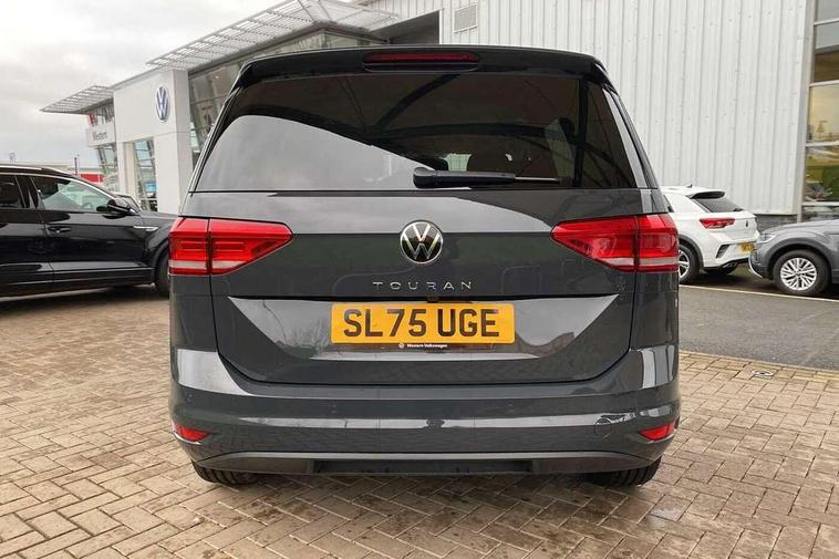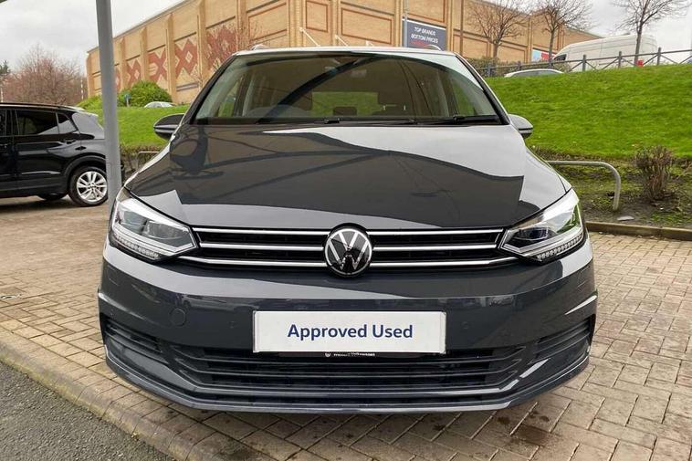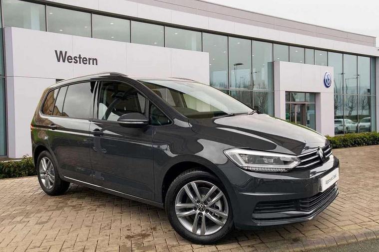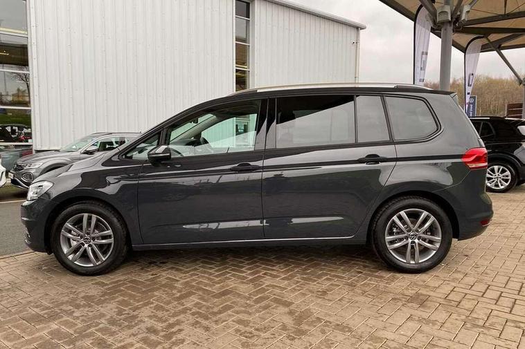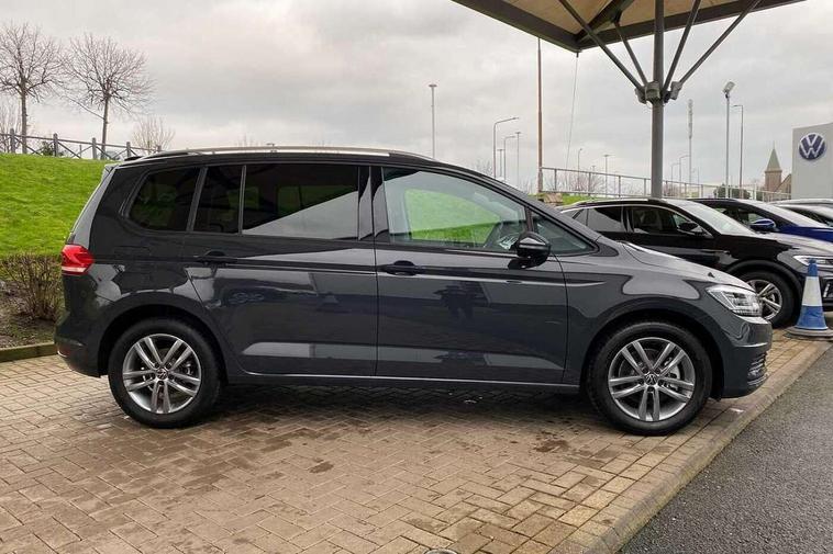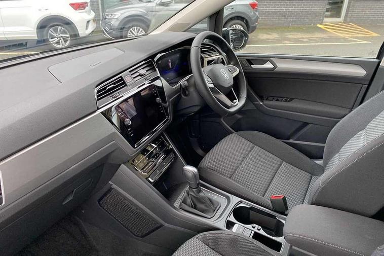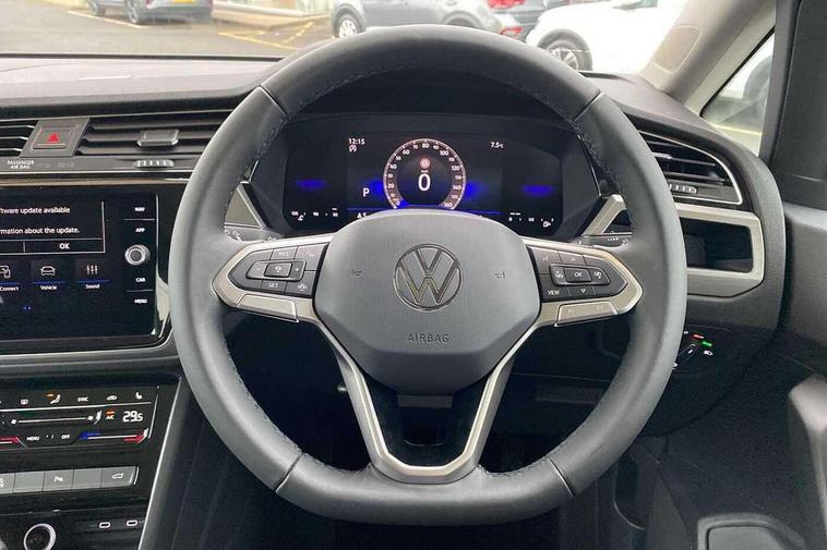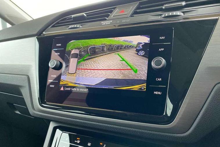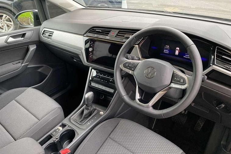Adaptive cruise control, Audible lights on warning, Discover media navigation touchscreen navigation/radio system with streaming and internet, Driver alert system, Driver profile selection, Dynamic road sign display, Electric tailgate, Electronic odometer, Emergency services call system, Extended, crash-active and proactive Pedestrian and cyclist monitoring, External temperature gauge, Front parking sensors, Lane change system side assist and rear traffic alert, Lane keep assist, Misfuelling protection device, Mobile pairing with SMS function, Mobile phone interface with inductive charging, Rear view camera displayed via vehicles audio system display, Rev counter with fuel gauge, Side scan, Speed limiter, Speed sensitive power steering, Stop/start system, Think blue trainer driver tips and journey analysis, Trip and service interval display, We connect' and 'We connect plus' functionality, Petrol Particulate Filter, Rear stabiliser bar, XDS electronic differential lock, 4x20 watt output, 8 Speakers, Audio Connectivity System, DAB Digital radio, External USB-C data socket with increased charging performance - 2 USB sockets 45W, MP3/WMA compatability, SD card slot, Title and cover art display, USB connection, Aerial integrated into side window, Auto dimming door mirrors, on driver side, surround lighting and front passenger side mirror lowering function, Auto dimming rear view mirror, Automatic coming/leaving home lighting function, Body colour bumpers, Body colour door handles, Body colour door mirrors with integral indicators, Door mirrors with memory function, Dusk sensor + auto driving lights, Electric folding door mirrors, Electric heated + adjustable door mirrors, Electric, glass sliding/tilting panoramic sunroof including integrated roller blind and LED lighting around aperture, Front and rear electric windows, Fully galvanised body, Gloss black finish B pillar, Green tinted heat insulating glass, High level third brake light, Rain sensor, Rear fog lights, Rear side wing doors, Rear tinted glass from B-pillar backwards approx 65% tinted, Rear wash/wipe with intermittent wipe setting, Removable engine badge, Silver roof rails, Tailgate wiper- reverse gear activation, Twin chrome exhaust tailpipes, Volkswagen roundel, Windscreen wipers intermittent wipe, 12V power point for Row 2, 12V socket in luggage compartment, 2 individual fold flat 3rd row seats, 2 three point seatbelts in 3rd row, 2nd row centre armrest, 2nd row centre seat converts into table, 3 single slide/fold/removable 2nd row seats, 3 spoke steering wheel, 3x3 point seatbelts on 2nd row with height adjust on outer seats, 4 boot load lashing points, 4 way adjustable front head restraints, 5 headrests, Activated charcoal canister for intensified evaporation system, Air care climatronic 3 zone air conditioning system with rear air conditioning control panel, Chrome plated radiator grille inserts, air vent surrounds and light switch surrounds, Driver and front passenger under seat drawer, Dust/pollen filters, Foldable front passenger seat backrest with load through function, Front and rear reading lights X 2, Front centre armrest with storage compartment, Front comfort seats with lumbar support, Front cupholders x 2, Front passenger seat height adjust, Front seat storage pockets, Front seatback folding tables, Height adjustable driver's seat, Height/reach adjust steering wheel, Illuminated glovebox, Instrument lighting white adjustable panel illumination with red night time illumination, Interior light with delay, Isofix on 2nd row outer seats, Isofix on 3rd row seats, Large storage compartment in roof console, Lasano cloth upholstery, Leather multifunction steering wheel with gear knob, Leatherette on rear of front seats, Low tunnel 2nd row seat, Luggage compartment lighting, Media box in dashboard on passenger side, Multi storage in passenger/luggage areas, Multi-function centre console with storage facilities, Retractable luggage cover, Split folding rear seat backrests, Storage bins on all doors, Sun visors with illuminated vanity mirrors, Family Pack - Touran, Winter pack without heated washer jet - Touran, 3 point height adjustable front seatbelts, Auto hold function, Automatic post collision braking system, Door open warning reflectors, Driver/Front Passenger airbags, Drivers knee airbag, EDL + ASR, Electronic parking brake, Energy recovery system, ESC with ABS, First aid kit, Front and rear (row 2) curtain airbags, Front assist with autonomous emergency braking, Front seat side impact airbags, Front seatbelt pretensioners, Front/rear disc brakes, Hill hold control, Hydraulic Brake Assist (HBA), Loose wheel warning function, Manual passenger airbag deactivation function, Pre crash preventive occupant protection, Proactive passenger protection system with front and side assist, Rear child proof door locks, Road sign recognition, Seatbelt warning lamp and buzzer, Traction control, Two tone horn, Warning triangle, Alarm with remote central locking and interior protection, Electronic engine immobiliser, Keyless Access Keyless locking and starting system with SAFELOCK, New brushed design decorative inserts in dash and front doors, 17" Salvador alloy wheels with anti-theft wheel bolts, 215/55 R17 self sealing tyres with low rolling resistance,