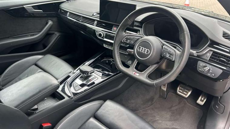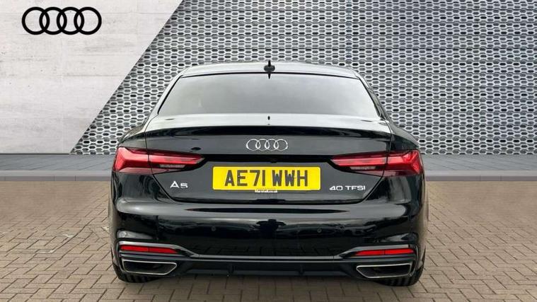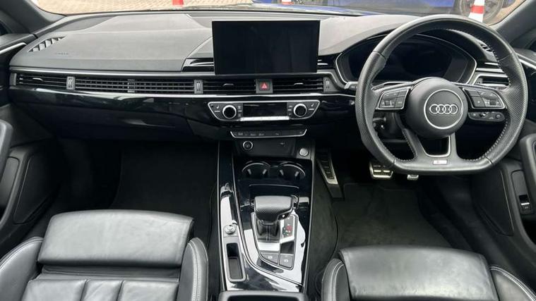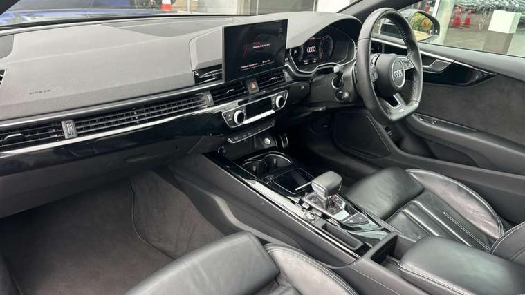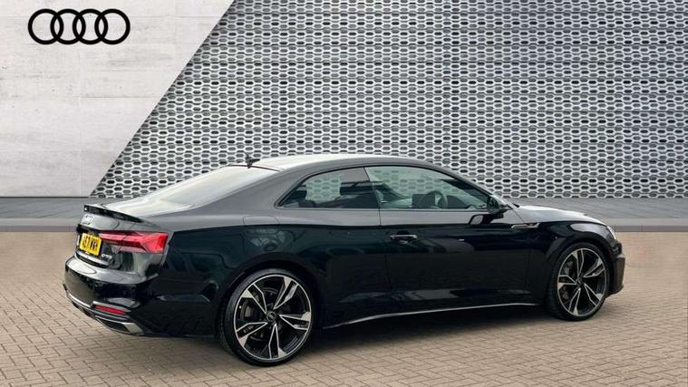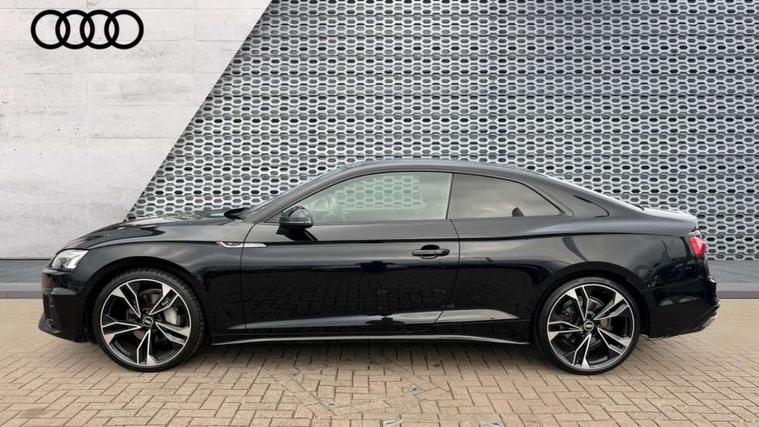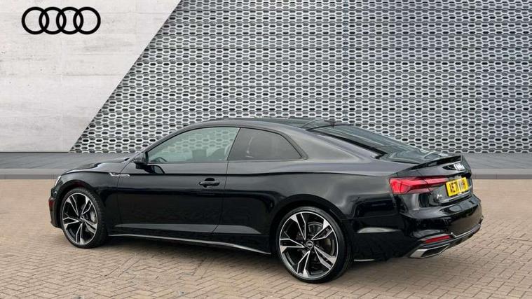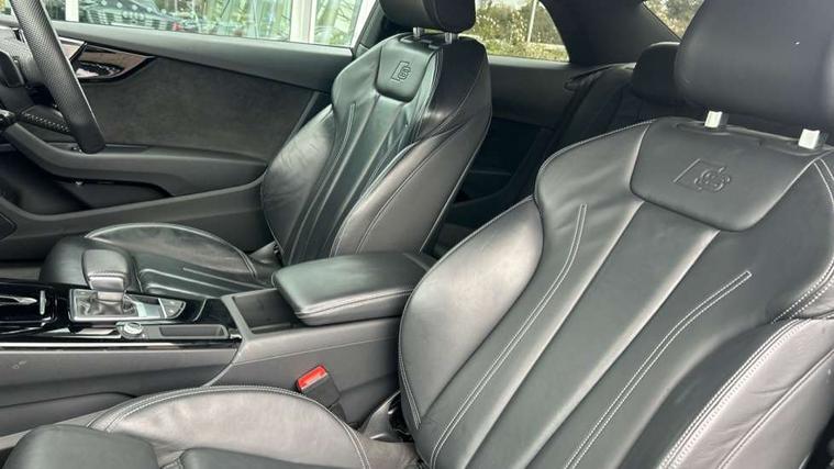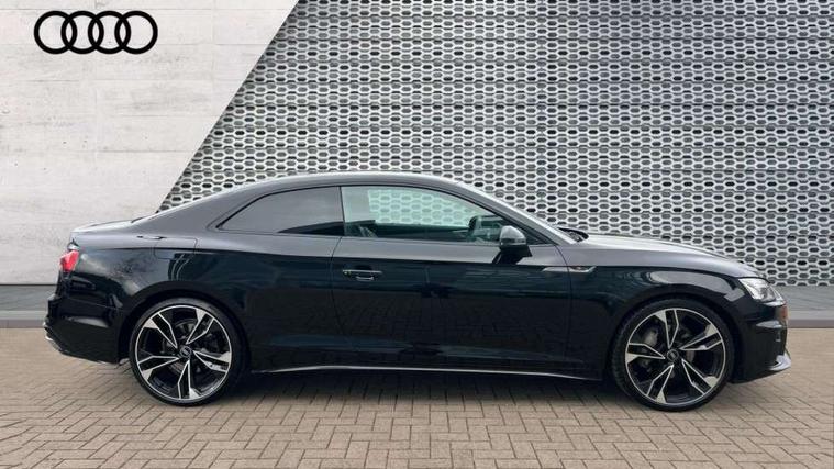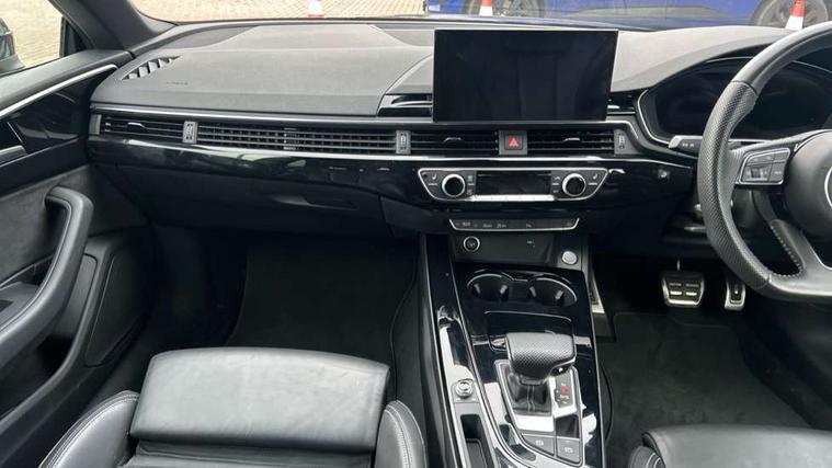 Audi connect safety and service (e-call), Audi drive select (Auto, Comfort, Dynamic, Efficiency and Individual), Audi parking system plus with front and rear sensors, Audi phone box with wireless charging, Audi smartphone interface, Audi virtual cockpit - 12.3" full colour digital instrument cluster, vehicle/engine speed, Radio/media information+Driver assistance systems, Automatic start-stop system with coasting functionality and efficiency programme, Bluetooth interface, Electric boot lid release, Electro-mechanical power steering, Email, calendar and text messages displayed via MMI, MMI nav+ with MMI touch - 10.1" high resolution MMI display, touch sensitive, 3D map, route/country info, dynamic route guide, personal route assist, Rear view camera, Service interval indicator, Voice control system, Sports suspension lowered by 23mm, 8 passive loudspeakers, CD player, DAB digital radio reception, Two additional USB ports for rear passenger in rear centre console, Two SDXC card slots, Auto dimming rear view mirror, Black door mirror housings, Body colour bumpers, Body colour door handles, Body colour front spoiler lip, Body colour side sill trim, Electric adjustable heated door mirrors, Electric folding door mirrors, Electric front windows, Front fog lights, Honeycomb structure radiator grille in grained matt black, Matrix LED headlights with Audi laser light, dynamic light sequencing and dynamic indicator, Matt aluminium silver tailpipe trim, Privacy glass, Rain and light sensors, Rear diffuser in matt titanium black with trim strip in matt aluminium silver, Side air inlets in grained matt black with matt aluminium silver inlay, Sport front and rear bumpers with side skirts, Towbar preparation, Windscreen with acoustic glazing, 4 way electric lumbar support for driver and front passenger, 40/20/40 split folding 2 seater rear seat bench with rear centre armrest, Adjustable steering column, Black cloth headlining, Black perforated leather gearknob, Contrast stitching on seats, steering wheel and gear lever gaiter, Deluxe 3 zone electronic climate control, Electrically adjustable front seats, Fine Nappa leather upholstery with front sports seats S embossed logo, Front centre armrest, Front head restraints, Front/rear floor mats, Heated front seats, Illuminated door sill trim with S logo, ISOFIX child seat mounting and top tether, Luggage compartment mat, Rear headrests, Stainless steel pedals, Sunvisors with vanity mirrors, Tool kit, Black styling pack - A5 Coupe/Sportback, LED interior light pack - A5/RS5, 2 x 3-point rear seat belts, 6 airbags - Driver, front passenger, curtain and side airbags, Electromechanical parking brake, Electronic Stabilisation Control (ESC) including ABS, ASR and EDL, Front passenger airbag deactivation, Height adjustable front seatbelts, Hill hold assist, Multi collision brake assist, Pop-up bonnet for pedestrian protection, Seatbelt monitoring, Tyre pressure warning, Variable restraint system, Warning triangle and first aid kit, Anti theft alarm system, Anti theft wheel bolts, Immobiliser, Keyless Go, Remote central locking, Piano black finish inlay, 20" 5 twin spoke polygon design alloy wheels in gloss anthracite black and gloss turned finish, Tyre repair kit,
