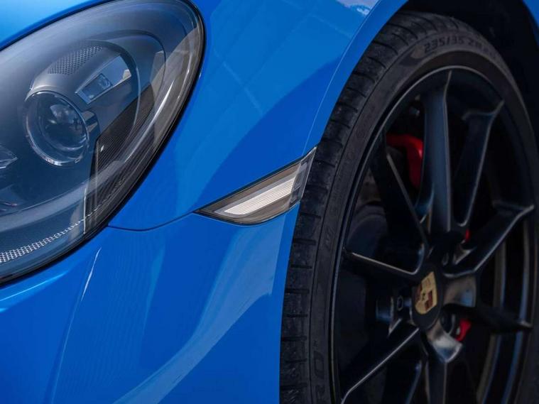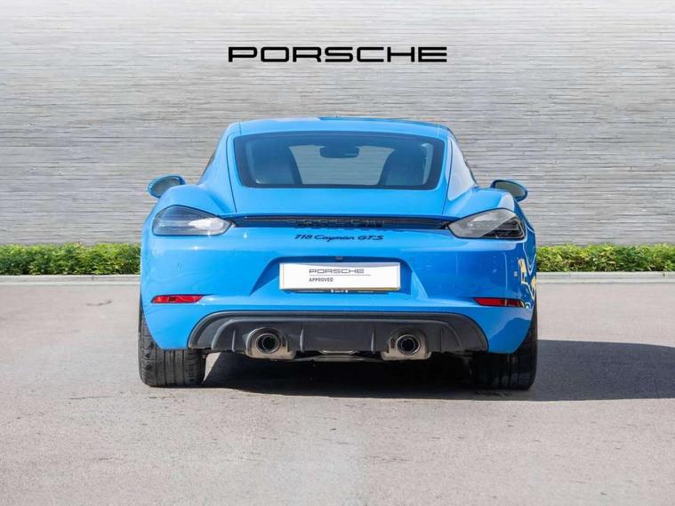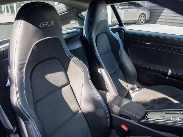 Auto start and stop system, Digital displays for vehicle speed, chosen gear, odometer, trip odometer and clock, eCall emergency call system, Instrument cluster with central rev counter and high-resolution 4.6 inch colour display, Porsche Communication Management (PCM) including online navigation module, mobile phone preparation, audio interfaces and voice control system, 64 litre fuel tank, Aluminium block and cylinder heads, Central cooler, Closed underbody panelling, Direct fuel injection (DFI), Dynamic gearbox mount system, Gasoline particulate filter, Integrated dry-sump lubrication with an on-demand oil pump, Porsche Doppelkupplung (PDK), Porsche Stability Management (PSM) with ABS, advanced brake functions, Porsche TORQUE Vectoring (PTV) with mechanical rear differential lock, Rear wheel drive, Two seater vehicle with mid mounted engine, Two three-way catalytic converters and on-board diagnostics for monitoring emission control system and coated particulate filter, Variable intake manifold with two switchable resonance valves, VarioCam (camshaft control for inlet and exhaust valves) and adaptive cylinder management, Water cooled with thermal management, DAB Digital radio, Integrated 4G/LTE compatible SIM including data for the Porsche Connect Services, Integrated compatible SIM including Porsche Connect Services, Navigation incl porsche + Apple Carplay, connect module, wireless internet access, carfinder, remote vehicle status, remote service and vehicle track, Wifi and music streaming, Auto deploying rear wing, Automatic headlight activation including welcome home lighting, Automatically extending rear boot spoiler, Body colour bumpers, Body colour door handles, Electrically adjustable heated exterior mirrors on door waist rails, aspherical on driver's side, Electrically folding exterior mirrors including courtesy lighting, Green tinted heat insulating glass, Grey top tinted windscreen, Heated rear windscreen, Intelligent lightweight body in Aluminium/Steel composite construction, LED 3rd brake light, LED tail lights and integral 4 point brake lights and reversing lights, Power windows with one touch operation and door seal protection, Rain sensor, Rear boot, Separate tinted auxiliary lights in the front end with LED indicators and position lights, Side air intakes with one grille in black, Specifically designed GTS front and rear aprons partially painted in black, Twin tract sports exhaust system with two tailpipe in stainless steel high gloss black, Wide opening rear hatch with heated screen, Windscreen washer system with two wiper speeds and washer jets, 12V sockets in passenger footwell and centre console storage compartment, 718 logo on gear lever, Additional smooth finish leather with door panel armrest and centre console main storage compartment, Adjustable fan with air recirculation and defroster functions, Ascending centre console with uncovered storage compartment and closed storage compartment, Clothes hooks on front seat backrests, Footwell illumination, Front and rear luggage compartments, Front headrests, Heated seats, LED reading lights, orientation, ignition lock, additionally luggage compartment and glove compartment lighting, Lockable glovebox, Seat centres in race tex, side bolsters, headrests in leather and headrests embroidered with GTS logo in black, Single front passenger seat, Storage compartments in each doors, Two individual cup holders (Passenger side, integrated into dashboard trim strip), Sport chrono package including mode switch - Cayman, 3 point automatic seatbelts, ASR, Electrically controlled parking brake, Front 6 piston aluminium monobloc fixed calipers/Rear 4 piston, discs internally vented and cross drilled, front/rear disc diameter, red brake caliper, Front and rear lightweight spring strut axle, Front seatbelt pretensioners + load limiters, Full size driver and passenger airbags, Passenger airbag deactivate switch, Porsche side impact protection doors with thorax airbag in outer backrest side bolster and head airbag for driver/passenger in door panel, Tyre pressure monitoring system, Alarm system with interior surveillance, Anti-theft wheel bolts, Dashcam preparation, Engine immobiliser with in key transponder, central locking and remote control, Tyre repair kit, Wheel centre caps with full colour Porsche crest,