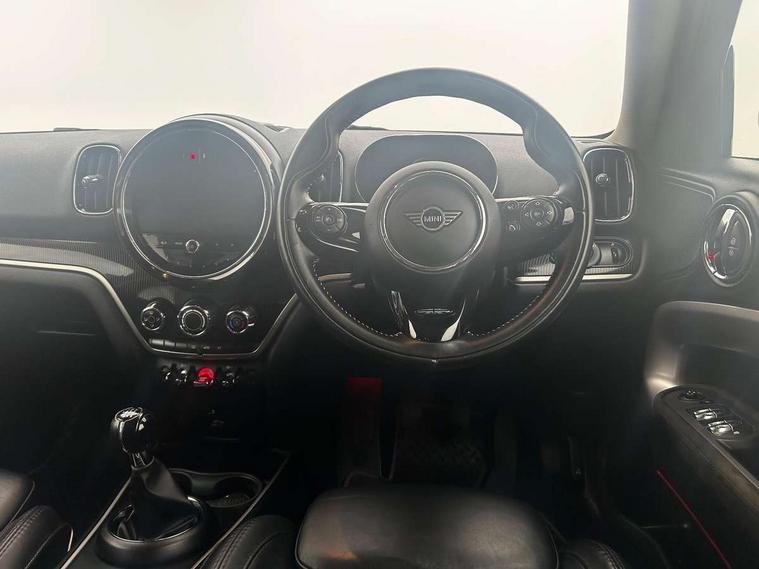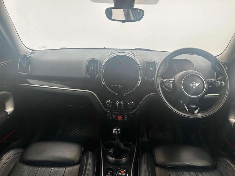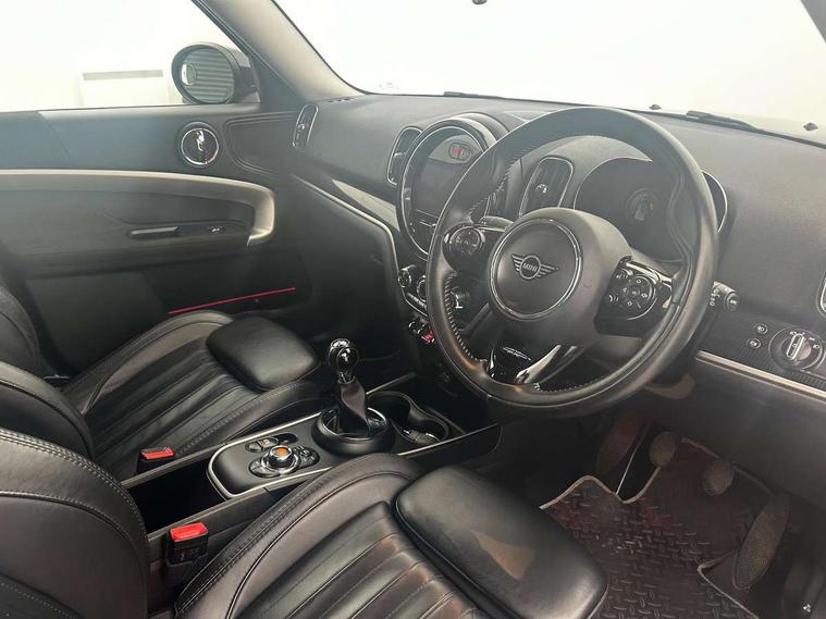 Active Guard incl speed limiting and lane departure functions with auto steering, and front collision warning with brake intervention, Automatic start/stop function with brake energy recuperation, Compatible mobile phone bluetooth with audio streaming, Electro-mechanical speed dependant steering assistance, Instrument cluster, On board computer, Rear parking distance control, 51 Litre fuel tank, 6 Speed manual transmission including gear change indicator display, Double Vanos system, Fully variable valve control, High precision injection, Performance Control, FM tuner and DAB digital radio, Body colour fuel filler cap, Day time driving lights, Door sill strips, Dynamic brake lights, Electric windows, Heated rear window, Heated windscreen washer jets, LED fog lights, LED Headlights, MINI yours exterior badge in C-Pillar, driver and passenger side, Model logo, Model logo on Tailgate, Rain sensor with auto headlights, Rear fog lights, Rear window wiper, Side scuttle panel with integrated indicator, Split rear doors, Sun/heat protection glass, White indicator lenses, 12V socket in centre console, 360L luggage compartment capacity, 4 lashing eyes in luggage compartment, 40:20:40 split folding rear seats, Anthracite headlining with grab handles and clothes hooks, Chrome interior highlights, Colour line - Carbon black, Cupholders, English handbook, Front headrests, Glove compartment, Height and length steering column adjustment, Interior lighting with 12 basic colours selectable via toggle switch in roof, Isofix rear child seat preparation, Leather gearshift lever and handbrake gaiters, LED reading lights, vanity mirror lights, front foot well light and spotlight on front seats, Manual air conditioning, MINI Yours fine walk nappa leather steering wheel with contrast stitching in silver and MINI Yours badge, MINI Yours floor mats, Multifunction steering wheel, Rear headrests, Storage compartments in doors, Sunvisors with vanity mirrors, Excitement pack - Countryman, Navigation pack - Countryman, 2 tone horn, 3 point seatbelts on all seats, 6 Airbags - front, side, head and seat belt tensioners, Anti-lock braking system (ABS), DSC - Dynamic Stability Control, Electronic handbrake, Front and rear disc brakes, Hill start assist, Tyre pressure monitoring system, Alarm system with tilt sensor, monitoring doors, bonnet interior and tailgate, Auto drive away locking, Deadlocking function, Electronic vehicle immobiliser, Locking wheel bolts, Start/stop toggle with keyless go, Tool kit,