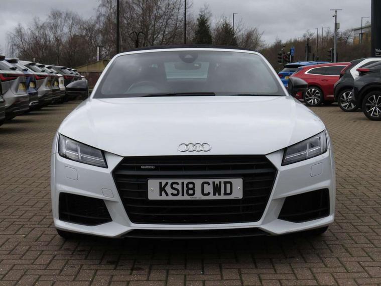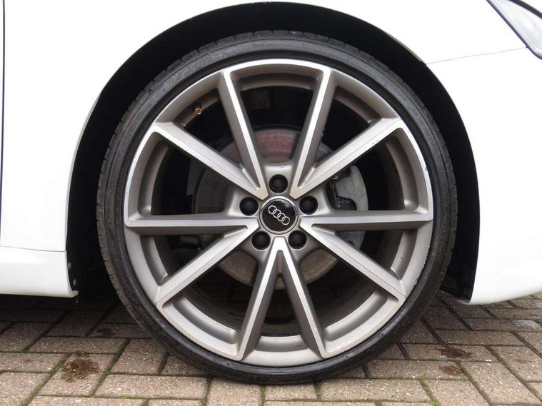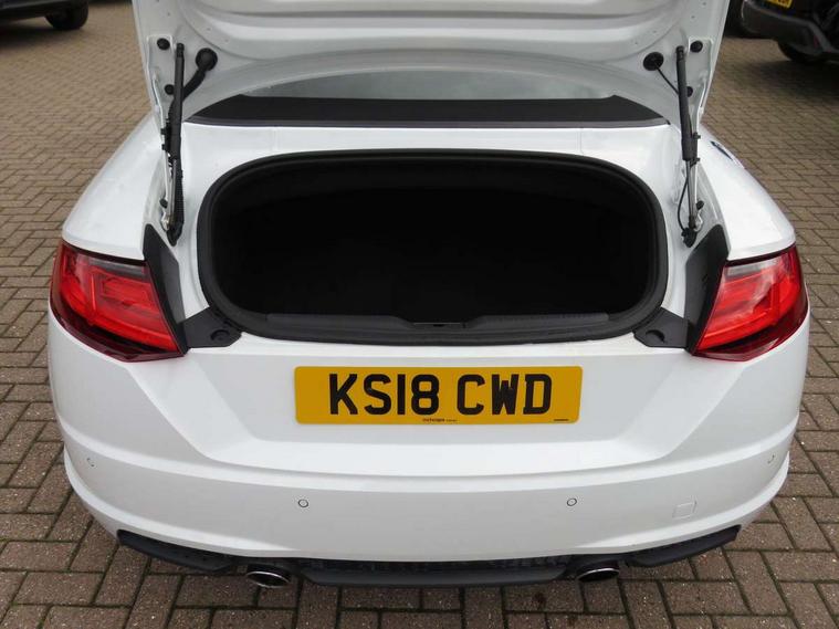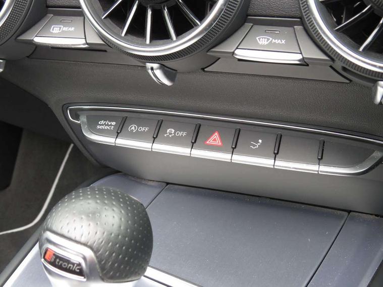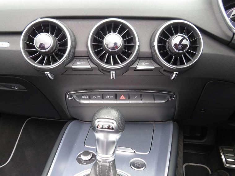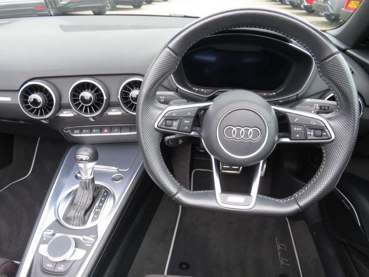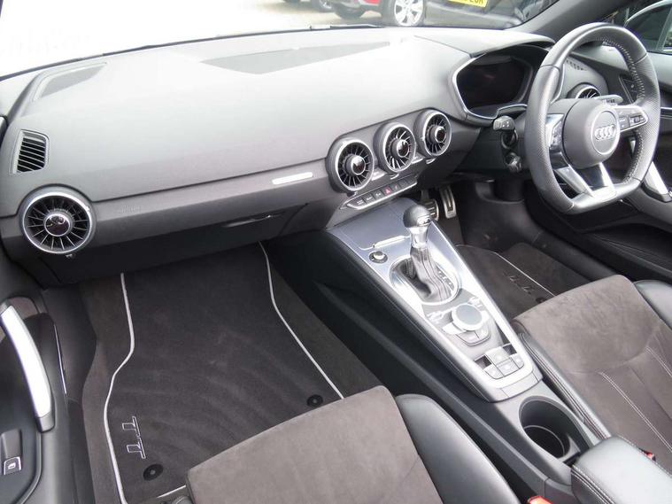 Audi drive select, Audi virtual cockpit - 12.3" high-resolution LCD display with fully customisable instrument cluster, Cruise control + speed limiter, MMI touch panel, Mobile phone preparation with bluetooth interface, Progressive power assisted steering, Seat belt microphone, Service interval indicator, Audi music interface, Auxiliary input socket, Bluetooth audio streaming, DAB Digital radio, MMI Radio with CD player and SD/XC card slot, Auto headlight range control, Black door mirrors, Body colour bumpers, Electric front windows, Fabric hood - Black, Front fog lights, Fully automatic acoustic hood, Green tinted heat insulating glass, High gloss black front grille, LED daytime running lights, Matt black radiator grille and number plate holder, Rear diffuser, Retractable rear spoiler, S Line body styling, Sunband for windscreen, Wind deflector, 3 spoke flat bottomed high multi-function leather sport steering wheel with gearshift paddles, Aluminium door sill trims, Black headlining, Electric lumbar support, Extended aluminium look with stainless steel pedals, Front centre armrest, Front head restraints, Front passenger seat isofix location point, Height/reach adjust steering wheel, ISOFIX on outer rear seats, Top tether anchor plate for isofix child seat, Auto dimming rear view mirror with light and rain sensors pack - TT, High gloss black pack - TT, Non smoking pack - TT/TT RS, 3 point front seat belts, ABS, ASR traction control, Curtain airbags, Driver/Front Passenger airbags, EDL traction control, Electromechanical parking brake, ESP, First aid kit, Front passenger airbag deactivation, Front side airbags, Head airbags, Roll over bars, Seatbelt warning, Tyre pressure warning, Warning triangle, Anti theft alarm, Immobiliser, Keyless Start, Locking wheel bolts, Remote central locking, Matt brushed aluminium inlays, Tyre repair kit,