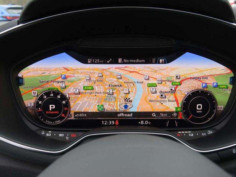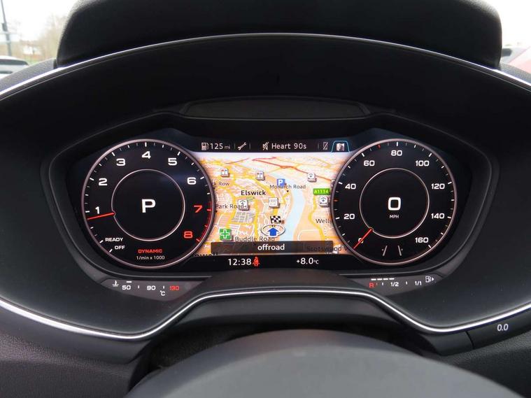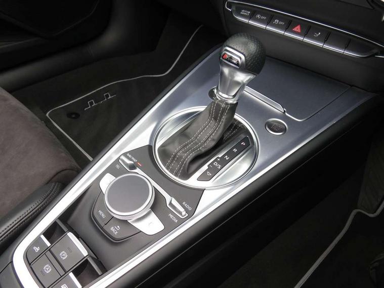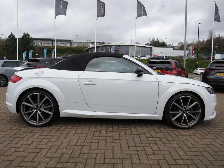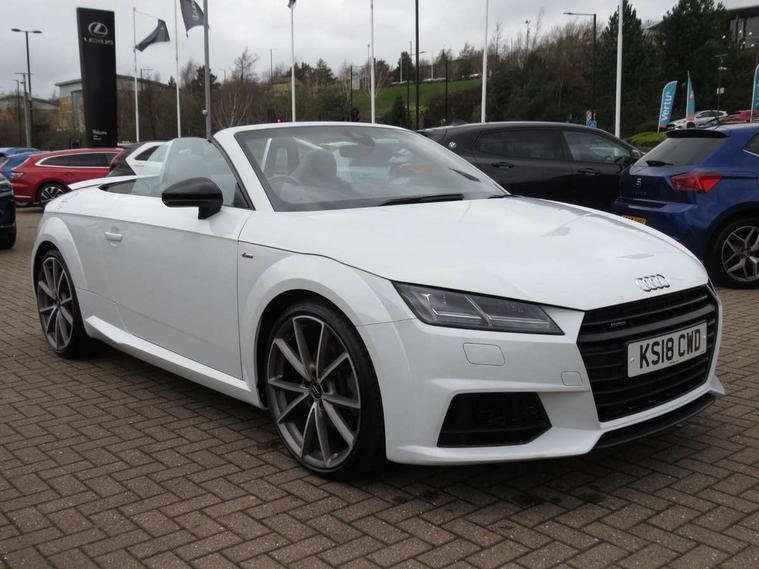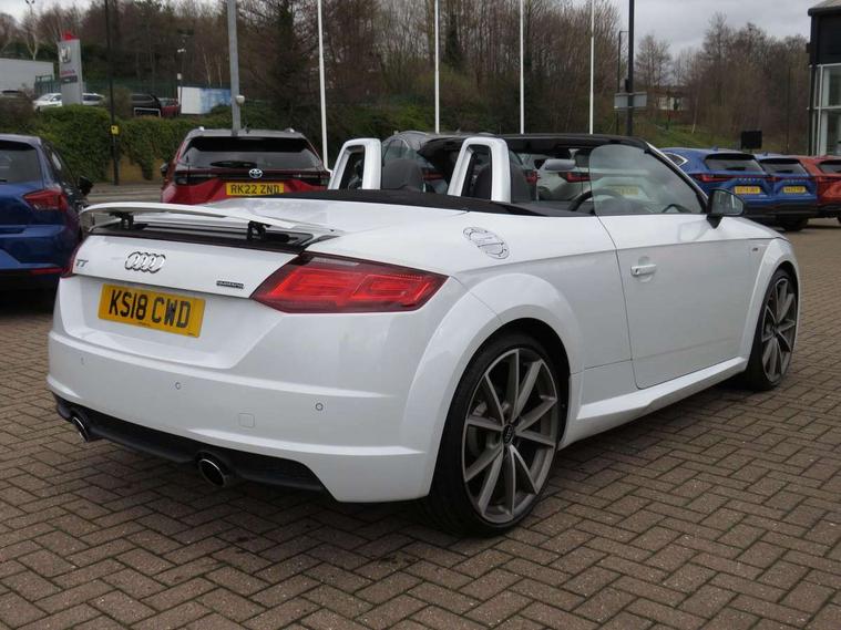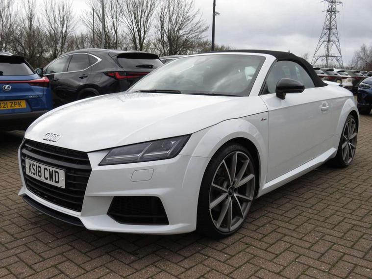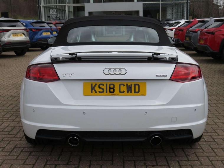 Audi drive select, Audi virtual cockpit - 12.3" high-resolution LCD display with fully customisable instrument cluster, Cruise control + speed limiter, MMI touch panel, Mobile phone preparation with bluetooth interface, Progressive power assisted steering, Seat belt microphone, Service interval indicator, Audi music interface, Auxiliary input socket, Bluetooth audio streaming, DAB Digital radio, MMI Radio with CD player and SD/XC card slot, Auto headlight range control, Black door mirrors, Body colour bumpers, Electric front windows, Fabric hood - Black, Front fog lights, Fully automatic acoustic hood, Green tinted heat insulating glass, High gloss black front grille, LED daytime running lights, Matt black radiator grille and number plate holder, Rear diffuser, Retractable rear spoiler, S Line body styling, Sunband for windscreen, Wind deflector, 3 spoke flat bottomed high multi-function leather sport steering wheel with gearshift paddles, Aluminium door sill trims, Black headlining, Electric lumbar support, Extended aluminium look with stainless steel pedals, Front centre armrest, Front head restraints, Front passenger seat isofix location point, Height/reach adjust steering wheel, ISOFIX on outer rear seats, Top tether anchor plate for isofix child seat, Auto dimming rear view mirror with light and rain sensors pack - TT, High gloss black pack - TT, Non smoking pack - TT/TT RS, 3 point front seat belts, ABS, ASR traction control, Curtain airbags, Driver/Front Passenger airbags, EDL traction control, Electromechanical parking brake, ESP, First aid kit, Front passenger airbag deactivation, Front side airbags, Head airbags, Roll over bars, Seatbelt warning, Tyre pressure warning, Warning triangle, Anti theft alarm, Immobiliser, Keyless Start, Locking wheel bolts, Remote central locking, Matt brushed aluminium inlays, Tyre repair kit,