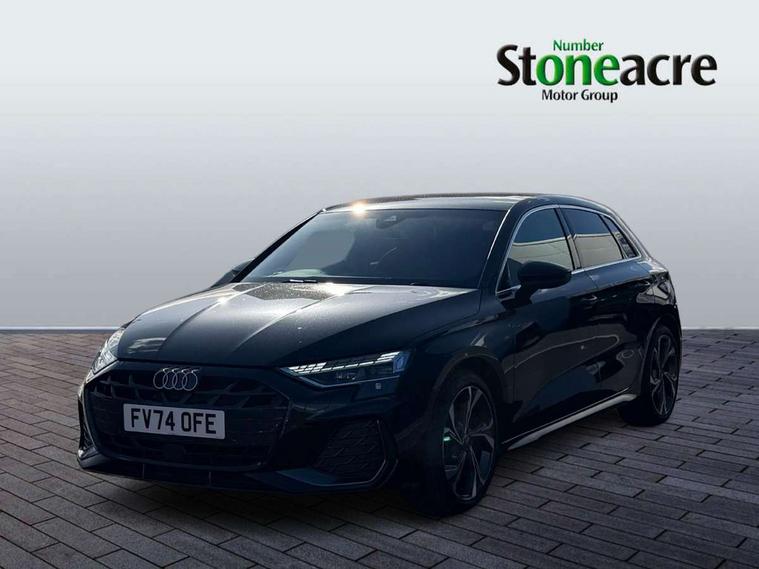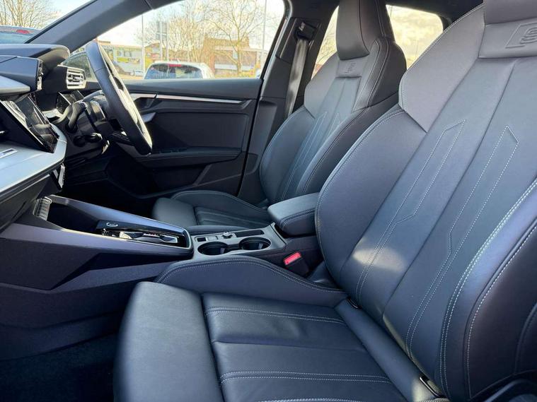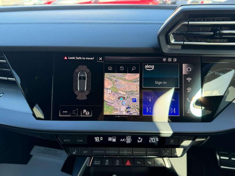 Adjustable speed limiter, Audi drive select, Audi smartphone interface with app store includes wireless Apple carplay, Android auto and Amazon alexa integration, Audi virtual cockpit plus - 12.3" full HD resolution dynamic digital instrument cluster, Automatic start/stop system with recuperation, Bluetooth interface, Camera based traffic sign recognition, Collision avoidance assistant, Cruise control, Distraction and Fatigue warning, e-Call (emergency call), Electromechanical power speed sensitive steering, Lane departure warning system, MMI Navigation Plus with high resolution 10.1" colour touch screen display, Park Assist with parking system Plus, Service indicator, Tailgate, Trip computer, Voice control system with natural language interaction, Sports suspension, Audi Phonebox light with wireless charging, Audi sound system - 10 loudspeakers including centre loudspeaker and subwoofer, DAB Digital radio, USB ports with charging function in the rear, Acoustic glass windscreen, Aluminium window trim, Auto dimming frameless rear view mirror, Body colour exterior mirrors, Chrome exhaust tailpipes, Electrically adjustable/heated/folding/auto dimming door mirrors with integrated LED indications + kerb view function for passenger side, Exterior model badging, Front and rear side air inlets in grained matt black with dark liquid chrome frame, Front electric windows, Front radiator grill in high gloss dark chrome, Heat insulating glass windscreen, Illuminated door sills with aluminium inserts at the front with S logo, LED 3rd brake light, LED daytime running lights, LED headlights with LED rear lights and dynamic rear indicators, Light and rain sensors, Privacy glass - dark tinted rear window, rear door and side windows, Rear diffuser and grill in grained matt black with inlay in dark liquid chrome, Rear electric windows, Rear side wing doors, Rear wiper, S line bumpers, S roof spoiler, Side S line emblems on front wings, Side sill trim in dark liquid chrome, 12V socket and storage compartment in front centre console, 3 seat bench in 2nd row, 3 spoke flat bottomed leather multifunction sport steering wheel with gear shift paddles, 3-zone deluxe automatic air conditioning, 4 way electrically adjustable lumbar support for driver and front passenger, 40/20/40 split folding rear seat bench, Black cloth headlining, Front and rear centre armrest in artificial leather, Front and rear headrests, Front/rear floor mats, Heated front seats, Height and reach adjustable steering wheel, Manual boot compartment lid, Manually adjustable front seats, Rear cup holders, S badging on the steering wheel, Seat side bolsters, Single front passenger seat, Stainless steel pedals and front footrest in black, Twin leather upholstery with front sports seats S embossed logo, Aluminium interior elements pack - A3 Sportback, Multi-coloured LED interior lighting package - A3, 3x3 point rear seat belts, Driver and front passenger airbag with passenger airbag deactivation, Electronic Stabilisation Control (ESC) including ABS, ASR and EDL, First aid kit with warning triangle and 2 safety vests, Front side airbags with head airbags and interaction airbag, Hill hold assist, Pre-sense front with pedestrian and cyclist detection, Seatbelt monitoring, Tyre pressure loss indicator, Anti theft alarm, Anti-theft wheel bolts, Electronically operated child locks, Immobiliser, Remote central locking with safelock, Dash & door Inlay in dark aluminium Spectrum,