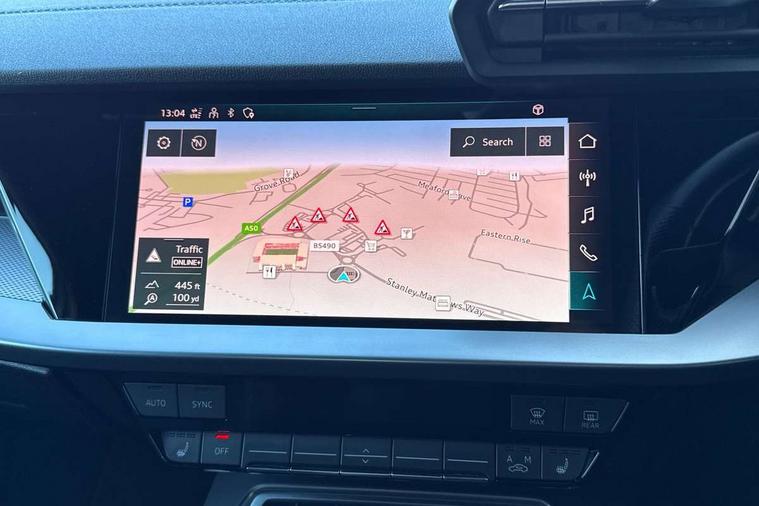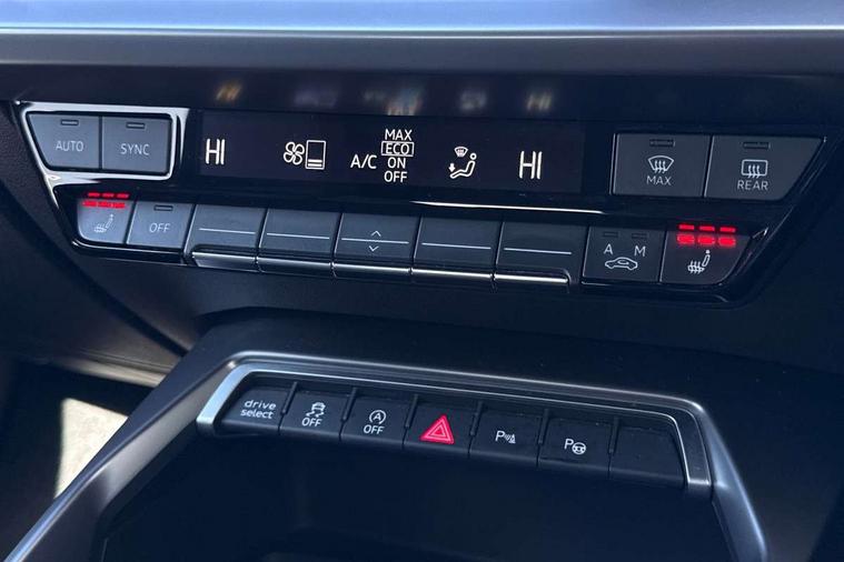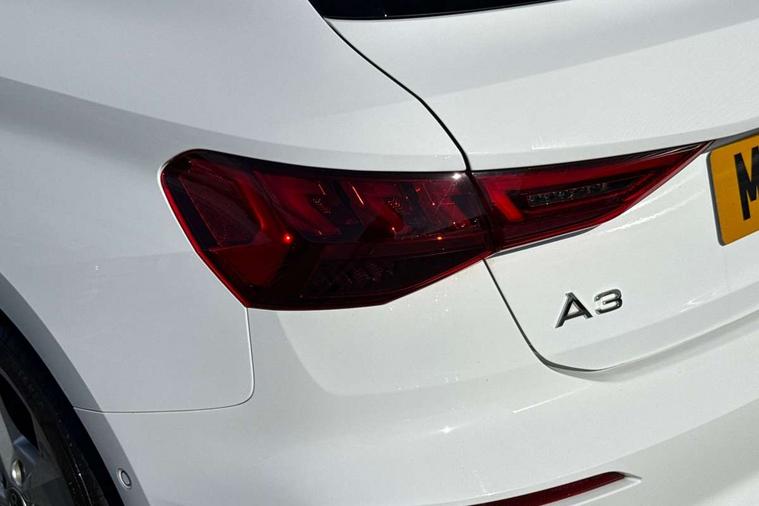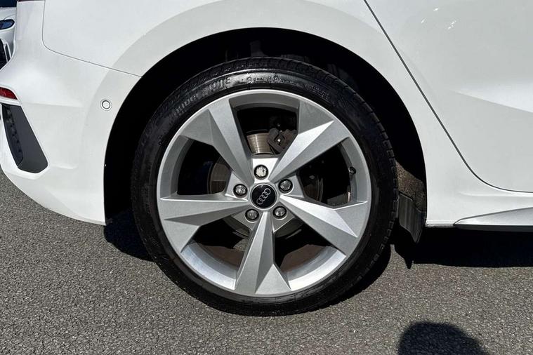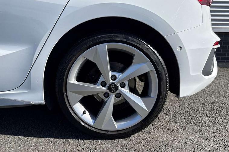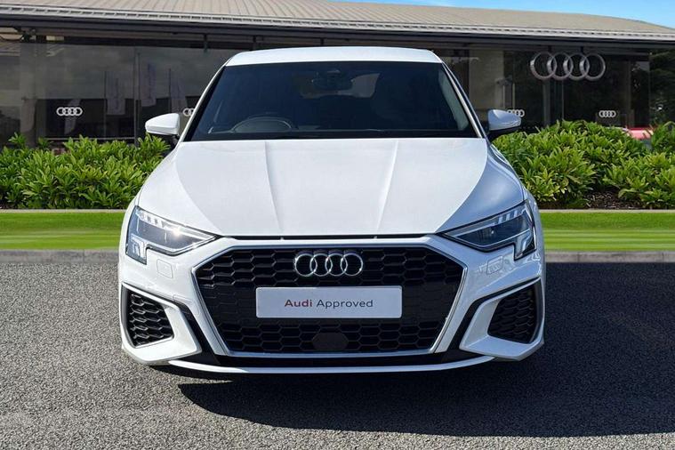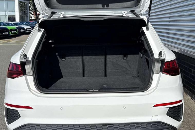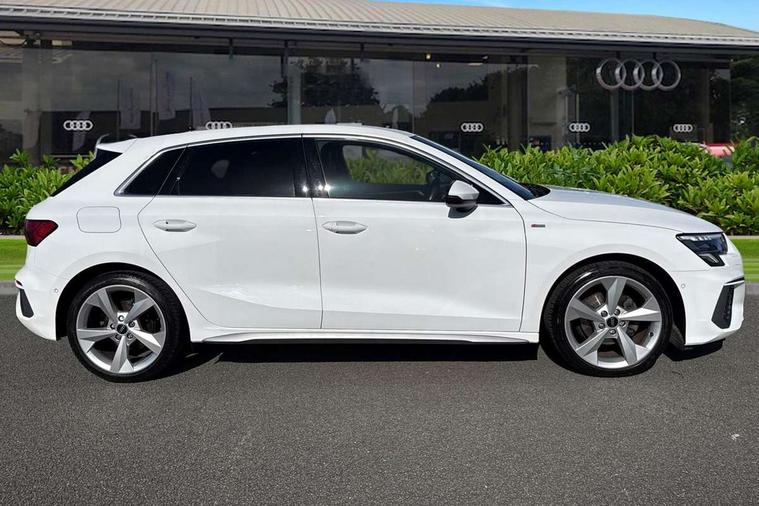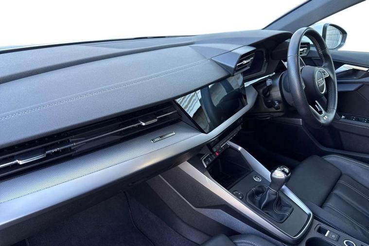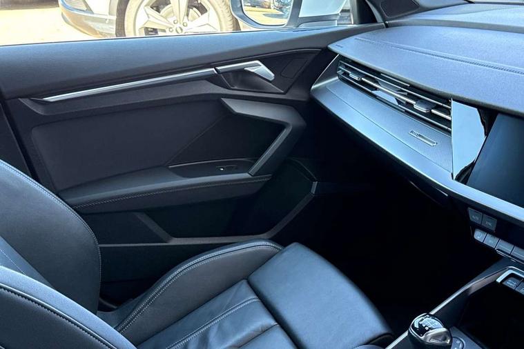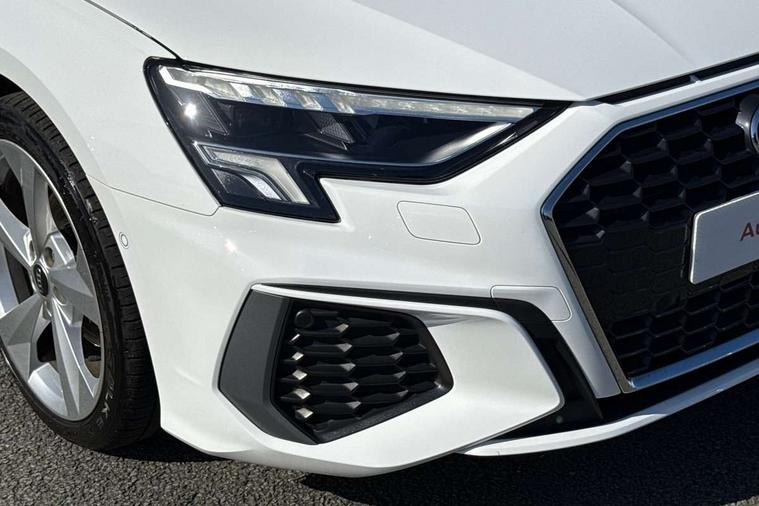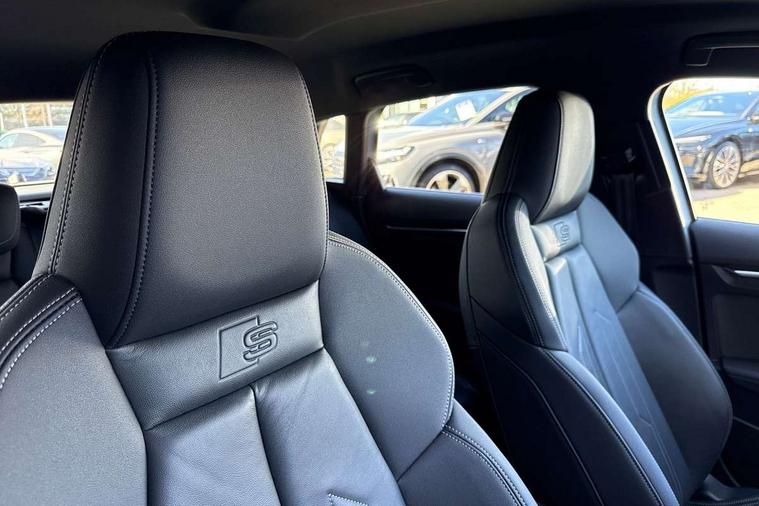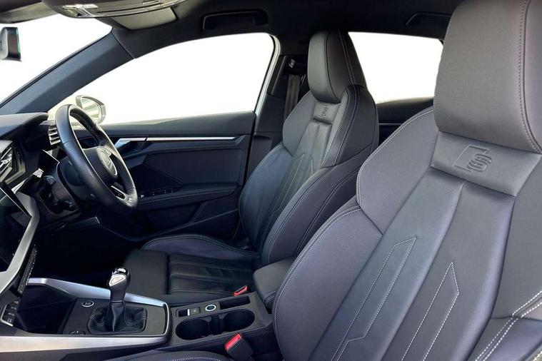 Audi drive select (Auto, Comfort, Dynamic and Individual), Audi smartphone interface, Audi Virtual Cockpit - 10.25" digital and colour instrument cluster, Automatic start/stop system with recuperation, Bluetooth interface, Camera based traffic sign recognition, Collision avoidance assistant, Cruise control, e-Call (emergency call), Electromechanical power speed sensitive steering, Lane departure warning system, MMI Navigation Plus with high resolution 10.1" colour touch screen display, Rear parking sensors, Service indicator, Trip computer, Voice control system with natural language interaction, Sports suspension, 2xUSB-C connection with data and charging functions, 6 passive loudspeakers, DAB Digital radio, 3rd brake light, Acoustic glass windscreen, Aluminium window trim, Auto dimming frameless rear view mirror, Body colour exterior mirrors, Electrically adjustable/heated/folding/auto dimming door mirrors with integrated LED indications + kerb view function for passenger side, Front electric windows, Illuminated aluminium inserts front door sills with S logo, LED daytime running lights, LED headlights with LED rear lights and dynamic rear indicators, Light and rain sensors, Privacy glass - dark tinted rear window, rear door and side windows, Rear electric windows, Rear side air outlets in grained matt black, Rear side wing doors, Rear wiper, S line bumpers, S roof spoiler, 12V socket and storage compartment in front centre console, 3 seat bench in 2nd row, 3 spoke leather multifunction steering wheel, 4 way electrically adjustable lumbar support for driver and front passenger, 60/40 split folding rear seat bench, Black cloth headlining, Dual zone electronic climate control, Front and rear centre armrest in leather, Front and rear headrests, Front/rear floor mats, Height and reach adjustable steering wheel, Interior lighting - glove compartment light and right hand side, Luggage compartment floor covering, Manual boot compartment lid, Manually adjustable front seats, Seat side bolsters, Single front passenger seat, Stainless steel pedals and front footrest in black, Twin leather upholstery with front sports seats S embossed logo, Aluminium interior elements pack - A3 Sportback, LED interior lighting pack - A3 Sportback, S line styling pack - A3 Sportback, 3x3 point rear seat belts, Driver and front passenger airbag with passenger airbag deactivation, Electronic Stabilisation Control (ESC) including ABS, ASR and EDL, First aid kit with warning triangle and 2 safety vests, Front side airbags with head airbags and interaction airbag, Pre-sense front with pedestrian and cyclist detection, Seatbelt monitoring, Tyre pressure loss indicator, Anti theft alarm, Anti-theft wheel bolts, Electronically operated child lock, Immobiliser, Remote control central locking, Dark spectrum aluminium inlays, accent surfaces in the dashboard and centre console in platinum grey silk effect paint finish,