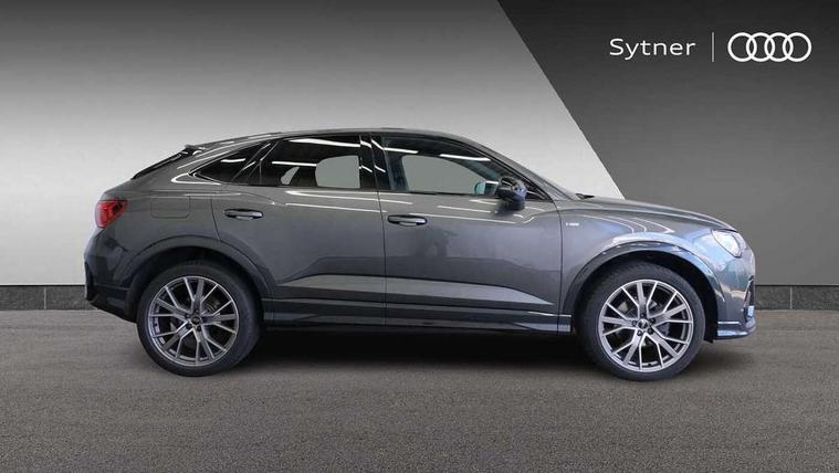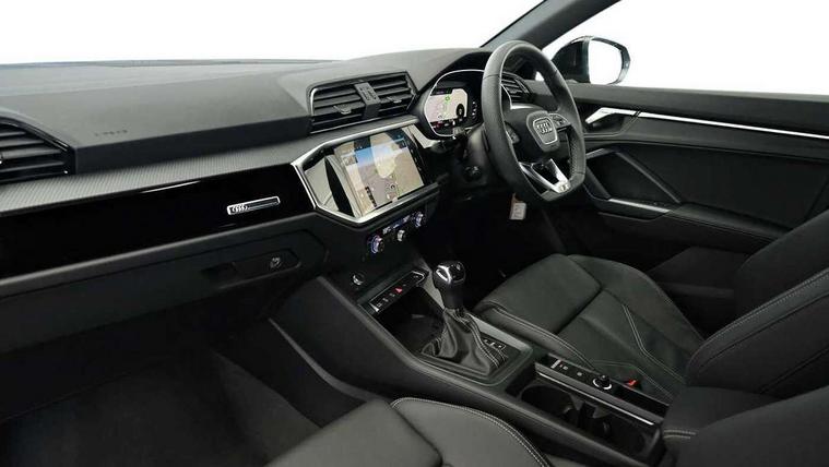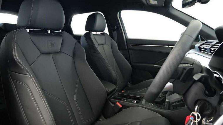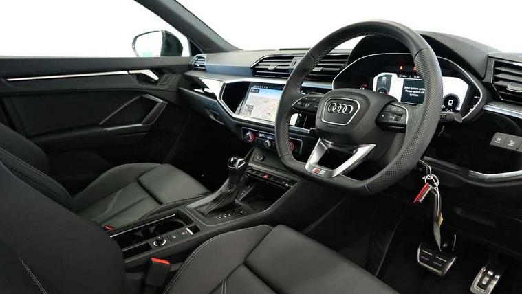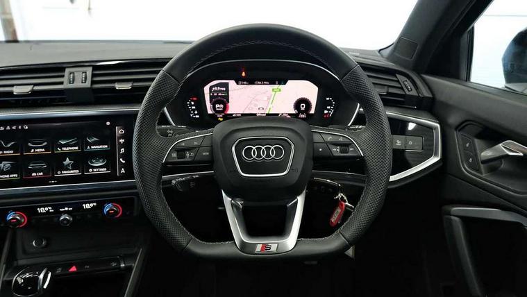 Audi connect safety and service, Audi drive select, Audi lane departure warning, Audi Virtual Cockpit - 10.25" display, Bluetooth interface, Camera based traffic sign recognition, Distraction and Fatigue warning, Legal emergency call, MMI Navigation Plus with high resolution 10.1 inch touchscreen colour display, Power operated tailgate, Progressive steering, Service interval indicator, Smartphone interface includes wireless Apple carplay/Android Auto, Start stop system with recuperation, Voice control system with natural language interaction, Diesel particulate filter, Sports suspension, 2 USB-C ports with charge and data functions, 6 passive loudspeakers, DAB digital radio module, Acoustic windscreen, Audi Beam uses LEDs to project the Audi logo onto the ground as you exit your Q3, Auto dimming door mirrors, Auto dimming frameless rear view mirror, Electrically folding, adjustable and heated door mirrors with integrated LED side indicators and kerb view function for passenger side, Front and rear electric windows, Front fog lights, Front underbody protection in manhattan grey paint finish, High gloss black finish B and C pillars, Honeycomb design radiator grille in matt anthracite black, LED Dynamic rear indicators, LED headlights with LED daytime running lights, LED rear lights, LED third brake light, Privacy glass dark tinted rear and rear-side windows (from B-pillar backwards), Rain and light sensors, Rear diffuser grille in grained matt black, Rear diffuser strip in matt anthracite black, Rear side wing doors, Rear underbody protection in matt black, Rear wiper, S line front and rear bumpers and side skirts in contrasting Manhattan grey paint finish, Variable front intermittent wipers, 12V socket in rear centre console, 3 seat bench in 2nd row, 40:20:40 folding with manual adjustment for 60:40 forwards/backwards position and backrest angle, Adjustable rear seat bench/backrest with centre armrest and cupholder, Black carpet mats, Black cloth headlining, Dual zone electronic climate control, Electric lumbar support, Front and rear black floor mats with contrast stitching in rock grey, Front and rear headrests, Front centre armrest, Height and reach adjustable steering wheel, Illuminated door sill trims with S logo, ISOFIX child seat mounting for front passenger with airbag deactivation and outer rear seat including top tether attachment point for outer rear seats, Luggage compartment sill protection in stainless steel, Manual front seats with height adjustment, Perforated leather gearknob, Single front passenger seat, Stainless steel pedals, Twin leather upholstery with front sport seats + S embossing, Black styling pack - Q3, Non smoking pack - Q3, 3x3 point rear seatbelts, 6 airbags - Driver, front passenger, curtain and side windows, Audi pre-sense front with pedestrain and cyclist recognition, Electrically operated child locks on rear doors, Electromechanical parking brake, Electronic stabilisation control including ABS, ASR and EDL, Front seatbelt reminder, Hill descent control, Hill hold assist, Pre sense basic, Seatbelt monitoring, Tyre pressure warning, Warning triangle and first aid kit, Anti theft wheel bolts, Immobiliser, Remote central locking, Thatcham approved category 1 anti theft alarm, Aluminium look interior elements, Detail dashboard around MMI touch colour display in glass look, black with surround in aluminium look, Leatherette door armrest, Piano black inlay,