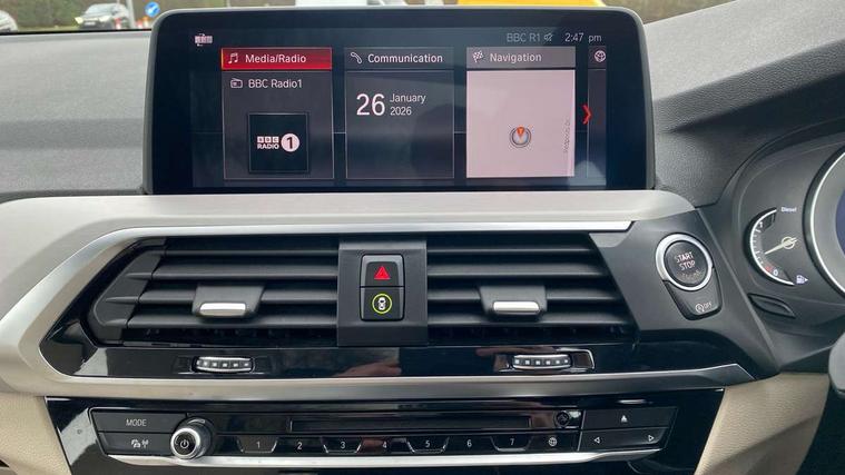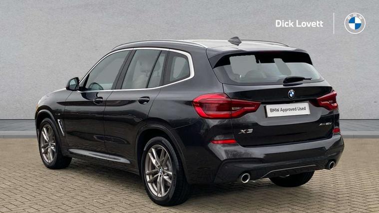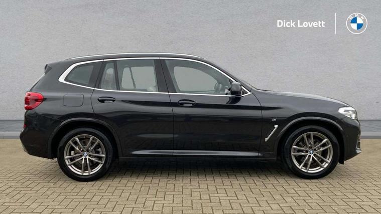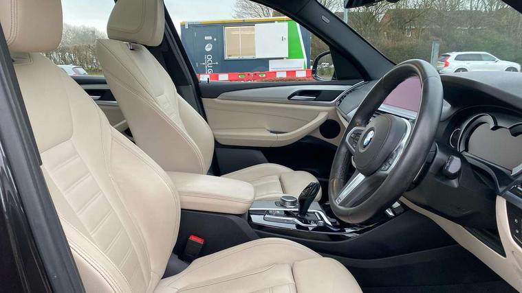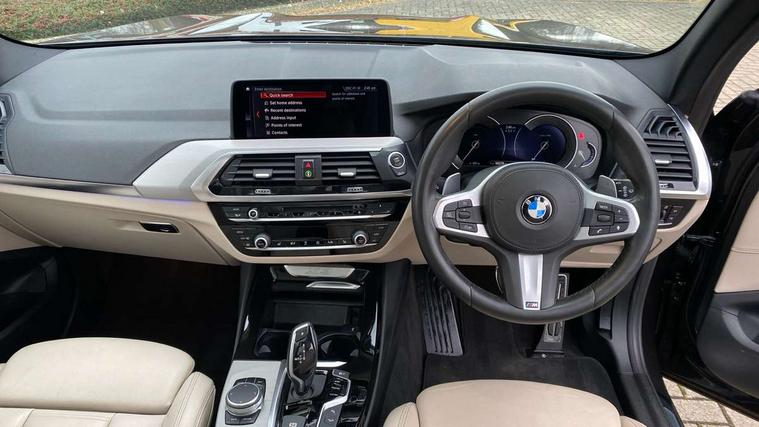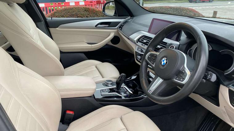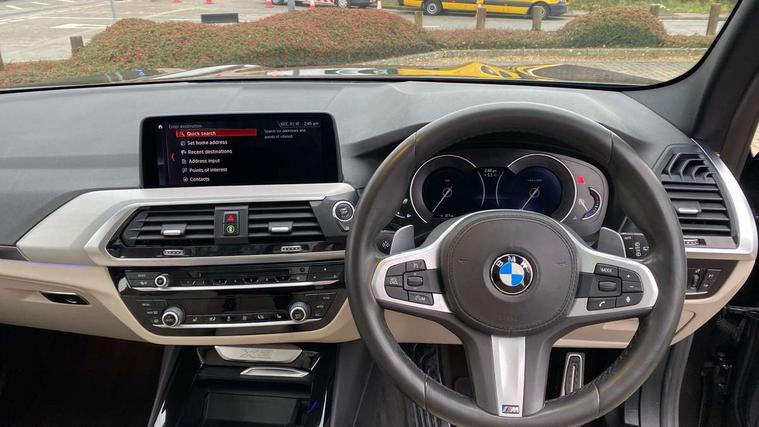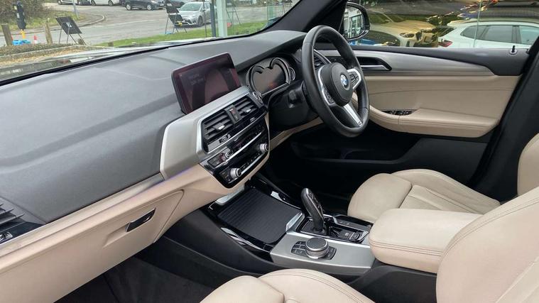 Active Guard incl speed limiting and lane departure functions with auto steering, and front collision warning with brake intervention, Attentiveness assist, Automatic tailgate operation, BMW Live Cockpit Professional sat nav system including 10.25" high resolution display and Intelligent Voice Assistant, BMW Online services, BMW Teleservices, Brake pad wear indicator in front and rear, Check Control warning system for monitoring of lights and door/luggage compartment open warning, Control display - 6.5" colour display screen, Electric Power Steering (EPS) with Servotronic, Front/rear Parking distance control, iDrive Controller with 8 favourite buttons, Lights on warning by audio warning signal when ignition is switched off, Navigation system - BMW Professional multimedia with Hard disc drive (HDD) and 10.25" touch display, Oil sensor for level and grade, warning by check control system, On board computer - average speed+fuel consumption, service interval, clock/date, odometer/trip meter, outside temperature display and ice warning, Optimum shift indicator, Personal Profile - automatic lock when driving away selectable, Real time traffic information, Semi digital instrument cluster, Stop/start system, Automatic transmission with gearshift paddles, Diesel particulate filter, Incorrect fuelling protection, Larger capacity fuel tank, Multi-link rear suspension, Performance Control, Auxiliary socket for external MP3 player, BMW professional radio/CD/MP3, DAB Digital radio, Acoustic glazing, Black finish on B pillars, Body colour door handles, Body colour electric adjust heated aspherical door mirrors, Body colour roof mouldings, Body coloured bumpers, Chrome kidney grille with high gloss black vertical slats, Direction indicator, side repeaters, integrated in exterior mirrors, Dual chrome exhaust, Dynamic brake lights, Exterior mirrors - electrically folding with anti-dazzle, Fingertip control / anti-trap function on electric window, Follow me home headlights, Front and rear bumper system with replaceable deformation elements, Front and rear electric windows, Green tinted heat insulating glass, Heated windscreen washer jets, Height adjustable headlamps, High gloss black door sill finishers, High gloss black shadow line roof rails, High gloss shadowline exterior trim in decorative moulding side frame/recess cover/guide rail/B, C pillars/mirror frame and triangle with mirror base, High level 3rd brake light incorporating LED Technology, Interior rear view electrochromatic mirror with automatic anti dazzle function, LED front fog lights, LED tail lights, Lightweight engineering, M aerodynamic bodystyling, Model designation, Rain sensor including auto headlights activation, Rear wiper, Shark fin antenna, Visible VIN plate, Welcome lighting, Windscreen wipers with adjustable interval, 12V socket in centre console and luggage area, 3 rear headrests, 3 zone automatic air conditioning, 4 lashing points to secure luggage, Ambient lighting, Anthracite headlining, Anthracite Velour floor mats, Driver/passenger sunvisors with ticket holders + illuminated vanity mirrors, Foldable boot floor with storage compartment, Four grab handles integrated in roof lining, Front and rear bottle holders integrated into door trim storage compartments, Front and rear side armrests integrated into door trim, Front centre armrest with storage compartment, Front footwell lights, Front sports seats, Front/rear courtesy lights with soft on/off dimming, Front/rear reading lights, Height adjustable front/rear head restraints, Isofix rear child seat preparation, Leather gear knob, Luggage area underfloor compartment, Luggage compartment lighting, M Sport multifunction leather steering wheel, Parcel shelf removeable and storable under boot floor, Reach and rake adjustable steering column, Rear centre armrest with 2 cupholders, Rear seat centre armrest with two cupholders, Removable / retractable luggage cover, Slope adjustable rear seats, Storage compartment in rear centre console and front/rear door trims, Through loading system with 40/20/40 split folding rear seat, Toolkit located in luggage compartment, Two front cupholders with removable oddments tray/lid, Vernasca leather upholstery, Connected pack professional - X3, ABS/EBD, ADB - Automatic Differential Brake, Automatic Stability Control (ASC), Battery safety cut-off, BMW emergency call, Brake assist, Brake assist function, Brake drying, Brake energy regeneration, Braking pre-tensioning, Child locks on rear doors, Cornering brake control (CBC), Crash Sensor - activation of central locking release, hazard warning light and interior lighting, Deactivation of fuel pump in the event of a crash, Driver and front passenger front and side airbags with passenger deactivation and ITS front and rear head airbags, DSC+, Dynamic brake control, Dynamic Traction Control - DTC, Electromechanical parking brake, Front seat belts warning, Hill descent control, Hill start assist, Seatbelt security check for front seats, Side impact protection, Three point seatbelts to all seats with front and outer rear pyrotechnic belt tensioners and seat belt force limiters, Two tone horn, Tyre pressure monitoring system, Ventilated front and rear disc brakes, Warning triangle and first aid kit, Central locking switch for all doors, fuel filler cap and luggage compartment, Electronic engine immobiliser, Locking wheel nuts, Remote control including two integrated key - one button for open/close all lockable content, windows and separate button for open luggage compartment, Remote control Thatcham category 1 alarm, Start/stop button with Comfort Go keyless engine start and auto Start/stop deactivation button, Low rolling resistance tyres,