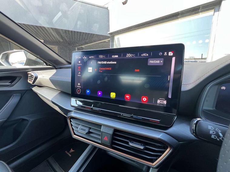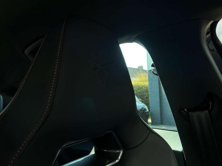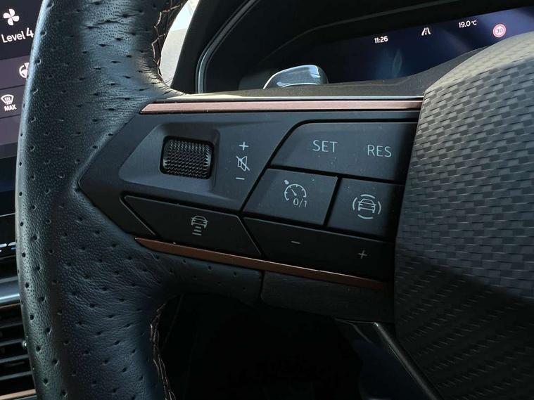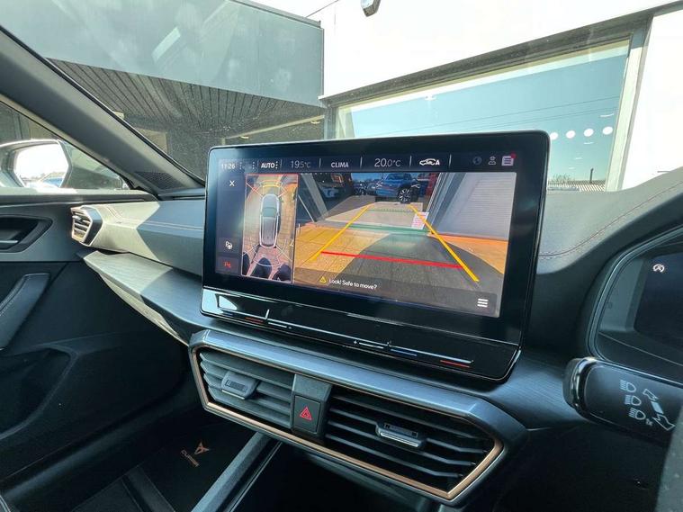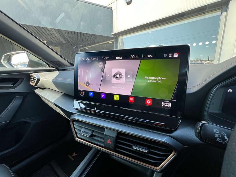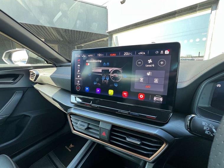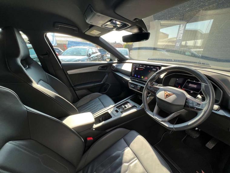 Digital cockpit and configurable dashboard, Driver alert system, Driving profile selection, Forward collision warning with automatic braking, Lane assist, Navigation system with 12'' Touchscreen Display, Park assist (inc front/rear parking sensors), PAS, Predictive adaptive cruise control with speed limiter, Rear view camera, RPM, trip computer, outside temp gauge, instrument light brightness, low fuel warning light, lights on reminder, gearshift indicator, Service interval indicator, Start/stop system with regenerative braking, Voice control system, Wired Android Auto, Wireless apple carplay, Wireless phone charger, Electronic locking differential and dynamic traction support, Standard suspension, 2 front and 2 rear USB type C sockets, Auxiliary input socket, DAB radio, Auto dimming rear view mirror, Body colour door handles, Body coloured bumpers, Dark grey wing mirror, Daytime running light with automatic headlight control and coming home feature, Dynamic headlight range control, Electric front/rear windows, Electrically adjustable heated and folding door mirrors with memory function, Front fog lamps with cornering function, Gloss black roof rails and window surrounds, LED Headlights, LED Taillights with dynamic indicator, Rain sensing wipers, Rear diffuser with black simulated exhaust pipes, Rear side wing doors, Rear wash/wipe, Third brake light, Tinted rear windows, Welcome lights, 12v power supply in centre console, 12V socket, 12v socket in loadspace, 2 front and 2 rear reading lights, 230V socket, 3 seat bench in 2nd row, 60/40 split rear bench seat with armrest and mechanical seat release, Black headlining, Dust/pollen filter, Front and rear head restraints, Front centre armrest, Height/reach adjust steering wheel, Illuminated interior front door sills, Illuminated sunvisor with mirror, Isofix, Leather multi function heated steering wheel with gear shift paddles, Luggage tie-down hooks, Single front passenger seat, Three zone climate control with control panel in rear, Variable luggage/load compartment floor, Wraparound lighting, Genuine Nappa leather Pack - Cupra, 3 point seatbelts on all rear seats, ABS, Brake control system - ESC and brake booster, Child proof door locks, Driver and front passenger airbags with front passenger airbag de-activation, Electronic parking brake, Front and rear disc brakes, Front side curtain airbags, Hill hold control, Public e-call, Seat belt reminder for front and rear seats, Tyre pressure monitoring system, Anti theft alarm system, Keyless entry and start system (KESSY), Locking wheel bolts, Copper and aluminium interior detailing, 19" 'Exclusive' machined sport matte black and silver alloy wheels,