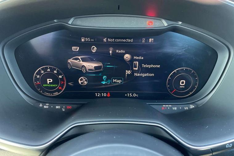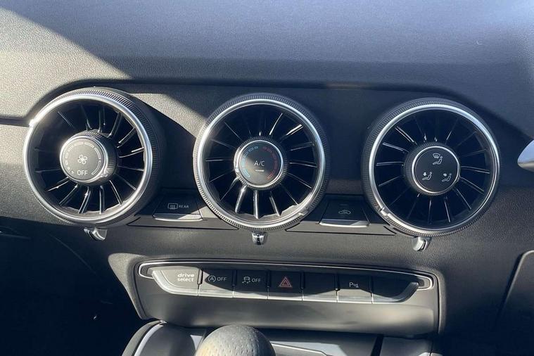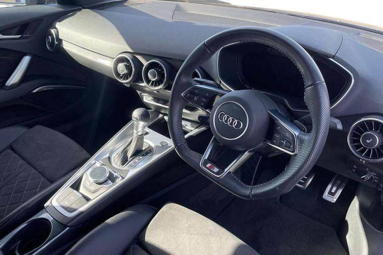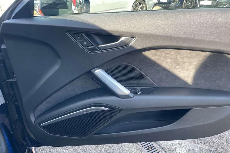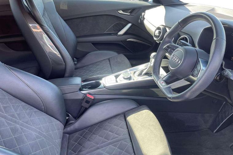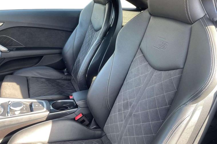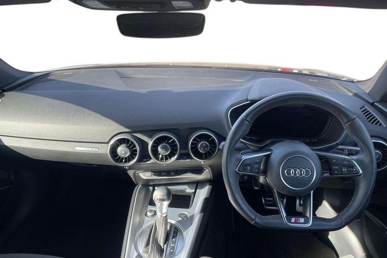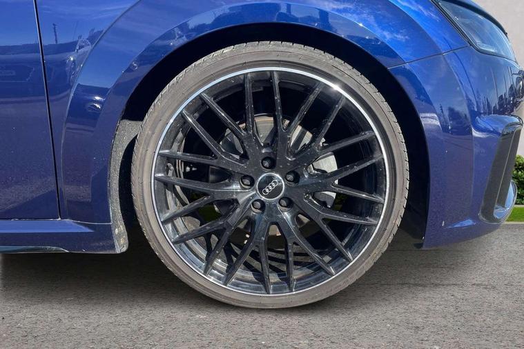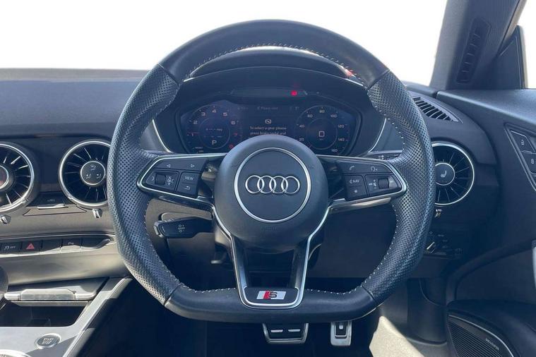 Matt brushed aluminium inlays, Black styling pack - TT, Non smoking pack - TT/TT RS, 20" 10 Y spoke gloss black diamond cut alloy wheels, Tyre repair kit, Anti theft alarm, Anti theft wheel bolts, Immobiliser, Keyless Go, Remote central locking, AM/FM radio, Bluetooth audio streaming, DAB Digital radio, MMI Radio with CD player and SD/XC card slot, 3 point front seat belts, ABS, ASR traction control, Curtain airbags, Driver and front passenger airbag with front passenger airbag deactivation, EDL traction control, Electromechanical parking brake, ESP, First aid kit, Front side airbags, Head airbags, Hill hold assist, Seatbelt warning, Tyre pressure loss indicator, Warning triangle, Auto dimming rear view mirror, Auto headlight range control, Black chrome tailpipe, Dark privacy glass from B-pillar backwards, Electric folding door mirrors, Electric front windows, Electrically adjustable and heated door mirrors with integrated LED side indicators, Front fog lights, Green tinted heat insulating glass, LED 3rd brake light, LED daytime running lights, LED headlights with LED rear lights + dynamic rear indicators, Light and rain sensors, Rear boot, Sunband for windscreen, 12V socket, 2 rear seats, 3 spoke flat bottomed high multi-function leather sport steering wheel with gearshift paddles, 4 way electric lumbar support for driver and front passenger, Black headlining, Contrasting silver stitching in steering wheel, Door sill trims, Extended aluminium look with stainless steel pedals, Front centre armrest, Front passenger seat, Front super sports seats, Heated front seats, Height/reach adjust steering wheel, Integrated head restraints, ISOFIX child seat mounting for front passenger seat with airbag deactivation, Manual adjustment of seat height, fore/aft position, seat angle, seat depth and backrest angle, Perforated leather gearknob in black, Rear head restraints, Rear top tether child seat ISOFIX attachment, Split folding rear seat, Tool kit, Audi drive select with 4 Pre configured modes, Audi smartphone interface, Audi virtual cockpit - 12.3" high-resolution LCD display with fully customisable instrument cluster, Cruise control + speed limiter, Emergency call service, MMI touch panel, Mobile phone preparation with bluetooth interface, Progressive power assisted steering, Service interval indicator, Start/Stop system with energy recuperation, TP memo, Sports suspension,