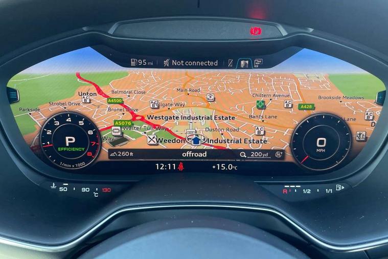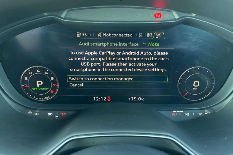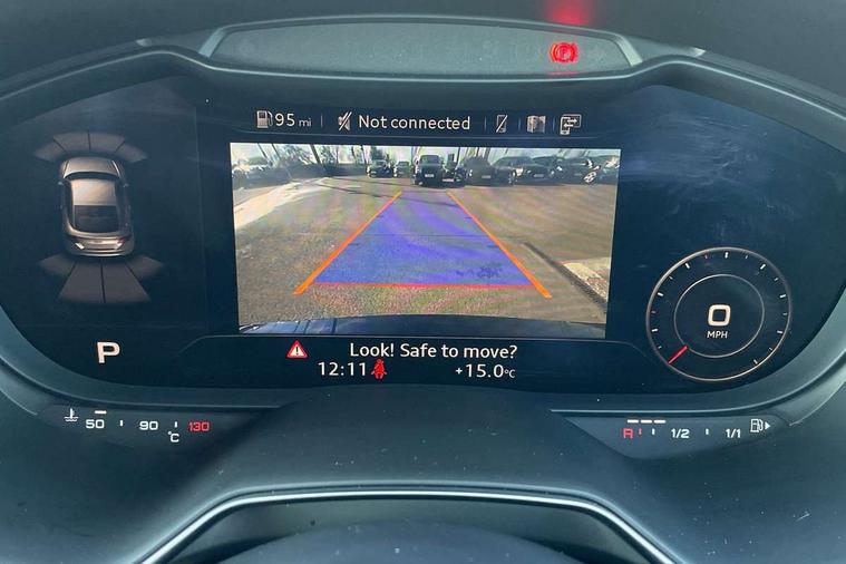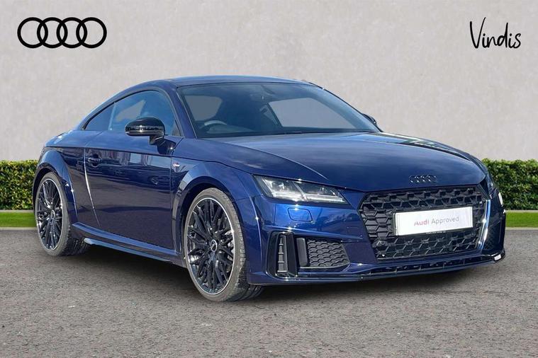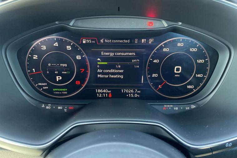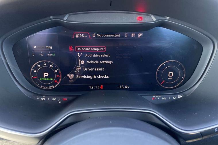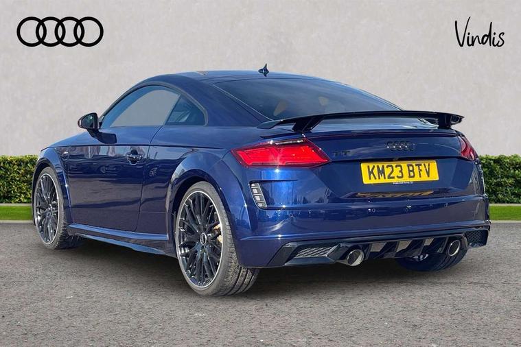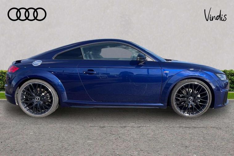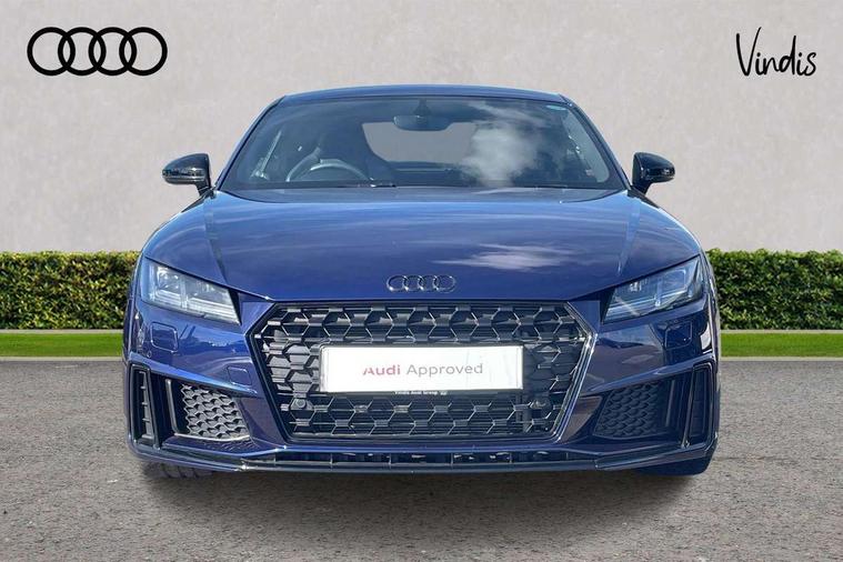 Matt brushed aluminium inlays, Black styling pack - TT, Non smoking pack - TT/TT RS, 20" 10 Y spoke gloss black diamond cut alloy wheels, Tyre repair kit, Anti theft alarm, Anti theft wheel bolts, Immobiliser, Keyless Go, Remote central locking, AM/FM radio, Bluetooth audio streaming, DAB Digital radio, MMI Radio with CD player and SD/XC card slot, 3 point front seat belts, ABS, ASR traction control, Curtain airbags, Driver and front passenger airbag with front passenger airbag deactivation, EDL traction control, Electromechanical parking brake, ESP, First aid kit, Front side airbags, Head airbags, Hill hold assist, Seatbelt warning, Tyre pressure loss indicator, Warning triangle, Auto dimming rear view mirror, Auto headlight range control, Black chrome tailpipe, Dark privacy glass from B-pillar backwards, Electric folding door mirrors, Electric front windows, Electrically adjustable and heated door mirrors with integrated LED side indicators, Front fog lights, Green tinted heat insulating glass, LED 3rd brake light, LED daytime running lights, LED headlights with LED rear lights + dynamic rear indicators, Light and rain sensors, Rear boot, Sunband for windscreen, 12V socket, 2 rear seats, 3 spoke flat bottomed high multi-function leather sport steering wheel with gearshift paddles, 4 way electric lumbar support for driver and front passenger, Black headlining, Contrasting silver stitching in steering wheel, Door sill trims, Extended aluminium look with stainless steel pedals, Front centre armrest, Front passenger seat, Front super sports seats, Heated front seats, Height/reach adjust steering wheel, Integrated head restraints, ISOFIX child seat mounting for front passenger seat with airbag deactivation, Manual adjustment of seat height, fore/aft position, seat angle, seat depth and backrest angle, Perforated leather gearknob in black, Rear head restraints, Rear top tether child seat ISOFIX attachment, Split folding rear seat, Tool kit, Audi drive select with 4 Pre configured modes, Audi smartphone interface, Audi virtual cockpit - 12.3" high-resolution LCD display with fully customisable instrument cluster, Cruise control + speed limiter, Emergency call service, MMI touch panel, Mobile phone preparation with bluetooth interface, Progressive power assisted steering, Service interval indicator, Start/Stop system with energy recuperation, TP memo, Sports suspension,