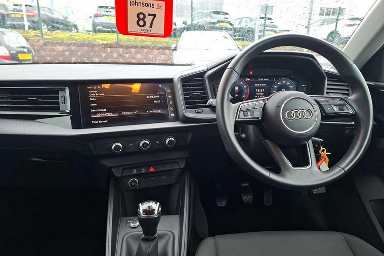10.25" Digital instrument cluster display classis style instrument dials + speed, odometer, time, outside temperature, telephone menu + fuel level warning, Audi smartphone interface with connect compatible smartphone via USB directly MMI display + Nav, music, third party apps controlled via MMI controller, Automatic start/stop system, Bluetooth interface, Driver's information system, Electromechanical power steering, Emergency e-call, Emergency services call system, Lane departure warning system, Service interval indicator, Speed limiter, Voice control system, Washer fluid level indicator, Dynamic suspension, 1 x SDXC card reader, 2 x USB type C connection points, 6 passive loudspeakers, DAB Digital radio, MMI radio plus with 8.8" colour MMI display screen and MMI touch, Auto dimming rear view mirror, Body coloured bumpers, Body coloured door mirrors, Electric front and rear windows, Electrically adjustable, heated, folding door mirrors with integrated LED side indicator, Front side air inlets with front spoiler lip and rear diffuser in matt black grained, Heat insulating glass windscreen and side windows, Heated rear windscreen, High level LED brake light, LED headlights with LED rear lights + dynamic rear indicators + headlight adjustment and high beam, turning light + LED daytime running lights, Radiator grille in matt black, Rain and light sensors, Rear fog lights, Rear side wing doors, Rear wing door, Rear wiper, 12V socket in centre console with two cup holders, 3 rear seats with headrests, 3 seat bench in 2nd row, 3 spoke leather multifunction plus steering wheel, 40:60 Split folding rear seat or folded fully, Air vents, door handle recesses and centre console in black, Delta cloth upholstery, Driver and passenger seat with manual height adjust with forward and backwards adjustment, Front head restraints, Front passenger seat, Front/rear floor mats, Grey cloth headlining, Height and reach adjustable steering wheel, ISOFIX child seat mounting for front passenger and outer rear seats including top tether attachment point of outer rear seats, Leather gear knob with aluminium trim, Leatherette handbrake grip, Luggage compartment light with front and rear reading lights, Manual air conditioning, Luggage compartment pack - A1, 3x3 point rear seatbelts, Audi pre-sense front with pedestrain and cyclist recognition, Brake assist function, Driver and front passenger airbag with front side and head airbags, Electronic Stability Control including ABS, EBD, ASR and EDL, Front passenger airbag deactivation switch, Hill hold assist, Manual rear child locks, Seatbelt height adjustment for front seats, Seatbelt monitoring, Tyre pressure warning light, Warning triangle and first aid kit, Anti theft alarm, Anti theft wheel bolts and loose wheel warning, Immobiliser, Remote central locking with 2 foldaway keys, Black inlays polygon structure, 15" 5 arm design alloy wheels,