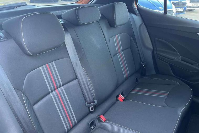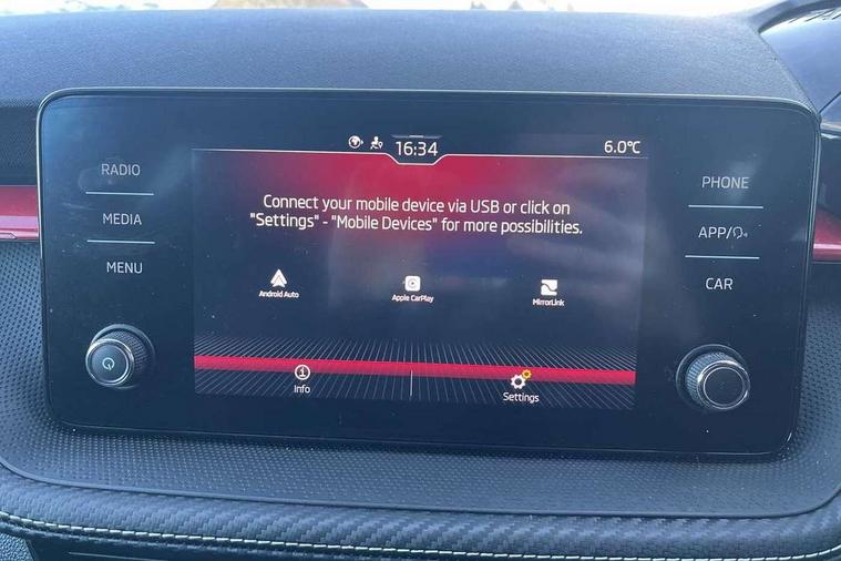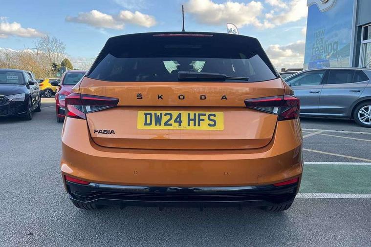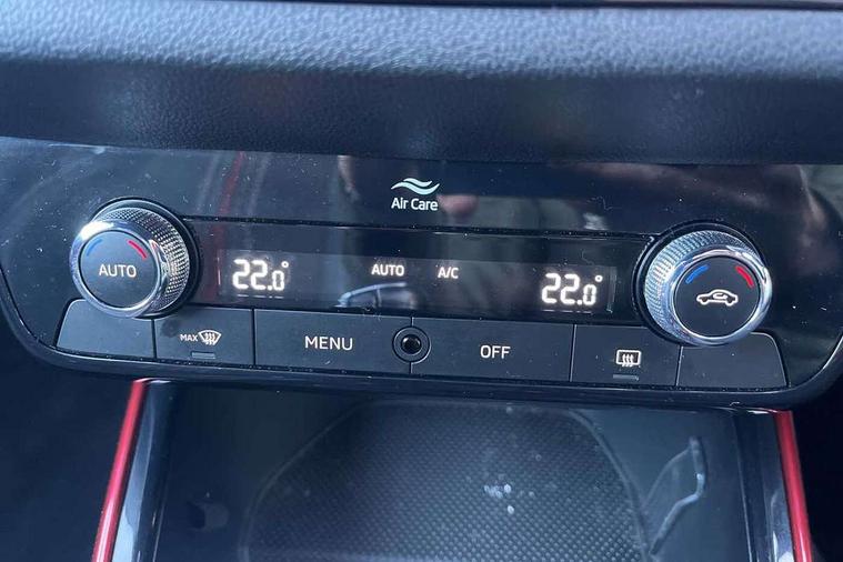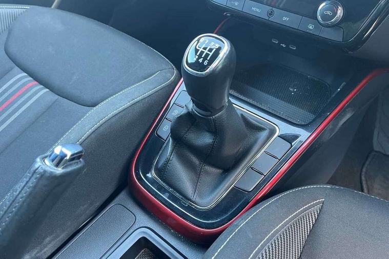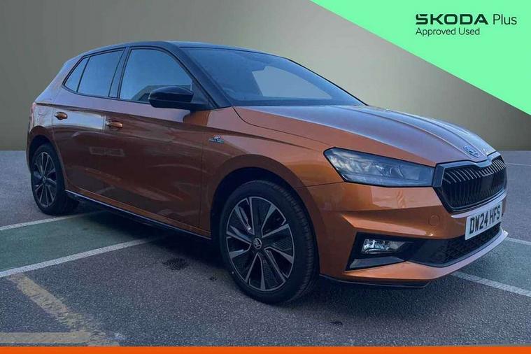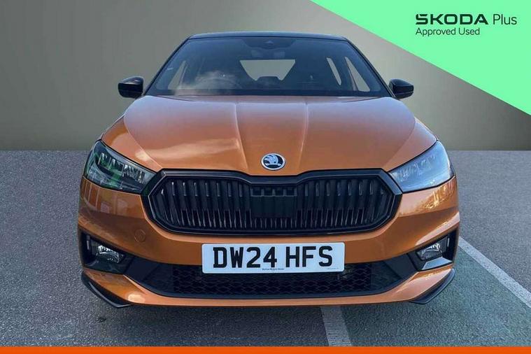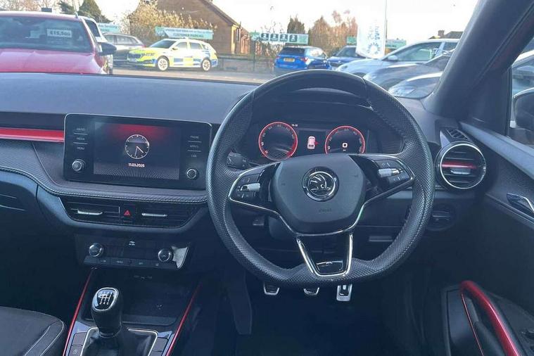 Bluetooth connection, Driver alert system - DAS, Electromechanical power steering, Exterior temperature gauge, Service interval indicator, 2x USB-C in the front (for data transmission and charging), 6 Speakers (4 in front and 2 in rear), Auxiliary socket for external MP3 player, Bolero radio with 8" colour display, DAB digital radio reception, Auto dimming rear view mirror, Basic LED Headlights, Black radiator grille, Body coloured bumpers, Door mirror integrated indicators, Electrically adjustable and heated door mirrors, Front and rear electric windows, Front fog lights, Front window wiper intermittent control, Headlight range control - Automatic, Ice scraper in fuel cap, LED daytime running lights with coming and leaving home feature, Monte Carlo badging, Privacy glass, Rain sensor, Rear LED fog light, Rear side wing doors, Rear window wiper with washing nozzles, Roof mounted spoiler, SKODA tailgate lettering in black, Sports bumpers, Third brake light, 3 rear headrests, Aluminium pedals, Backrest split and folding, Black headlining, Central console with removable cup holder and storage box, Chrome handbrake release button, Door sills with fabia badging, Fabric/artificial leather upholstery, Front centre armrest, Front sports seats, Gearshift knob/handle in leather, Hand brake lever handle in leather, Height adjustable front headrests, Height adjustable front seats, Height adjustable steering wheel, ISOFIX and TopTether anchorage points to the outer rear seats, ISOFIX and TopTether on the front passenger seat, Luggage compartment lighting, Metallic painted red central console cover, Metallic red interior door handles, Pollen filter, Rear seat bench unsplit, Single front passenger seat, Sun visors with mirror and airbag label on passenger side, Textile floor mats, Ticket holder, Umbrella in drivers door, 3-point height adjustable front seats belts with pretensioner and force limiter, Automatic warning lights in case of crash, Driver and passengers airbag with switch off function, e-Call+, ESC including ABS, MSR, ASR, EDS, HBA and XDS, Front and rear seat belt warning, FRONT ASSIST (AEB City and AEB Inter Urban), Front side airbags, Head airbags, One tone horn, Pedestrian protection, Three rear 3-points safety seat belts with pretensioner and force limiter including stop function for outer rear seat belts, Tyre pressure monitoring system, Anti-theft alarm system including immobiliser, interior monitoring, backup horn, and towing protection, Central locking with radio remote control, interior controls, SAFE function and 2 foldable keys, KESSY - Keyless engine start/stop, Carbon effect door and side trim panels, Carbon effect lower decorative trim with white stitching, Red metallic upper decorative trim, Anti-theft wheel bolts protection, Super-low rolling resistance tyres,