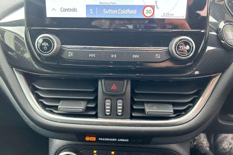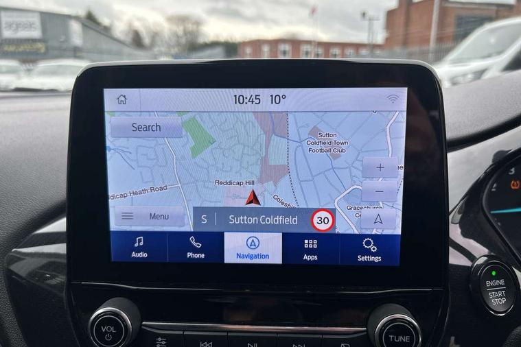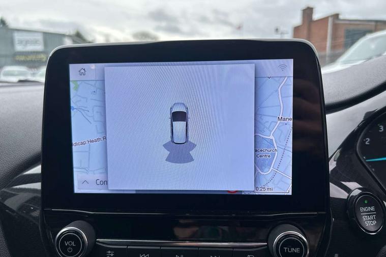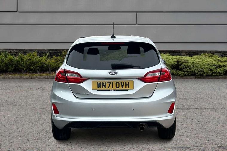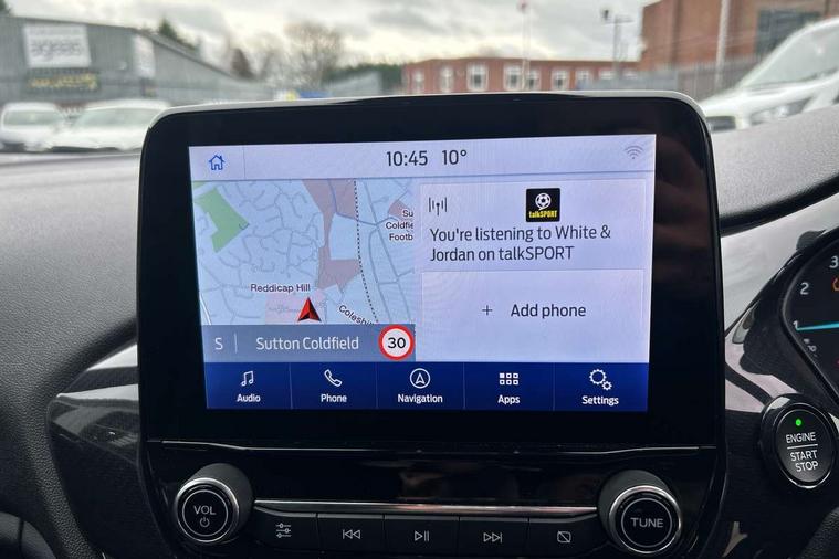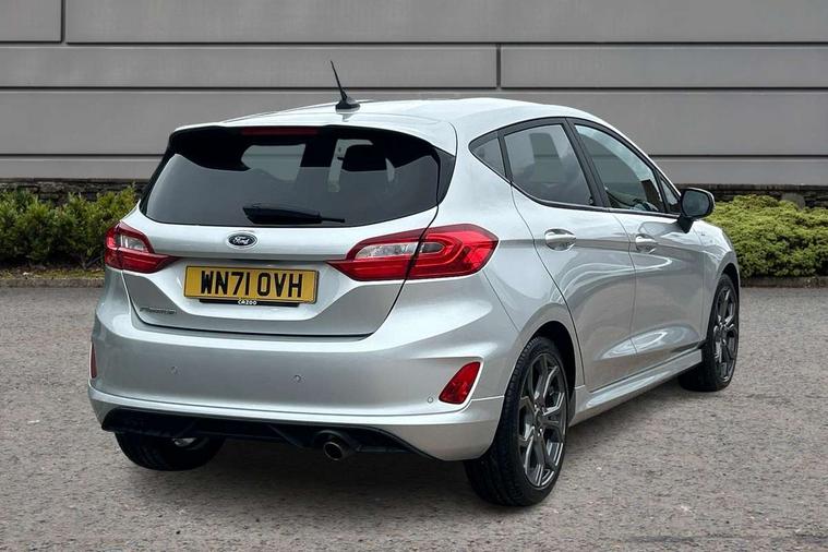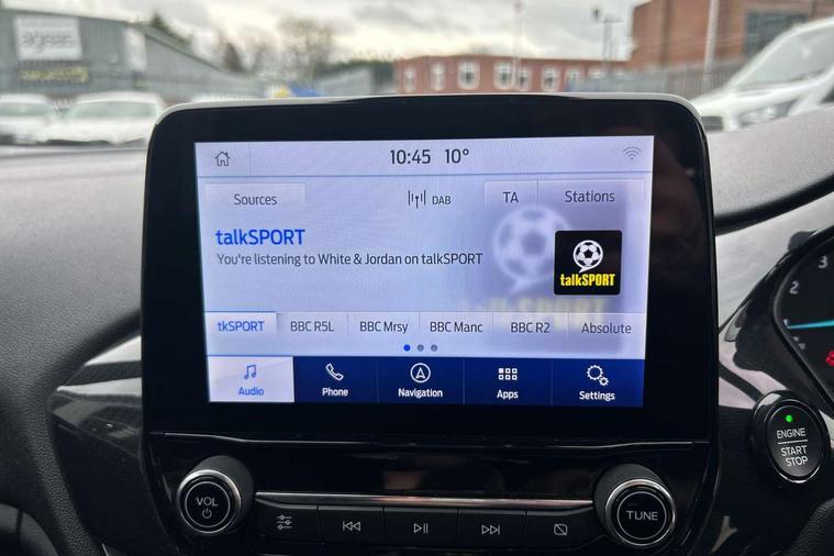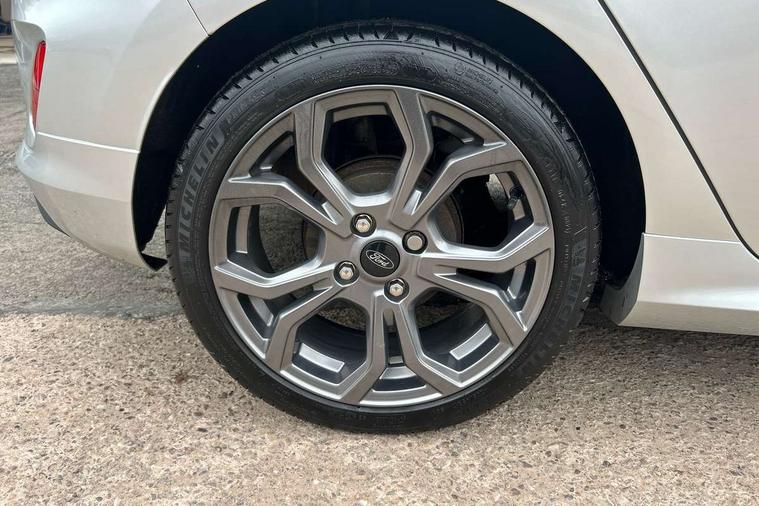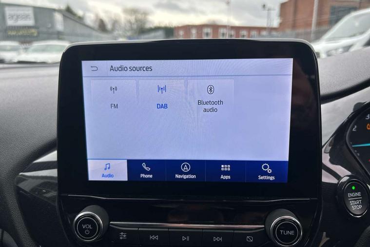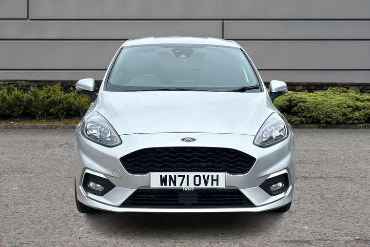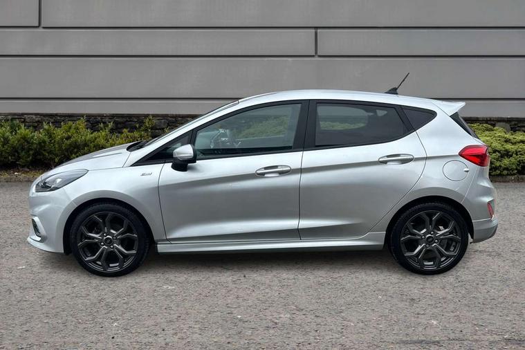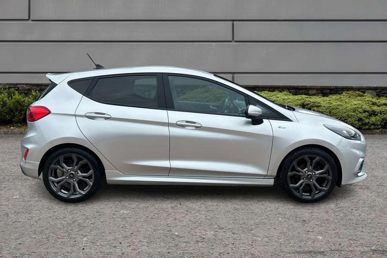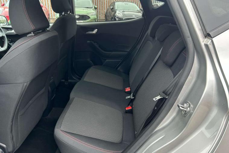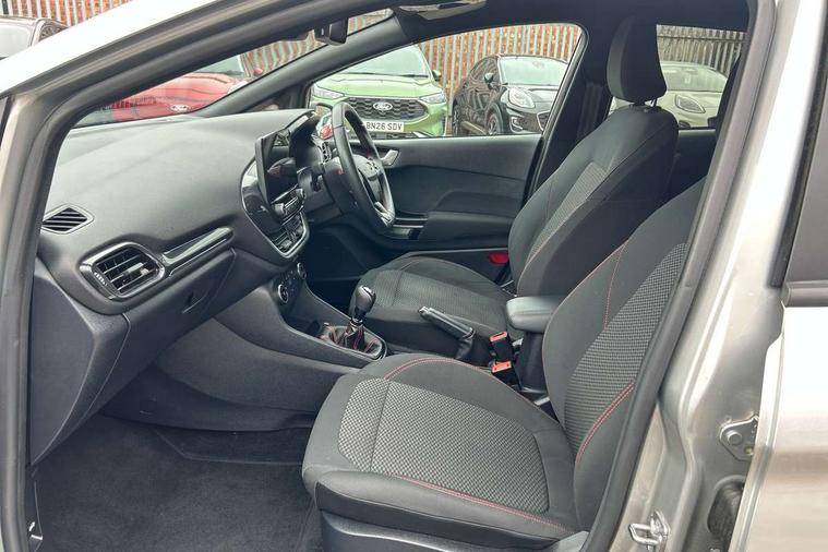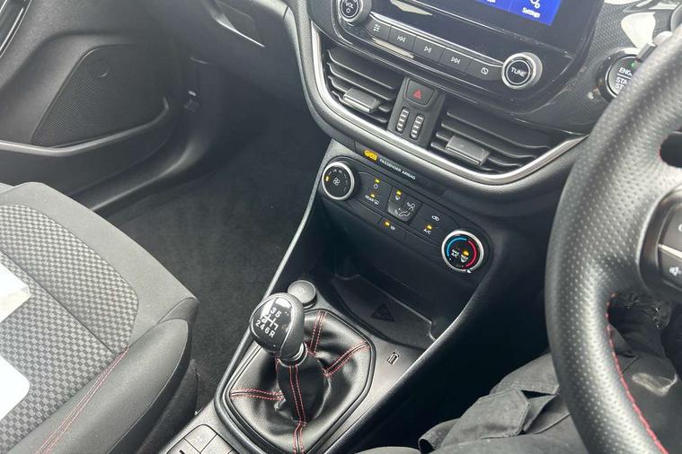 Bluetooth system, Electric power steering, Ford easy fuel, Ford SYNC 3 Navigation system incl 8" touchscreen, 7 speakers, FordPass connect, Apple carplay, android auto, voice control and emergency assistance, Rear parking distance sensors, Selectable drive modes (Normal, Sport, Track), Trip computer, Sports suspension, 2 USB ports, Auxiliary input socket, DAB Digital radio, Steering wheel mounted controls, Body colour bumpers, Body colour door handles, Body colour large rear spoiler, Body coloured electrically operated and heated door mirrors with side indicators, Cornering front fog lights, Electric front windows/one touch facility, Electric rear windows, LED Night signature to rear lights, Quickclear heated windscreen, Rain sensing wipers and auto dimming rear view mirror, Rear privacy glass, Rear wiper, Unique ST-Line upper grille & full bodystyling kit with ST-Line wing badges, 3 spoke flat bottomed leather steering wheel, 60/40 split folding rear seat, Adjustable head restraints, Black headlining, Boot carpet, Centre console with opening armrest, 2x cupholders, 12v and USB, Chrome inner door handles, Cloth upholstery, Footwell illumination, Front floor mats in velour, Front map reading lights, Front seat and rear pockets, Illuminated glovebox, Leather gaiter, Load area light, Manual 2 way passenger seat adjust, Manual 4-way driver seat adjust, Manual air conditioning, Overhead console with sunglasses holder, Pollen filter, Rake/reach adjustable steering wheel, Sensico wrapped steering wheel, Sports front seats, NCAP Pack - Fiesta, 3 point seatbelts on all rear seats, ABS+EBA, Curtain airbags, Driver and passenger airbags, Drivers knee airbag, Electronic stability control with hill start assist, Front passenger airbag deactivation, Front side airbags, Seatbelt warning, Two tone horn, Tyre pressure monitoring system, Keyless start with 'Ford Power' starter button, MyKey system, Remote central locking & engine immobiliser, Thatcham Cat.1 alarm, 17" 5 spoke alloy wheels with rock metallic finish,