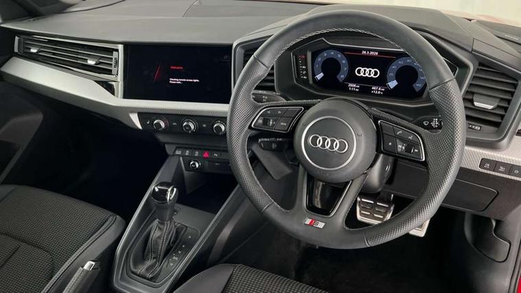 10.25" Digital instrument cluster display classis style instrument dials + speed, odometer, time, outside temperature, telephone menu + fuel level warning, Advanced driver attention and drowsiness monitor, Audi connect emergency call and service, Audi drive select, Audi remote connect and control, Audi smartphone interface, Bluetooth interface, Camera based traffic sign recognition, Cruise control, Driver's information system, Electromechanical power steering, Lane departure warning system, Rear parking sensor, Service interval indicator, Speed limiter, Start stop system with recuperation, Voice control system, Washer fluid level indicator, Sports suspension, 2 x USB type C connection points, 6 loudspeakers, DAB Digital radio, MMI radio plus with 10.1" colour MMI display screen and MMI touch, Auto dimming rear view mirror, Body coloured door mirrors, Door sill trims with aluminium inlays and S line logo in front, Electric front and rear windows, Electrically adjustable, heated, folding door mirrors with integrated LED side indicator, Front side air inlets in grained matt black and C frame in anthracite black, Headlight cleaning system, Heat insulating glass windscreen and side windows, Heated rear windscreen, High level LED brake light, LED daytime running lights, LED headlights with range control LED rear lights + dynamic rear indicators, Light and rain sensors, Privacy glass, Radiator grille and rear diffuser in matt anthracite black, Radiator protective grille frame in matt aluminium silver, Rear fog lights, Rear side wing doors, Rear wiper, S line badges on front wings, Side front spoiler lips in grained matt black, 12V socket in centre console with two cup holders, 3 rear seats with headrests, 3 seat bench in 2nd row, 3 spoke leather multi-function plus steering wheel features S badging and grips in perforated leather with contrast stitching, 40:60 Split folding rear seat or fully collapsed, Black cloth headlining, Front and rear velour black floor mats with contrast stitching in fine silver, Front head restraints, Front passenger seat, Height and reach adjustable steering wheel, Interior lighting includes roof module, front and rear reading lights and right luggage compartment lighting, ISOFIX child seat mounting for front passenger and outer rear seats including top tether attachment point of outer rear seats, Leather gear knob with aluminium trim, Leather handbrake grip, Manual air conditioning, Manual height adjustable for driver and front passenger seat, Manually adjustable lumbar support in front seats, Stainless steel pedals, Ambient lighting package - A1, Luggage compartment pack - A1, S line exterior styling pack - A1 Sportback, 3x3 point rear seatbelts, Audi pre-sense front with pedestrain and cyclist recognition, Brake assist function, Driver and front passenger airbag with front side and head airbags, Electronic Stability Control including ABS, EBD, ASR and EDL, Front passenger airbag deactivation switch, Hill hold assist, Manual rear child locks, Seatbelt height adjustment for front seats, Seatbelt monitoring, Tyre pressure loss indicator, Warning triangle and first aid kit, Anti theft alarm, Anti theft wheel bolts, Immobiliser, Remote control key with safelock, Aluminium trim for control switches, air vents and digital instrument cluster, Black dashboard, Silver grey inlays polygon structure in diamond paint finish, Structured grey accent surfaces insert of air vents, interior door handle recesses and centre console in quartz paint finish,