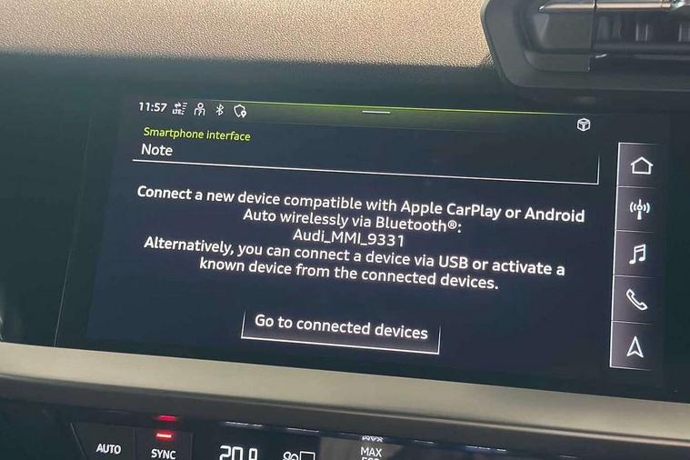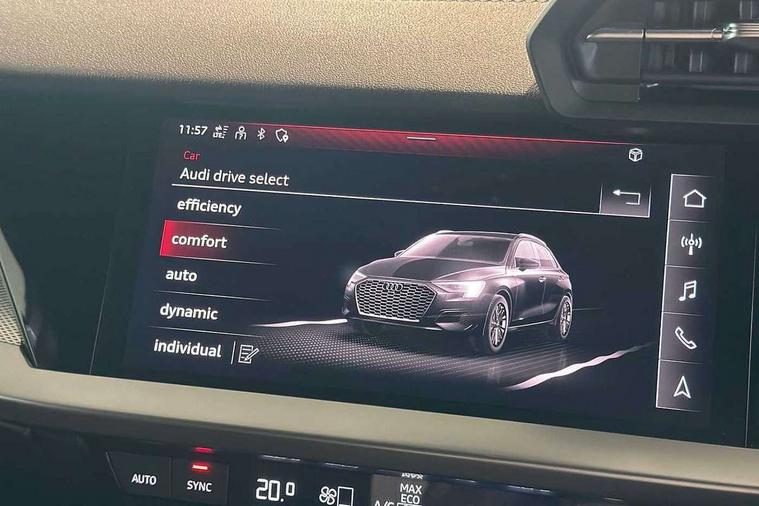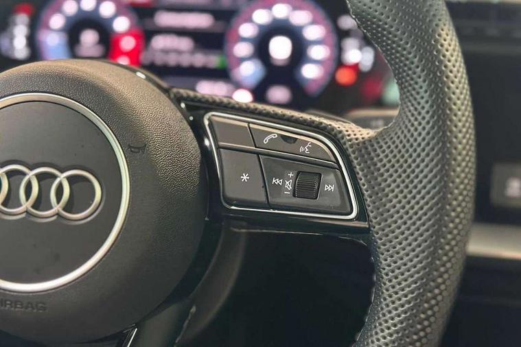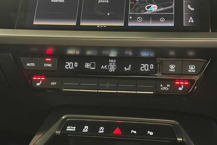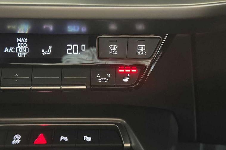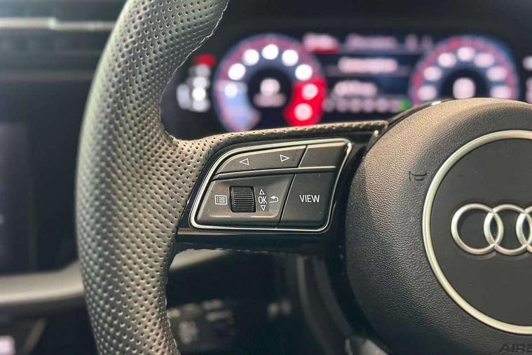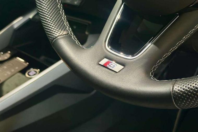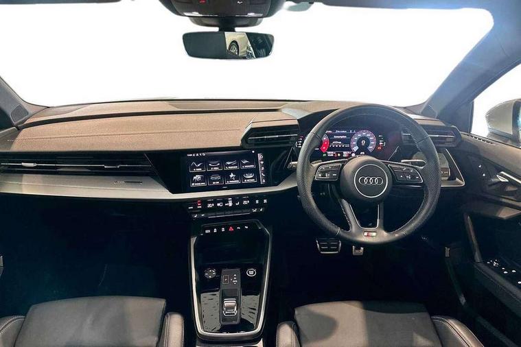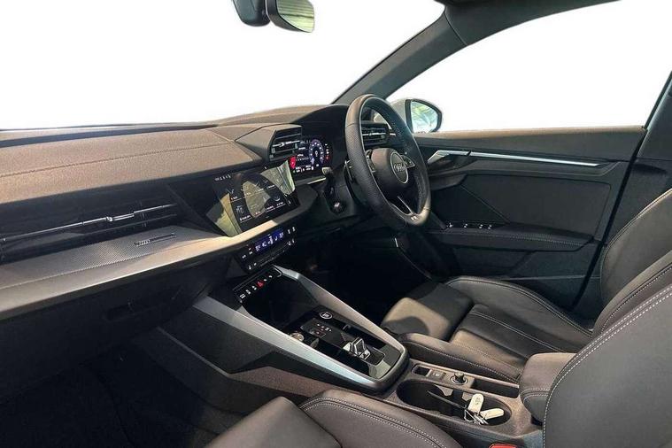 Audi drive select (Auto, Comfort, Dynamic, Efficiency and Individual), Audi smartphone interface, Audi Virtual Cockpit - 10.25" digital and colour instrument cluster, Automatic start/stop system with recuperation, Bluetooth interface, Camera based traffic sign recognition, Collision avoidance assistant, e-Call (emergency call), Electromechanical power speed sensitive steering, Lane departure warning system, MMI Navigation Plus with high resolution 10.1" colour touch screen display, Service indicator, Trip computer, Voice control system with natural language interaction, Sports suspension, 2xUSB-C connection with data and charging functions, 6 passive loudspeakers, DAB Digital radio, 3rd brake light, Acoustic glass windscreen, Aluminium window trim, Auto dimming frameless rear view mirror, Body colour exterior mirrors, Electrically adjustable/heated/folding/auto dimming door mirrors with integrated LED indications + kerb view function for passenger side, Front electric windows, Illuminated door sills with aluminium inserts at the front with S logo, LED daytime running lights, LED headlights with LED rear lights and dynamic rear indicators, Light and rain sensors, Privacy glass - dark tinted rear window, rear door and side windows, Rear electric windows, Rear side air outlets in grained matt black, Rear side wing doors, Rear wiper, S line bumpers, S roof spoiler, 12V socket and storage compartment in front centre console, 3 seat bench in 2nd row, 3 spoke leather multifunction steering wheel with paddle shift, 4 way electrically adjustable lumbar support for driver and front passenger, 60/40 split folding rear seat bench, Black cloth headlining, Dual zone electronic climate control, Front and rear centre armrest in artificial leather, Front and rear headrests, Front/rear floor mats, Height and reach adjustable steering wheel, Interior lighting - glove compartment light and right hand side, Luggage compartment floor covering, Manual boot compartment lid, Manually adjustable front seats, Seat side bolsters, Single front passenger seat, Stainless steel pedals and front footrest in black, Twin leather upholstery with front sports seats S embossed logo, Aluminium interior elements pack - A3 Sportback, LED interior lighting pack - A3 Sportback, S line styling pack - A3 Sportback, 3x3 point rear seat belts, Driver and front passenger airbag with passenger airbag deactivation, Electronic Stabilisation Control (ESC) including ABS, ASR and EDL, First aid kit with warning triangle and 2 safety vests, Front side airbags with head airbags and interaction airbag, Pre-sense front with pedestrian and cyclist detection, Seatbelt monitoring, Tyre pressure loss indicator, Anti theft alarm, Anti-theft wheel bolts, Electronically operated child locks, Immobiliser, Remote control central locking, Dark spectrum aluminium inlays, accent surfaces in the dashboard and centre console in platinum grey silk effect paint finish,