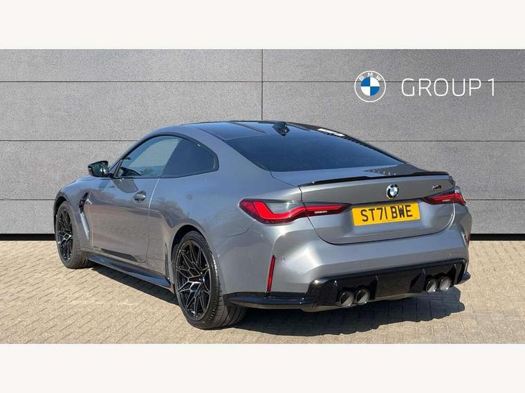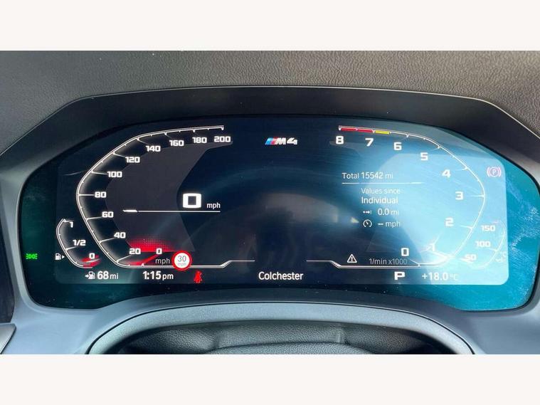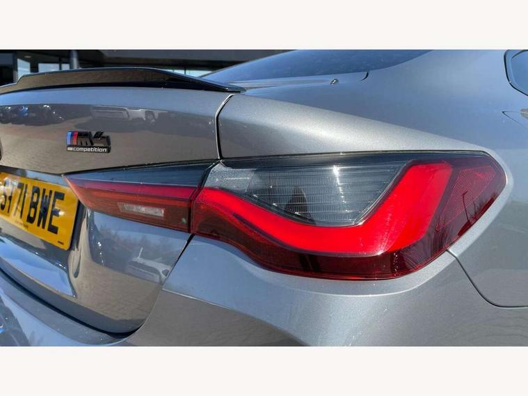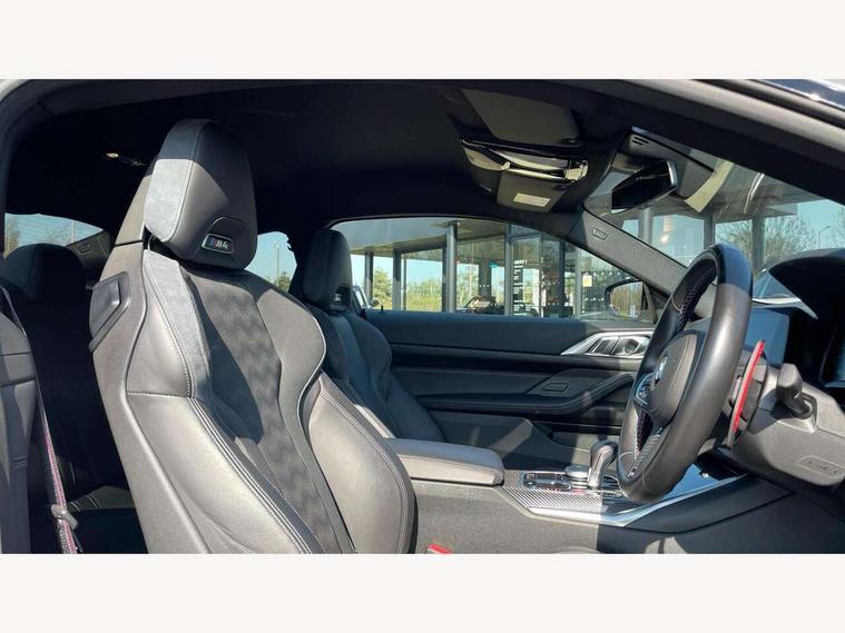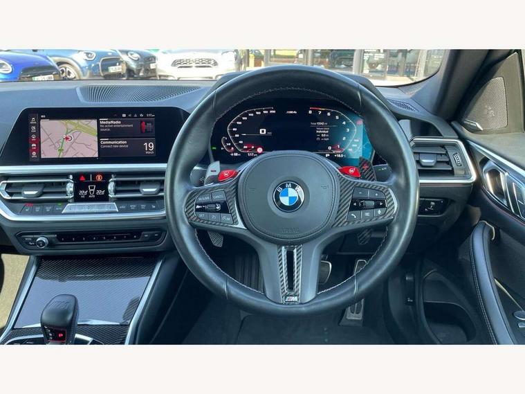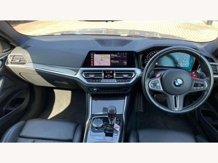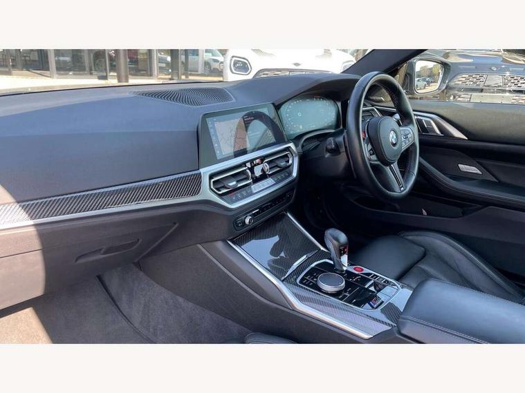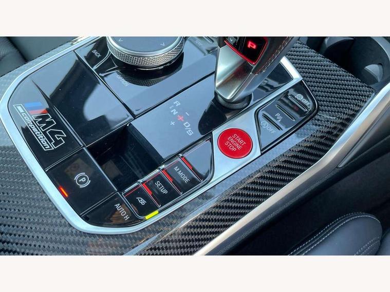 Automatic start/stop system, Bluetooth with USB, BMW gesture control, BMW iDrive controller on centre console, BMW legal emergency call, BMW Live Cockpit Professional sat nav system with 12.3" instrument display and high resolution control display, BMW Online services, BMW Teleservices, Brake pad wear indicator warning light, Door/boot open warning light, Electric Power Steering (EPS) with Servotronic, Enhanced bluetooth with wireless charging, Head up Display, Instrument cluster with extended contents, Lights on warning, Oil sensor for level and grade, warning by check control system, Oil temperature gauge, On board computer, On board diagnostics, Optimum shift indicator, Outside temperature display, Pull away assistant, Run flat indicator, Service interval indicator, Speed limiter, Wi-Fi hotspot, Adaptive M Sport suspension, M Drive Professional including track mode, laptimer, traction control & Drift analyser, M Sport differential, M steptronic sport transmission with drivelogic, 8 programmable favourite buttons, Auxiliary point for auxiliary devices, BMW professional radio/CD/MP3, DAB Digital radio, Harman/Kardon loudspeaker system, Auto dimming driver's door mirror, Auto dimming rear view mirror, Automatic headlights + automatic windscreen wipers, Black chrome exhaust tailpipes, Black model designation badges, BMW high gloss shadow line with extended contents, BMW Individual shadowline lights, Body colour bumpers, Body colour door handles, Carbon fibre reinforced plastic (CFRP) roof, Day time running light, Door mirror integrated indicators, Door sill finishers with aluminium inserts, Dynamic brake lights, Electric adjustable heated door mirrors, Electric folding door mirrors, Follow me home headlights, Front and rear bumper system, Front electric windows with open and close fingertip control, anti trap facility and comfort closing, Heat protection, sun protection glazing, High beam assistant, High gloss black frameless kidney grille with M badge, LED number plate light, LED tail lights with 3D L-shaped LED light design, M designation, Mirror glass aspheric on driver's side, convex on passenger side, Rain sensor, Rear boot, Rear fog lights, Rear reflectors, Shark fin roof aerial, Third brake light, Visible VIN plate, Welcome lighting, Windscreen wipers with integrated washing jets, 12V power socket in front centre console with blanking plug, 2 cupholders in front centre console, 2 rear head restraints, 40:20:40 manually split folding rear seat with two tilt positions for backrest, Ambient lighting, Anthracite headlining, Carbon fibre centre console incl. cover for cupholders, Carbon fibre decorative steering wheel finishers, Carbon fibre shift paddles, Carbon fibre strip in instrument panel on front passenger side, Compartment in front of cupholder, Driver/passenger sunvisors with illuminated vanity mirrors + covers, Electric front seats + driver memory, English handbook, Footwell lighting, Front and rear door exit lights, Front door storage bins with bottle holder, Front interior light, Front isofix attachment + airbag deactivation, Front seat backrest width adjustment, Front seats lumbar support, Front/rear door armrests, Gearshift lever with embossed M badge, Heated front seats, Height adjustable front headrests, Interior mirror lighting, Isofix on 2nd row outer seats, Lockable/illuminated glovebox, Luggage compartment lighting, Rake/reach adjustable steering wheel, Single front passenger seat, Storage compartment in rear doors, Storage tray and compartment with cover in centre console, Three zone automatic air conditioning, Toolkit located in luggage compartment, Additional storage compartment pack - M4, Connected package professional - M4, High gloss shadowline exterior trim pack - M4, 4 x 3 point seatbelts, ABS/EBD, Automatic Stability Control (ASC), Brake energy regeneration, Brake fade compensation, Compound structure brake discs, Cornering brake control (CBC), Crash sensor, Driver/Front Passenger airbags, Dry braking, Dynamic brake control, Dynamic Stability Control with M Dynamic mode, Dynamic Traction Control - DTC, Electromechanical parking brake, Front and rear head airbags, Front seat side impact airbags, Front seatbelt pretensioners + load limiters, Hill start assist, M Sport seat belts, Seatbelt warning, Side impact protection, Two tone horn, Tyre pressure sensor, Warning triangle and first aid kit, Electronic immobiliser, Remote central locking, Thatcham cat 1 remote alarm, Vehicle Key with 4 buttons including the integrated key, Galvanic finish to control surrounds, High gloss black interior trim, Tyre repair kit,