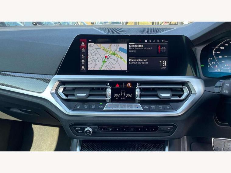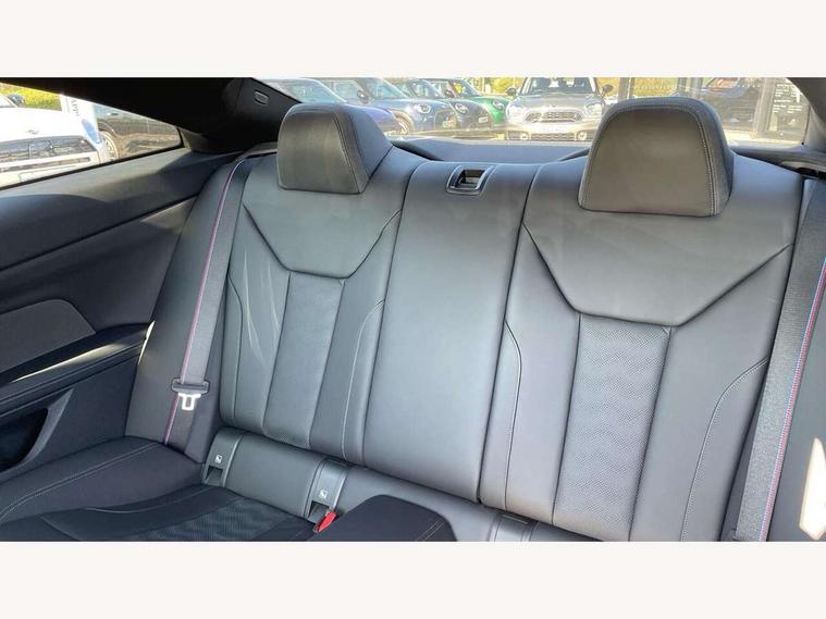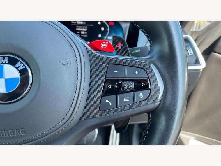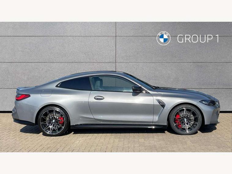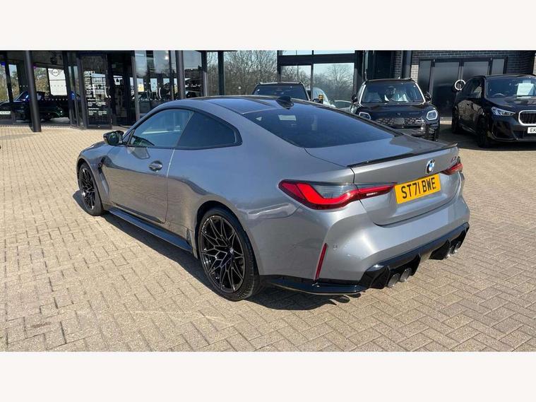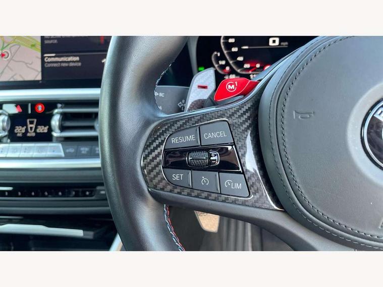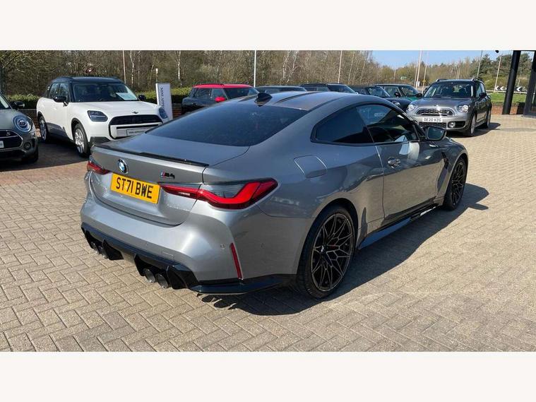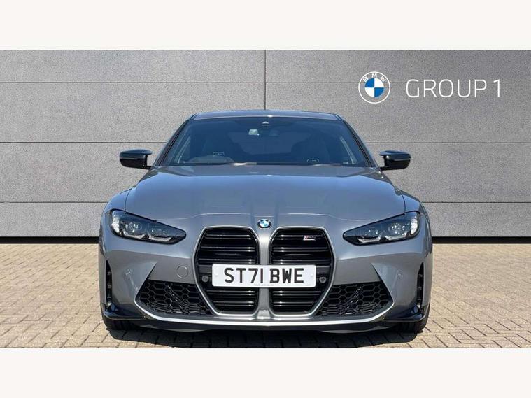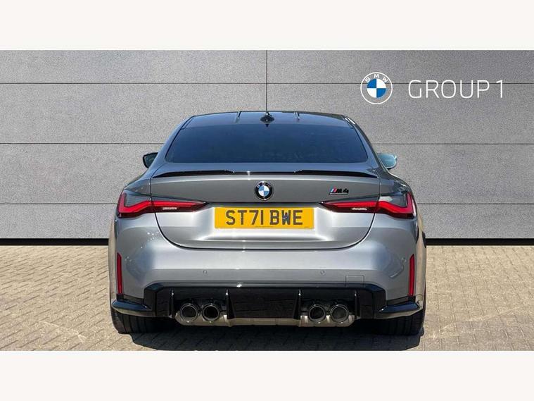 Automatic start/stop system, Bluetooth with USB, BMW gesture control, BMW iDrive controller on centre console, BMW legal emergency call, BMW Live Cockpit Professional sat nav system with 12.3" instrument display and high resolution control display, BMW Online services, BMW Teleservices, Brake pad wear indicator warning light, Door/boot open warning light, Electric Power Steering (EPS) with Servotronic, Enhanced bluetooth with wireless charging, Head up Display, Instrument cluster with extended contents, Lights on warning, Oil sensor for level and grade, warning by check control system, Oil temperature gauge, On board computer, On board diagnostics, Optimum shift indicator, Outside temperature display, Pull away assistant, Run flat indicator, Service interval indicator, Speed limiter, Wi-Fi hotspot, Adaptive M Sport suspension, M Drive Professional including track mode, laptimer, traction control & Drift analyser, M Sport differential, M steptronic sport transmission with drivelogic, 8 programmable favourite buttons, Auxiliary point for auxiliary devices, BMW professional radio/CD/MP3, DAB Digital radio, Harman/Kardon loudspeaker system, Auto dimming driver's door mirror, Auto dimming rear view mirror, Automatic headlights + automatic windscreen wipers, Black chrome exhaust tailpipes, Black model designation badges, BMW high gloss shadow line with extended contents, BMW Individual shadowline lights, Body colour bumpers, Body colour door handles, Carbon fibre reinforced plastic (CFRP) roof, Day time running light, Door mirror integrated indicators, Door sill finishers with aluminium inserts, Dynamic brake lights, Electric adjustable heated door mirrors, Electric folding door mirrors, Follow me home headlights, Front and rear bumper system, Front electric windows with open and close fingertip control, anti trap facility and comfort closing, Heat protection, sun protection glazing, High beam assistant, High gloss black frameless kidney grille with M badge, LED number plate light, LED tail lights with 3D L-shaped LED light design, M designation, Mirror glass aspheric on driver's side, convex on passenger side, Rain sensor, Rear boot, Rear fog lights, Rear reflectors, Shark fin roof aerial, Third brake light, Visible VIN plate, Welcome lighting, Windscreen wipers with integrated washing jets, 12V power socket in front centre console with blanking plug, 2 cupholders in front centre console, 2 rear head restraints, 40:20:40 manually split folding rear seat with two tilt positions for backrest, Ambient lighting, Anthracite headlining, Carbon fibre centre console incl. cover for cupholders, Carbon fibre decorative steering wheel finishers, Carbon fibre shift paddles, Carbon fibre strip in instrument panel on front passenger side, Compartment in front of cupholder, Driver/passenger sunvisors with illuminated vanity mirrors + covers, Electric front seats + driver memory, English handbook, Footwell lighting, Front and rear door exit lights, Front door storage bins with bottle holder, Front interior light, Front isofix attachment + airbag deactivation, Front seat backrest width adjustment, Front seats lumbar support, Front/rear door armrests, Gearshift lever with embossed M badge, Heated front seats, Height adjustable front headrests, Interior mirror lighting, Isofix on 2nd row outer seats, Lockable/illuminated glovebox, Luggage compartment lighting, Rake/reach adjustable steering wheel, Single front passenger seat, Storage compartment in rear doors, Storage tray and compartment with cover in centre console, Three zone automatic air conditioning, Toolkit located in luggage compartment, Additional storage compartment pack - M4, Connected package professional - M4, High gloss shadowline exterior trim pack - M4, 4 x 3 point seatbelts, ABS/EBD, Automatic Stability Control (ASC), Brake energy regeneration, Brake fade compensation, Compound structure brake discs, Cornering brake control (CBC), Crash sensor, Driver/Front Passenger airbags, Dry braking, Dynamic brake control, Dynamic Stability Control with M Dynamic mode, Dynamic Traction Control - DTC, Electromechanical parking brake, Front and rear head airbags, Front seat side impact airbags, Front seatbelt pretensioners + load limiters, Hill start assist, M Sport seat belts, Seatbelt warning, Side impact protection, Two tone horn, Tyre pressure sensor, Warning triangle and first aid kit, Electronic immobiliser, Remote central locking, Thatcham cat 1 remote alarm, Vehicle Key with 4 buttons including the integrated key, Galvanic finish to control surrounds, High gloss black interior trim, Tyre repair kit,