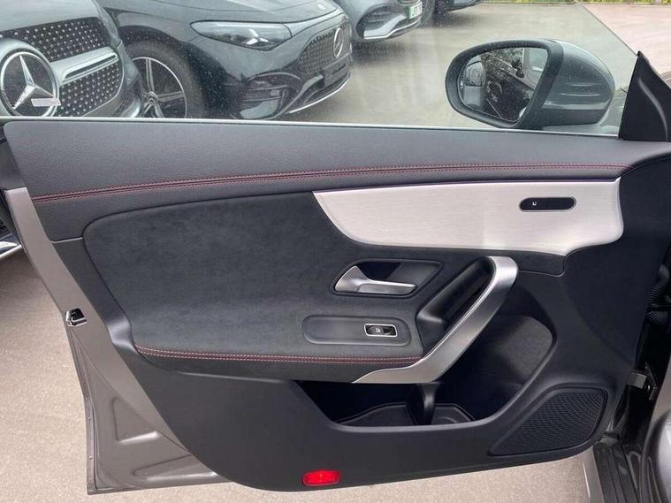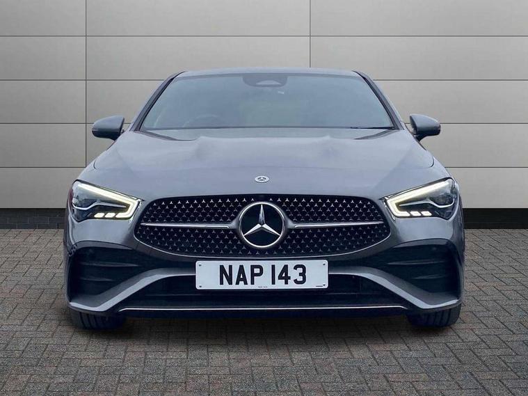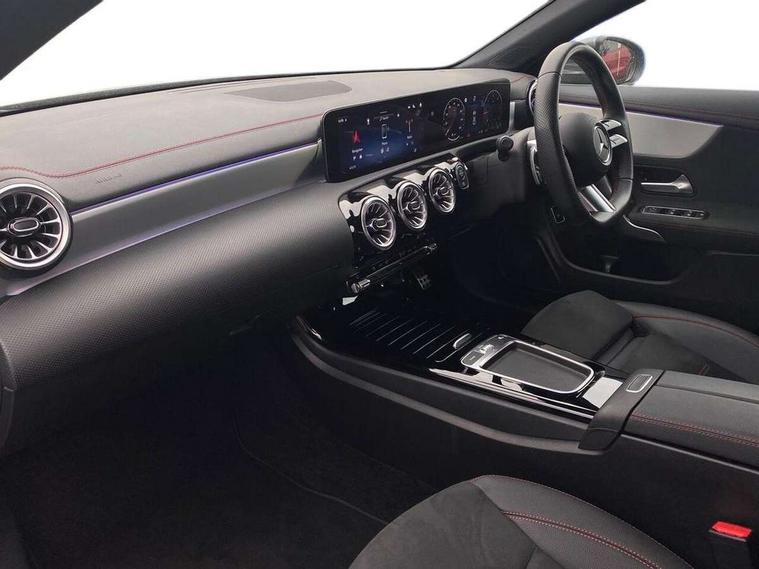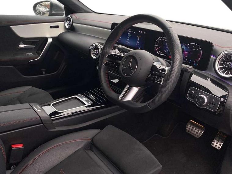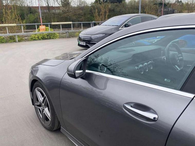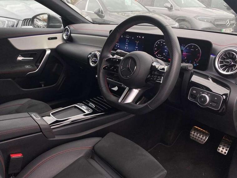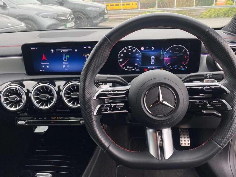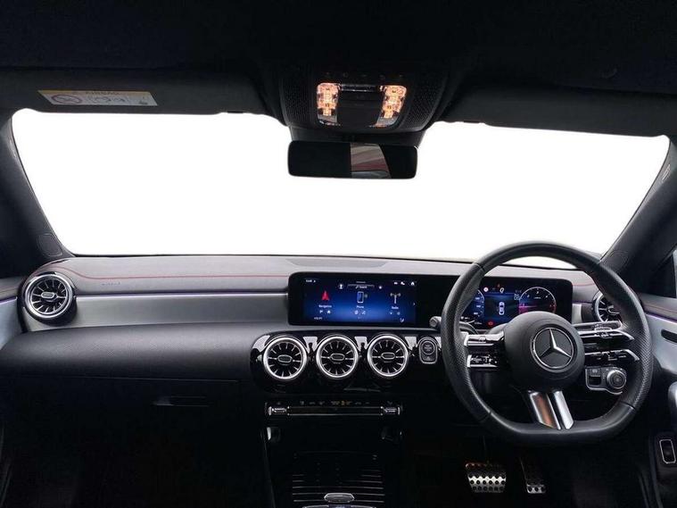 10.25 inch Instrument display with digital cockpit, 10.25 inch touchscreen central media display, Active lane keeping assist, Attention assist - Monitors steering behaviour and long journey fatigue, Blind spot assist, Bluetooth connection, Car wash mode, Cruise control with limiter, Direct steer system, DYNAMIC SELECT with a choice of driving modes (ECO, Comfort, Sport and Individual), ECO start/stop function, Fingerprint sensor, Fluid level warning indicator for fuel, oil, coolant and washer fluid, Hard-disk navigation, Hey Mercedes Voice activation, Lamp failure indicator, Mercedes me connect including emergency call system, accident recovery, breakdown and maintenance management, Mercedes me remote services, Outside temperature gauge, Owners manual in English, Pre-installation of private car share, Radio aerial integrated into front and rear windshields, Service indicator (ASSYST), Smartphone integration with Apple CarPlay and Android auto, Speed limit assist, Trip computer in multifunction display with current consumption indicator, Wireless charging in the front centre console, Comfort suspension with ride height lowering, Rear axle multi-link, DAB digital radio tuner, MBUX multimedia system, Mercedes Benz sound system (100 W) with 6 speakers, Pre installation for Mercedes Benz Link, Adaptive brake lights, AMG body styling with AMG front apron and rear apron and visible exhaust tailpipe in chrome trim elements, Body colour door handles, Electric windows, Electrically adjustable and heated door mirrors with integrated LED indicators, Exhaust system with 2 Visible tailpipe trim elements and rear apron with trim in chrome, Hand free access, Headlamp assist automatic headlamp activation, Heated glass rear windscreen + timer control, High gloss aluminium beltline strips, High level LED third brake light, Interior mirror with black reading lamps and frameless, LED high performance headlamps with integrated LED daytime running lights and adaptive highbeam assist, LED tail lamp, Privacy glass with dark tinting on rear side windows and rear window, Radiator grille with Mercedes-Benz pattern in chrome and central Mercedes star, single louvre in high-gloss black with chrome inserts, Rain sensing windscreen wipers with two sensitivity settings, Rear boot, Rear fog lamp, Rear side wing doors, Variable front intermittent wipers, Window line trim strip in high gloss aluminium, 3 seat bench in 2nd row, 3 twin spoke flattened multifunction steering wheel in nappa leather - horizontal twin spoke in high gloss black, vertical twin spoke in silver chrome, 4 way lumbar support, 40:20:40 split folding rear seat backrests, Air conditioning - One zone THERMATIC automatic climate control with automatically controlled air distribution, Air vents with surround in silver chrome, Artico man-made leather/Microcut microfibre upholstery, Automatic child seat recognition sensor, Black roof lining, Brushed stainless steel sports pedals with rubber studs, Floor mats with stitched AMG lettering, Fluorescent jacket, Front centre armrest with stowage, Galvanished gear shift paddles in silver chrome, Heated front seats, Interior lighting - 64 colour Ambient lighting, Luggage net on driver/front passenger seat backrest, Manually height and reach adjustable steering column, Rear head restraints, Single front passenger seat, Sport seats with fixed head restraints, Stowage compartment in centre console with retractable cover, Sunvisors with illuminated vanity mirrors, Twin front cupholders, Two outer rear seat isofix and top tether child seat fixing points, Keyless go comfort pack - CLA, Light and sight pack - CLA, Mirror pack - CLA, Parking pack with reversing camera - CLA, Seat comfort pack - CLA, USB package plus - CLA, Active bonnet pedestrain safety measure which detects an impact and raises bonnet by 65mm, Active brake assist includes forward collision warning system with autonomous braking, Adaptive brake assist with hold function and hill start assist, Anti lock braking system (ABS) with brake assist, Black seat belts, Bonnet with power domes, Brake calipers with Mercedes-Benz lettering, Brake pad wear warning indicator, Childproof locks manually operated for rear doors and electrically operated for rear power windows, Crash responsive emergency lighting, Driver and front passenger head and sidebags, Driver and front passenger windowbags, Drivers knee airbag, Dual stage driver and front passenger airbags, Electric parking brake, Electronic stability programme with acceleration skid control, ESP curve dynamic assist, Front and rear seatbelt reminder, Front passenger seat occupancy sensor, Perforated front brake discs, Sports braking system, Three point rear seat belts, Tyre pressure monitoring system, Warning triangle and first aid kit, Alarm system with immobiliser and interior protection -Thatcham category 1, Guard 360 deg vehicle protection - tow away protection with visual, acoustic warning, interior monitoring, preinstallation for parking damage, Remote central locking and crash sensor with emergency opening function, Light aluminium with longitudinal grain interior trim, 18" AMG 5 twin spoke light alloy wheels painted in termolite grey with high sheen finish, Summer tyres, Tirefit tyre sealant kit,