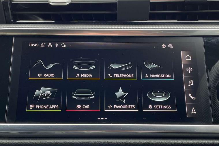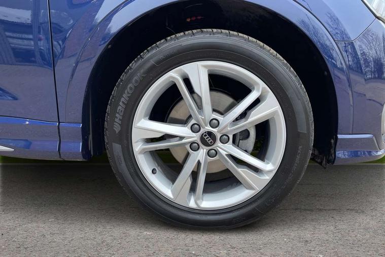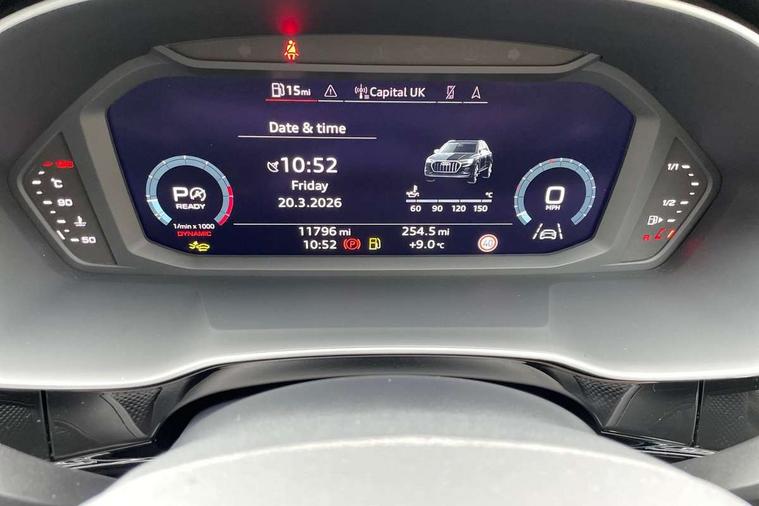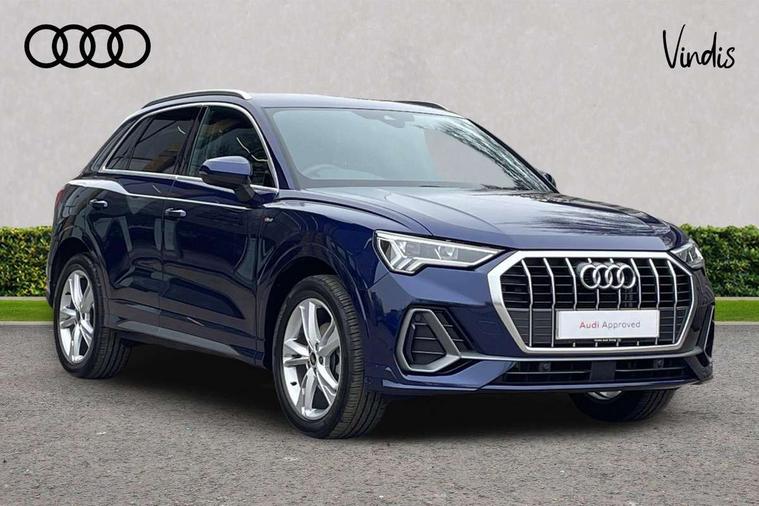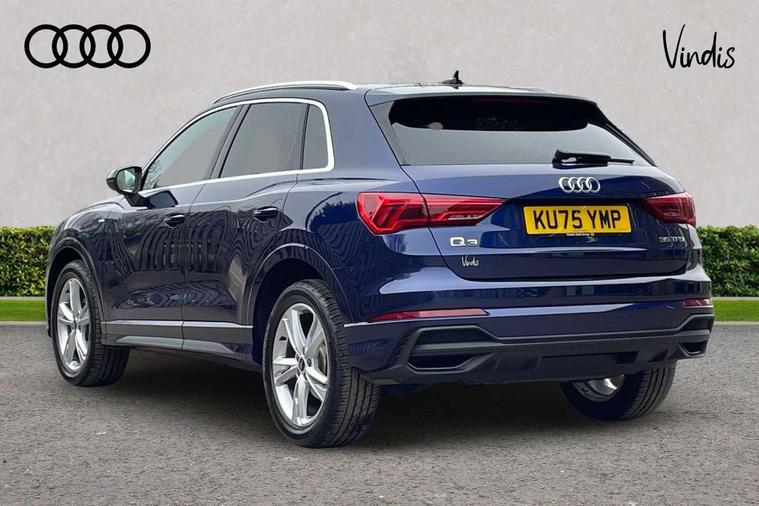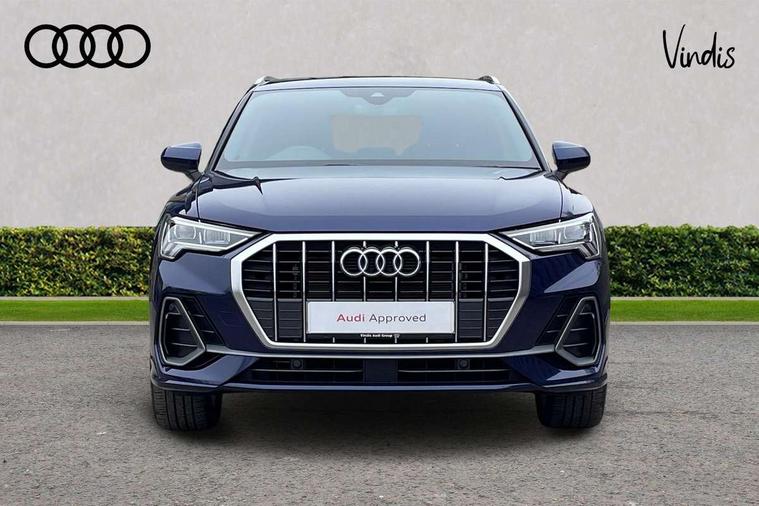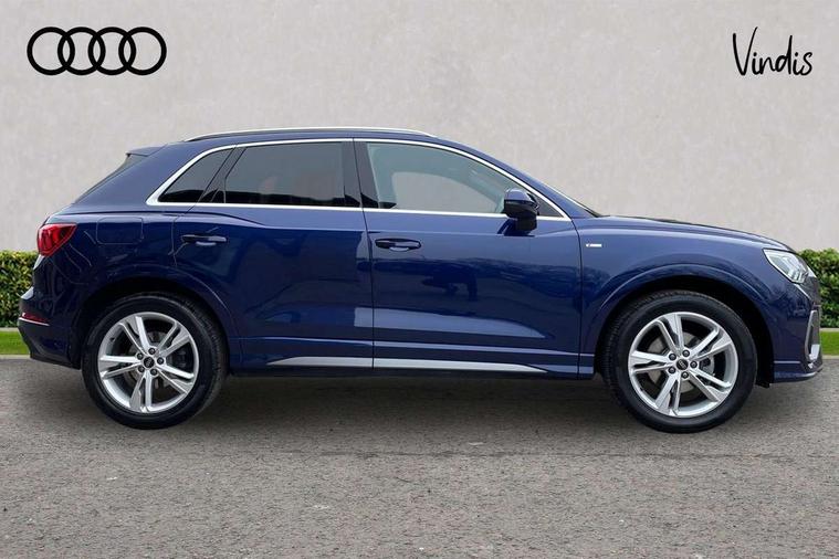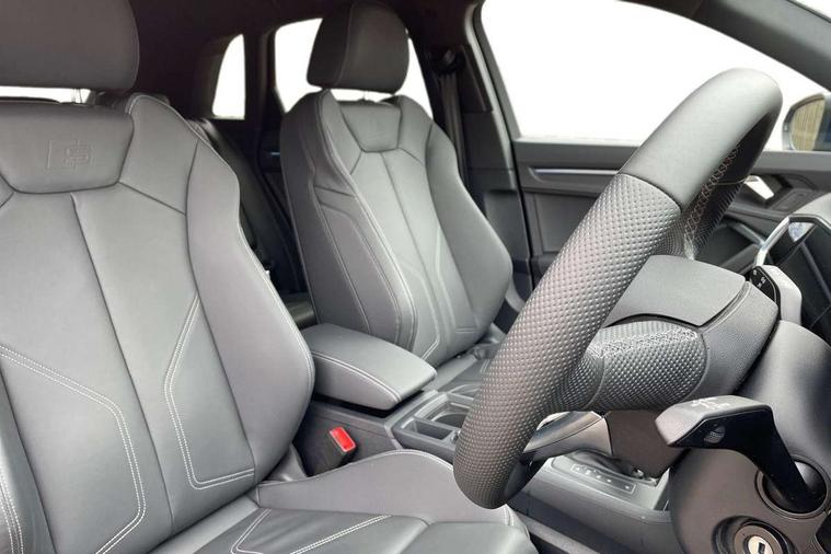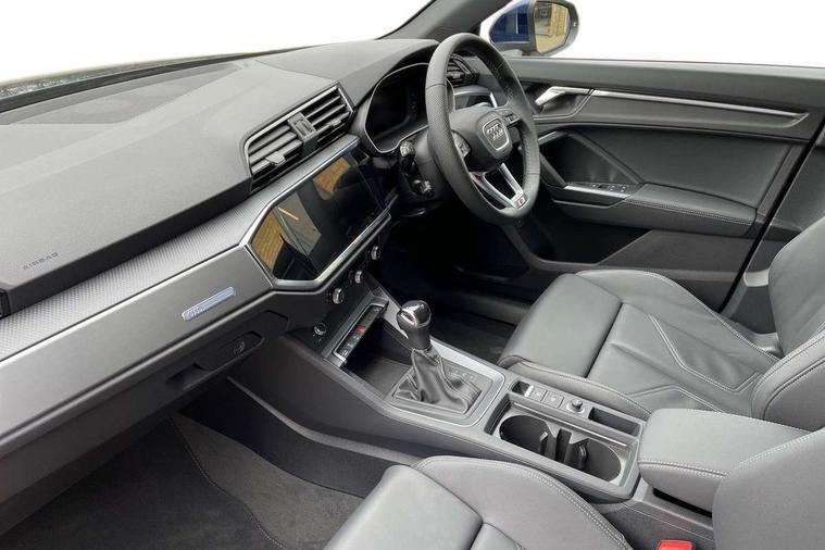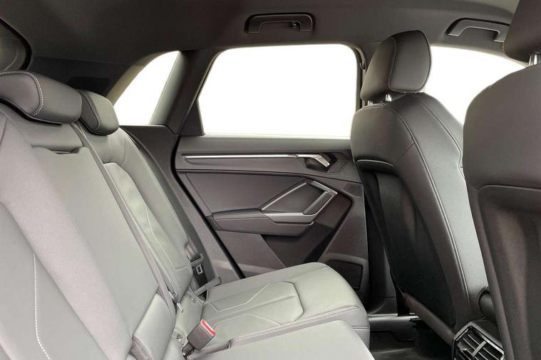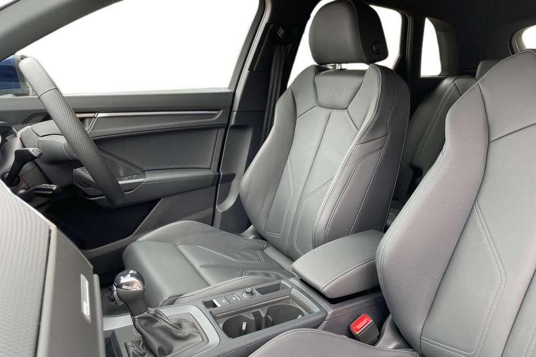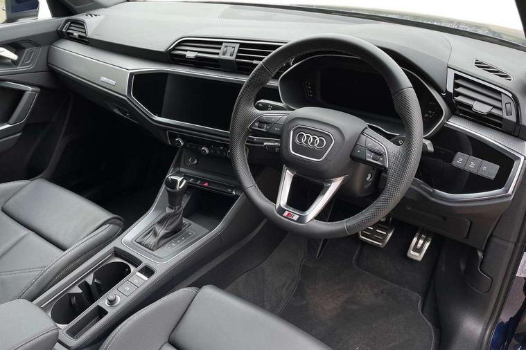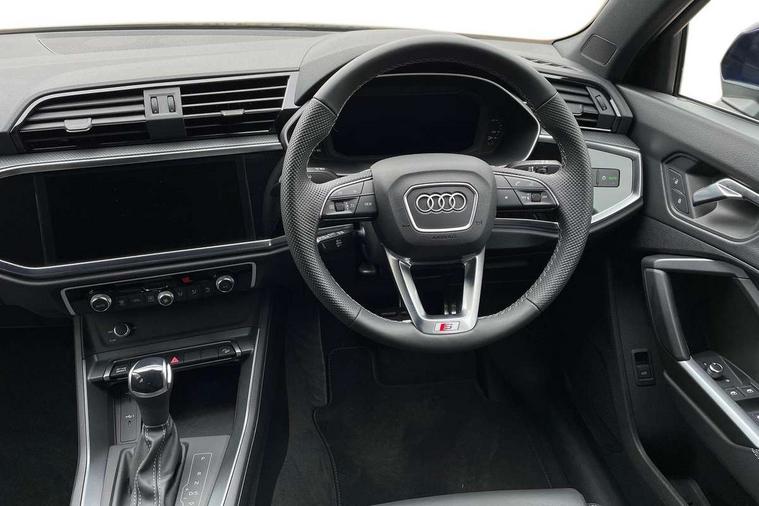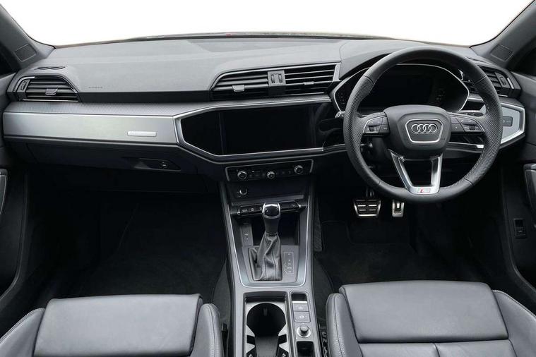 Amazon alexa Integration, Audi connect safety and service, Audi drive select, Audi lane departure warning, Audi Virtual Cockpit - 10.25" display, Bluetooth interface, Camera based traffic sign recognition, Distraction and Fatigue warning, Legal emergency call, MMI Navigation Plus with high resolution 10.1 inch touchscreen colour display, Power operated tailgate, Progressive steering, Service interval indicator, Smartphone interface includes wireless Apple carplay/Android Auto, Start stop system with recuperation, Voice control system with natural language interaction, Sports suspension, 2 USB-C ports with charge and data functions, 6 passive loudspeakers, DAB digital radio module, Acoustic windscreen, Aluminium roof rails, Aluminium window trim, Anthracite black radiator grille, Auto dimming door mirrors, Auto dimming frameless rear view mirror, Body colour front spoiler blade, Electrically folding, adjustable and heated door mirrors with integrated LED side indicators and kerb view function for passenger side, Front and rear electric windows, Front fog lights, Front side air inlets in matt platinum grey, Grille vertical bars in aluminium silver/Matt, High gloss black finish B and C pillars, LED Dynamic rear indicators, LED headlights with LED daytime running lights, LED rear lights, LED third brake light, Privacy glass dark tinted rear and rear-side windows (from B-pillar backwards), Rain and light sensors, Rear diffuser grille in grained matt black, Rear diffuser strip in matt anthracite black, Rear side wing doors, Rear wiper, S line badges on front wings, S Line front and rear bumpers and side skirts, Side skirt insert in matt Platinium grey, Variable front intermittent wipers, 12V socket in rear centre console, 3 seat bench in 2nd row, 3 spoke leather multifunction steering wheel features S badging and grips in perforated leather with contrast stitching, 40:20:40 folding with manual adjustment for 60:40 forwards/backwards position and backrest angle, Adjustable rear seat bench/backrest with centre armrest and cupholder, Black carpet mats, Black cloth headlining, Dual zone electronic climate control, Electric lumbar support, Front and rear black floor mats with contrast stitching in rock grey, Front and rear headrests, Front centre armrest, Height and reach adjustable steering wheel, Horizontal trim strip in matt platinum grey, Illuminated door sill trims with S logo, ISOFIX child seat mounting for front passenger with airbag deactivation and outer rear seat including top tether attachment point for outer rear seats, Luggage compartment sill protection in stainless steel, Manual front seats with height adjustment, Perforated leather gearknob, Single front passenger seat, Stainless steel pedals, Twin leather upholstery with front sport seats + S embossing, Non smoking pack - Q3, 3x3 point rear seatbelts, 6 airbags - Driver, front passenger, curtain and side windows, Audi pre-sense front with pedestrain and cyclist recognition, Electrically operated child locks on rear doors, Electromechanical parking brake, Electronic stabilisation control including ABS, ASR and EDL, Front seatbelt reminder, Hill descent control, Hill hold assist, Pre sense basic, Seatbelt monitoring, Tyre pressure warning, Warning triangle and first aid kit, Anti theft wheel bolts, Immobiliser, Remote central locking, Thatcham approved category 1 anti theft alarm, Aluminium look interior elements, Dark matt brushed aluminium inlay, Detail dashboard around MMI touch colour display in glass look, black with surround in aluminium look, Leatherette door armrest,