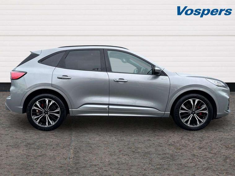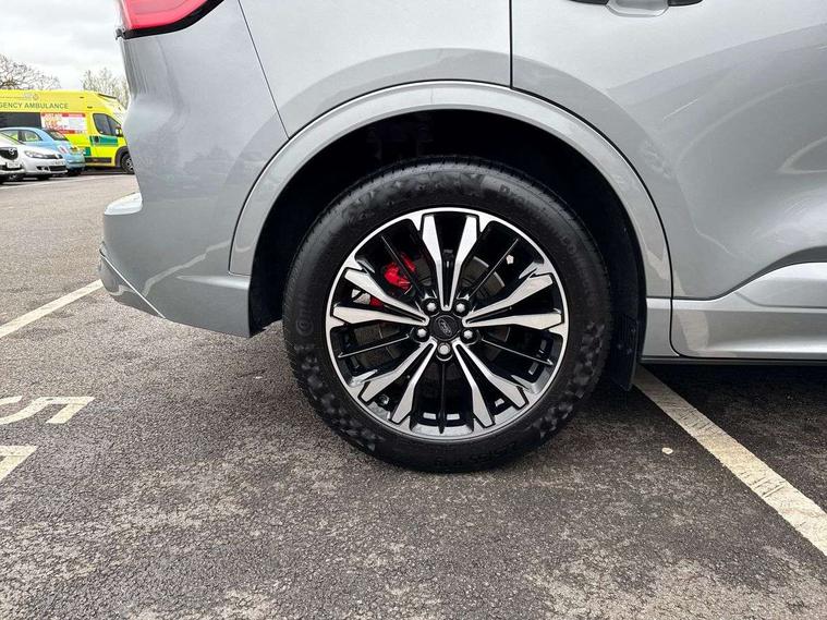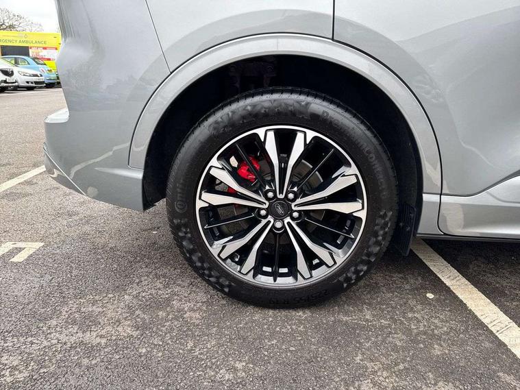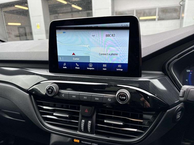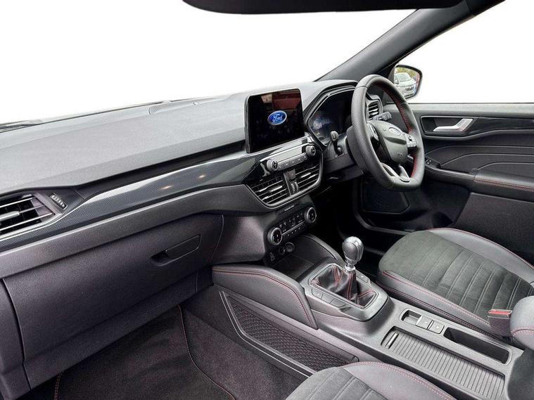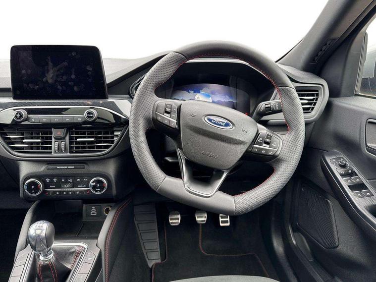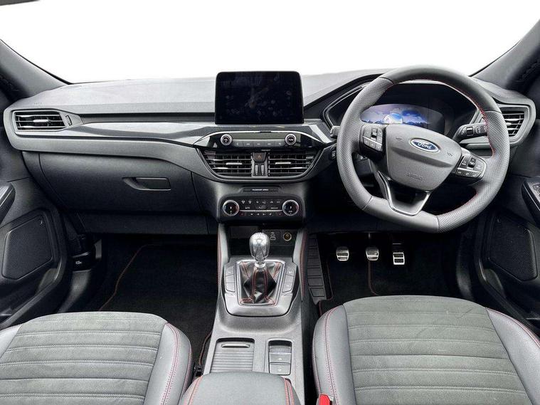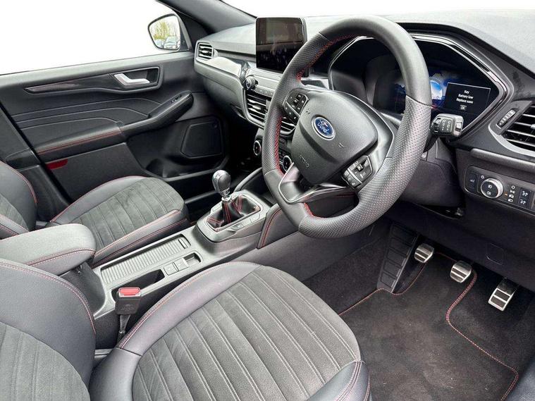 12.3" digital colour instrument cluster, Ford easy fuel, Ford SYNC 3 with 8" TFT LCD touchscreen, App Link, andriod auto/apple carPlay, emergency assistance and navigation with Ford pass connect, Front and rear parking sensors, Hands free power tailgate, Lane keeping aid with lane departure warning, Power assist steering, Rear view camera, Selectable drive modes, Service interval indicator, Sports suspension, Twist beam rear suspension, B&O premium audio system with 10 speakers and subwoofer, 2 USB ports, DAB radio/CD, Auto headlamps with high and low beam, Black roof rails, Day/night rear view mirror, Front LED fog lamps, Large rear spoiler, LED daytime running lights, LED rear lights, Power folding heated door mirrors with puddle lights, Power front/rear windows with global close, Power opening panoramic roof, Privacy glass, Quickclear heated windscreen, Rear side wing doors, Rear wiper, ST Line body styling kit with unique front and rear fascia and bumper, rear painted diffuser, front painted skid plates, dark mesh upper grille, ST Line front scuff plates, Third brake light, Twin exhausts, 10 way power adjustable drivers seat, 2nd row sliding seats with 60:40 split, 8 way manual passenger seat including lumbar support and height adjust, Alloy pedals, Centre console with electronic parking brake, Dark headlining and pillars, Electronic automatic temperature control (EATC), Flat bottomed leather steering wheel in sensico with red stitching, Front and rear head restraints, Heated passenger and driver seats, Heated rear seats, Heated steering wheel, Partial premium touch sensico leather upholstery with black cloth inserts and red stitching, Rear charging point, Single front passenger seat, Sports seats, ST Line front and rear floor mats, ST Line gear knob, 3x3 point rear seatbelts, Airbags - front driver/passenger, front and rear curtain, Drivers knee airbag, Electronic stability control (ESC) and ABS, Ford MyKey Gen 2 safety system, Manual child proof rear door locks, Post collision braking, Pre collision assist with autonomous emergency braking, Rear seat Occupancy alert, Red brake calipers, Tyre pressure monitoring system, Engine immobiliser, Keyless entry and Ford power start button (Keyless start), Locking wheel nuts, Remote powered central double locking doors, Thatcham category 1 alarm,