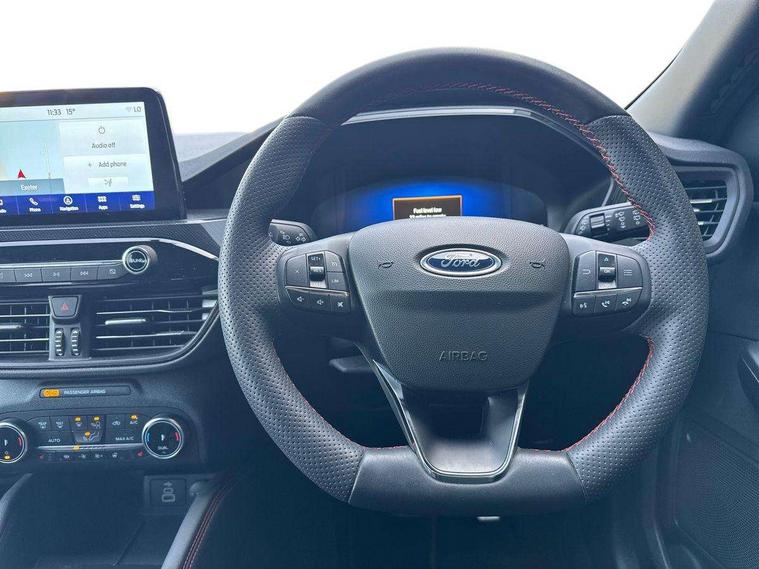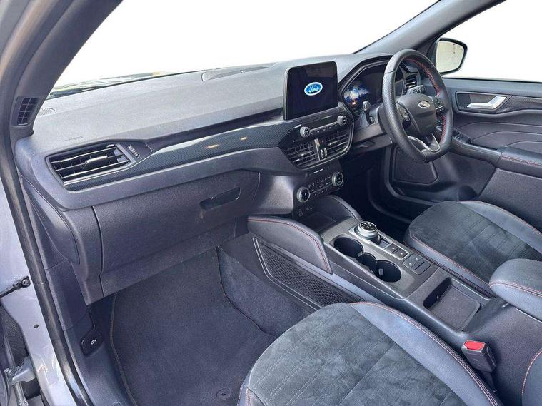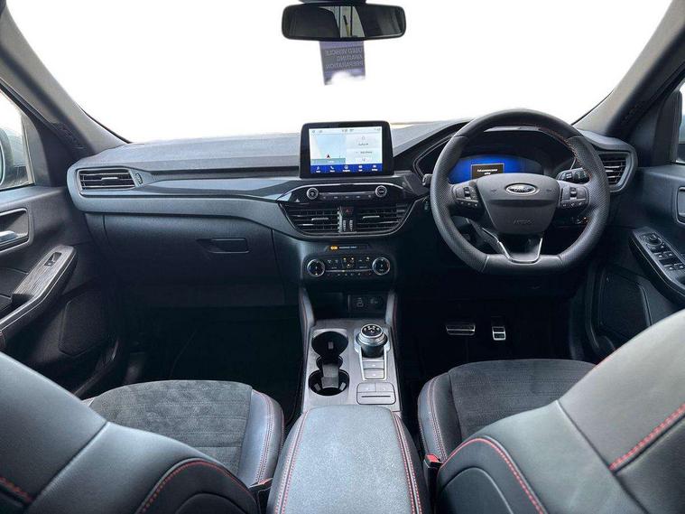 12.3" digital colour instrument cluster, Ford easy fuel, Ford SYNC 3 with 8" TFT LCD touchscreen, App Link, andriod auto/apple carPlay, emergency assistance and navigation with Ford pass connect, Front and rear parking sensors, Hands free power tailgate, Lane keeping aid with lane departure warning, Power assist steering, Rear view camera, Selectable drive modes, Service interval indicator, Sports suspension, Twist beam rear suspension, B&O premium audio system with 10 speakers and subwoofer, 2 USB ports, DAB radio/CD, Auto headlamps with high and low beam, Black roof rails, Day/night rear view mirror, Front LED fog lamps, Large rear spoiler, LED daytime running lights, LED rear lights, Power folding heated door mirrors with puddle lights, Power front/rear windows with global close, Power opening panoramic roof, Privacy glass, Quickclear heated windscreen, Rear side wing doors, Rear wiper, ST Line body styling kit with unique front and rear fascia and bumper, rear painted diffuser, front painted skid plates, dark mesh upper grille, ST Line front scuff plates, Third brake light, Twin exhausts, 10 way power adjustable drivers seat, 2nd row sliding seats with 60:40 split, 8 way manual passenger seat including lumbar support and height adjust, Alloy pedals, Centre console with electronic parking brake, Dark headlining and pillars, Electronic automatic temperature control (EATC), Flat bottomed leather steering wheel in sensico with red stitching, Front and rear head restraints, Heated passenger and driver seats, Heated rear seats, Heated steering wheel, Partial premium touch sensico leather upholstery with black cloth inserts and red stitching, Rear charging point, Single front passenger seat, Sports seats, ST Line front and rear floor mats, 3x3 point rear seatbelts, Airbags - front driver/passenger, front and rear curtain, Drivers knee airbag, Electronic stability control (ESC) and ABS, Ford MyKey Gen 2 safety system, Manual child proof rear door locks, Post collision braking, Pre collision assist with autonomous emergency braking, Rear seat Occupancy alert, Red brake calipers, Tyre pressure monitoring system, Engine immobiliser, Keyless entry and Ford power start button (Keyless start), Locking wheel nuts, Remote powered central double locking doors, Thatcham category 1 alarm,