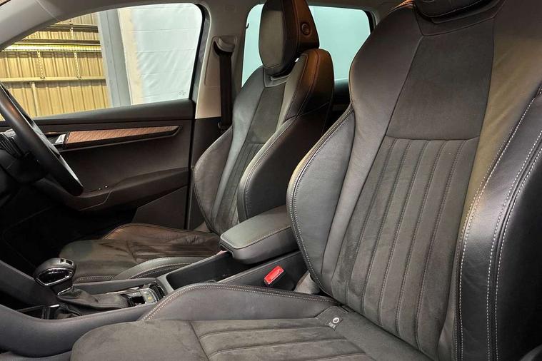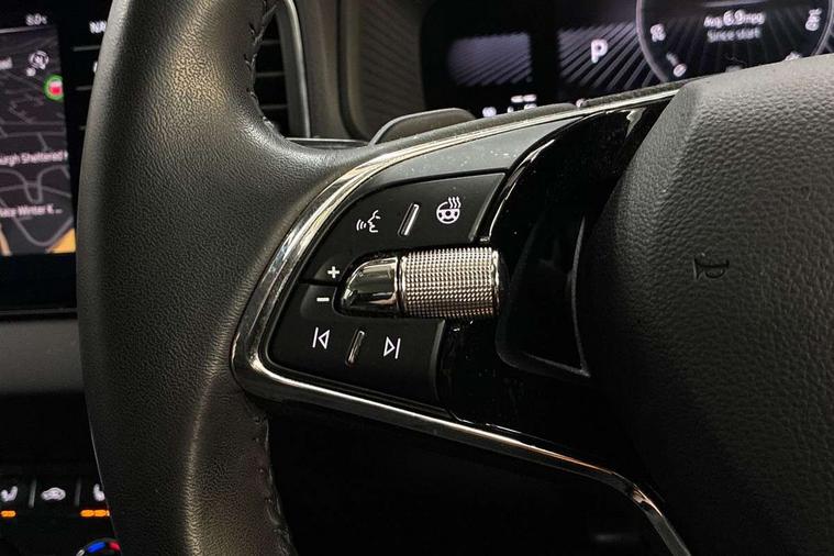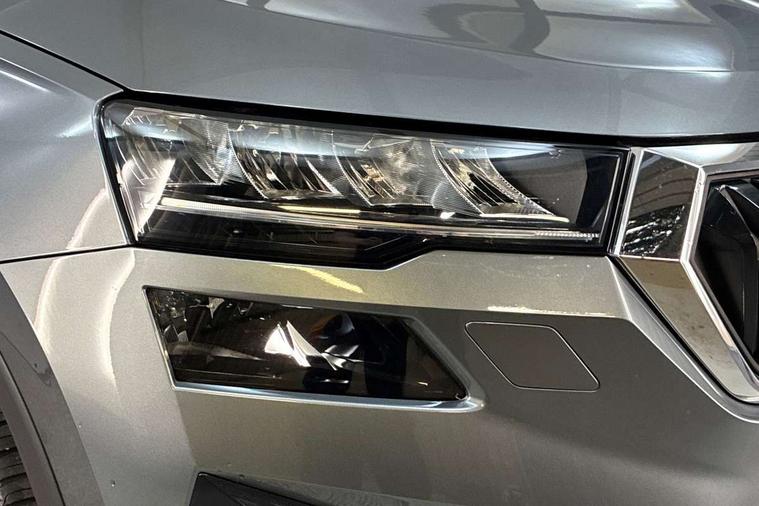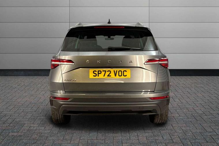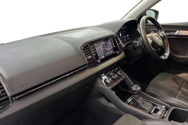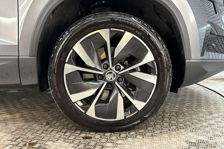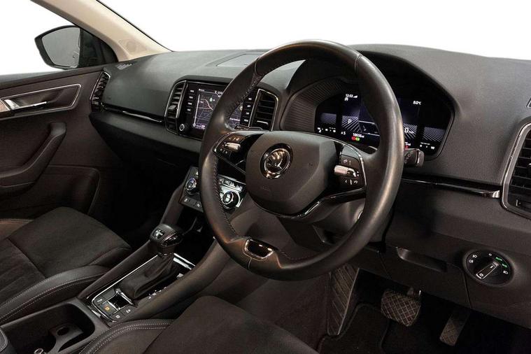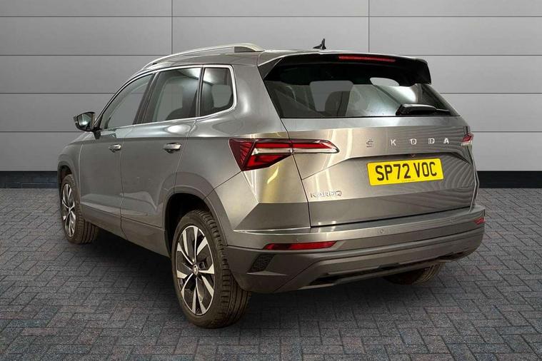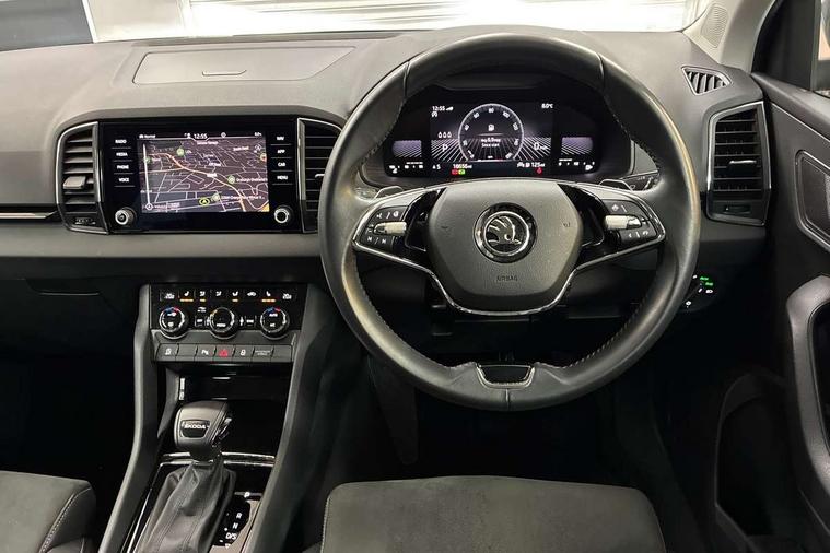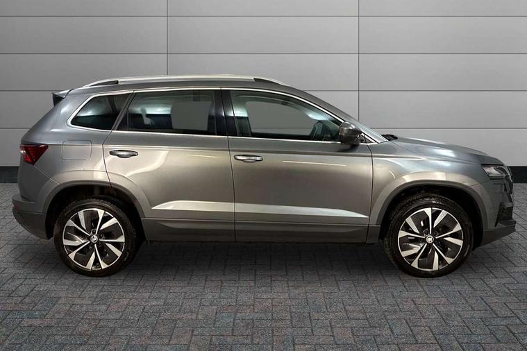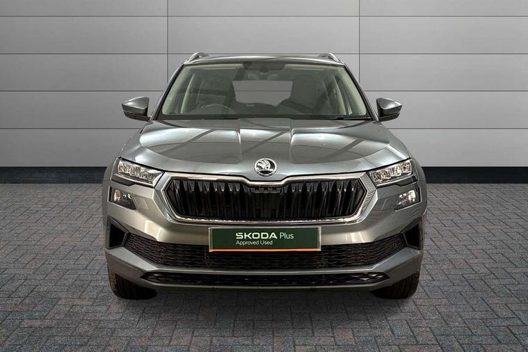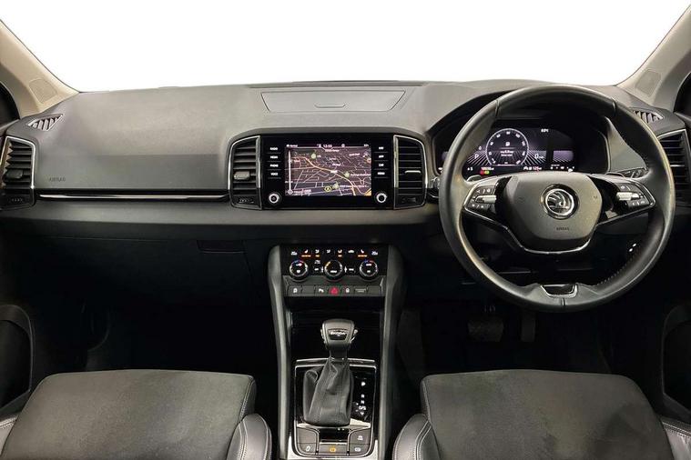 8" Digital display, Care connect, Colour multifunction trip computer, Driver fatigue sensor, Emergency services call system, Outside temperature gauge, Service interval indicator, SmartLink wireless for Apple and wired for Android, Start/stop system with regenerative braking, USB C Port x 2 in front centre console, 8 Speakers, DAB radio with Bluetooth, USB connection, Acoustic glass, Aero front windscreen wipers with intermittent function, Auto dimming rear view mirror with light and rain sensors, Automatic headlight control system, Black electric window control buttons, Body colour door mirrors and handles, Electric front and rear windows with child proof lock, Heated rear windscreen, LED daytime running lights, LED rear lights with high functionality welcome effect and dynamic indicators, Light assistant (coming/leaving home/tunnel light), Plastic scuff plates, Privacy glass, Rear side wing doors, Rear spoiler, Rear window wiper with washer system and intermittent control, Safety reflectors on front doors, 1.5 litre bottle holders in driver and front passenger door panels, 12V socket in boot, 12v socket in front centre armrest with storage compartment and rear air vents, 2 Folding hooks and nets in boot, 2 spoke leather heated multifunction steering wheel with DSG paddles, 2 x Tablet holder, 3 rear height adjustable headrests, 3 seat bench in 2nd row, 4 foldable roof handles with rear coat hooks, Black floor carpet, Chrome inner door handles, Decorative door sills with KAROQ badging, Double sided boot floor, Foldable hooks in the boot, Front head restraints, Height adjustable front three point seats belts with tensioners, Height/reach adjust steering wheel, Ice scraper, Illuminated glovebox, Illuminated luggage compartment, Isofix child seat preparation for front passenger seat, Isofix child seat preparation outer rear, Manual lumbar support for front seats, Pen holder, Pollen filter, Rear boot cover, Rear reading lights, Rubbish bin door, Safety vest holder, Single front passenger seat, Storage box in upper central dashboard closed, Sunvisors with illuminated vanity mirrors, Textile floor mats, Ticket holder, VarioFlex seats with standard rear seat release, Chrome roof rails + chrome pack - Karoq, Parking pack - Karoq, Automatic door unlocking in case of crash, Automatic fuel cut off in case of crash, Child locks on rear doors, Driver airbag, Electronic parking brake with auto hold function, Emergency rear braking signal, ESC including ABS, MSR, ASR, EDS, HBA, DSR, RBS, MKB and traction control, Front side airbags, Hill hold control, Knee airbags, Passenger airbag with switch-off function, Pedestrian monitor, Seatbelt reminder signalisation and pretensioner for all seats, Three point seatbelts rear, Two tone horn, Tyre pressure display, Tyre pressure monitor, Alarm with interior monitoring, back up horn and tilt sensor with safe function, Electronic engine immobiliser, Keyless entry and start/stop, Remote central locking with 2 remote folding keys, Chrome framed air vents, Anti-theft wheel bolts protection, Storage on wheel cover, Tool kit,