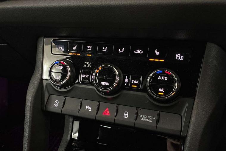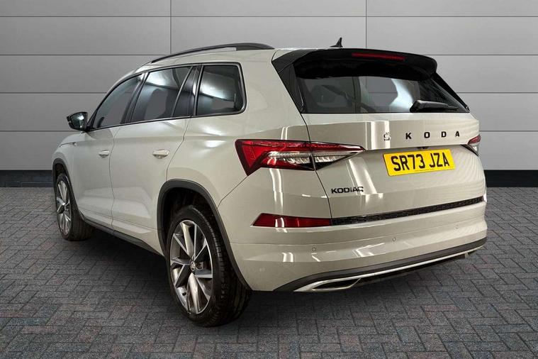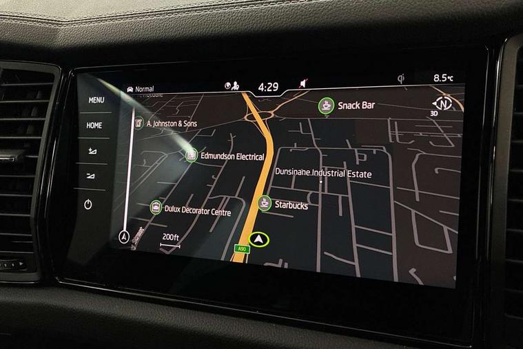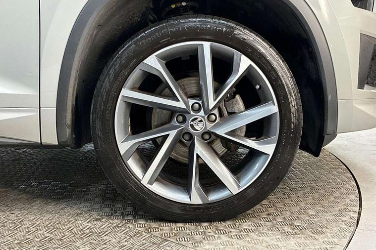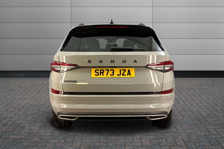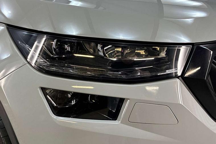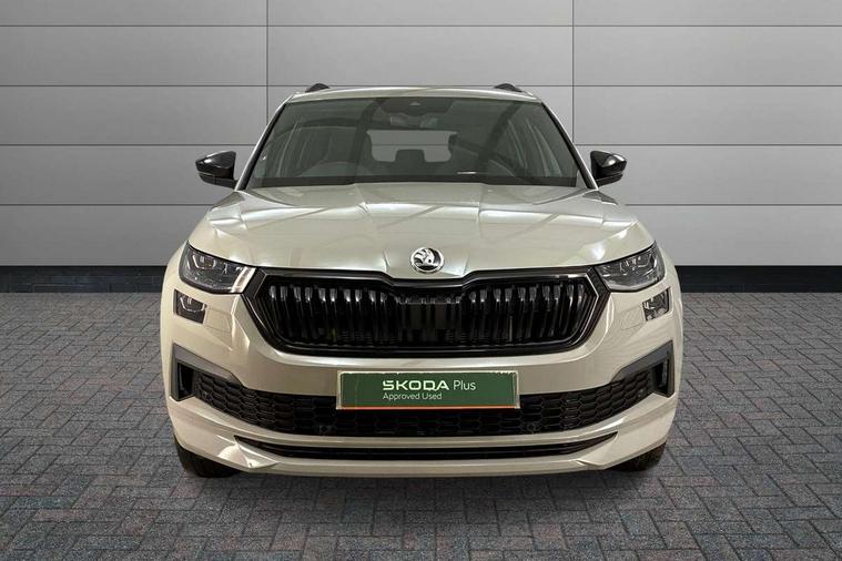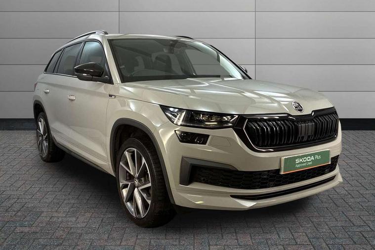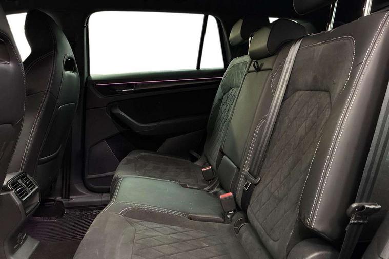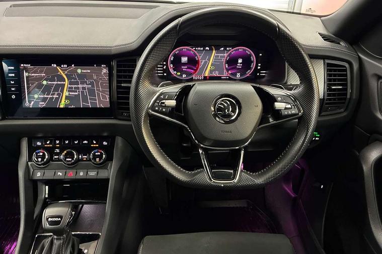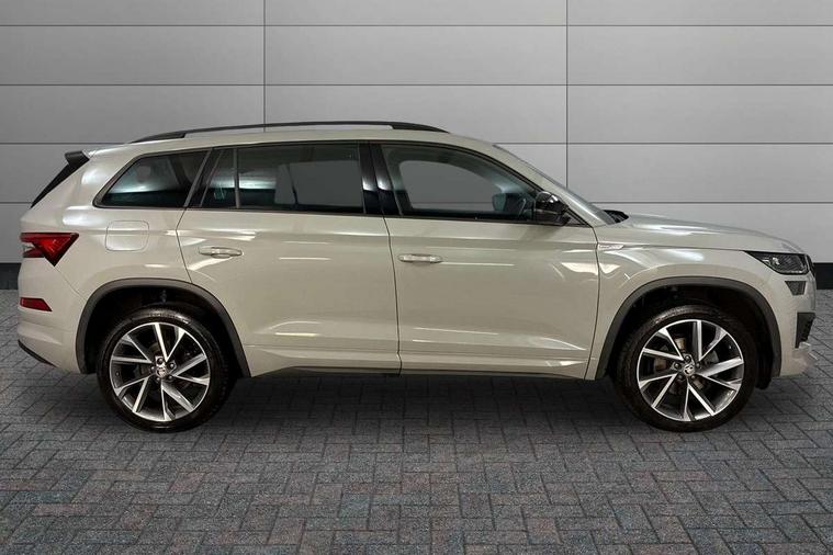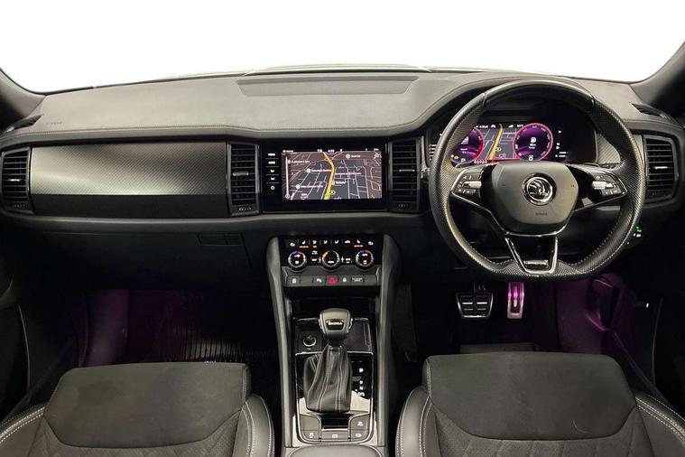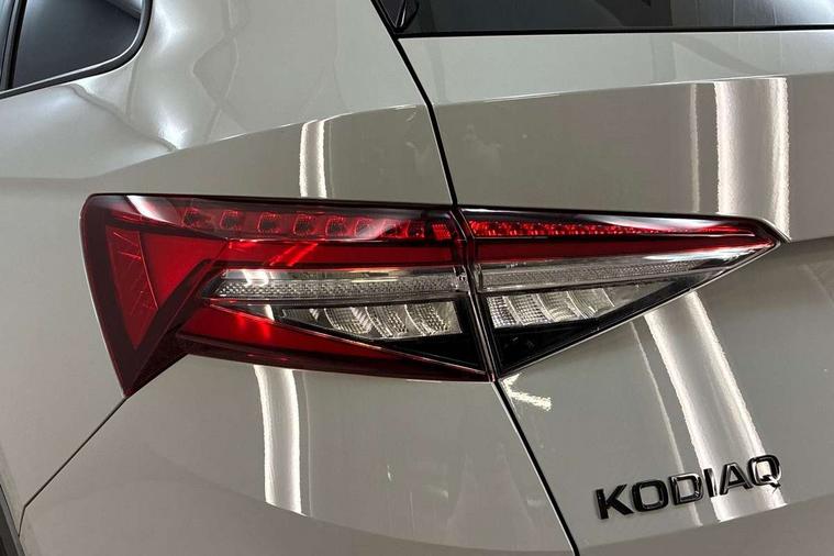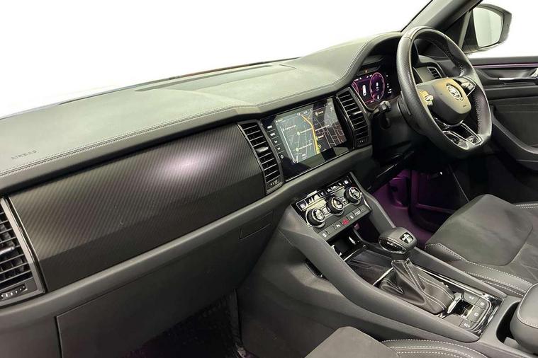 Bluetooth system, Columbus satellite navigation with 9.2" touchscreen, integrated Wi-Fi, web radio, Digital voice enhancement, e call+, ECO Stop/start function, Exterior temperature indicator, Progressive steering, Rear view camera, Smartlink wireless for apple carplay and wired for android auto, Speed limiter, Tailgate unlocking from outside, USB C Port x 2 in front centre console, Virtual Cockpit - 10.25" digital display with additional sports design, Wireless charging, 8 Speakers, DAB Digital radio, Aero front windscreen wipers with intermittent function, Aero rear window wiper, Auto dimming rear view mirror, Black roof rails, Black sports styling including front grille and window surrounds, Black wheel arch surrounds, Body colour bumpers, Body colour door handles, Electric adjustable/heated/folding door mirrors, driver side auto dimming with boarding sports and memory function, Electric front and rear windows, Extended rear spoiler with finlets in gloss black, Front fog lights, Full LED matrix headlights with AFS (adaptive front light system), cornering function and AWL (all weather lighting system), Gloss black door mirrors, Headlight washers, Heated rear window, Invisible tailpipe, LED daytime running lights, LED rear fog light, LED third brake light in rear spoiler, Light assistant (coming/leaving home/tunnel light), Off-road style lower front bumper element, Privacy glass, Rain and light sensors, Rear diffuser, Rear LED lights (high functionality) with welcome effect and dynamic indicators, Rear side wing doors, Safety reflectors on front and rear doors, Sportline badge on front fender, Sports front and rear bumpers including lower rear chrome strip, Tailgate lettering in Black, Window control switches with black trim, 12V socket in boot, 2 rails with 2 hooks, 2 seat bench in 3rd row, 3 seat bench in 2nd row, 3 spoke leather multifunction sports steering wheel with DSG paddles, 4 foldable roof handles with rear coat hooks, 60:40 foldable rear seat with sliding adjustment and backrest angle adjustment, Aluminium pedals, Black roof headlining, Bottle holders in door panel in the 1.5 litre front and 1 litre rear, Cargo storage compartments, Chrome headlight control button, Chrome interior door handles, Coat hooks on B pillar, Covered storage compartment on driver side, Decorative door sill covers, Front and rear door armrest with black adductor trim, Front centre armrest with storage compartment, cup holder and 12V socket, Front courtesy lights, Gear shift lever with chrome frame and black gloss insert, Grey stitching in front and rear armrests and door armrests + door inserts, Height adjustable front headrests, Illuminated glovebox, Illuminated luggage compartment, Isofix child seat fittings in outer rear seats with top tether, Manually adjustable steering column, Microsuede door panels, Net programme in boot (1x horizontal Net, 2x vertical Nets), Overhead glasses storage compartment, Pollen filter, Rear centre armrest with cupholders, Single front passenger seat, Sliding trunk cover, Small Bags on the inner sides of the front backrests, Sports seats, Sunvisors with illuminated vanity mirrors, Three rear height adjustable headrests, Ticket holder on A Pillar, Umbrella in door panel, Variable boot floor, LED Interior light pack - Kodiaq, Auto door release and activation of warning lights in the event of an accident, Driver and front passenger airbag with knee airbag and front passenger airbag deactivation, Electronic parking brake with hill start assist, Emergency rear braking signal, ESC (incl. ABS+MSR+ASR+EDS+HBA+DSR+RBS+MKB), Front assist with autonomous emergency braking, Front side airbags with curtain airbags, Fuel cut off safety device, Height adjustable front 3 point seatbelts + pretensioners, Hill hold control, Rear disc brakes, Safety vest holder in door, Seat belt reminder for all seats, Three point rear seat belts, Two tone horn, Tyre pressure monitor, Alarm with interior monitoring and tilt sensor with safe function, Anti-theft wheel bolts, Immobiliser, Keyless entry and start system (KESSY), Remote central locking with 2 keys, Black air vent surround, Carbon finish dashboard and door inserts, Grey stitching in dashboard, 20" Vega Anthracite alloy wheels, Temporary spare wheel (space saver),