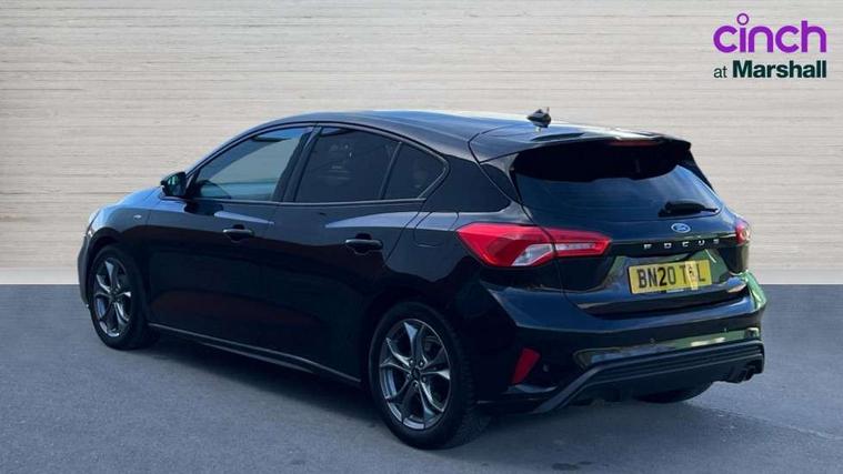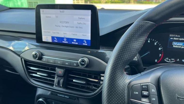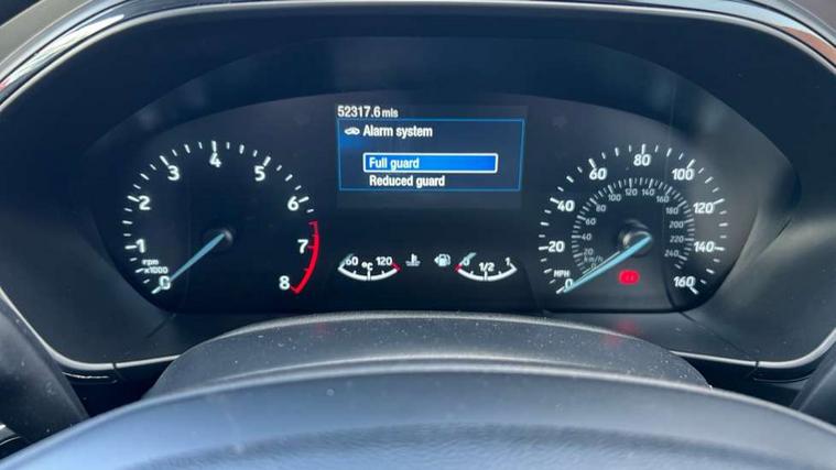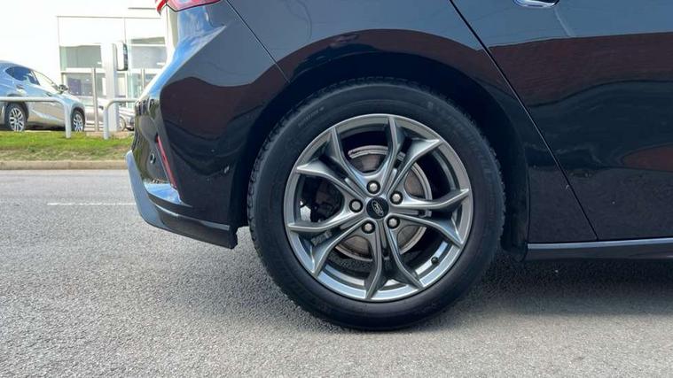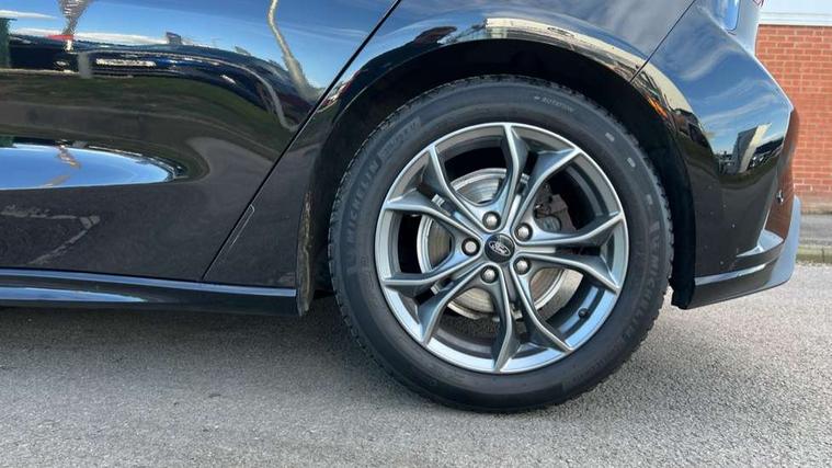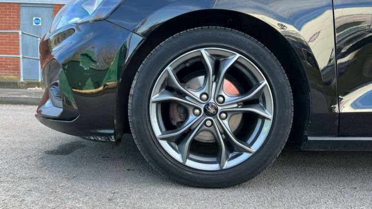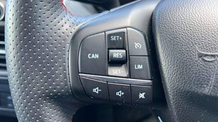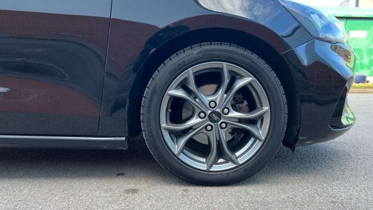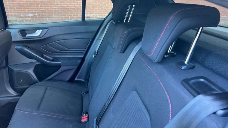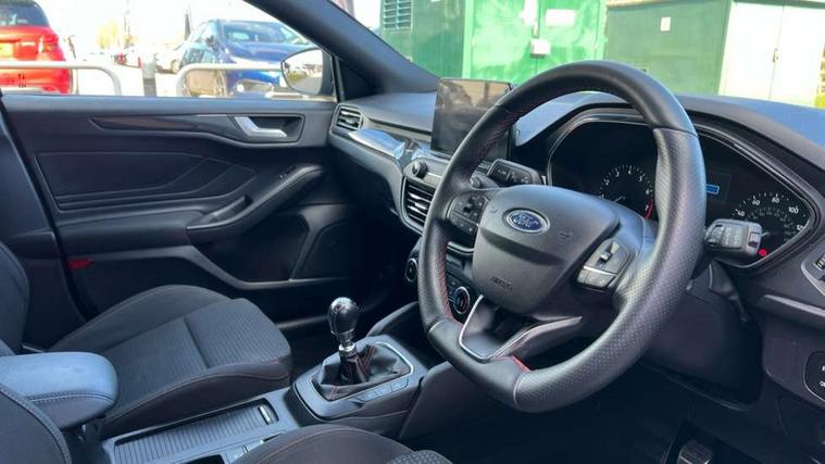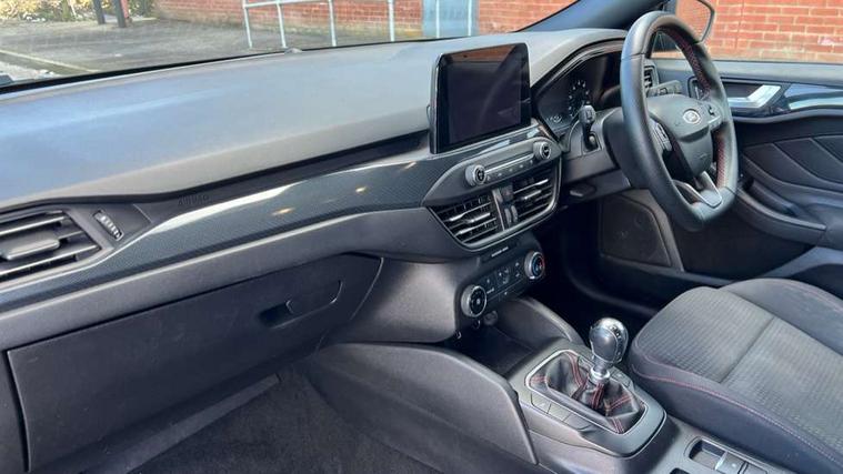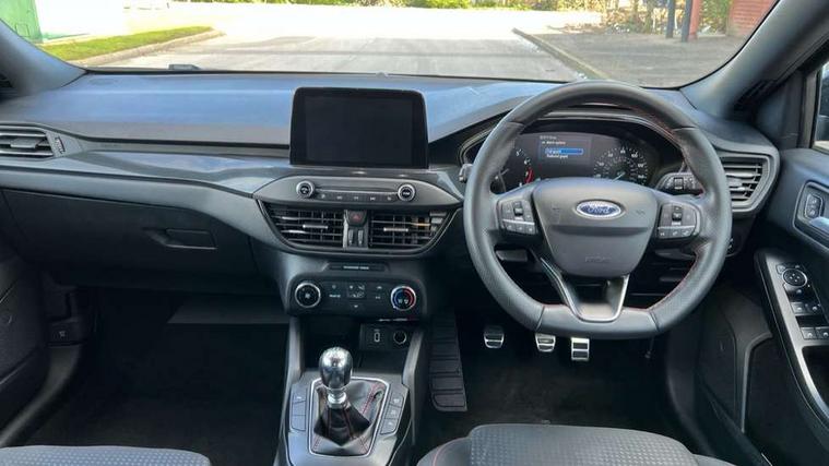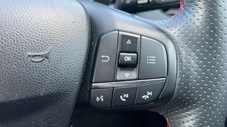 Bluetooth system, Digital clock, Easy fuel capless refuelling system, Eco mode, Ford pass connect, Ford SYNC 3 with 8" TFT touchscreen, and app link Android auto/Apple carplay, Intelligent speed assist, Lane keeping aid with lane departure warning, PAS, Selectable drive mode, Trip computer, Sports tuned suspension, 6 speakers, Aux input, 'Quickclear' heated windscreen/heated washer jets, Auto headlamps (on/off), Body colour large rear spoiler, Body colour side skirt, Body coloured bumpers, Body coloured door handles, Body coloured electrically operated and heated door mirrors with side indicators, Electrically operated front and rear windows with one touch opening and closing, Front variable intermittent wipers with electric wash, Halogen reflector headlamps, Heated rear window, LED daytime running lamp, LED front fog lamps with cornering function, Polished twin tailpipe, ST-Line upper and lower grille with full body styling kit and wing badges, Tailgate wash/wipe, 3 spoke flat bottomed leather steering wheel with red stitching, 60/40 split back and cushion rear seats with 2 height adjustable headrests, Alloy finish pedals, Aluminium gear knob, Centre console with armrest, Cloth upholstery with red stitching, Dark headliner, Driver's lumbar support, Front floor mats, Height adjustable front headrests, Isofix child seat preparation, Manual air conditioning, Reach + rake adjustable steering column, Rear centre headrest, ABS+Electronic Brake force Distribution, Auto hold function, Driver airbag, Electronic parking brake, Electronic stability control, Front and rear seatbelt reminder, Front inertia reel height adjustable seatbelts with pre-tensioners, Front passenger airbag, Front side airbags, Hill start assist, Passenger airbag deactivate switch, Post collision braking, Pre collision assist with autonomous emergency braking and pedestrian/cyclist detection, Side curtain airbags, Three rear inertia reel lap/diagonal seatbelts, Tyre pressure monitoring system, Keyless start with 'Ford Power' starter button, MyKey system, Remote central locking & engine immobiliser, Thatcham category 1 alarm, Contrast stitching - Red, 17" 5x2 spoke alloy wheels with rock metallic finish, Mini steel spare wheel,