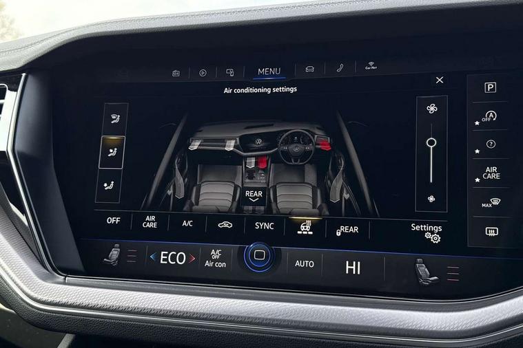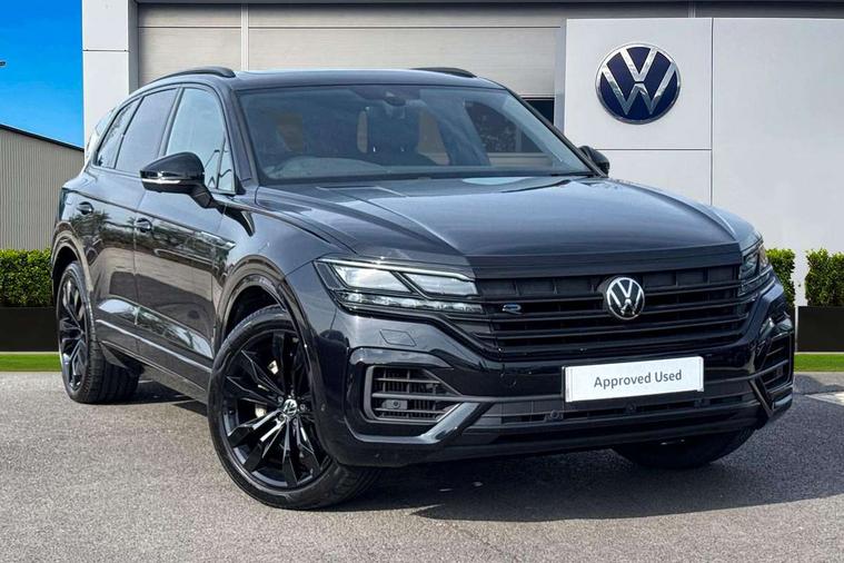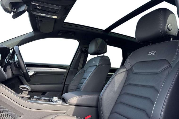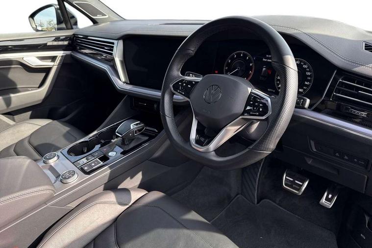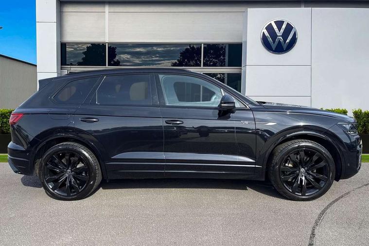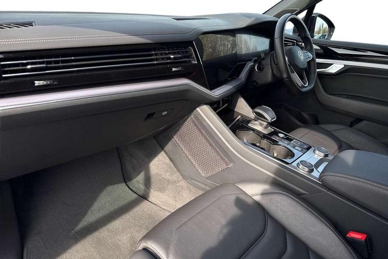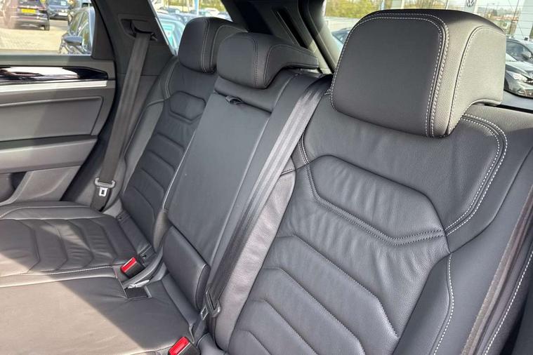 2D/3D map view, ACC - Adaptive cruise control with front assist, forward collision warning, distance monitoring, city emergency brake and speed limiter, Apple car play/Android Auto, Audible and visual fatigue detection system, Bluetooth hands free telephone connection, Car information display, Drive select with Damper control, Driver alert system, Driver profile selection, Dynamic road sign display camera controlled system with visual warning for traffic and road signs, eCall emergency system, Fully electric tailgate + keyless entry and start, Instrument cluster, MirrorLink, Multifunction camera with lane assist, Multifunction computer premium with 7" colour display, One touch indicators with repeat function, Service interval indicator, Speed sensitive power steering, Start/stop system with regenerative braking, Tailgate power latch, Think blue trainer driver tips and journey analysis, Traffic sign recognition, Voice control system, Wireless Smartphone charger, Torsen limited slip differential, DAB Digital radio, Dynamic navigation based on TMC+, Gesture control for infotainment system, Multi device interface (MDI) with illuminated USB-C connection, Music playback - MP3, WMA and AAC files, SD card slot, Simultaneous pairing of 2 compatible mobile devices, SMS functionality - read, compose and send SMS messages using touch-screen display, Title and cover art display, Volkswagen media control, Adaptive low beam for urban and motorway use, Auto dimming rear view mirror, Automatic coming/leaving home lighting function, Automatic headlights, Black anodised roof rails, Black door mirrors, Black rear diffuser, Black side window surrounds, Black upper and lower grille louvres extending into headlights and radiator grille, Body colour door handles, Body coloured wheel arches, C signature gloss black front air intake, Chromed tailpipe on the left and right integrated in the bumper with trapezoid design, Dusk sensor, Dynamic headlight range control, Electric front tilt/slide panoramic sunroof and fixed rear sunroof, Electrically power adjustable, heated, folding, auto dimming, front passenger exterior door mirror lowering function, Front and rear electric windows, Galvanised body, Gloss black finish B pillar, Gloss black rear diffuser, Headlight washers, Heat insulating darkened glass in side and rear windows, Heated windscreen washer jets, IQ.Light-LED matrix headlight, daytime running light with dynamic cornering light and indicator, LED 3rd brake light, LED rear fog light, LED rear number plate lights, Plastic scuff plates in door apertures, Poor weather light, Puddle lights, Rain sensor, Rear side wing doors, Rear wiper, 12V socket in front and rear centre console and boot, 2 Coat hooks on B pillar, 3 rear head restraints, 3 seat bench in 2nd row, 3 spoke sport heated leather multi-function sports steering wheel with gear shift paddles - generation 2, 4 way adjustable front head restraints, 4 way electric lumbar support for driver and front passenger, 4 zone climate control, 40:20:40 split folding slide/recline rear seat, B pillar vents, Black lower edge of door extending sills, Branded points of interest, Double sun visor for drivier and passenger with LED illuminated vanity mirrors, Electric luggage compartment cover, Folding rear centre armrest with 2 cupholders, Front + rear carpet mats, Front centre armrest with storage box, Gear shift indicator, Height/reach adjust steering wheel, Illuminated air conditioned glovebox, Isofix preparation for 2 rear child seats, Jack and tool kit, Leather trimmed gear knob with gloss black inlay/aluminum trim, Leatherette door trim, LED luggage compartment lighting, Load through provision, Luggage compartment with load lashing rings, Plastic loading edge protection, Rear seat remote release levers, Single front passenger seat, Soul black headlining, Stainless steel pedals, Innovision cockpit pack - Touareg, 3 point front seatbelts with pre-tensioners, ABS, Active bonnet, Automatic post collision braking system, Curtain airbags, Driver/Front Passenger airbags, EBD + Brake Assist, EDL, Electronic parking brake with auto hold, ESC with ASR, Front seat side impact airbags, Hill descent control, Hill start assist, Passenger airbag deactivate switch, Seatbelt warning lamp and buzzer, Three 3 point rear seatbelts, Two tone horn, Volkswagen roadside assistance, Warning triangle and first aid kit, Alarm with interior monitoring in cab, backup horn and towing protection, Child security locks for front and rear doors, Electronic engine immobiliser, Remote central locking, Black decorative trims on the side windows, High gloss black centre console,