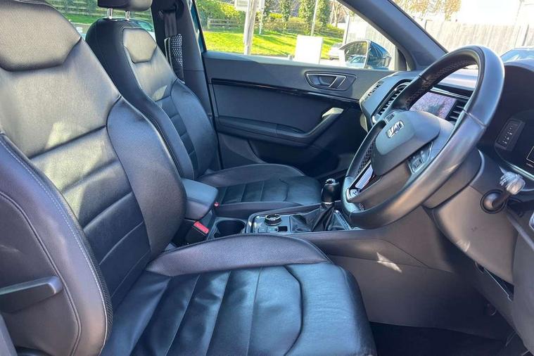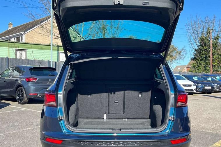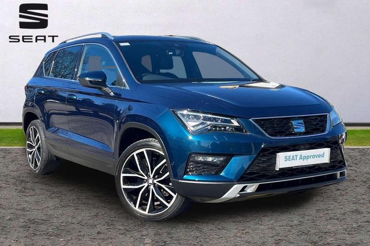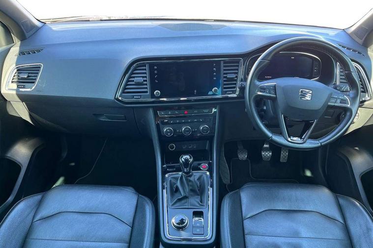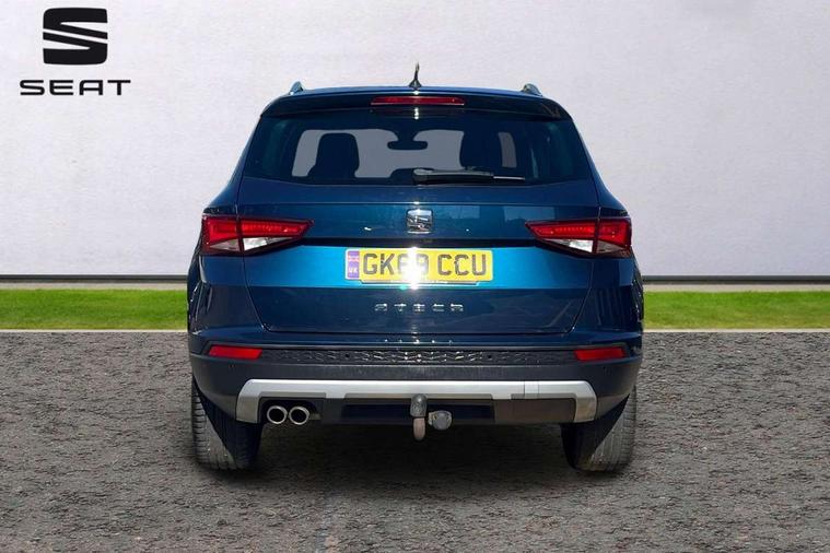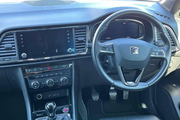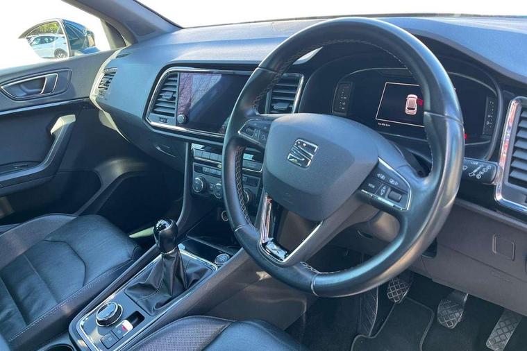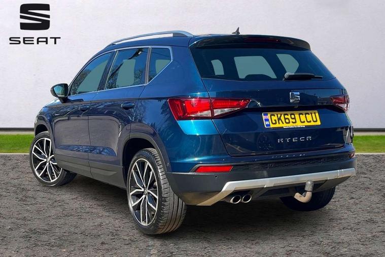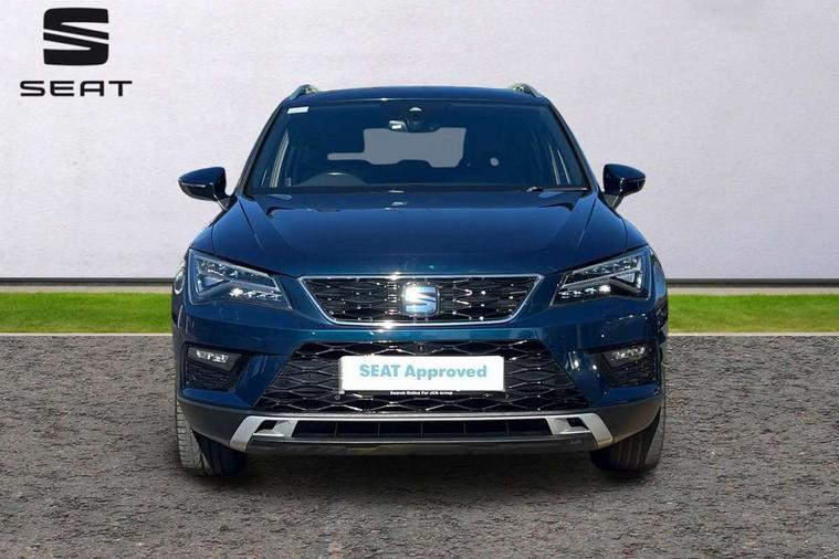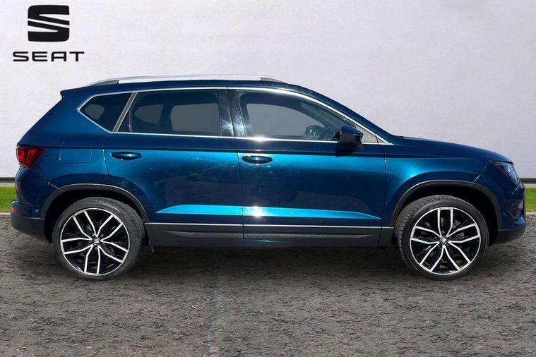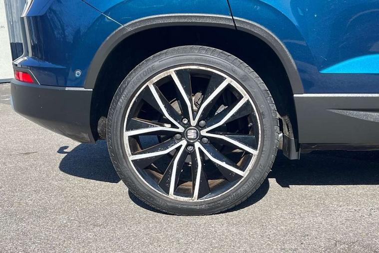 'Lights On' Reminder warning buzzer, 8.0" colour touchscreen with proximity sensor, Adaptive cruise control, Digital clock, Digital cockpit, Driver alert system, Electric tailgate with virtual pedal, Front assist city emergency braking and pedestrian protection, Full Link Smartphone Integration with Mirror Link, Apple Car Play, Google Android Auto, Low fuel warning light, Multi function display, Outside temperature gauge, Rear view camera, Remote fuel flap release, RPM counter, Satellite navigation system, SEAT drive profile with driving experience button, SEAT logo boot release, Self parking functionality (includes front and rear parking sensors), Top view camera, Trip computer, Voice control system, Wash water level indicator, Comfort suspension, XDS electronic differential lock, 2 USB ports, 8 speakers, AM/FM radio, DAB digital audio broadcast, High resolution colour driver display, SD card slot, SEAT USB media cable, Steering wheel mounted audio/phone controls, Aluminium front door sills, Armrest with air outlet in rear, Auto dimming rear view mirror, Auto headlights with automatic coming and leaving home function, Black wheel arch extensions, Body colour bumpers, Body colour door handles, Body colour door mirrors, Chrome front grille frame, Chrome roof rails, Chrome side window trim, Dark tinted rear windows, Door mirrors with welcome light silhouette, Electric adjustable/heated/folding door mirrors, Frameless interior mirror, Front and rear electric windows, Front grille in glossy black, Full LED headlights, Headlight washers, Heated windscreen, Illuminated aluminium front door sill with trim logo, LED daytime running lights, LED front fog lights, Rear fog lights, Rear LED tail lights, Rear wash/wipe, Twin chromed exhaust pipes, Visible dual exhaust pipes, 12v socket in front, 4 Lashing eyes in boot, 60/40 split folding rear seat, Adjustable front armrest with storage compartment, Ambient spot lighting and front footwell illumination, Black roof lining, Driver and passenger seats, height-adjustable, with lumbar adjustment and height-adjustable headrests, Driver and passenger sun visor, covered and illuminated mirror, driver sun visor with card holder, Dual zone climate control, Front courtesy lights, Front cupholders, Front reading lights, Front seat back storage pockets, Gear shift indicator, Heated front seats, Illuminated boot, Illuminated glovebox, Instrument lighting with brightness control, ISOFIX points in outer rear seats with top tether anchorage points, Leather steering wheel and gear knob, Leather upholstery with front sports seats, Multicoloured ambient lighting with LED interior illumination, Rear armrest and easy back seat release mechanism from boot, Rear reading lights, Storage box under drivers seat, Advanced Driving Assistance Pack - Ateca Xcellence, Convenience pack - Ateca, Navigation system pack - Ateca, Winter Pack - Ateca, 3x3 point rear seatbelts, ABS, Active front headrests, Automatic post collision braking, Driver/Front Passenger airbags, Drivers knee airbag, Electronic parking brake with auto hold, Electronic stability control, ESP+EBA, Front and rear seatbelt reminder, Front passenger airbag deactivation, Front side airbags, Hill hold control, Tiredness recognition system, Traction control, Twin curtain airbags, Tyre pressure monitoring system, 2 folding remote keys with window open/close function, Immobiliser, Keyless entry and go and connectivity hub with wireless charger, Locking wheel bolts, Remote central locking, Volumetric alarm with back up horn, Chrome interior detailing, 19" Exclusive machined bi-colour alloy wheels,