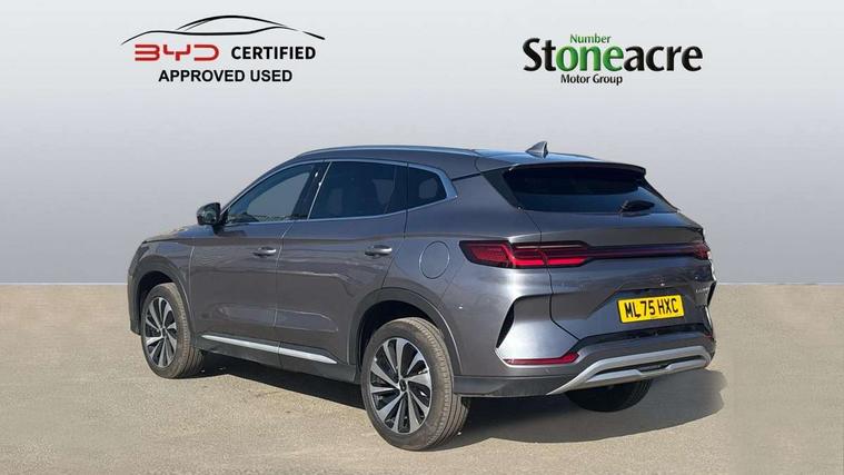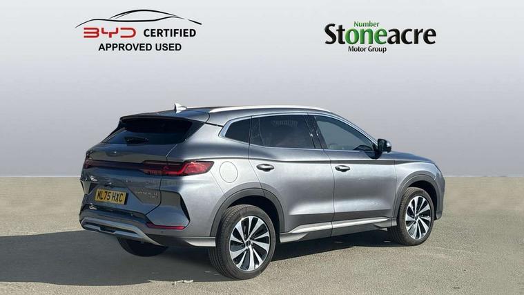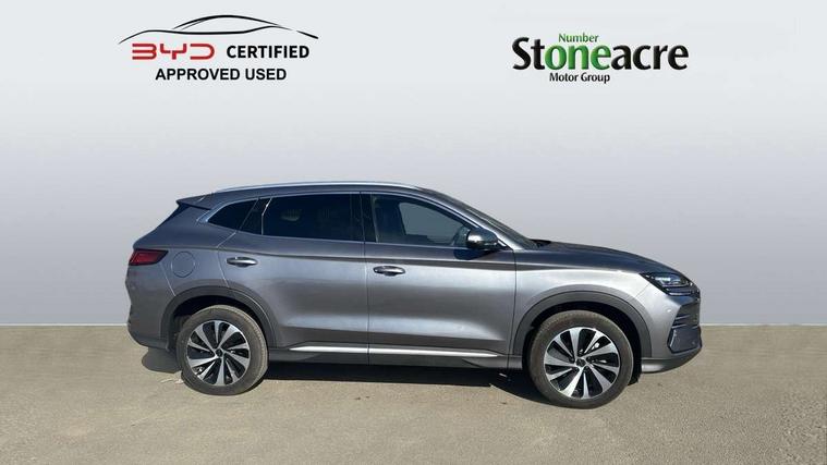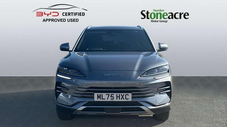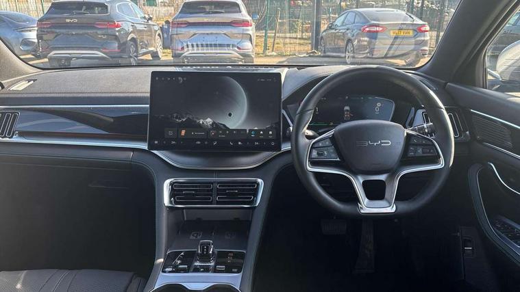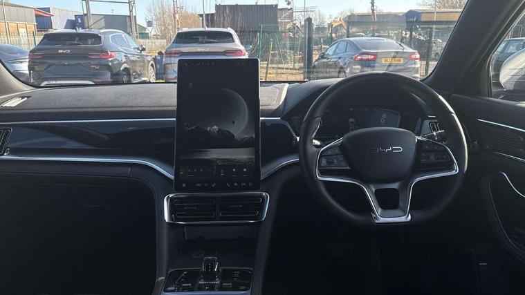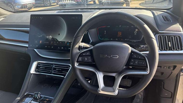 12.3" TFT full LCD instrument panel, 360 camera, Adaptive Cruise Control (ACC) and Intelligent Cruise Control (ICC), Automatic vehicle hold, Blind spot detection, BYD voice control assistant "Hi, BYD", Controller Deceleration Parking (CDP), Drive mode select (Eco, normal, sport, snow), e-Call (emergency call), Electric tailgate release, Emergency Lane Keeping Assist (ELKA), Forward collision warning, Front and rear parking sensors, Front cross traffic alert and front cross traffic brake, Head up Display, Indirect driver fatigue management, Intelligent Speed Limit Control (ISLC), Keyless system entry and start, Lane change assist, Lane Departure Assistant (LDA) and Lane Departure Warning (LDW), Lane departure prevention, Lane keep assist, PAS, Predictive collision warning, Rear collision warning, Rear cross traffic alert and rear cross traffic brake, Rollover Control System (RMI), Smartphone wireless charging, 2 x 15W, Traffic sign recognition (TSR), Vehicle-to-Load (V2L) function, 11kW on board charger, Home charging cable 3pin, Mode 3 Type 2 charging cable (3 phase), 15.6" Electrically rotatable touchscreen, FM/DAB+ radio, Front USB ports, 1 x 18W Type C, 1 x 60W Type C, Infinity sound system with 10 speakers, Rear USB ports, 2 x 18W Type C, Aluminium roof rails, Auto dimming interior rear view mirror, Auto headlamps (on/off), Dynamic welcome lights, Electric folding and heated door mirrors, Emergency tow hook, Exterior mirror footlights, Follow me home headlights (The headlights turned on in advance and delayed off function), Front windscreen, UV protection, thermal insulation and sound proofing, High beam assist, LED 3rd brake light, LED daytime running lights, LED Headlights, LED taillights, One touch electric front/rear windows with pinch protection, Panoramic sunroof with anti-pinch sensor and electrically adjustable sunshade, Rain sensor windscreen wipers, Rear fog lights, Rear side wing doors, Rear window and rear windscreen with tinted glass, Rear wiper, 12V power outlet, 3 seat bench in 2nd row, 8 way electrically adjustable drivers seat, Adjustable rear headrests, Boot parcel shelf, Driver and passenger sunvisors with illuminated vanity mirrors, Driver seat memory function, Front centre armrest with 2 cupholders, Front LED reading lights, Front passenger seat with 4-way electric adjustment, Front seat footlights, Heat pump, Heated front seats, Heated steering wheel, Integrated headrest in front seats, ISOFIX and i-Size for front passenger and outer rear seats, LED front door lights, Nylon floor mats, PM2.5 air filter, PM2.5 air purification system, Rear air vents, Rear armrest with 2 cupholders, Rear side LED reading lights, Rhythm-reactive multi-colour ambient lighting, Single front passenger seat, Split folding rear seats - 40/60, Vegan leather multifunction steering wheel, Vegan leather upholstery, Ventilated front seats, 3x3 point rear seatbelts, ABS/EBD, Automatic emergency braking system, Brake override system (BOS), Child presence detection, Comfort stop, Door open warning, Driver airbag, Electric parking brake, Force limiting pre-tensioned front seat belts, Front centre airbag, Front passenger airbag, Front passenger airbag deactivation, Front side airbags, Hill descent control, Hill hold control, Hydraulic Brake Assist (HBA), Hydraulic brake boost, Mechanical child safety lock, Rear middle seat force limiting seat belt, Rear seat belt pretensioners, Reflective vest, Side curtain airbags, Traction control system (TCS), Tyre pressure monitoring system (TPMS), Vehicle Dynamics Control System (VDC), Warning triangle, 2 x Smart keys, Alarm and immobiliser (Thatcham category 1), Automatic door locking, Locking wheel nuts, 19" Bi-colour alloy wheels, Tyre nut covers remover, Tyre repair kit,