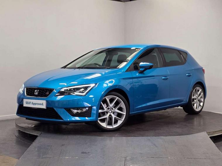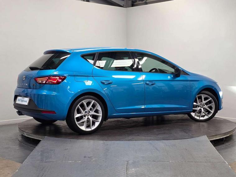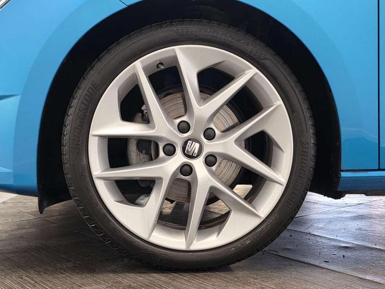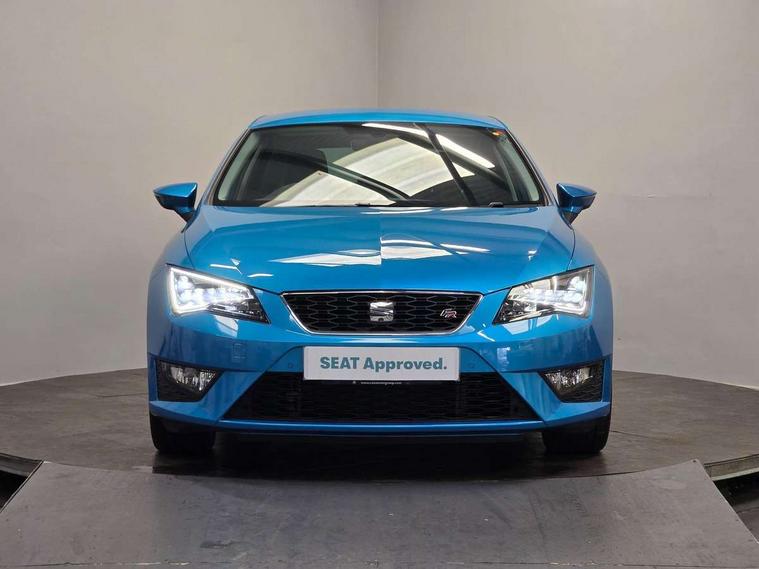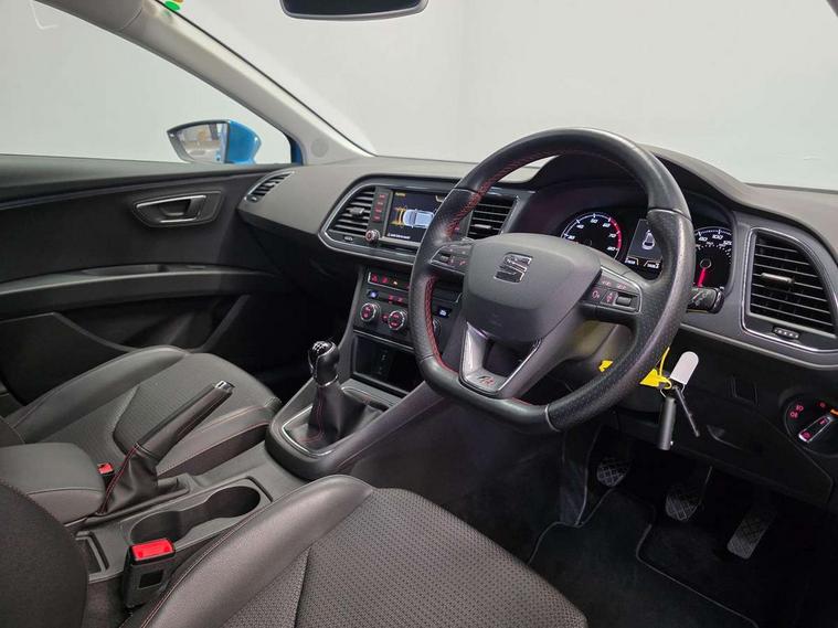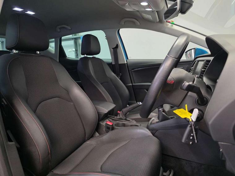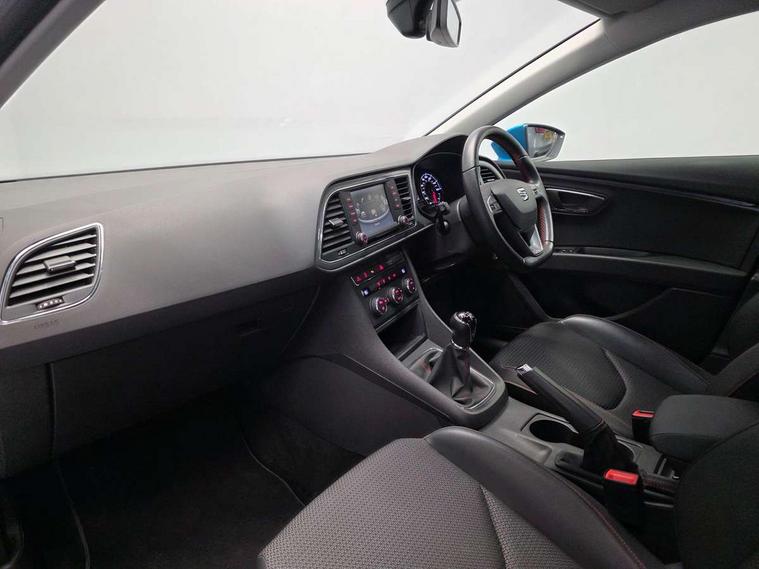 'Lights On' Reminder warning buzzer, 6.5" colour touchscreen with proximity sensor, Bluetooth Handsfree Phone Connection, Digital clock and outside temperature display, Low fuel warning light, Multi function display, Rear parking sensor, Remote fuel flap release, SEAT Drive profile, SEAT logo boot release, Service interval indicator, Touch screen display, Trip computer, Sports suspension, XDS electronic differential lock, Auxiliary input socket, Bluetooth audio streaming, DAB Digital radio, iPod connection, Radio/CD + MP3, SD card slot, Steering wheel mounted audio/phone controls, USB port, Aluminium front door sills, Body colour door handles, Body coloured bumpers, Chromed centre radiator grille surround, Cornering front fog lights, Dark tinted rear windows, Electric adjustable/heated/folding door mirrors, Electric front/rear windows with one touch/auto up/down, Electric headlamp adjustment, LED indicators in door mirrors, Rear wash/wipe, Reverse activated kerb-view adjustment on passenger's door mirror, Tinted windows, 12v power point in centre console, 3 height adjustable rear headrests, Active head restraints, Additional heating and ventilation outlet in rear of centre console, Ambient lighting, Driver seat height/lumbar adjust, Driver/passenger sunvisors with illuminated vanity mirrors, Dual zone climate control, Dust/pollen filter, Front adjustable head restraints, Front armrest with storage box, Front cupholders x 2, Front map reading lights, Front seat and rear pockets, Front sports seats, Front/rear floor mats, Height/reach adjust steering wheel, Illuminated glovebox, Leather handbrake, Luggage tie-down hooks, Passenger seat height adjuster, Passenger seat lumbar adjust, Perforated leather steering wheel with red stitching + gear knob, Rear reading lights, Rear top tether child seat ISOFIX attachment, Split folding rear seat, Full LED headlight pack - Leon, 3 point seatbelts on all rear seats, ABS + traction control, Child proof door locks, Collision mitigation braking system, Curtain airbags, Driver/Front Passenger airbags, Drivers knee airbag, ESP+EBA, Front seatbelt pretensioners, Front Seatbelt warning, Front side airbags, Hill hold control, Manual passenger airbag deactivation function, Tyre pressure monitoring system, Engine immobiliser, Locking wheel bolts, Remote central locking + deadlocks, Second remote key, Volumetric alarm with back up horn, Chrome interior trim,