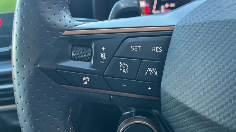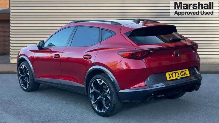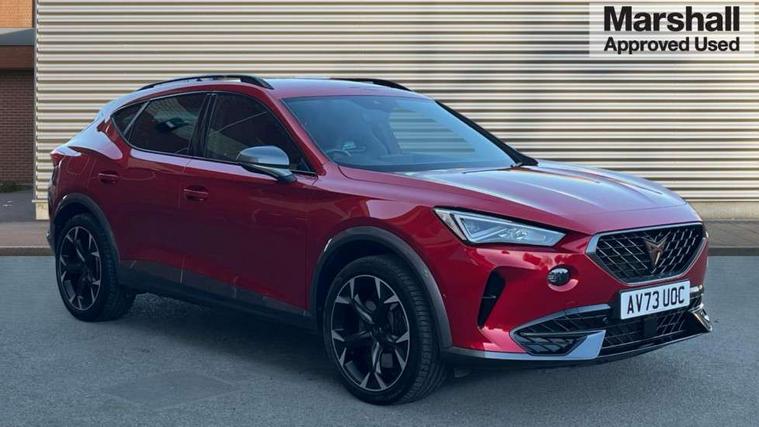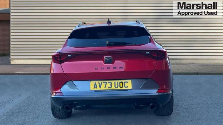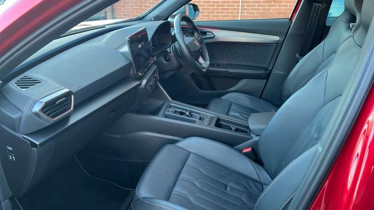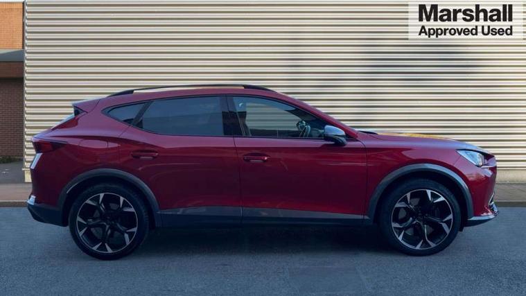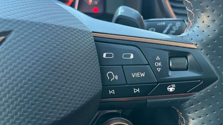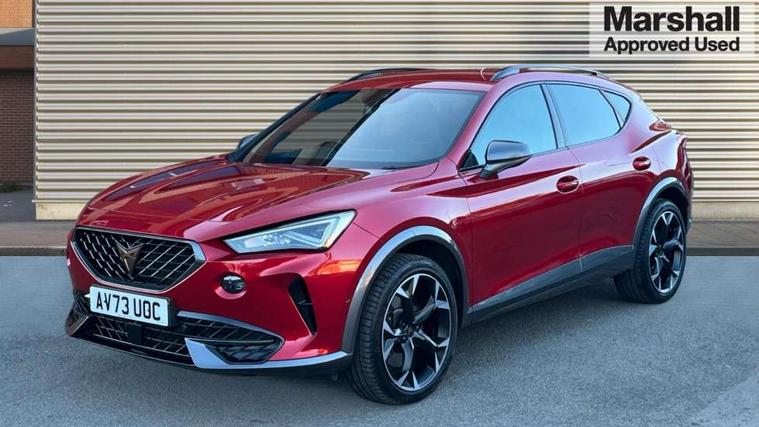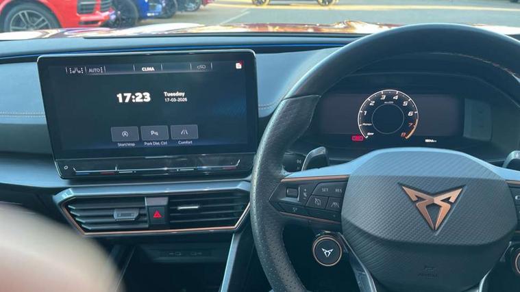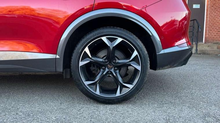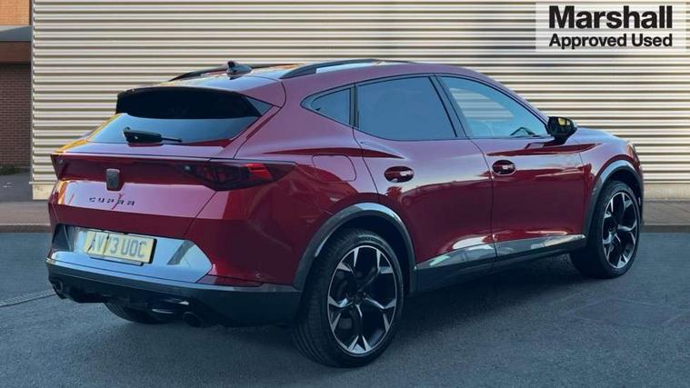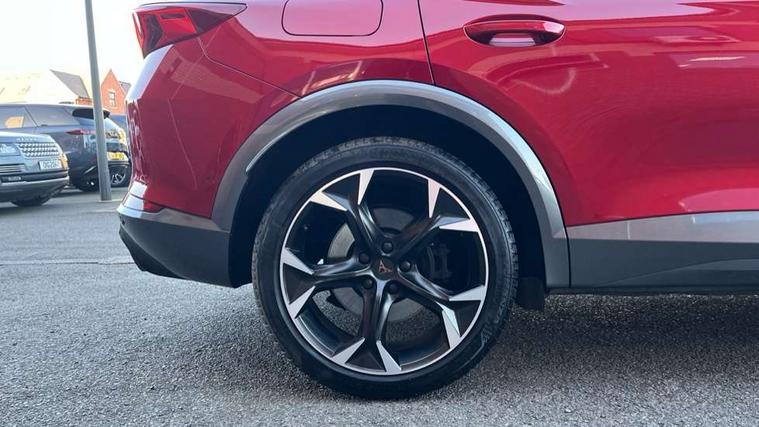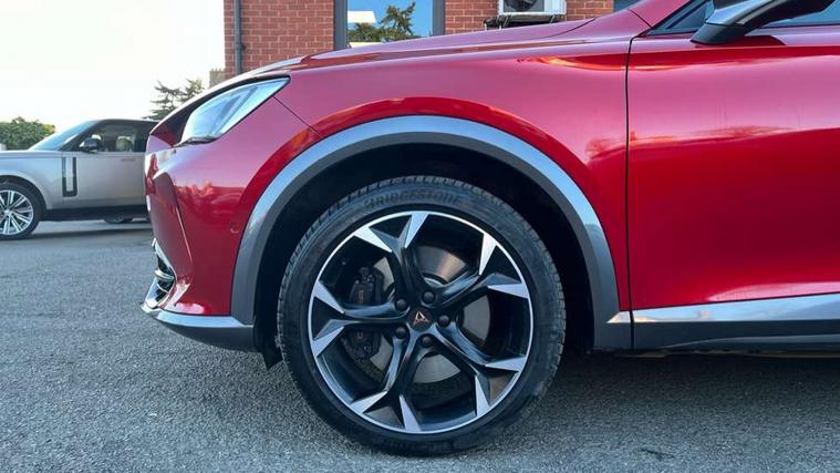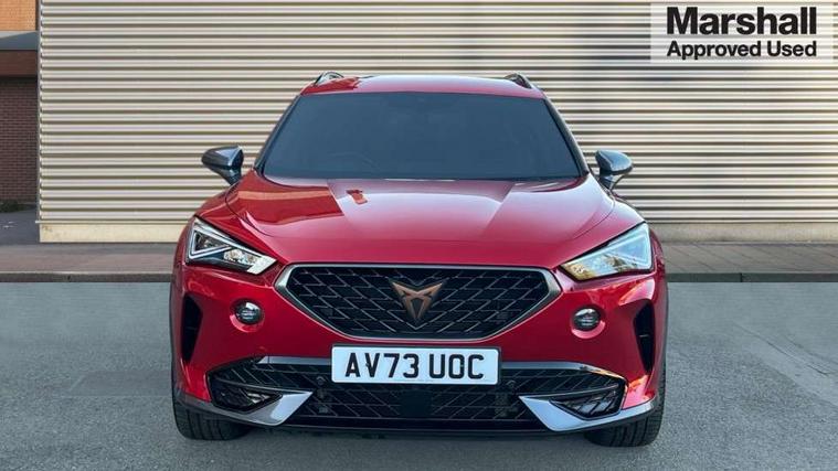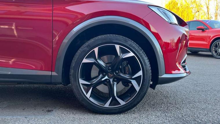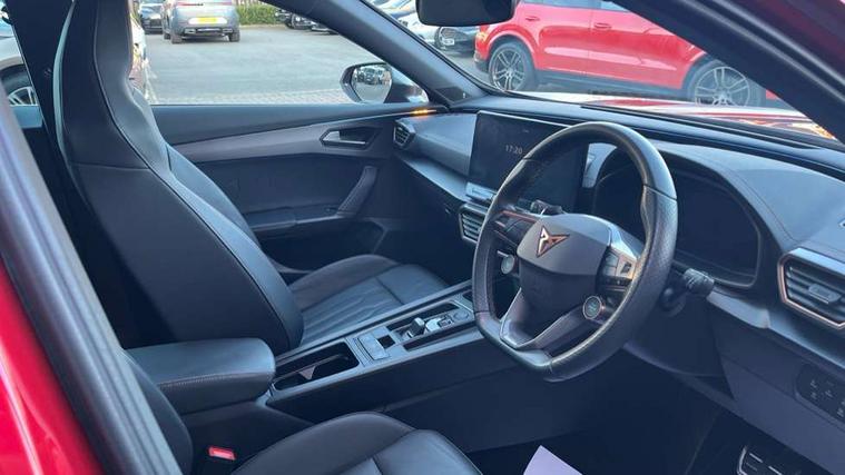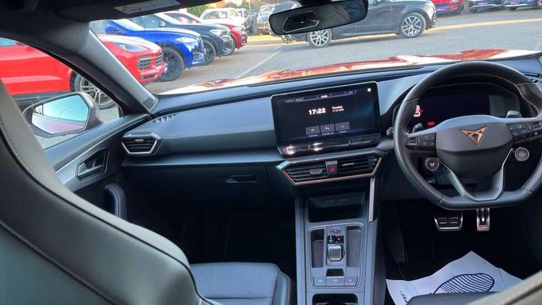 Digital cockpit and configurable dashboard, Driver alert system, Dynamic chassis control with driving profile selection (Comfort, Sport, CUPRA, Individual), Forward collision warning with automatic braking, Lane assist, Navigation system with 12'' Touchscreen Display, Park assist (inc front/rear parking sensors), Predictive adaptive cruise control with speed limiter, RPM, trip computer, outside temp gauge, instrument light brightness, low fuel warning light, lights on reminder, gearshift indicator, Service interval indicator, Speed sensitive power steering, Start/stop system with regenerative braking, Virtual pedal and electric tailgate, Voice control system, Wired Android Auto, Wireless apple carplay, Wireless phone charger, Electronic locking differential and dynamic traction support, Sports suspension with front shock absoption, 2 front and 2 rear USB type C sockets, Auxiliary input socket, DAB radio, Auto dimming rear view mirror, Body colour door handles, Body coloured bumpers, Dark grey wing mirror, Daytime running light with automatic headlight control and coming home feature, Dynamic headlight range control, Electric front/rear windows, Electrically adjustable heated and folding door mirrors with memory function, Front fog lamps with cornering function, Gloss black roof rails and window surrounds, LED Headlights, LED Taillights with dynamic indicator, Rain sensing wipers, Rear diffuser with twin exhaust pipe on each side, Rear side wing doors, Rear wash/wipe, Sports bumpers, Third brake light, Tinted rear windows, VZ logo rear badging, Welcome lights, 12v power supply in centre console, 12V socket, 12v socket in loadspace, 2 front and 2 rear reading lights, 230V socket, 3 seat bench in 2nd row, 60/40 split rear bench seat with armrest and mechanical seat release, Black headlining, Cupra sports pedals, Dust/pollen filter, Front and rear head restraints, Front centre armrest, Height/reach adjust steering wheel, Illuminated interior front door sills, Illuminated sunvisor with mirror, Isofix, Leather heated multi-function sports steering wheel with start stop, CUPRA mode button and gear shift paddles, Luggage tie-down hooks, Single front passenger seat, Three zone climate control with control panel in rear, Variable luggage/load compartment floor, Wraparound lighting, Genuine Nappa leather Pack - Cupra, Safety and driving pack (XL) - Formentor, 3 point seatbelts on all rear seats, ABS, Brake control system - ESC and brake booster, Child proof door locks, Driver and front passenger airbags with front passenger airbag de-activation, Electronic parking brake, Front and rear disc brakes, Front side curtain airbags, Hill hold control, Public e-call, Seat belt reminder for front and rear seats, Tyre pressure monitoring system, Anti theft alarm system, Keyless entry and start system (KESSY), Locking wheel bolts, Copper and aluminium interior detailing, 19" 'Exclusive' machined sport matte black and silver alloy wheels, Space saver spare wheel,