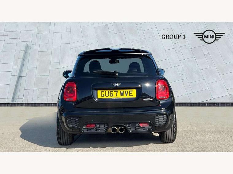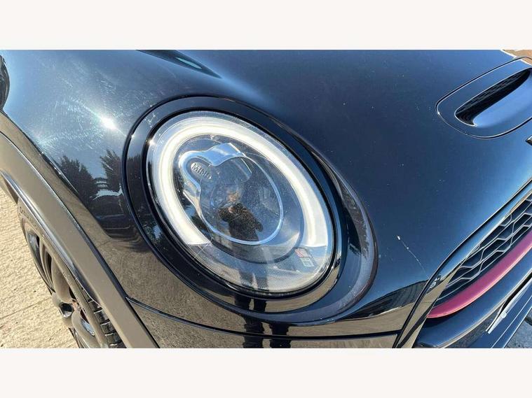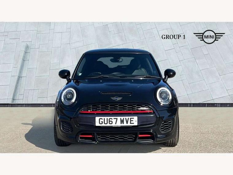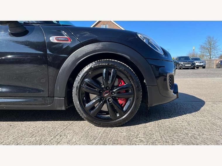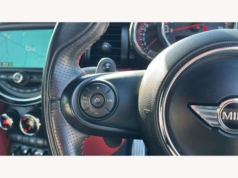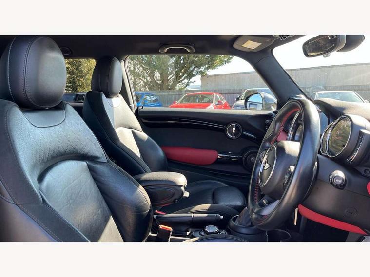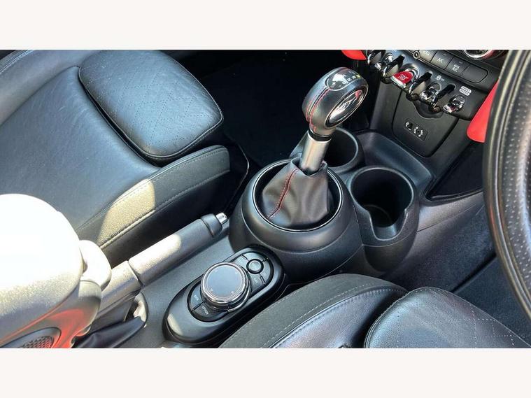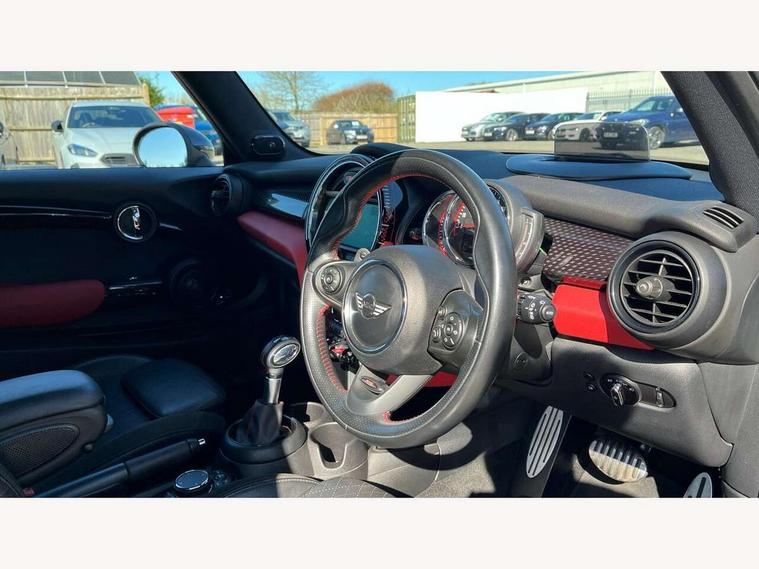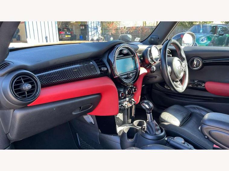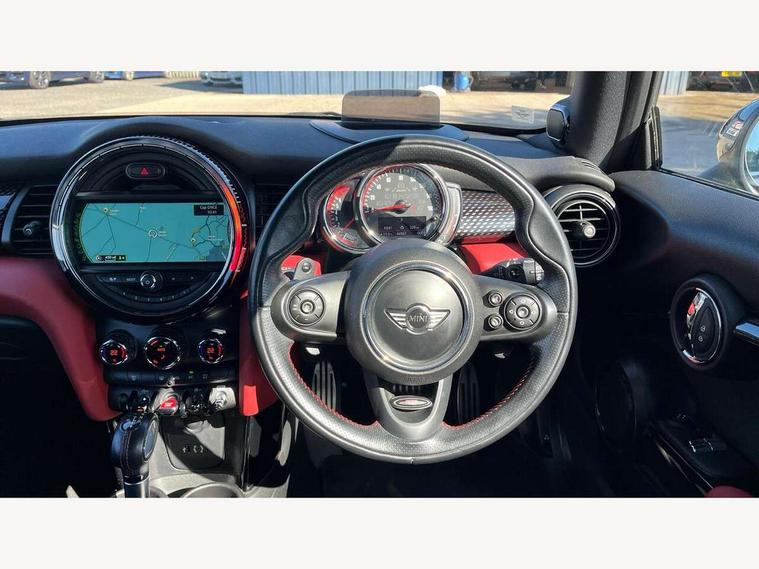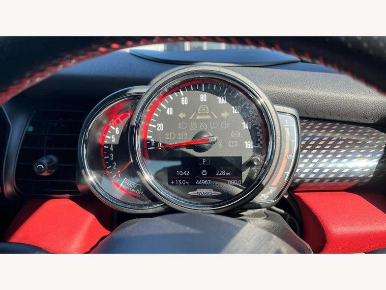 Acoustic seat-belt warning, Brake fluid level warning light, Brake pad wear indicator warning light, DTC - Dynamic traction control, Exterior temperature gauge, Intelligent emergency call, MINI Driving Modes - centre toggle switch to control driving setting (sport, mid and green), MINI TeleServices, Oil level indicator, On board computer, Push button starter, Service interval indicator, Servotronic PAS, Electronic differential lock, Performance Control, Auxiliary input socket, DAB digital radio module, 2 speed wipers+intermittent wipe, Anti dazzle mirror, Anti trapping/one touch open close front windows, Body colour scoop integrated into engine- compartment lid, Body coloured bumpers, Chili red grille bar, Chrome bezels around rear lights and headlights, Chrome door handles, Chrome plated fuel cap, Chrome plated trim on bottom edge of window, Chrome strip on lower grille, Electric front windows, Electrically adjustable door mirrors, Extended wheel arches, Follow me home headlights, Green tinted heat insulating glass, Heated door mirrors/heated windscreen washers, Heated rear window with auto timer, High gloss black tailgate, Honeycomb radiator grille, John Cooper Works roof spoiler, Metal look door sill finishers, Rear wiper, Side scuttles, Twin chromed exhaust pipes, White indicator lights, 2 rear head restraints, 4 boot load lashing points, 6 way manually adjustable passenger seat, 6-way manually adjustable driver's seat, Active carbon filter, Air recirculation system, Anthracite headlining, Auxiliary socket in centre console storage compartment, Centre console storage, Driver's seat height adjuster, Driver/passenger sunvisors, Easy entry seats, Front and rear cupholders, Front head restraints, Front interior light, Front passenger grab handle, Front seat backrest storage nets, Front sports seats, Gear/selector and handbrake in artificial leather, Internal chrome door handles, Isofix child seat preparation, Luggage compartment lighting, Multifunction steering wheel, Passenger seat height adjuster, Reach + rake adjustable steering column, Rear grab handles, Rear storage trays, Split folding rear seats, Storage compartments in doors, Toolkit in luggage compartment, Vanity mirrors, 3 point seatbelts, ABS/EBD, ASC+T, Brake calipers in red, Cornering brake control (CBC), Crash Sensor - activates hazard/interior lighting + unlocks doors, Driver and passenger airbags, Driver/front passenger side airbags, DSC - Dynamic Stability Control, Fuel cut off safety device, Head airbags, Hill start assist, Manual passenger airbag deactivation function, Seatbelt pretensioners, Tyre pressure warning, Ventilated front disc brakes, Drive away door locking, Locking wheel bolts, Remote central locking/doors+fuel cap+tailgate, Second remote key, Thatcham category 1 alarm + immobiliser,