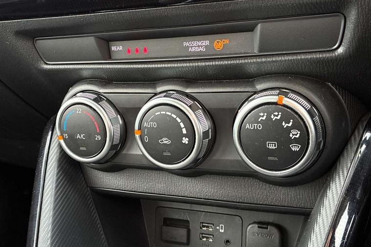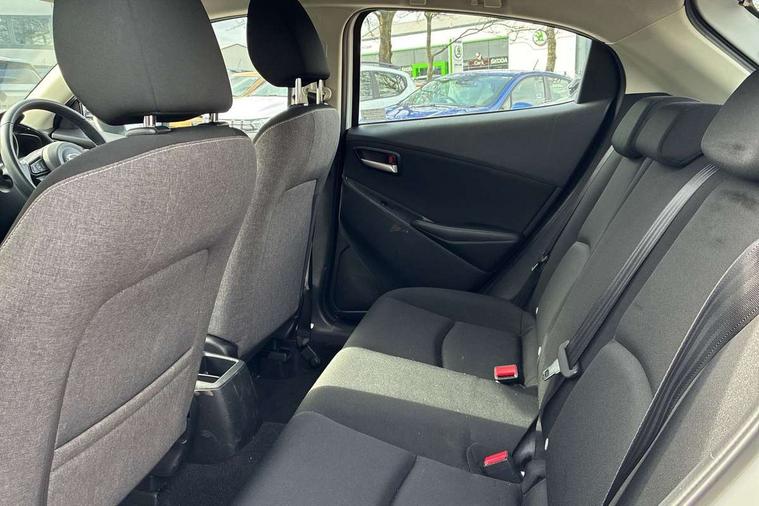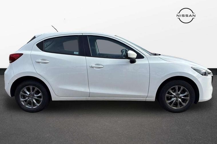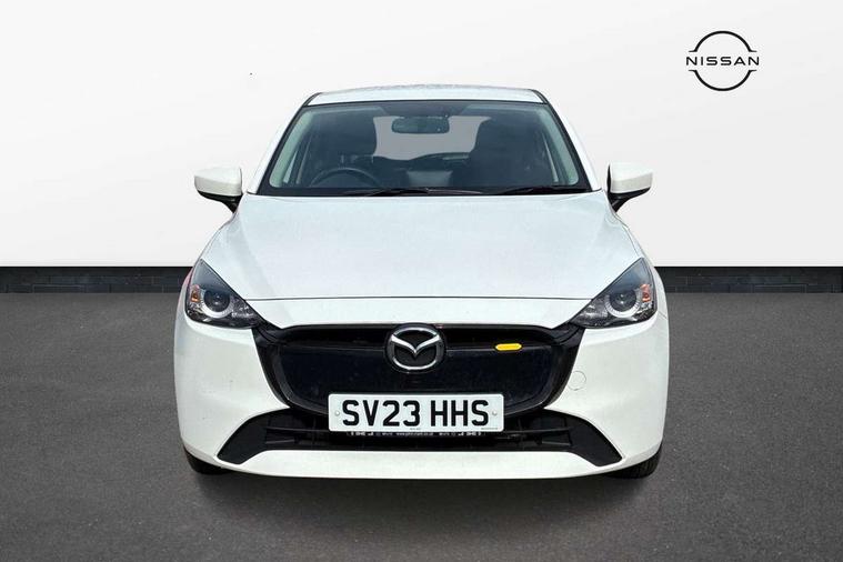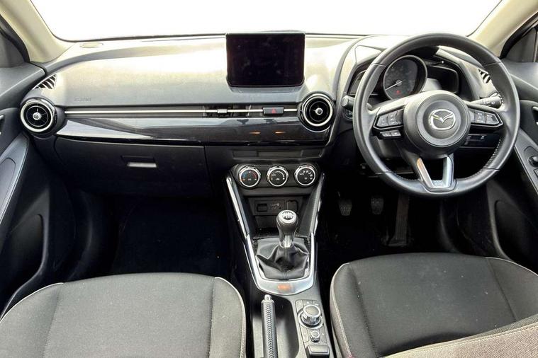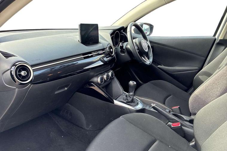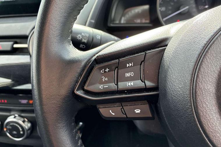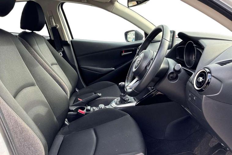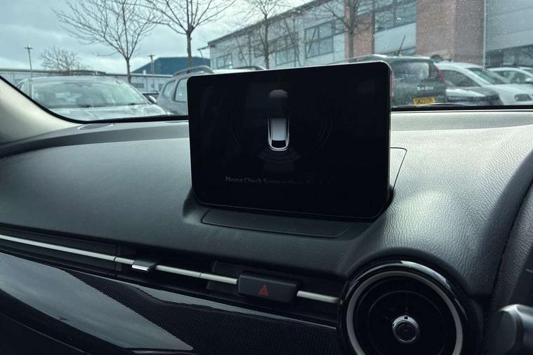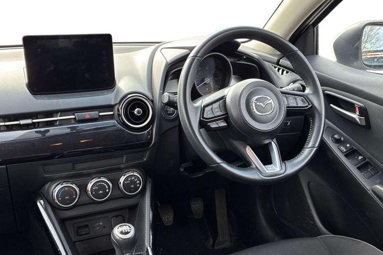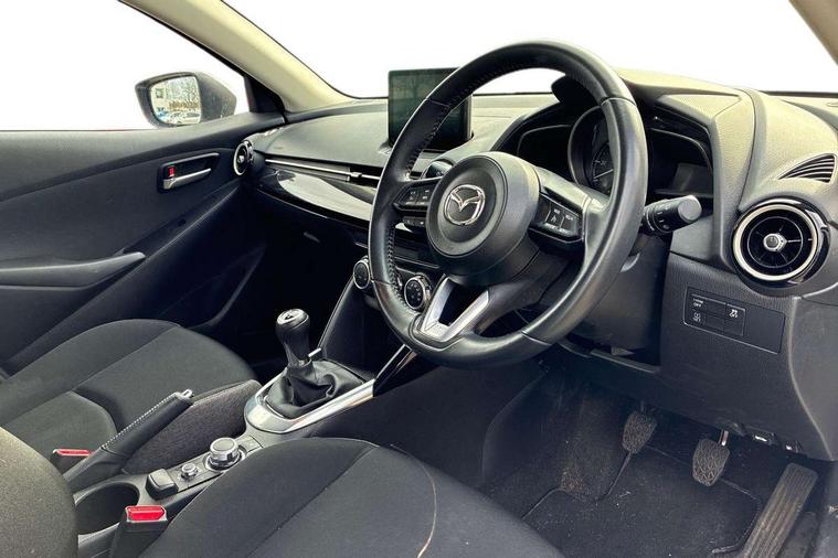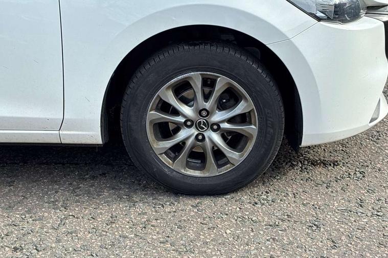Adjustable speed limiter, Analogue speed display meter, Cruise control, Digital instrument cluster, Digital rev counter, E-call, Emergency stop signalling system, Engine start/stop button, Integrated bluetooth, Mazda connect with 8" colour touch screen, Navigation system, PAS, Rear parking sensor with audible and visual warning, Service indicator, Tailgate, Trip computer, Wireless Apple CarPlay and wired Android Auto, i-stop, AM/FM/DAB radio with 6 speakers with USB and AUX inputs, Multimedia Commander including separate volume dial, Steering wheel mounted audio/bluetooth controls, Auto dimming rear view mirror, Auto headlight levelling, Body colour door mirrors, Body coloured front bumper with black lower bezel, Body coloured rear bumper with black lower mouldings and yellow accent, Coming/leaving home lighting function, Dusk sensing headlights, Electric adjustable/heated/folding door mirrors, Electric front/rear windows with one touch auto up/down for driver's window, Gloss black finish signature wing, Halogen daytime running lights, Heated rear window, LED Headlights, LED indicator lights, LED third brake light, Rain sensing front wipers with adjustable sensitivity and speed, Rear side wing doors, Rear wiper, 3 seat bench in 2nd row, 60/40 split rear seats, Black/white air vent accents, Climate control air conditioning, Driver, Front passenger and two rear grab handles with coathooks, Drivers seat manual slide recline and height adjustment, Drivers/front passengers covered vanity mirrors and drivers ticket holder, Front centre storage with two cupholders, Front head restraints, Front passenger and driver door pockets, Front passenger seat manual slide, recline and height adjust, Front passenger seatback pockets, Gear shift indicator, Glovebox, Interior courtesy light with integrated spotlight, ISOFIX child seat anchorage points attached on outer rear seats, Leather handbrake, Leather steering wheel and gear knob, Luggage compartment light, Premium cloth upholstery, Single front passenger seat, Three height adjustable rear head restraints, Tilt/telescopic adjustable steering wheel, 2x3 point front seatbelts with pre-tensioners, 3 point seatbelts on all rear seats, Anti-lock braking system (ABS), Collision mitigation braking system, Dynamic stability control + Traction control, ESP, Front and rear curtain airbags, Front driver, passenger and rear seat seatbelt warning, Front dual stage driver and single stage front passenger airbags, Front side airbags, G-Vectoring control plus, Hill launch assist, Manual child lock in rear doors, Passenger airbag cut-off switch, Tyre pressure monitoring system, Deadlocking system, Power door locks, Remote central locking, Thatcham accredited alarm and immobiliser, 15" Silver alloy wheels, Emergency tyre repair kit,