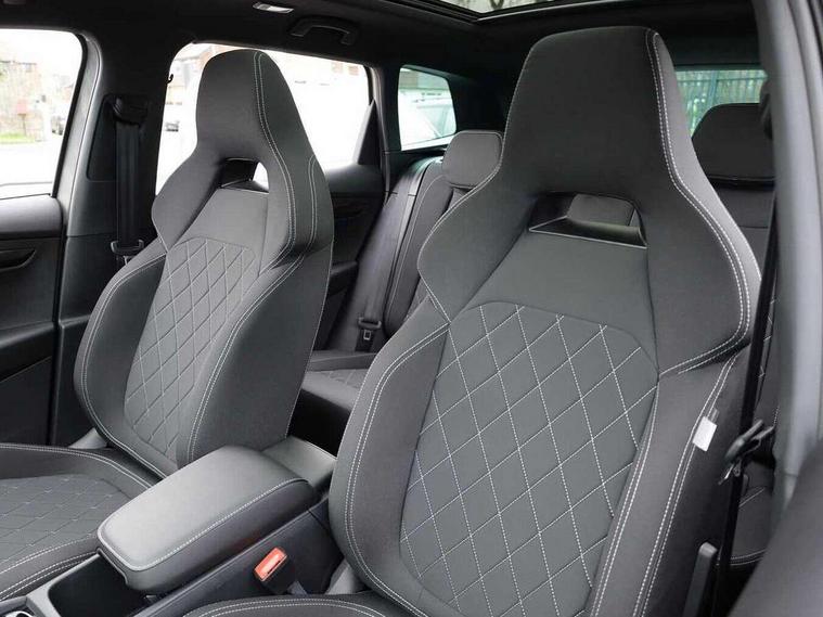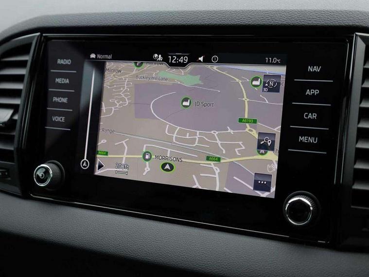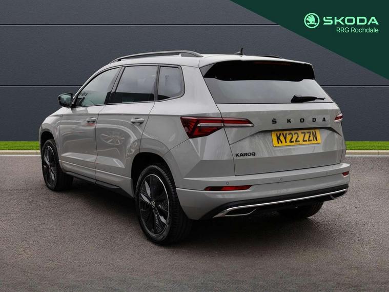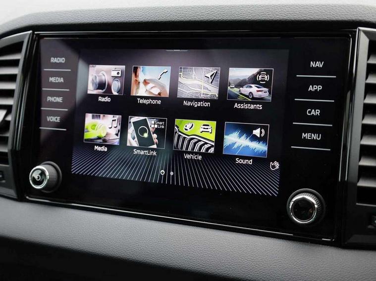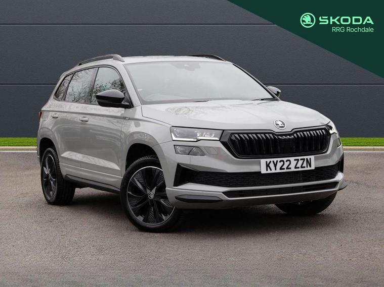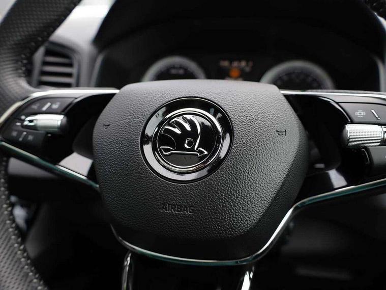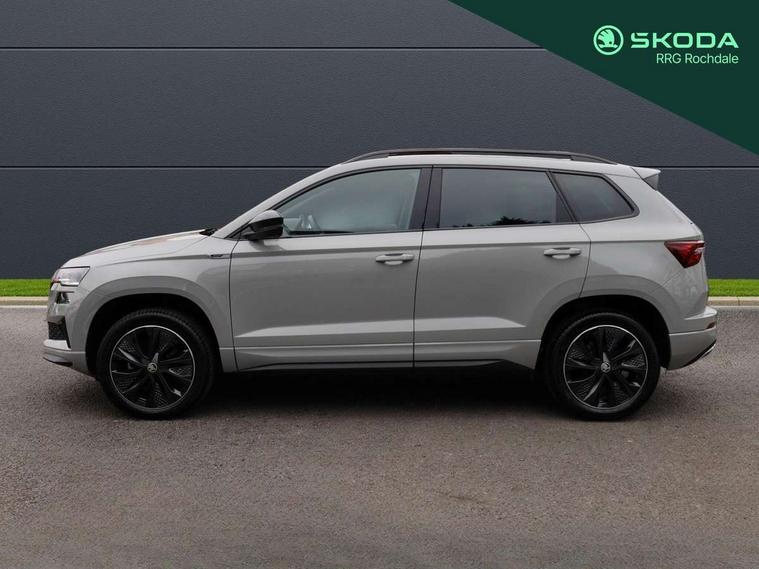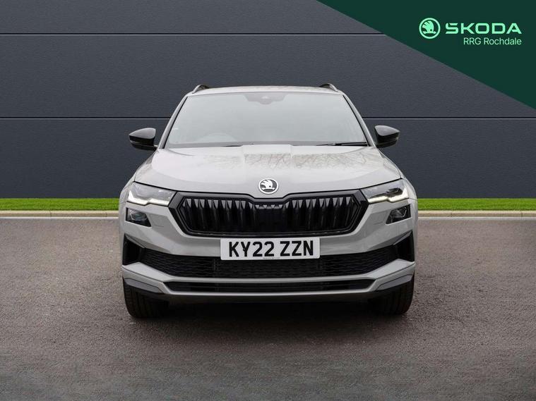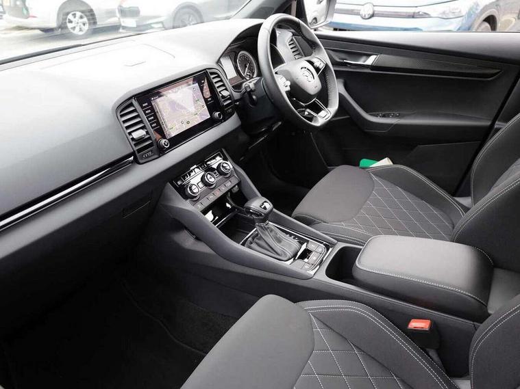 Care connect, Driver fatigue sensor, Emergency services call system, Multifunction colour trip computer, Outside temperature gauge, Service interval indicator, SmartLink wireless for Apple and wired for Android, Start/stop system with regenerative braking, USB C Port x 2 in front centre console, Virtual pedal with electrically operated boot door, 8 Speakers, DAB radio with Bluetooth, USB connection, Acoustic glass, Aero front windscreen wipers with intermittent function, Auto dimming rear view mirror with light and rain sensors, Automatic headlight control system, Black door mirrors, Black electric window control buttons, Black radiator grille, Black roof rails, Body colour door handles, Body coloured bumpers, Electric front and rear windows with child proof lock, Front door steps with SportLine logo, Heated rear windscreen, LED daytime running lights, LED rear lights with high functionality welcome effect and dynamic indicators, Light assistant (coming/leaving home/tunnel light), Panoramic sliding sunroof, Privacy glass, Protective door side sills in body colour, Rear diffuser, Rear side wing doors, Rear spoiler, Rear wiper, Safety reflectors on front doors, Skoda lettering on tailgate in black, Sportline badge on front fender, Sportline decorative inserts with badging, Sports front and rear bumpers, 1.5 litre bottle holders in driver and front passenger door panels, 12V socket in boot, 12v socket in front centre armrest with storage compartment and rear air vents, 2 Folding hooks and nets in boot, 3 rear height adjustable headrests, 3 seat bench in 2nd row, 3 spoke leather sports multifunction steering wheel and silver stitching with gear shift paddles, 4 foldable roof handles with rear coat hooks, Black floor carpet, Black roof headlining, Chrome inner door handles, Double sided boot floor, Foldable hooks in the boot, Front head restraints, Height adjustable front three point seats belts with tensioners, Height/reach adjust steering wheel, Ice scraper, Illuminated and cooled glovebox, Illuminated luggage compartment, Isofix child seat preparation outer rear, Manual lumbar support for front seats, Pen holder, Pollen filter, Rear reading lights, Rear seats fixed folding and divided 60:40, Retractable parcel shelf attachable to tailgate, Rubbish bin door, Safety vest holder, Single front passenger seat, Solid rear boot cover, Storage box in upper central dashboard closed, Sunvisors with illuminated vanity mirrors, Textile floor mats, Titan black interior ceiling, Umbrella under passenger seat, Welcome animation with sportline logo, Light Pack - Karoq, Parking pack - Karoq, Airbags - Front side, head, knee and curtain, Automatic door unlocking in case of crash, Automatic fuel cut off in case of crash, Child locks on rear doors, Driver airbag, Electronic parking brake with auto hold function, Emergency rear braking signal, ESC including ABS, MSR, ASR, EDS, HBA, DSR, RBS, MKB and traction control, Front assist radar scanning of the space in front of the car with automatic braking, Hill hold control, Passenger airbag with switch-off function, Pedestrian monitor, Seatbelt reminder signalisation and pretensioner for all seats, Three point seatbelts rear, Two tone horn, Tyre pressure display, Tyre pressure monitor, Alarm with interior monitoring, back up horn and tilt sensor with safe function, Electronic engine immobiliser, Keyless entry and start/stop system with SAFE system, Remote central locking with 2 remote folding keys, Black air vent surround, Black centre console, Satin black dashboard, Satin black door trim, 18" Procyon alloy wheels in black, Anti-theft wheel bolts protection, Matt black aero hub caps, Storage on wheel cover,