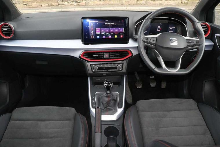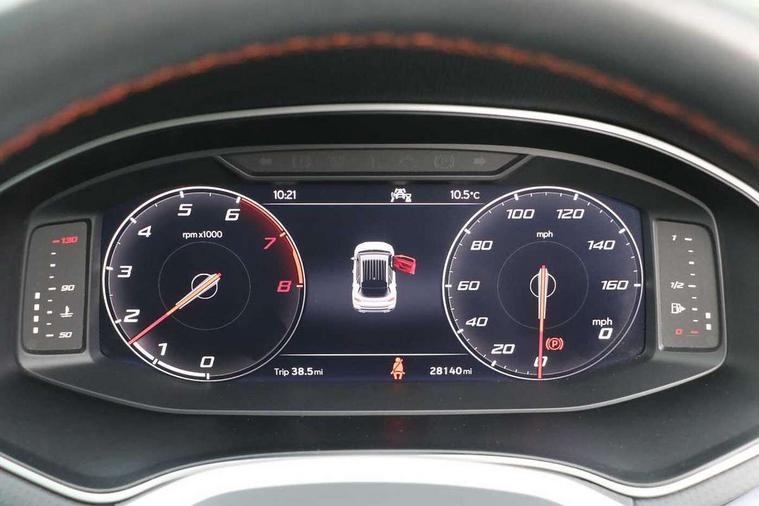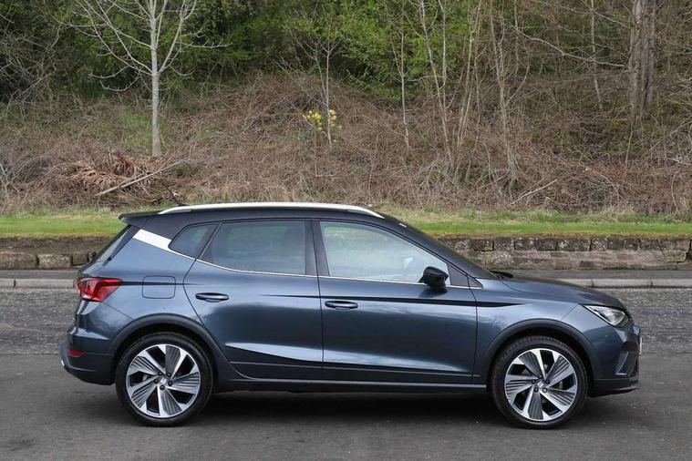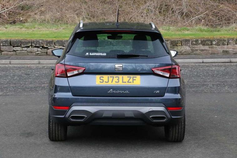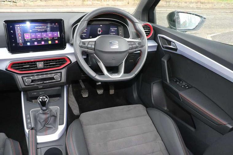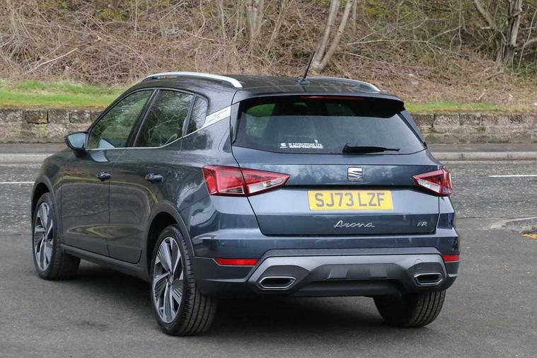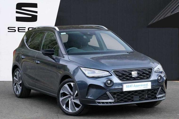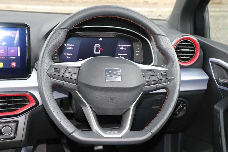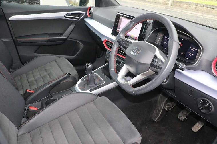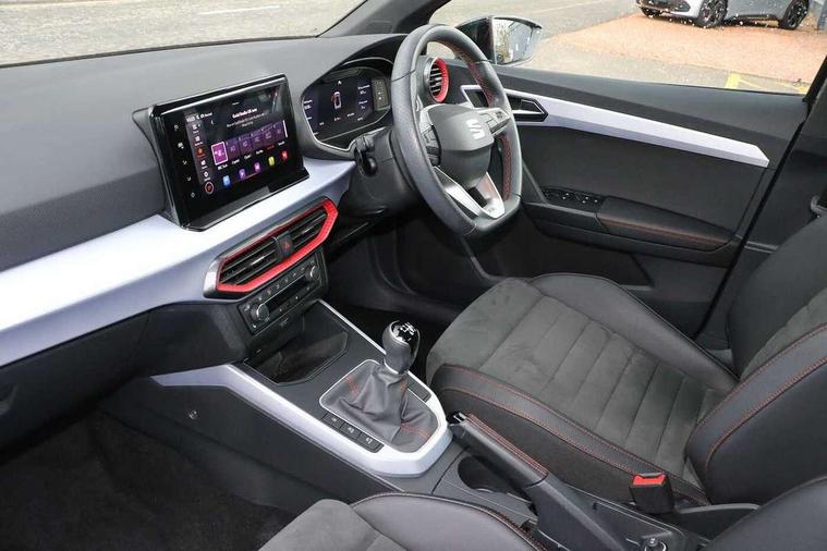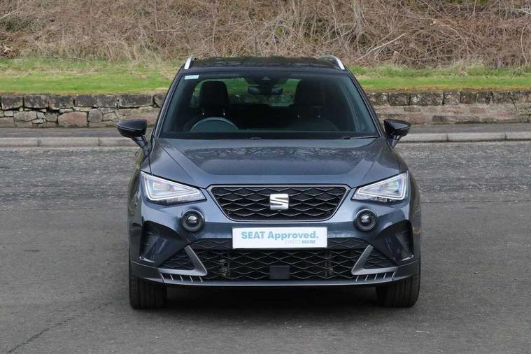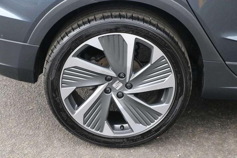 'Lights On' Reminder warning buzzer, 10" Digital cockpit, Digital clock, E-call, Electric speed sensitive power steering, Full Link Smartphone Integration with Mirror Link, Apple Car Play, Google Android Auto with USB Type C cable for Apple and Android compatibility, Low fuel warning light, Outside temperature display, Rear parking sensor, RPM counter, Seat connect with safety, service, remote and online, SEAT Drive profile - Four different models normal-sport-eco-individual, steering response, throttle response, Trip computer, Wireless phone charger, 9.2" colour touchscreen with navigation system, voice control and USB port (type c), Bluetooth interface for hands free and audio streaming, DAB digital radio and AM/FM radio, Steering wheel mounted audio controls, Anti theft roof antenna, Auto dimming interior rear view mirror, Automatic activation of hazard warning lights, Body coloured bumpers, Body coloured door handle inserts, Chrome roof rails and window surrounds, Dark tinted rear windows, Electric front/rear windows, Electrically adjustable, heated and folding door mirrors, Front fog lights with cornering function and rear fog light, FULL LED automatic headlights with dynamic headlight range control, coming and leaving home, LED daytime running lights, LED rear tail lights and licence plate lights, Protective side mouldings, Rain sensing wipers, Rear side wing doors, Rear spoiler, Rear window wash/wipe, Roof colour door mirrors, Third brake light, Twin exhaust pipe styling hidden exhaust pipe, Visible VIN plate, Windshield wiper with intermittent control and potentiometer, 2 cupholders, 3 seat bench in 2nd row, 60/40 split folding rear seat, Aircare filter, Black interior roof, Double boot floor, Driver sunvisor with covered mirror + card holder, Dual zone climate control, Front comfort seats, Front courtesy light with front reading lights, Front seat back storage pockets, Gear shift indicator, Heated front seats, Height adjustable front seats, Height/reach adjustable steering column, Illuminated boot, Instrument lighting with brightness control, Interior ambient lighting, Interior light in footwell, central console and door panel, ISOFIX points in outer rear seats with top tether anchorage points, Microsuede cloth upholstery, Passenger sunvisor with vanity mirror, Perforated flat bottomed leather steering wheel/gear knob/handbrake with red stitching and FR logo, Single front passenger seat, Two front and three rear height adjustable headrests, Interior chrome pack - Arona, 3 point seatbelts on all rear seats, ABS, Active front headrests, Child locks on rear doors, Driver and front passenger airbags with front passenger airbag de activation, front side and curtain airbags, Electronic stability control, Emergency Brake Assist (EBA) and front assist, Front and rear seatbelt reminder, Hill hold control, Multi-Collision braking, Tiredness recognition system, Traction control, Tyre pressure monitoring system, Alarm with back-up horn, Electronic engine immobiliser, Locking wheel bolts, Remote central locking + deadlocks, Tow away protection, Titan black dashboard, 18" Performance Cosmo grey matt alloy wheels,