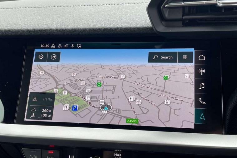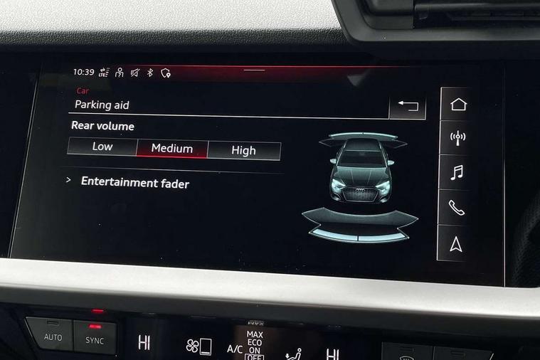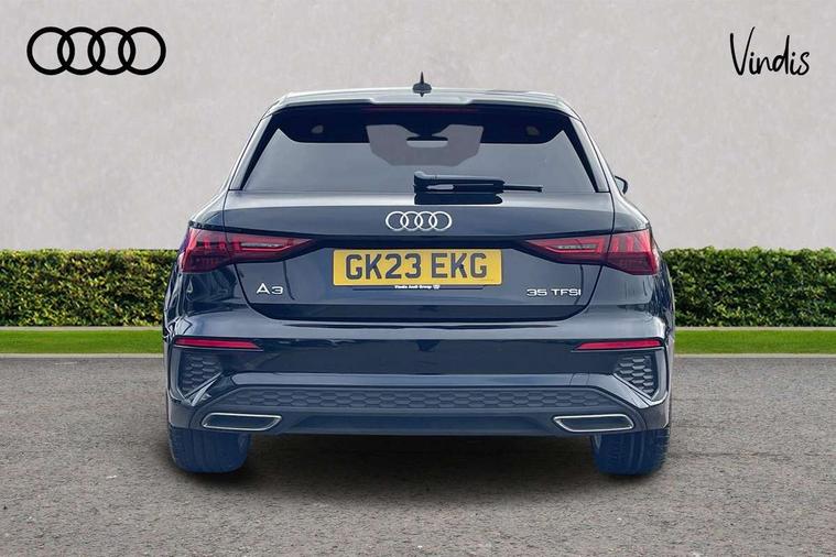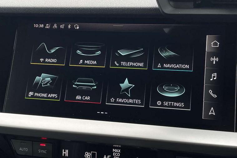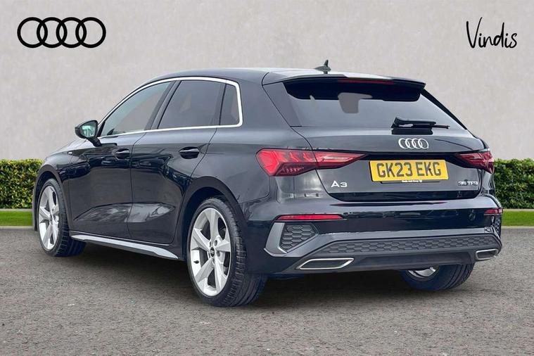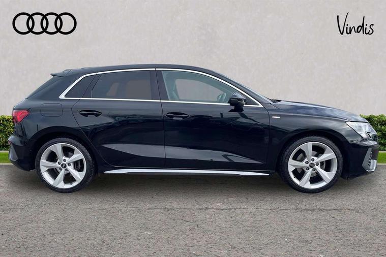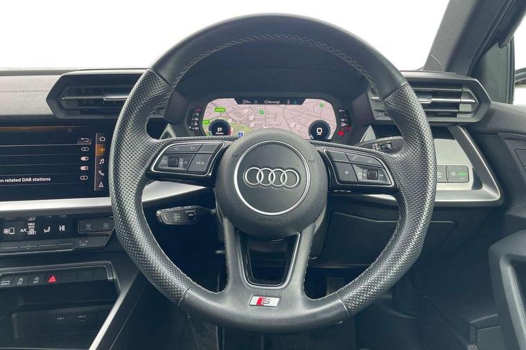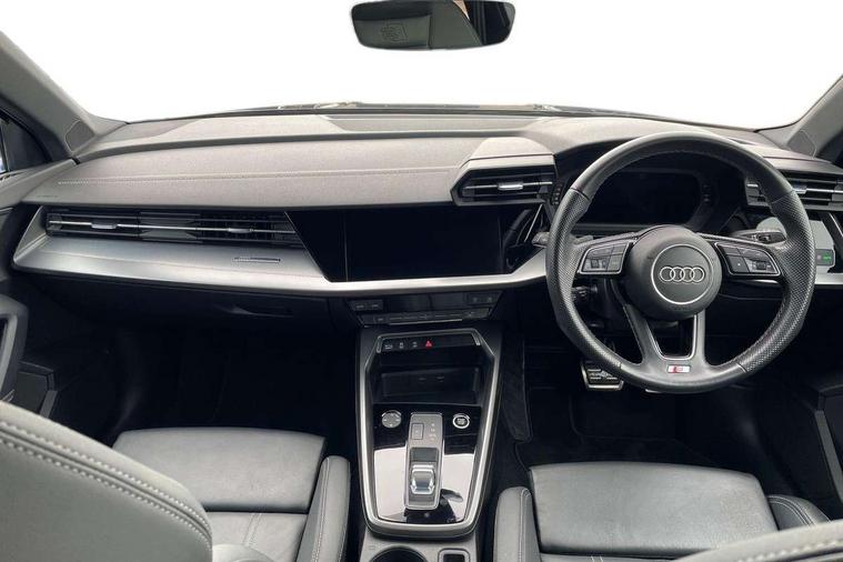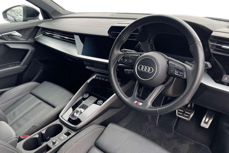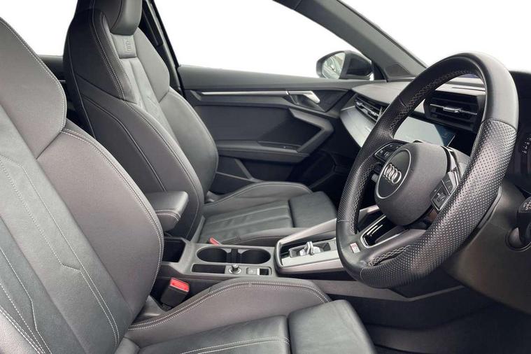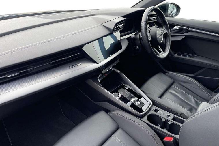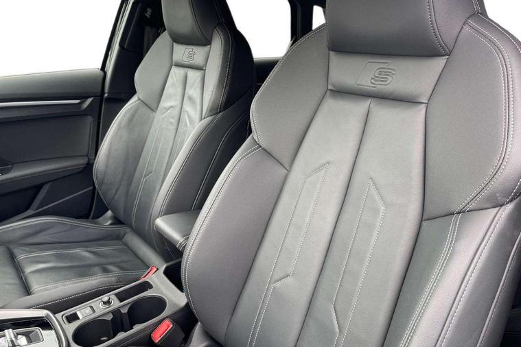 Audi drive select (Auto, Comfort, Dynamic, Efficiency and Individual), Audi smartphone interface, Audi Virtual Cockpit - 10.25" digital and colour instrument cluster, Automatic start/stop system with recuperation, Bluetooth interface, Collision avoidance assistant, e-Call (emergency call), Electromechanical power speed sensitive steering, Lane departure warning system, MMI Navigation Plus with high resolution 10.1" colour touch screen display, Service indicator, Trip computer, Voice control system with natural language interaction, Sports suspension, 2xUSB-C connection with data and charging functions, 6 passive loudspeakers, DAB Digital radio, 3rd brake light, Acoustic glass windscreen, Aluminium window trim, Auto dimming frameless rear view mirror, Body colour exterior mirrors, Electrically adjustable/heated/folding/dimming door mirrors with kerb view includes integrated LED indications + kerb view function for passenger side, Front electric windows, Illuminated aluminium inserts front door sills with S logo, LED daytime running lights, LED headlights with LED rear lights and dynamic rear indicators, Light and rain sensors, Privacy glass - dark tinted rear window, rear door and side windows, Rear electric windows, Rear side air outlets in grained matt black, Rear side wing doors, Rear wiper, S line bumpers, S roof spoiler, 12V socket and storage compartment in front centre console, 3 seat bench in 2nd row, 3 spoke leather multifunction steering wheel with paddle shift, 40/20/40 split folding rear seat bench with cupholder, Black cloth headlining, Dual zone electronic climate control, Front and rear centre armrest in leather, Front and rear headrests, Front/rear floor mats, Height and reach adjustable steering wheel, Illuminated vanity mirror, Interior lighting - glove compartment light and right hand side, Luggage compartment floor covering, Manual boot compartment lid, Manually adjustable front seats, Seat side bolsters, Single front passenger seat, Stainless steel pedals and front footrest in black, Twin leather upholstery with front sports seats S embossed logo, Aluminium interior elements pack - A3 Sportback, LED interior lighting pack - A3 Sportback, S line styling pack - A3 Sportback, 3x3 point rear seat belts, Audi pre sense front, Driver and front passenger airbag with passenger airbag deactivation, Electronic Stabilisation Control (ESC) including ABS, ASR and EDL, First aid kit with warning triangle and 2 safety vests, Front side airbags with head airbags and interaction airbag, Pre-sense front with pedestrian and cyclist detection, Seatbelt monitoring, Tyre pressure loss indicator, Anti theft alarm, Anti-theft wheel bolts, Electronically operated child lock, Immobiliser, Remote control central locking, Accent surfaces in the dashboard and centre console in platinum grey silk effect paint finish, Dark spectrum aluminium inlays,