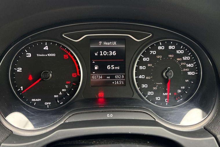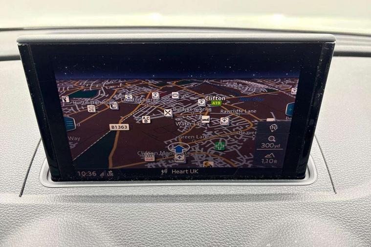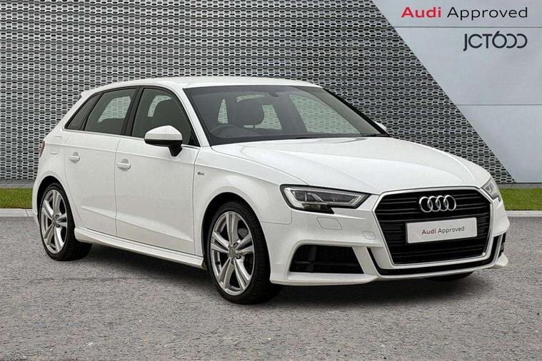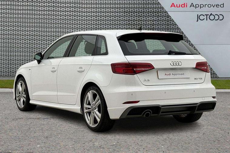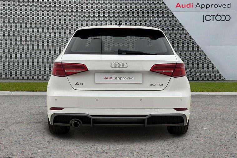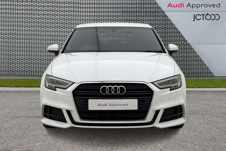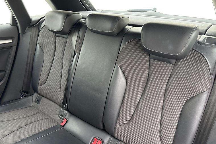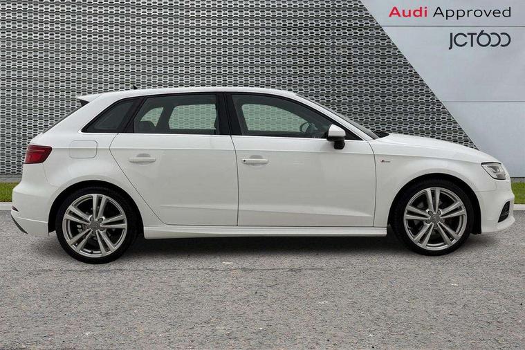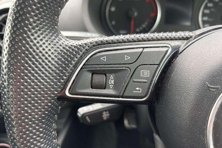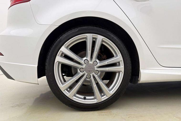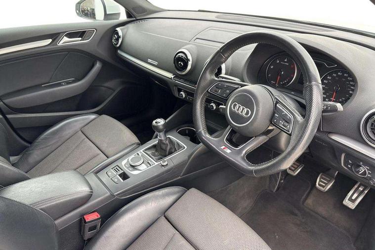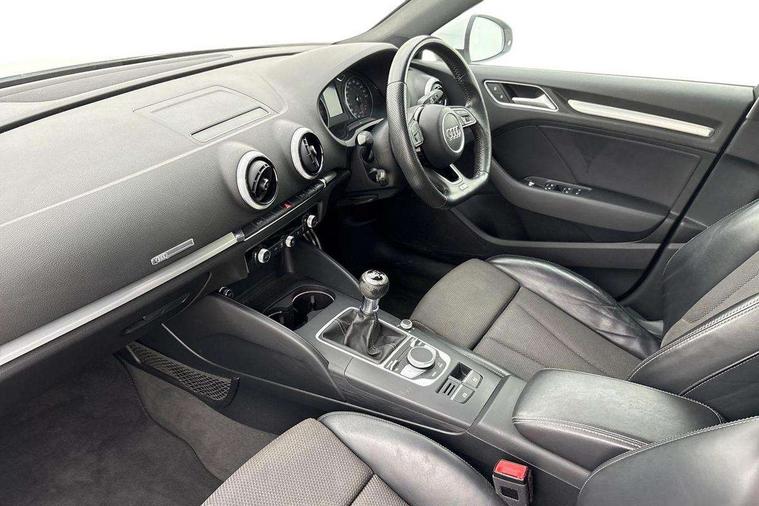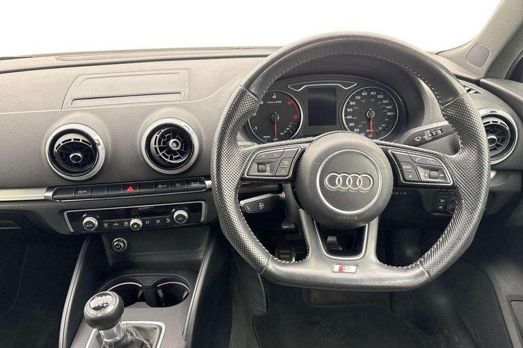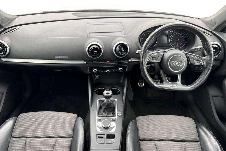 Audi connect, Audi drive select, Audi smartphone interface, Automatic start/stop system, Colour driver's information system display, Cruise control, Electro - mechanical power assisted steering, Mobile telephone preparation - bluetooth interface, SD card based MMI navigation, Service interval indicator, Speed limit display, Voice control system, Voice recognition for navigation system, Diesel particulate filter, Sports suspension, 2 USB interfaces and Aux-In jack, Audi music interface, CD player, DAB Digital radio, MMI radio plus with 7" colour MMI screen and MMI controller, Online entertainment, Aluminium window trim, Auto dimming rear view mirror with light and rain sensors, Body colour door mirrors, Chrome exhaust tailpipes, Electric front windows, Electric rear windows, Electrically adjustable and heated door mirrors with integrated LED side indicators, Heated windscreen washer jets, LED daytime running lights, Matt black radiator grille, Rear wiper, S line badges on front wings, S Line body styling with front & rear bumpers and side skirts, radiator grille and rear diffuser insert, roof spoiler, Sport specific side air inlet grille and diffuser insert, 3 adjustable rear headrests, 3 spoke flat bottomed multi-function leather sport steering wheel, 4 lashing points to secure luggage, 60/40 split folding rear seat, Adjustable front centre armrest, Black cloth headlining, Dual zone electronic climate control, Front and rear interior lights with delay, Front/rear floor mats, Glovebox light, Height and reach adjustable steering wheel, Illuminated door sill trims with S logo, Isofix child seat preparation for front passenger/outer rear seats inc passenger airbag deactivation, Manual height adjustable front seats, Stainless steel pedals, Storage compartments in doors side trims, centre console and under front drivers seat, Tool kit, LED interior light pack - A3/RS3, Non smoking pack - A3, Storage and luggage pack - A3/RS3, 3 point seatbelts on all seats, ABS/EBD, Active bonnet, Active front headrests, Airbags - front driver/passenger, front & rear side, curtain, drivers knee, ASR, EDL, Electromechanical parking brake, ESC - Electronic Stability Control + traction control, Front passenger airbag deactivation, Hill hold assist, Manual rear child locks, Multi-Collision braking, Seatbelt warning, Tyre pressure warning, Warning triangle and first aid kit, Anti theft alarm, Anti-theft wheel bolts, Remote control central locking, Thatcham category 1 alarm + immobiliser, Aluminium air vent surrounds, Aluminium trim elements, Matt brushed aluminium inlays, Tyre repair kit,