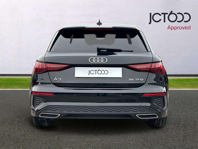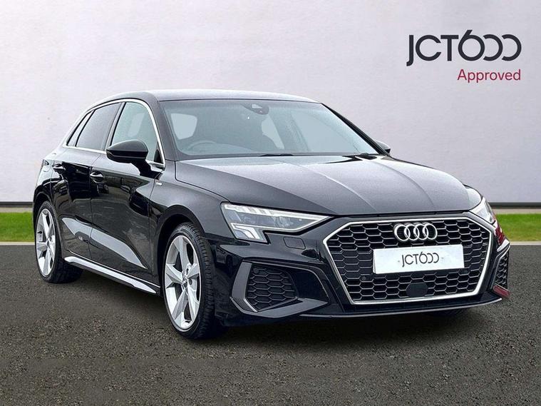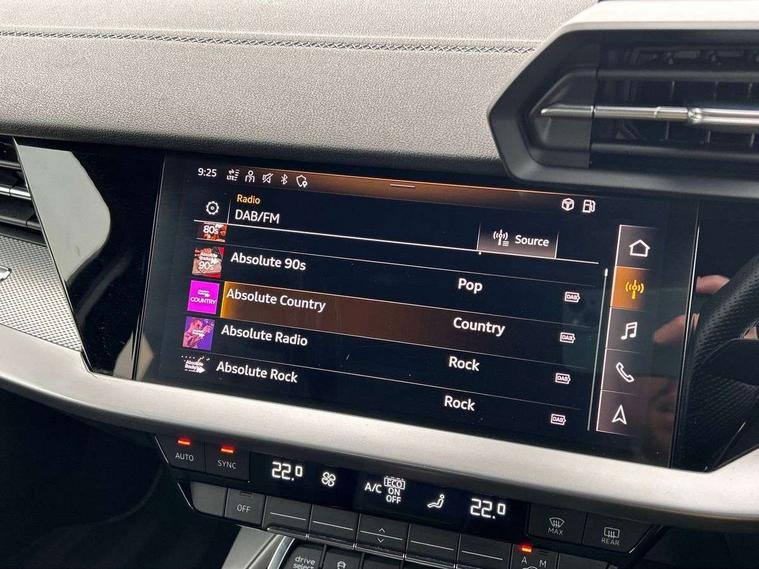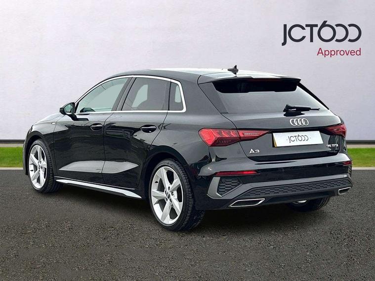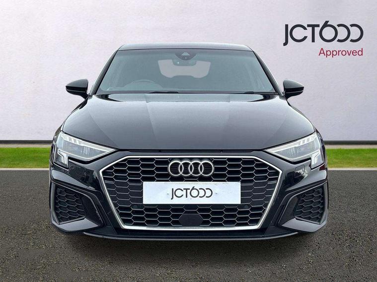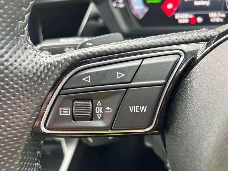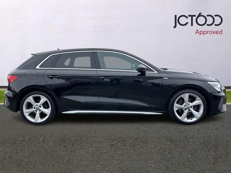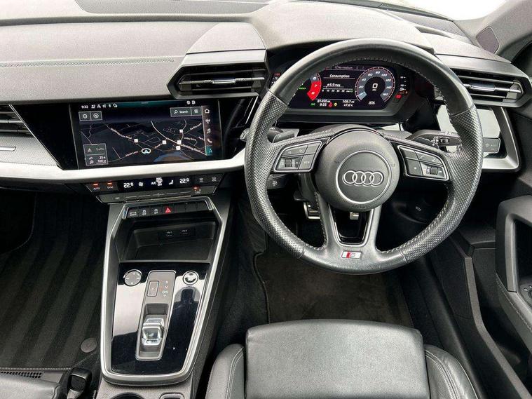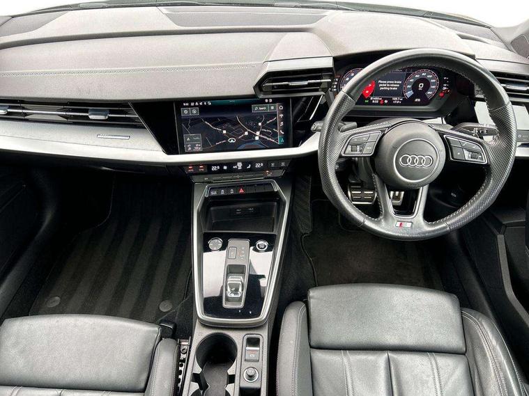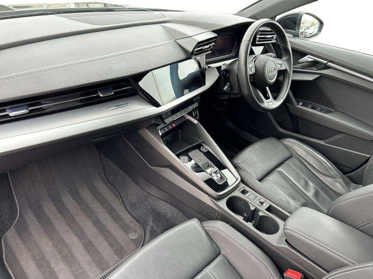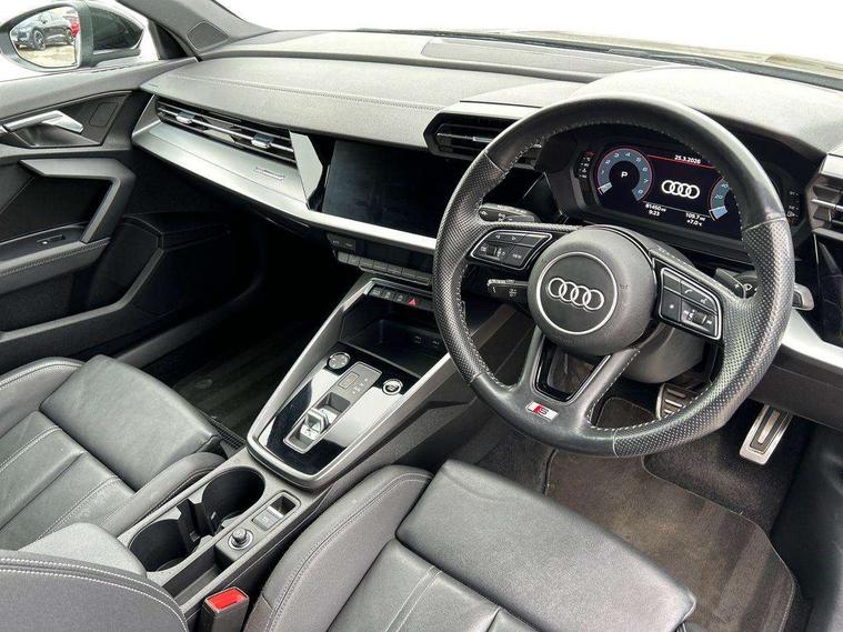 Audi connect emergency call and service, Audi drive select (Auto, Comfort, Dynamic, Efficiency and Individual), Audi smartphone interface, Audi Virtual Cockpit - 10.25" digital and colour instrument cluster, Automatic start/stop system with recuperation, Bluetooth interface, Collision avoidance assistant, Electromechanical power speed sensitive steering, Lane departure warning system, MMI Navigation Plus with high resolution 10.1" colour touch screen display, Service indicator, Trip computer, Voice control system with natural language interaction, 1xUSB-A and 1xUSB-C connection, 6 passive loudspeakers, DAB Digital radio, Acoustic glass windscreen, Aluminium window trim, Auto dimming frameless rear view mirror, Body colour exterior mirrors, Electrically adjustable/heated/folding/dimming door mirrors with kerb view includes integrated LED indications + kerb view function for passenger side, Front electric windows, Illuminated aluminium inserts front door sills with S logo, LED daytime running lights, Light and rain sensors, Privacy glass - dark tinted rear window, rear door and side windows, Rear electric windows, Rear side air outlets in grained matt black, Rear wiper, S line bumpers, S roof spoiler, 12V socket and storage compartment in front centre console, 40/20/40 split folding rear seat bench with cupholder, Black cloth headlining, Dual zone electronic climate control, Front and rear centre armrest in leather, Front and rear headrests, Front/rear floor mats, Height and reach adjustable steering wheel, Interior lighting - glove compartment light and right hand side, Luggage compartment floor covering, Manual boot compartment lid, Manually adjustable front seats, Seat side bolsters, Stainless steel pedals and front footrest, Twin leather upholstery with front sports seats S embossed logo, Aluminium interior elements pack - A3 Sportback, S line styling pack - A3 Sportback, 3x3 point rear seat belts, Driver and front passenger airbag with passenger airbag deactivation, Electronic Stabilisation Control (ESC) including ABS, ASR and EDL, First aid kit with warning triangle and 2 safety vests, Hill hold assist, Pre-sense front with pedestrian and cyclist detection, Seatbelt monitoring, Tyre pressure loss indicator, Anti theft alarm, Anti-theft wheel bolts, Electronically operated child lock, Immobiliser, Remote control central locking, Accent surfaces in the dashboard and centre console in platinum grey silk effect paint finish, Dark spectrum aluminium inlays,