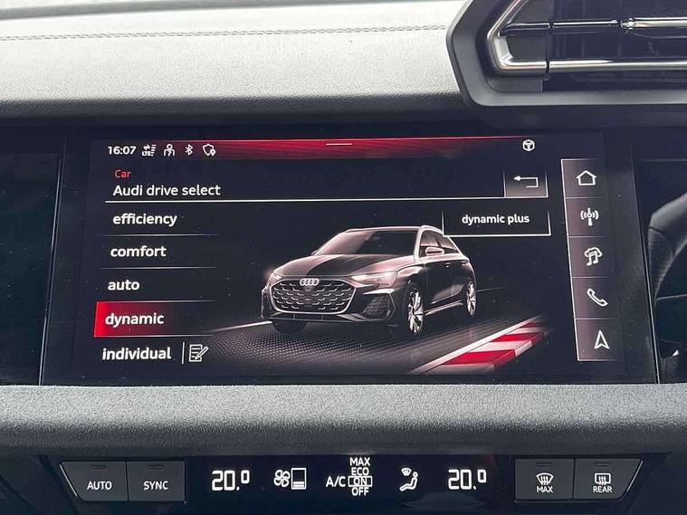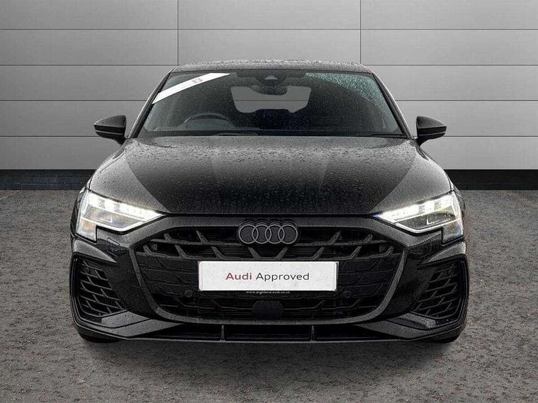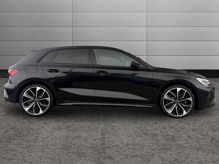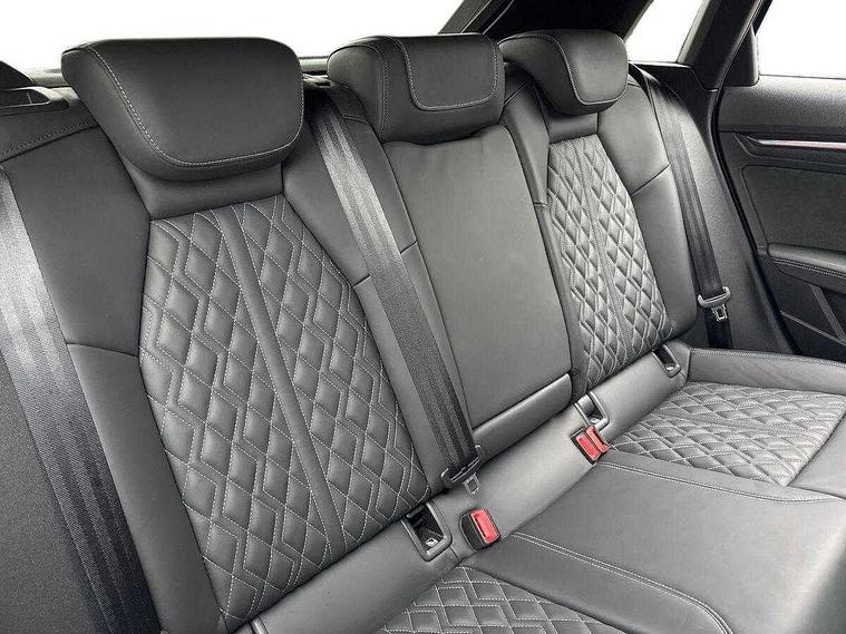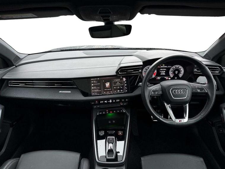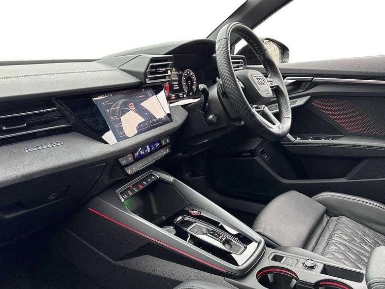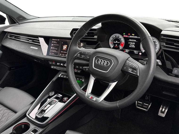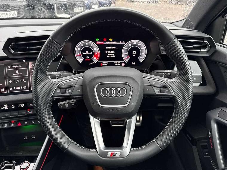 Adjustable speed limiter, Audi drive select, Audi smartphone interface with app store includes wireless Apple carplay, Android auto and Amazon alexa integration, Audi virtual cockpit plus - 12.3" full HD resolution dynamic digital instrument cluster, Automatic start/stop system with recuperation, Bluetooth interface, Camera based traffic sign recognition, Collision avoidance assistant, Distraction and Fatigue warning, e-Call (emergency call), Electromechanical power speed sensitive steering, Lane departure warning system, MMI Navigation Plus with high resolution 10.1" colour touch screen display, Park Assist with parking system Plus, Progressive steering, Service indicator, Tailgate, Trip computer, Voice control system with natural language interaction, S sport suspension with spring damper adjustment and lowering by 15mm, Audi Phonebox light with wireless charging, DAB Digital radio, USB ports with charging function in the rear, Anthracite grey Audi rings (front and rear), Audi Beam uses LEDs to project the rhombus S logo onto the ground as you exit your S3, Auto dimming frameless rear view mirror, Black accents front and rear bumpers including air inlets, Black accents in front grille and frame, Black accents window trims strips, Electrically adjustable/heated/folding/dimming door mirrors with kerb view includes integrated LED indications + kerb view function for passenger side, Exterior model badging, Front electric windows, Headlight washers, Heat insulating glass windscreen, Illuminated door sills with aluminium inserts at the front with S logo, LED 3rd brake light, LED daytime running lights, LED headlights with LED rear lights and dynamic rear indicators, Light and rain sensors, Privacy glass - dark tinted rear window, rear door and side windows, Rear electric windows, Rear side wing doors, Rear wiper, S grille, S3 front bumper with S specific air intake grilles, S3 roof spoiler, 12V socket and storage compartment in front centre console, 3 seat bench in 2nd row, 3 spoke flat bottomed leather multifunction sport steering wheel with gear shift paddles, 3-zone deluxe automatic air conditioning, 4 way electrically adjustable lumbar support for driver and front passenger, 40/20/40 split folding rear seat bench, Black cloth headlining, Fine Nappa leather upholstery with front sports seats S embossed logo, Front and rear centre armrest in artificial leather, Front and rear headrests, Front/rear floor mats, Heated front seats, Manual boot compartment lid, Manually adjustable front seats, S badging on the steering wheel, Seat side bolsters, Single front passenger seat, Stainless steel pedals and front footrest in black, Aluminium interior elements pack - A3 Sportback, Extended ambient lighting package Pro - S3 Black edition, Storage package - A3, Technology package - A3, 3x3 point rear seat belts, Driver and front passenger airbag with passenger airbag deactivation, Electronic Stabilisation Control (ESC) including ABS, ASR and EDL, First aid kit with warning triangle and 2 safety vests, Front side airbags with head airbags and interaction airbag, Hill hold assist, Pre-sense front with pedestrian and cyclist detection, Seatbelt monitoring, Tyre pressure loss indicator, Anti theft alarm, Anti-theft wheel bolts, Electronically operated child locks, Immobiliser, Remote control central locking, Inlays in black dynamica microfibre,