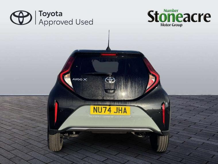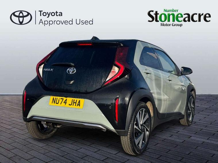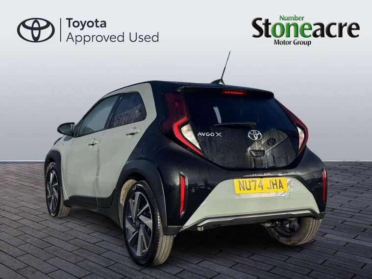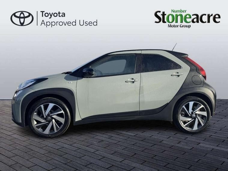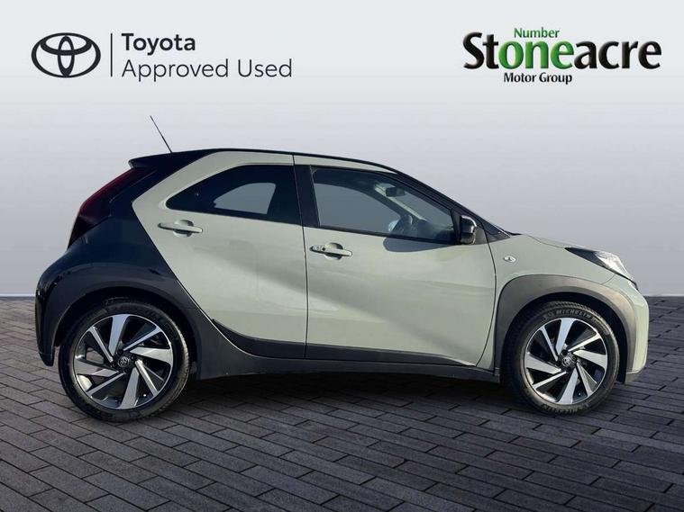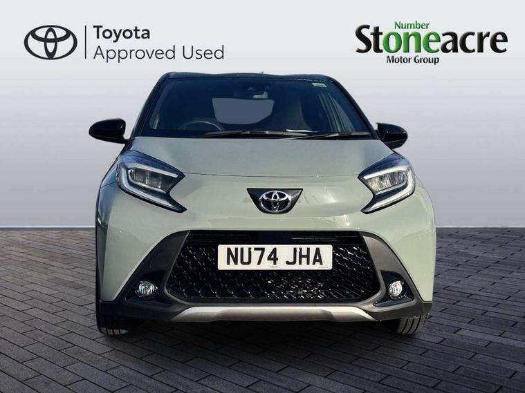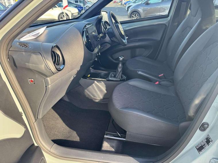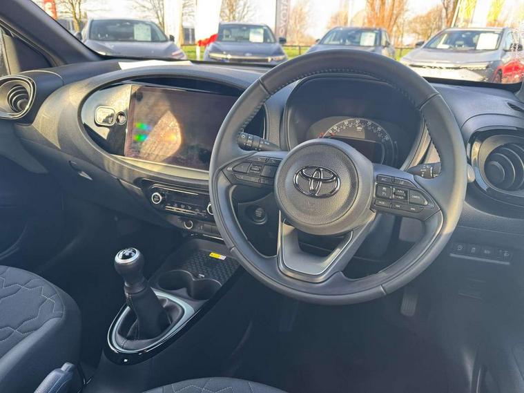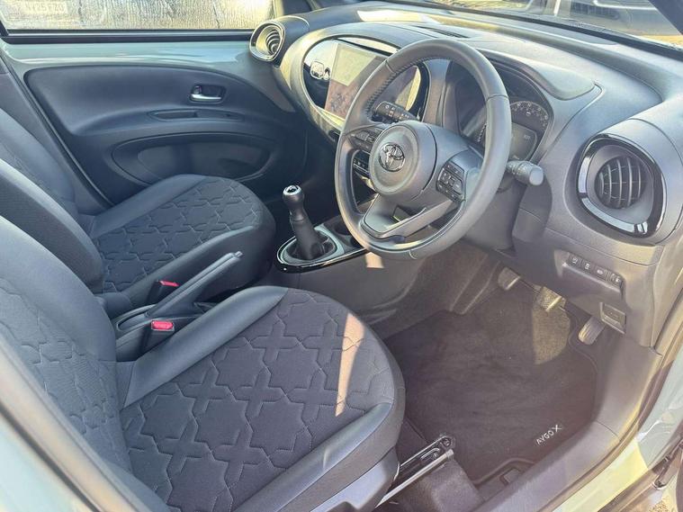 4.2" TFT colour screen, Adjustable speed limiter, Analogue speedometer, Bluetooth connectivity, Digital tachograph, Driver attention alert system, eCall emergency call system, Electric power steering, Front and rear parking sensors with auto brake, Intersection turn assist, Key reminder warning, Noise reduction kit, Pre collision system with emergency steering assist, Remote boot door release on key, Reversing camera with static guide lines, Smart entry and push button start, Smart phone integration with Apple car play/Android Auto, Speed limit display, Start and stop, Wireless charger, Vehicle Stability Control (VSC), 10.5" HD multimedia display touch screen with Toyota smart connect, 4 speakers, DAB digital audio broadcast, USB connector, Auto headlights, Auto wipers, Automatic headlights cut-off, Automatic high beam On/Off switch, Bicycle towing hook, Black contrast roof, Black fog light surrounds, Black side protection mouldings, Black wheel arch mouldings, Body colour door handles, Body coloured front bumper, Boot door scuff plate, Eclipse black rear bumper, Electric heated door mirrors, Follow me home headlights, Front and rear underruns in silver, Front fog lights, Front power windows, Gloss black door mirrors, Gloss black upper front grille, Headlight cut-off reminder, LED daytime running lights guide, LED front light guide, LED High mounted stop lamp, LED projector headlights, Manual day/night rear view mirror, Manual headlight levelling, Pagoda roof, Power adjustable door mirrors, Power back door, Privacy glass, Rain sensor, Rear combination lights LED bulb type, Rear side wing doors, Rear windscreen defogger, Rear windscreen wiper, Remote hazard lights system, Short antenna, Variable intermittent windscreen wipers, 12v power outlet - front, 2 seat bench in 2nd row, 3 spoke leather steering wheel, 50/50 split folding rear seat, Adhesive roof headlining, Adjustable speed limiter switch on steering wheel, Audio and telephone switches on steering wheel, Auto air conditioning, Black roof lining, Body colour satin anodised insert on steering wheel, Boot light, Centre room light, Chrome interior door handles, Chrome surround on air conditioning buttons, Clean air filter, Console box storage, Floor mats, Front and rear cup holders, Front head rest deco art, Front head restraints, Height adjustable driver seat, Intelligent adaptive cruise control switch on steering wheel, ISOFIX child restraint system on rear seats, Lane departure alert switch on steering wheel, Leather gearshift knob, Light blue ambient lighting in centre console, Manual tilt steering wheel, Manually reclining and sliding driver seat, Manually reclining and sliding front passenger seat, Multimedia switches on steering wheel, Partial synthetic leather upholstery, Pollen filter, Rear door pockets, Rear head restraints, Satin silver insert on gear shift knob, Single compartment glovebox with lights, Single front passenger seat, Soft tonneau cover, Sun visors with mirror on driver and passenger side, Voice recognition switch on steering wheel, Toyota safety sense pack - Aygo X, Anti lock braking system + Electronic brake force distribution, Child safety door lock, Emergency brake light signal (EBS), Hill start assist control (HAC), Passenger airbag on/off switch, Seat belt reminder for front and rear seats, Supplement restraints system (SRS) - 6 airbags, Traction control, Tyre pressure warning system, Immobiliser, Remote power door locks, Black wheel centre caps, Tyre repair kit,