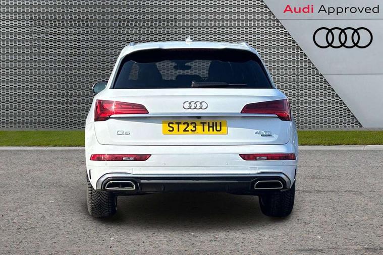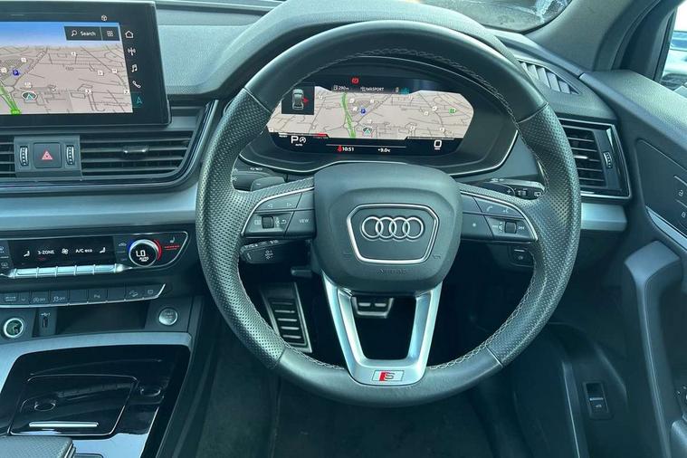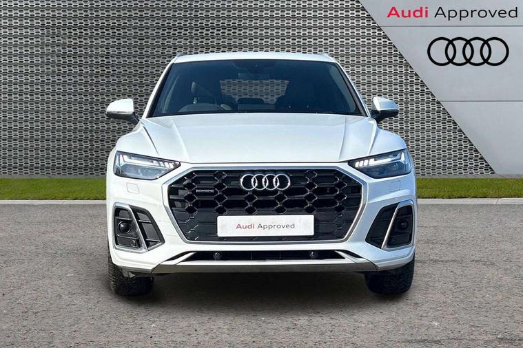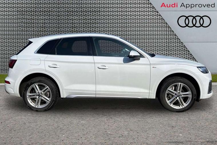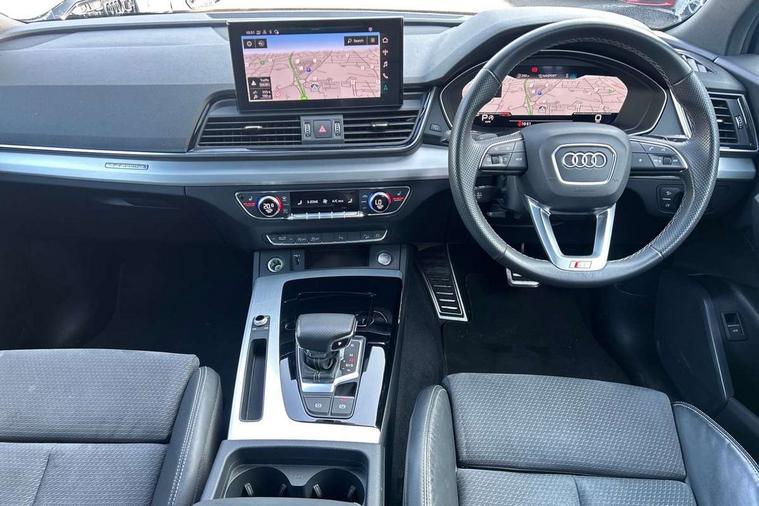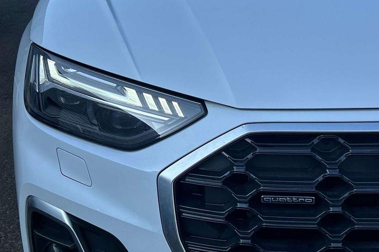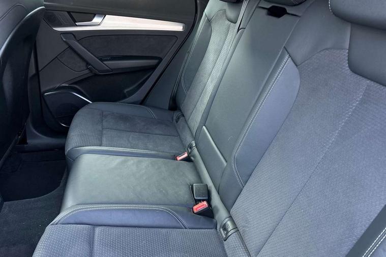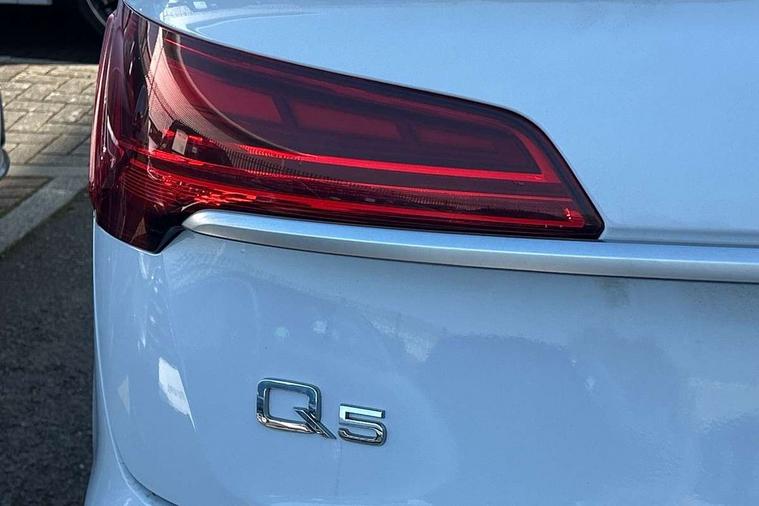 Acoustic front and rear parking sensor, Audi connect safety and service (e-call), Audi drive select, Audi virtual cockpit plus with 12.3" screen and three different layout designs, Audi wireless smartphone interface, Automatic start-stop system with coasting functionality and efficiency programme, Bluetooth interface, Camera based traffic sign recognition, Electro - mechanical power assisted steering, Lane departure warning, MMI navigation plus with 10.1" touch screen, Power tailgate, Reversing camera, Service interval indicator, Voice control system with Audi hotword activation "Hey Audi", Diesel particulate filter, Quattro on demand, S line sports suspension, 2 x USB charging port with aux input socket, 8 loudspeakers, DAB Digital radio, 3rd brake light, Acoustic windscreen, Aluminium roof rails, Auto dimming door mirrors, Auto dimming frameless rear view mirror, Automatic headlight adjustment, Automatic headlights and windscreen wipers, Body colour bumpers, Body colour door mirrors, Body colour rear diffuser with matt aluminium silver surrounds, Body colour underbody protection, Chrome plated exhaust trims, Daytime running lights, Door sills in Selenite silver, Electric adjustable/heated/folding door mirrors, Front air inlet surrounds in aluminium, Front and rear electric windows, Front radiator grille in honeycomb design, LED headlights and LED tail lights, Loading edge protection in stainless steel, Lower bumpers painted in contrast Manhattan grey, Rear chrome trim strip below lights, Rear privacy glass and rear side windows, Rear side wing doors, Rear wiper, Roof bars, S Line badges on the front wing panels, S Line front and rear bumpers, S Line rear spoiler, S Line side skirts, 3 rear headrests, 3 spoke leather multifunction steering wheel with S badging perforated leather grips, Black cloth headlining, Comfort front centre armrest, Contrast stitching on seats, steering wheel and gear lever gaiter, Deluxe 3 zone electronic climate control, Front head restraints, Front sport seats with S embossed logo, Front/rear floor mats, Gear lever in black leather, Heated front seats, Height/reach adjustable steering column, Illuminated door sill trims with S logo, Luggage compartment cover, Manual seat adjustment with 4-way electric lumbar support, Single front passenger seat, Stainless steel pedals, Sunvisors with vanity mirrors, High gloss pack - Q5, LED interior light pack - Q5, 3 point seatbelts on all seats, 6 airbags - Driver, front passenger, curtain and side airbags, Attention and drowsiness assist, Electrically operated child locks on rear doors, Electromechanical parking brake, Electronic stabilisation control including ABS, ASR and EDL, First aid kit with warning triangle and vests, Front passenger airbag deactivation, Hill descent control, Hill hold assist, ISOFIX child seat mounting for front passenger seat and ISOFIX child seat mounting with Top Tether for outer rear seats, Multi collision brake assist, Pop-up bonnet for pedestrian protection, Pre sense city, Seatbelt monitoring, Tyre pressure warning, Anti theft alarm, Anti-theft wheel bolts, Remote central locking, Remote control key with SAFELOCK and keyless go, Air vents inserts and centre console in gloss black, Matt brushed aluminium inlays, Tool kit, Tyre repair kit,