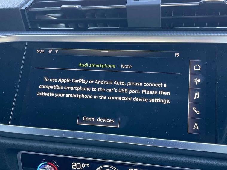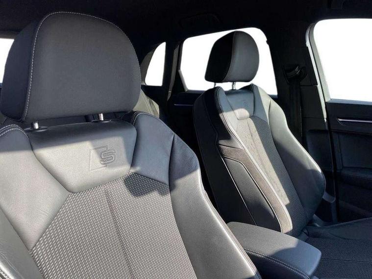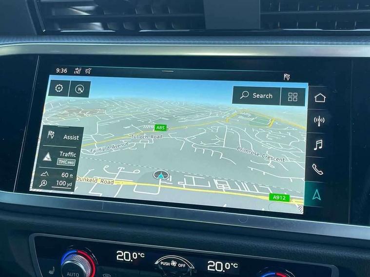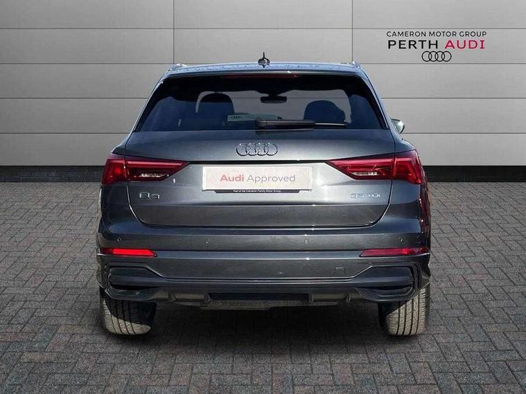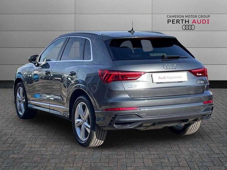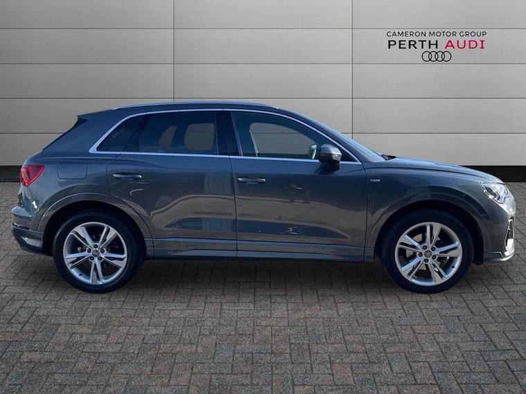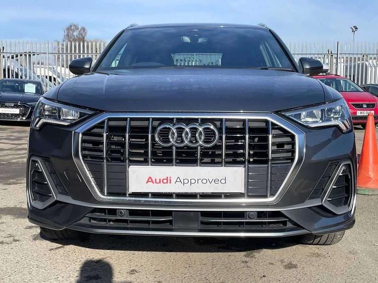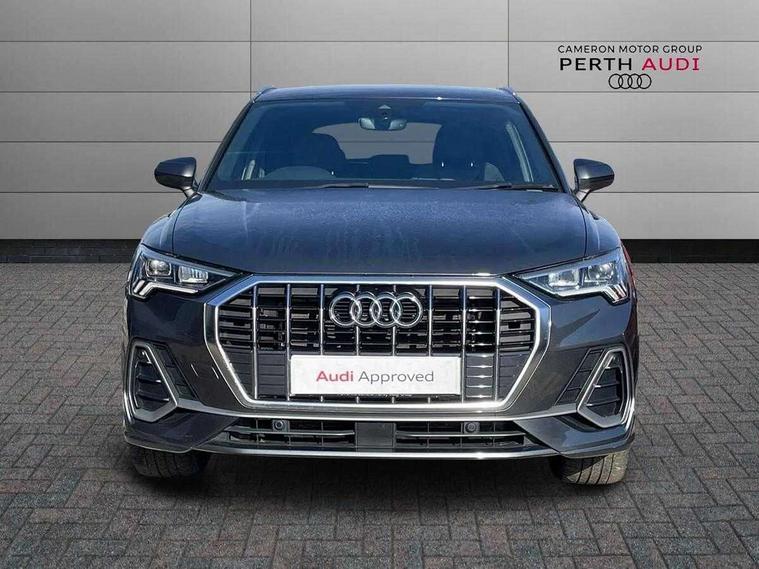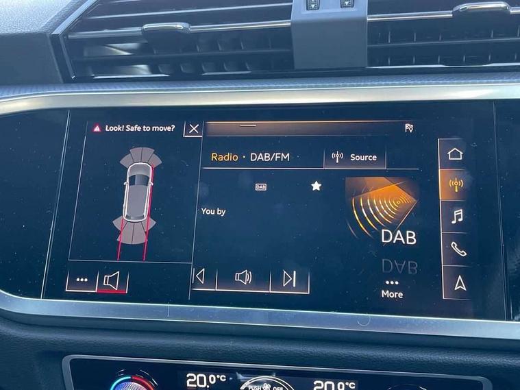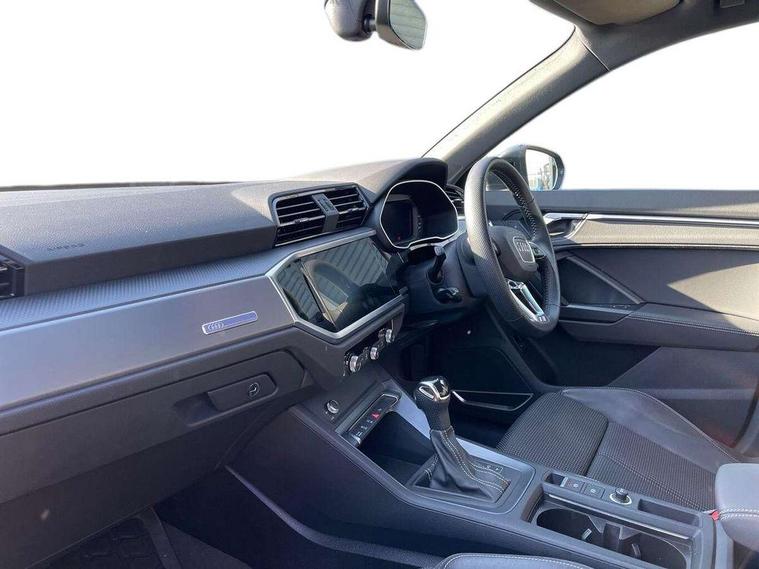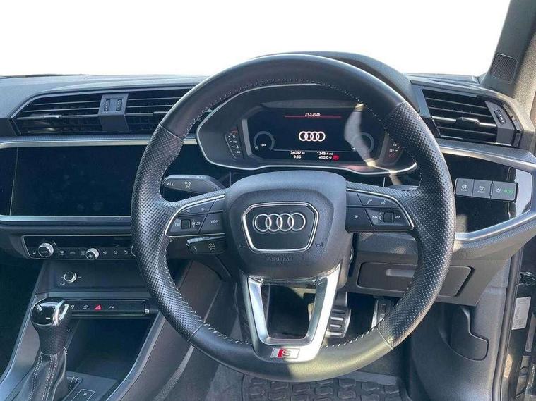 Audi connect safety and service (e-call), Audi drive select, Audi lane departure warning, Audi side assist, Audi smartphone interface, Bluetooth interface, MMI navigation plus with MMI touch, Power opening/closing tailgate, Progressive steering, Service interval indicator, Stop/start system, Voice control system, Diesel particulate filter, DAB digital radio module, Acoustic windscreen, Aluminium roof rails, Aluminium window trim, Auto dimming rear view mirror, Body colour door mirrors, Body coloured bumpers, Diffuser in matt Platinum grey, Electrically adjustable and heated door mirrors with integrated LED side indicators, Front and rear electric windows, Front fog lights, Front side air inlets in matt platinum grey, Front spoiler blade in matt platinum grey, Grille vertical bars in aluminium silver/Matt, High gloss black finish B and C pillars, Privacy glass, Rain and light sensors, Rear diffuser strip in selenite silver, S Line badge on wings, S Line front and rear bumpers, Side skirt insert in matt Platinium grey, Titanium black radiator grille, 12V socket in rear centre console, 40:20:40 split folding rear bench seat, Adjustable rear seat bench/backrest with centre armrest and cupholder, Aluminium door sill trims, Black cloth headlining, Dual zone climate control, Front and rear black floor mats with contrast stitching in rock grey, Front and rear headrests, Front centre armrest with storage compartment and angle adjustment, Illuminated door sill trims with S logo, ISOFIX child seat mounting and Top Tether with front passenger airbag deactivation, Perforated leather gearknob, Stainless steel luggage compartment sill finisher, Stainless steel pedals, Non smoking pack - Q3, 3x3 point rear seatbelts, 6 airbags - Driver, front passenger, curtain and side windows, Audi pre-sense front with pedestrain and cyclist recognition, Electronic stabilisation control including ABS, ASR and EDL, Hill hold assist, Pre sense basic, Seatbelt monitoring, Tyre pressure warning, Warning triangle and first aid kit, Anti theft alarm, Anti theft wheel bolts, Remote central locking, Dark matt brushed aluminium inlay, MMI touch colour display in gloss black with aluminium surround,