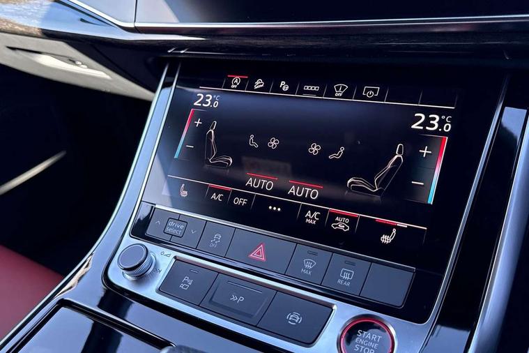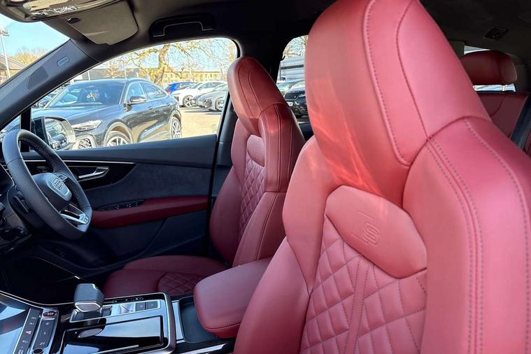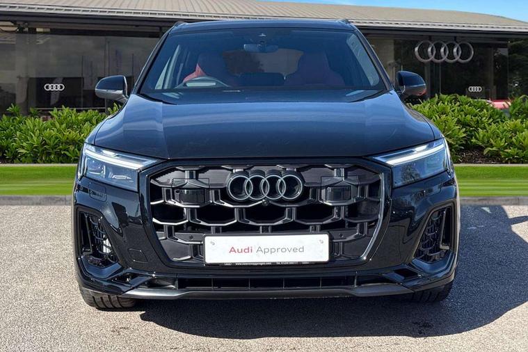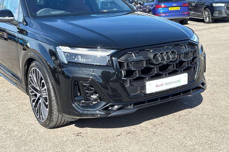 All wheel steering, Audi connect safety and service (e-call), Audi connect with Amazon Alexa Integration, Audi drive select (Auto, Comfort, Dynamic, Efficiency, Individual, Off-road and All road), Audi phone box light with wireless charging, Audi virtual cockpit plus, Bluetooth interface, Camera based traffic sign recognition, Electromechanical power steering, MMI navigation plus with MMI touch screens includes 10.1" and 8.6" screens with haptic feedback, Natural voice recognition, Operating buttons in Matte black, Power operated tailgate, Smartphone interface includes wireless Apple carplay/Android Auto, Start/stop system, 48V Mild hybrid technology, 85 litre fuel tank, Quattro all wheel drive with self locking centre differential, S specific adaptive air sport suspension, Audi music interface - front 2 USB-C ports with charger and data functions, DAB digital radio module, Aluminium window trim, Audi Beam uses LEDs to project Audi rhombus S logo onto the ground as you exit your SQ7, Auto dimming frameless rear view mirror, Black roof rails, Electrically adj heated/folding + automatically dimming exterior mirrors with memory + automatic kerb side function for passenger side exterior mirror, Headlight washers, Heat insulating glass in windshield, Integrated LED indications in door mirrors, LED 3rd brake light, LED daytime running lights, LED rear tail lights, Loading edge protection in stainless steel, Matrix LED headlights with dynamic front and rear indicators, Privacy glass - dark tinted rear and rear side windows from B-pillar backwards, Rear side wing doors, Rear wiper, 2 seat bench in 3rd row, 3 seat bench in 2nd row, 4 zone deluxe automatic climate control, 7 seat layout with ISOFIX points for the front passenger seat and rear passenger seat, Black carpets, Black cloth headlining, Comfort front centre armrest, Electric adjustable front seats/backrest bolsters, lumbar support, memory functionality, Electric luggage compartment cover, Electric steering wheel adjustment, Folding rear seats, Front head restraints, Front/rear floor mats, Heated front seats, Illuminated door sill trims with S logo, ISOFIX child seat mounting for front passenger seat and 2 outer rear seats with top tether child seat mounting for all 3 rear seats, Luggage compartment cover, Luggage compartment sill protection in stainless steel, Rear head restraints, Rear seat bench plus for the second row, with forwards/backwards sliding adjustment and backrest angle adjustment, Single front passenger seat, Stainless steel pedals, Sunvisors with illuminated vanity mirrors, Upper interior element with contrasting stitching, Valcona leather upholstery with front super sport seat S embossed logo, Black styling pack plus - Q7, Multi-coloured extended LED Interior lighting pack - Q7, Tech Pack - Q7, 3 point seatbelts on all rear seats, Audi pre sense basic, Audi pre sense front, Child locks on rear doors, Convenience key with safelock and gesture tailgate, Driver and front passenger, front side and curtain airbags, Electromechanical parking brake, Electronic Stabilisation Control (ESC) including ABS, ASR and EDL, Extended pedestrian protection measures, Hill hold assist, Seatbelt reminder, Tyre pressure loss indicator, Warning triangle and first aid kit, Anti theft alarm with tow away protection, Anti-theft wheel bolts and wheel loosening detection, Keyless Go, Remote central locking, Black dashboard, Tool kit, Tyre repair kit,