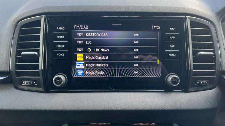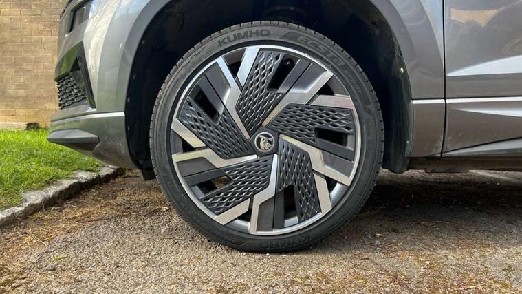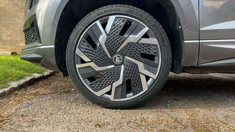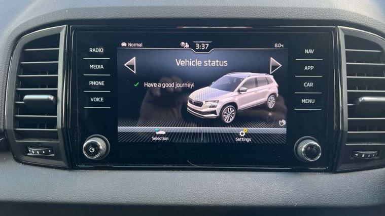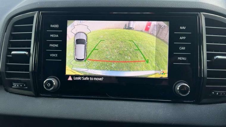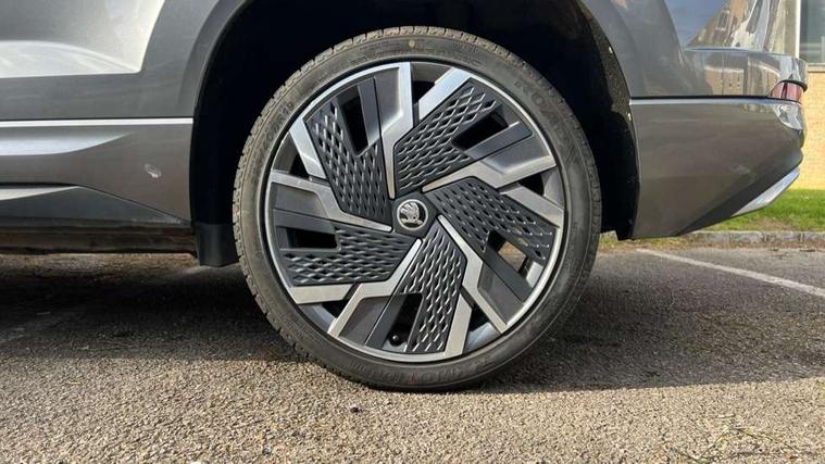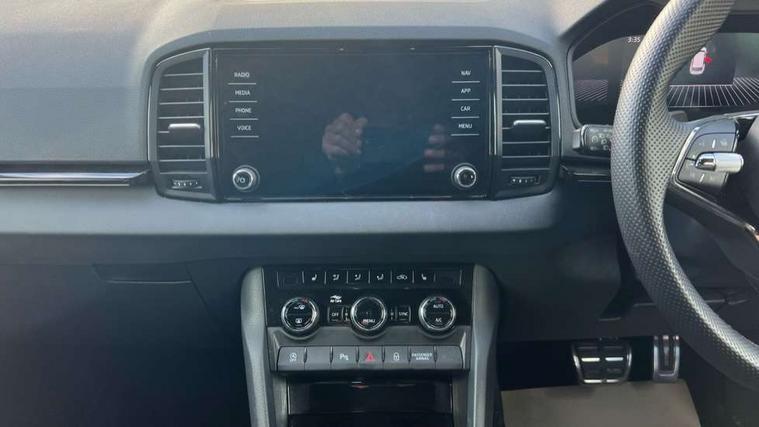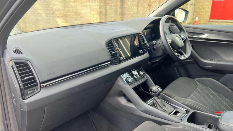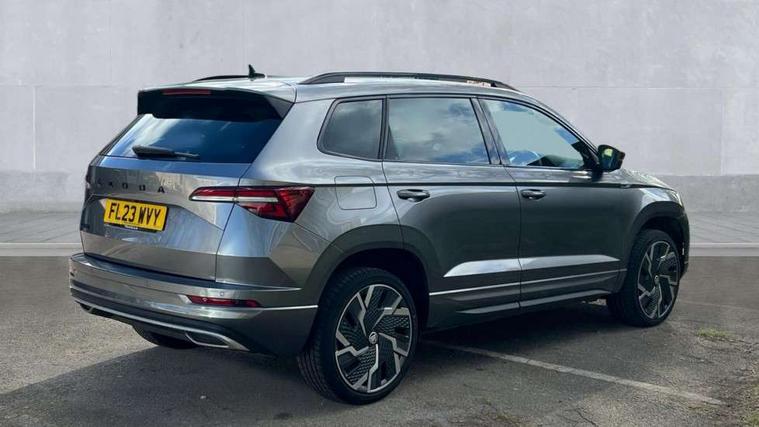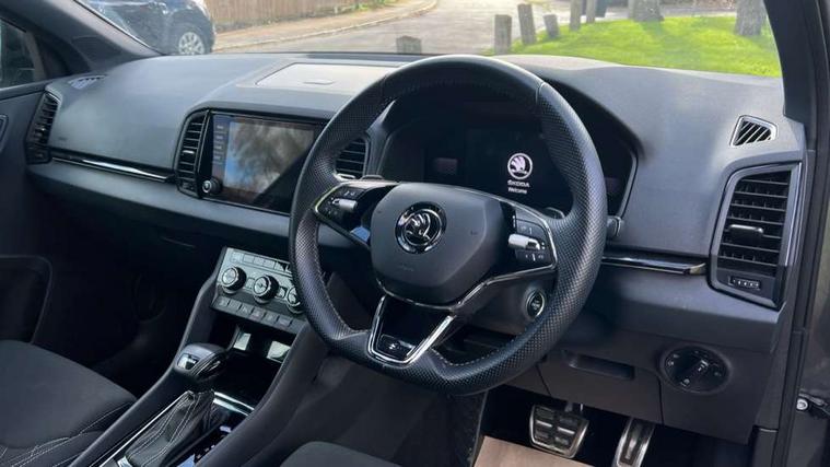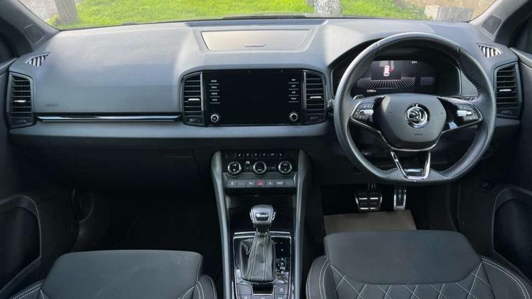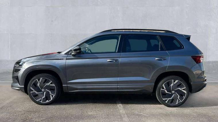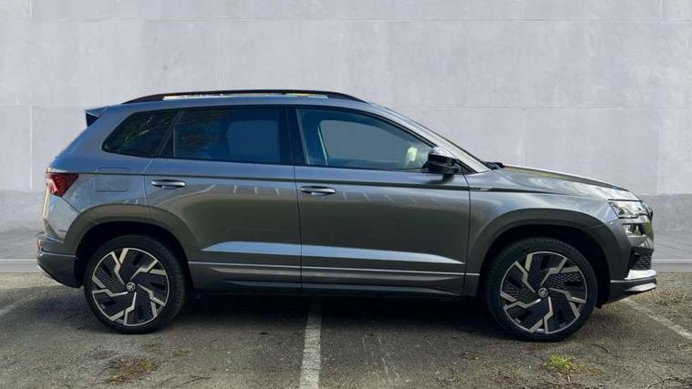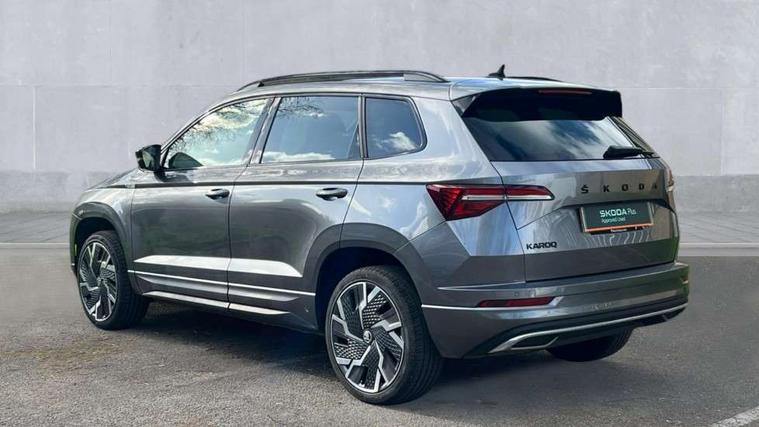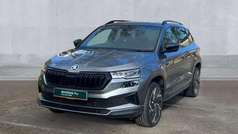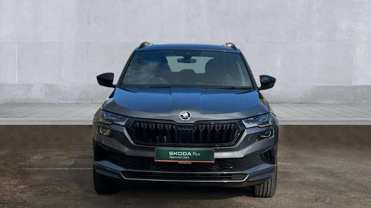 8" Digital display, Care connect, Driver fatigue sensor, Emergency services call system, Outside temperature gauge, Service interval indicator, SmartLink wireless for Apple and wired for Android, Start/stop system with regenerative braking, USB C Port x 2 in front centre console, Virtual cockpit, Virtual pedal with electrically operated boot door, 8 Speakers, DAB radio with Bluetooth, USB connection, Acoustic glass, Aero front windscreen wipers with intermittent function, Auto dimming rear view mirror with light and rain sensors, Black door mirrors, Black electric window control buttons, Black radiator grille, Black roof rails, Body colour door handles, Dynamic headlight range control with cornering light function, Electric front and rear windows with child proof lock, Front door steps with SportLine logo, Heated rear windscreen, LED daytime running lights, LED rear lights with high functionality welcome effect and dynamic indicators, Light assistant (coming/leaving home/tunnel light), Panoramic sliding sunroof, Plastic scuff plates, Privacy glass, Protective door side sills in body colour, Rear diffuser, Rear side wing doors, Rear spoiler, Rear window wiper with washer system and intermittent control, Safety reflectors on front doors, Skoda lettering on tailgate in black, Sportline badge on front fender, Sportline decorative inserts with badging, Sports front and rear bumpers, 1.5 litre bottle holders in driver and front passenger door panels, 12V socket in boot, 12v socket in front centre armrest with storage compartment and rear air vents, 2 Folding hooks and nets in boot, 3 rear height adjustable headrests, 3 seat bench in 2nd row, 3 spoke leather sports multifunction steering wheel and silver stitching with gear shift paddles, 4 foldable roof handles with rear coat hooks, Black floor carpet, Black roof headlining, Chrome inner door handles, Double sided boot floor, Foldable hooks in the boot, Front head restraints, Height adjustable front three point seats belts with tensioners, Height/reach adjust steering wheel, Ice scraper, Illuminated glovebox, Illuminated luggage compartment, Isofix child seat preparation outer rear, Manual lumbar support for front seats, Pen holder, Pollen filter, Rear boot cover, Rear reading lights, Rear seats fixed folding and divided 60:40, Rubbish bin door, Safety vest holder, Single front passenger seat, Storage box in upper central dashboard closed, Sunvisors with illuminated vanity mirrors, Textile floor mats, Ticket holder, Titan black interior ceiling, Welcome animation with sportline logo, Light Pack - Karoq, Parking pack - Karoq, Automatic door unlocking in case of crash, Automatic fuel cut off in case of crash, Child locks on rear doors, Driver airbag, Electronic parking brake with auto hold function, Emergency rear braking signal, ESC including ABS, MSR, ASR, EDS, HBA, DSR, RBS, MKB and traction control, Front side airbags, Hill hold control, Knee airbags, Passenger airbag with switch-off function, Pedestrian monitor, Seatbelt reminder signalisation and pretensioner for all seats, Three point seatbelts rear, Two tone horn, Tyre pressure display, Tyre pressure monitor, Alarm with interior monitoring, back up horn and tilt sensor with safe function, Electronic engine immobiliser, Keyless entry and start/stop, Remote central locking with 2 remote folding keys, Black air vent surround, Black centre console, Satin black dashboard, Satin black door trim, 19" Vega black polished alloy wheels, Anti-theft wheel bolts protection, Matt black aero hub caps, Storage on wheel cover, Tool kit,